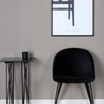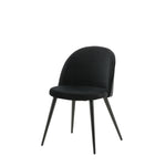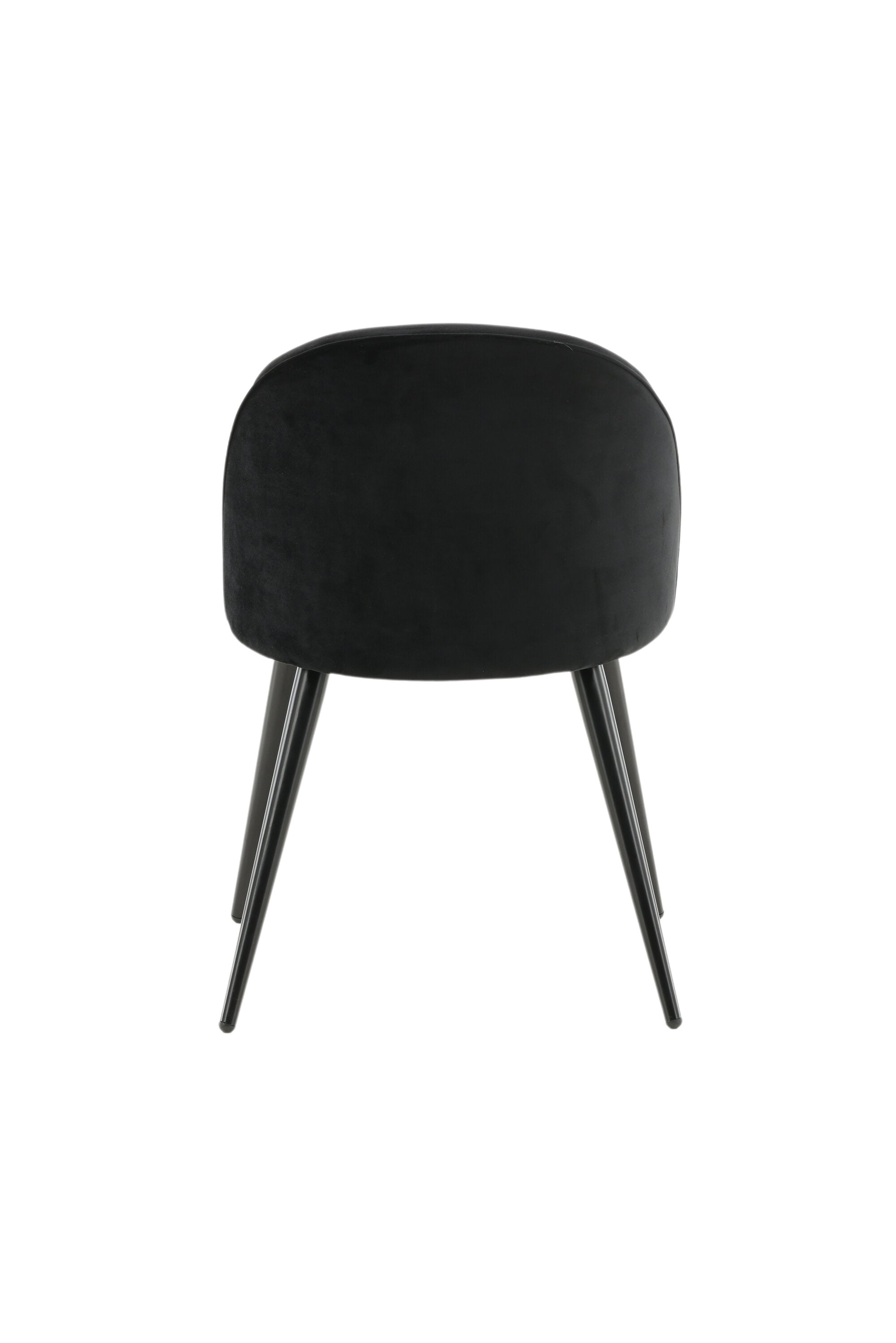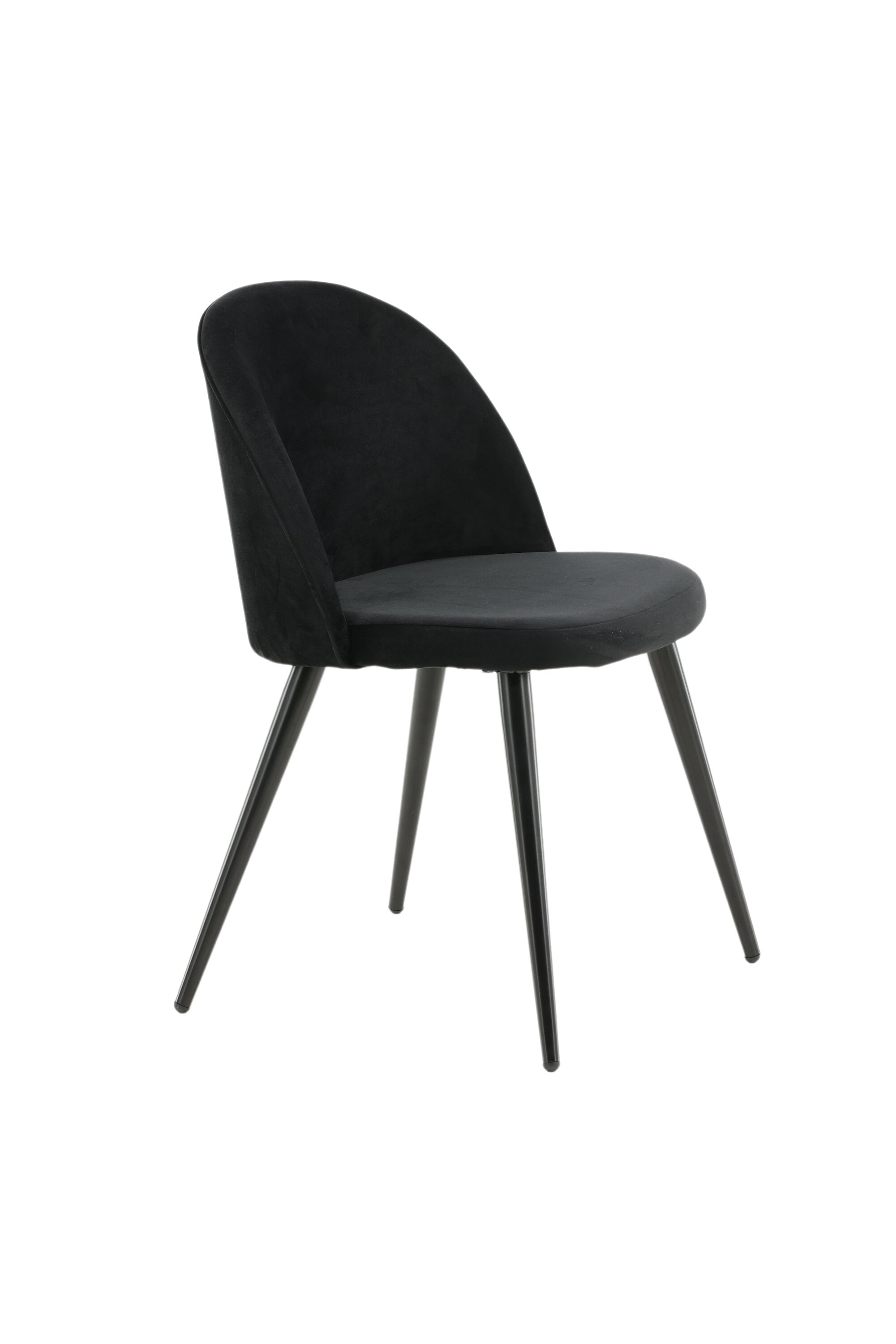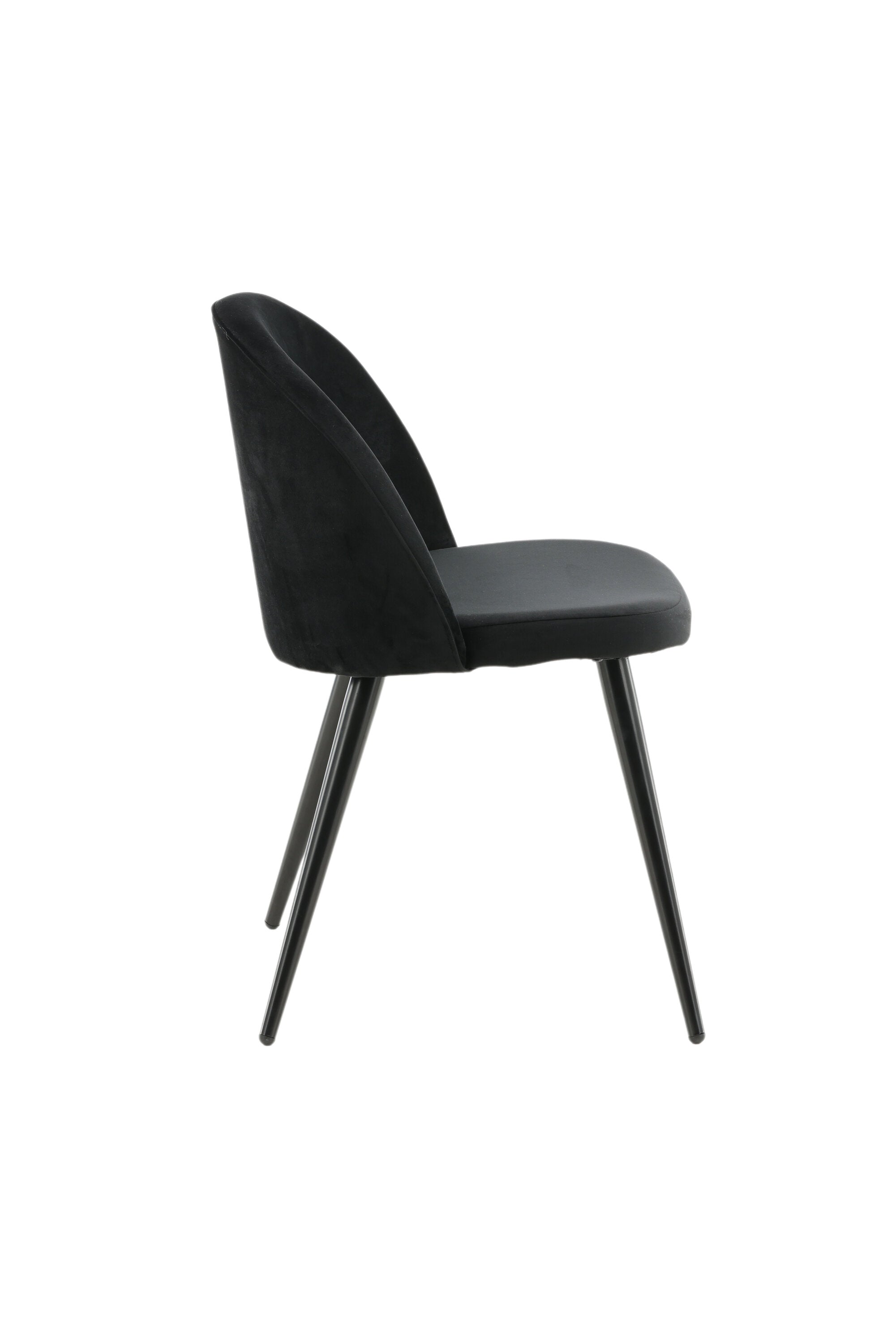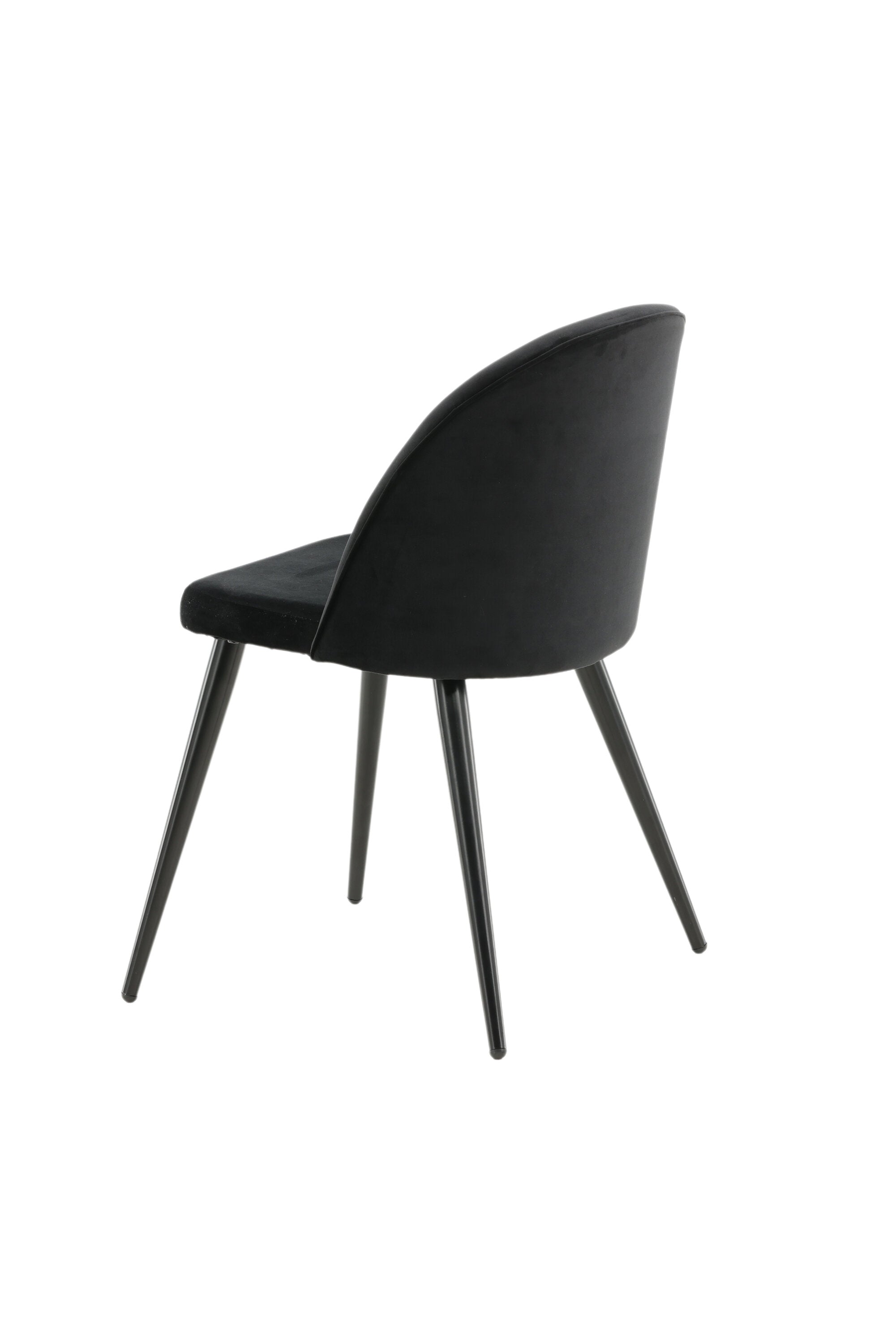 Stylová jídelní židle v černé barvě s moderním designem - co víc si přát? Černá jídelní židle Velvet má celočalouněnou konstrukci, černě lakované kovové nohy, zaoblený sedák a opěrák z černé sametové látky s měkkým polstrováním. Nedělejte kompromisy mezi pohodlím a designem!