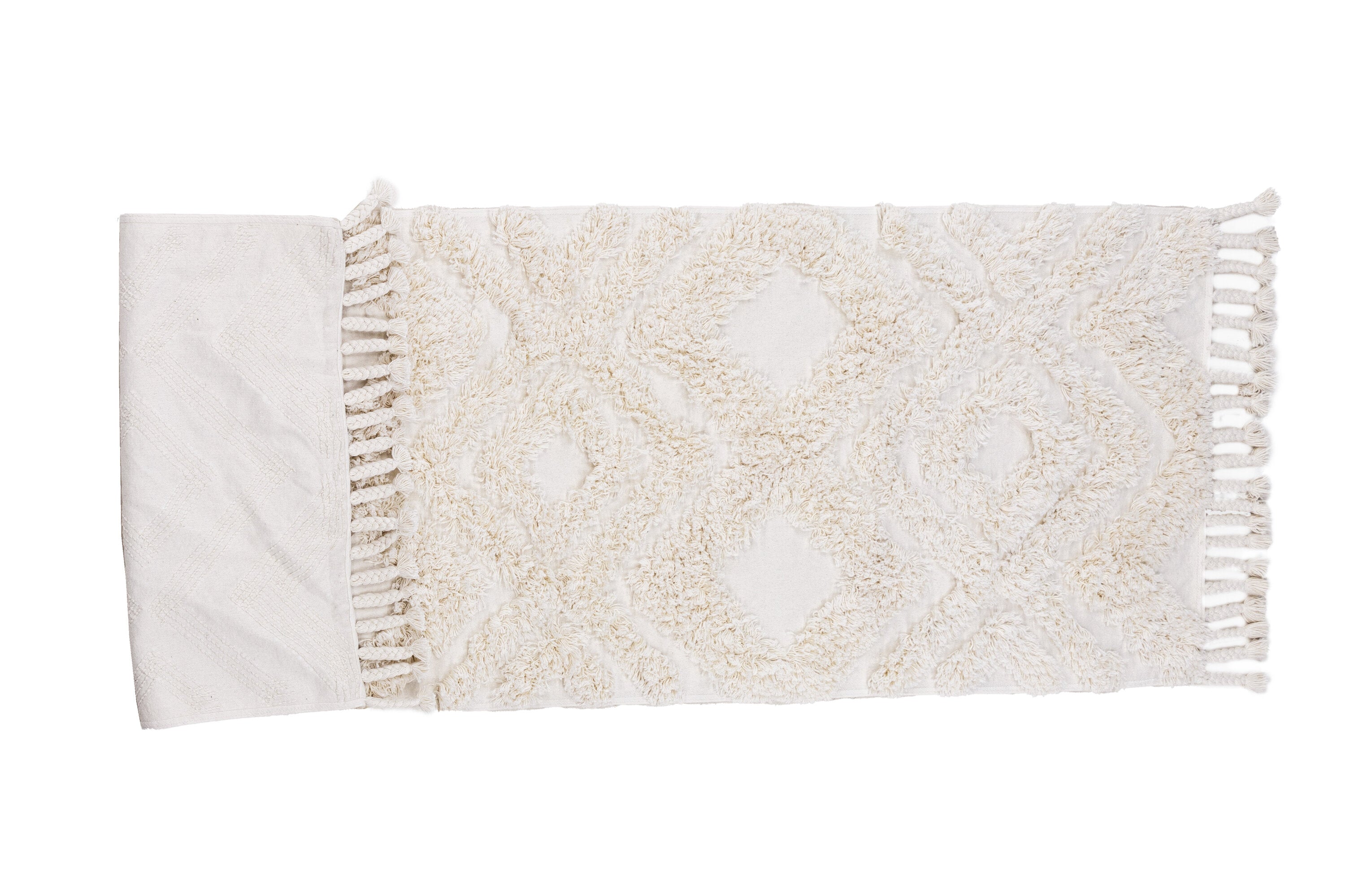 Vytvořte si doma útulnou atmosféru s kobercem, který vnese do vašeho interiéru moderní vzhled a hřejivý pocit. Vlněný koberec ze série Hilma je podlouhlý obdélníkový koberec v moderním stylu, zde v krásné bílé barvě. Koberec má všívaný vzor ve vyšším vlasu a po krátkých stranách pletenou řadu třásní, která přispívá ke klasickému designu. Díky odolným vlastnostem materiálu se koberec dobře osvědčí ve většině místností. Umístěte jej samostatně do předsíně nebo do obývacího pokoje.Rozměry koberce: 200x70 cm.
