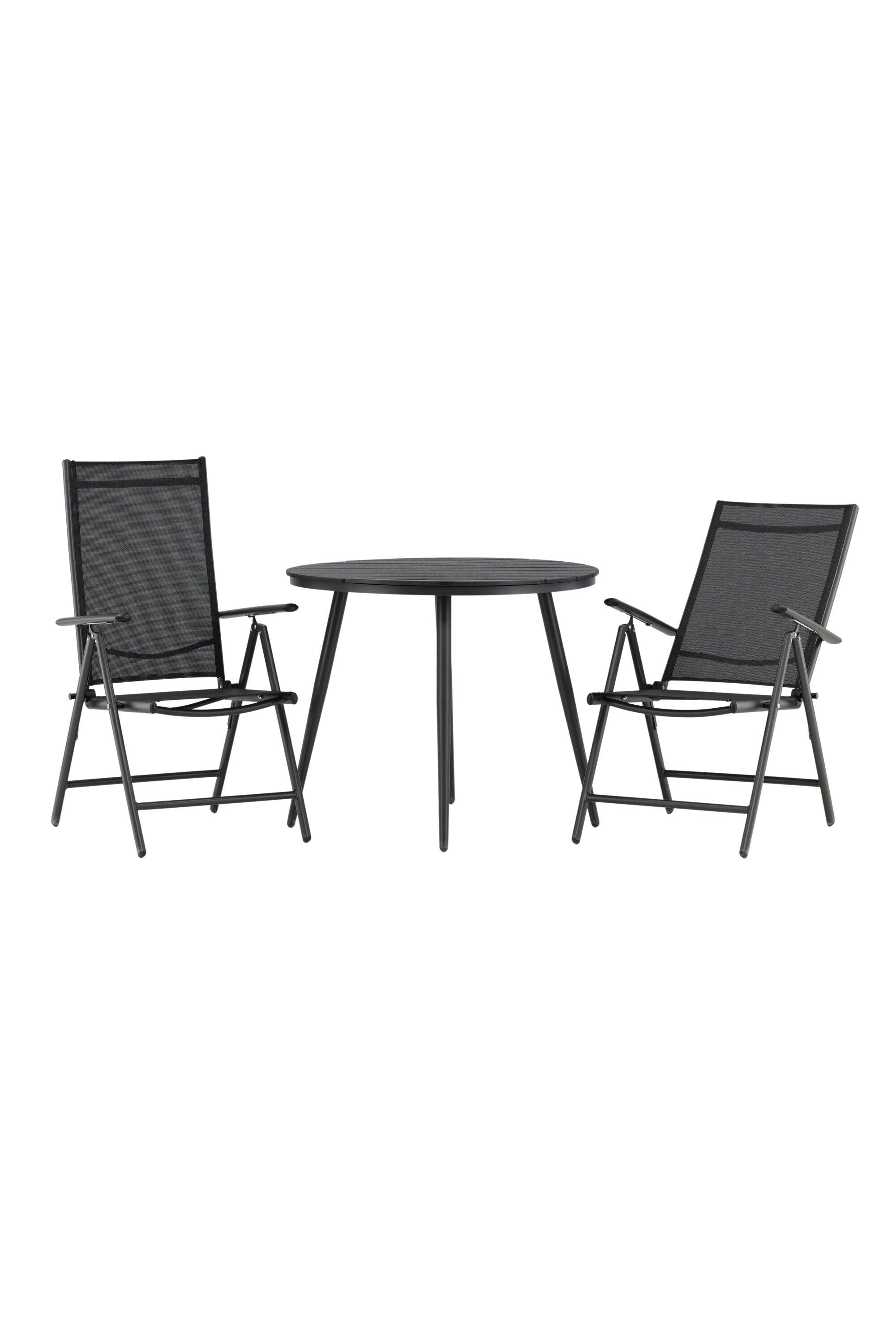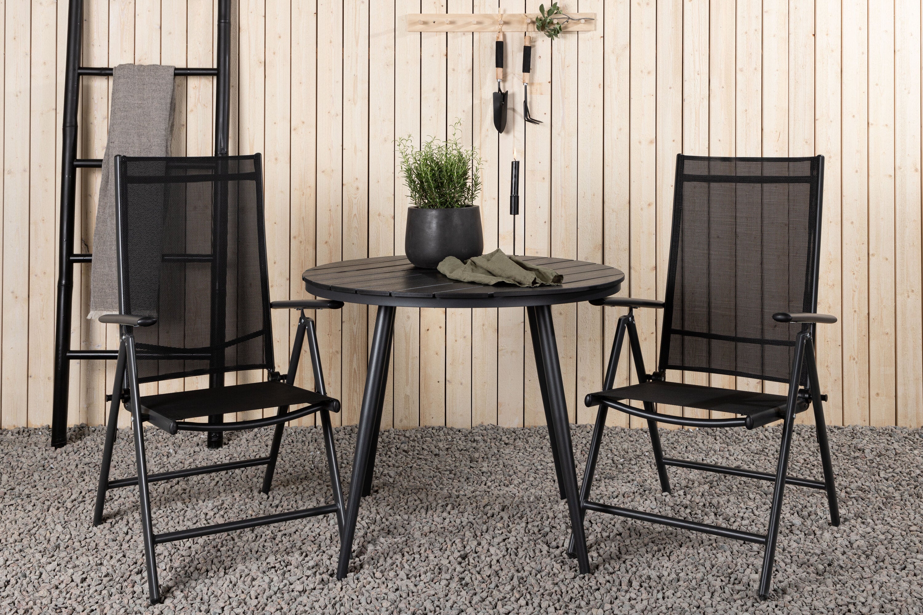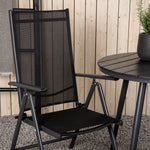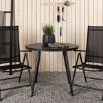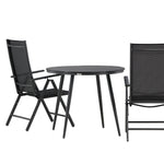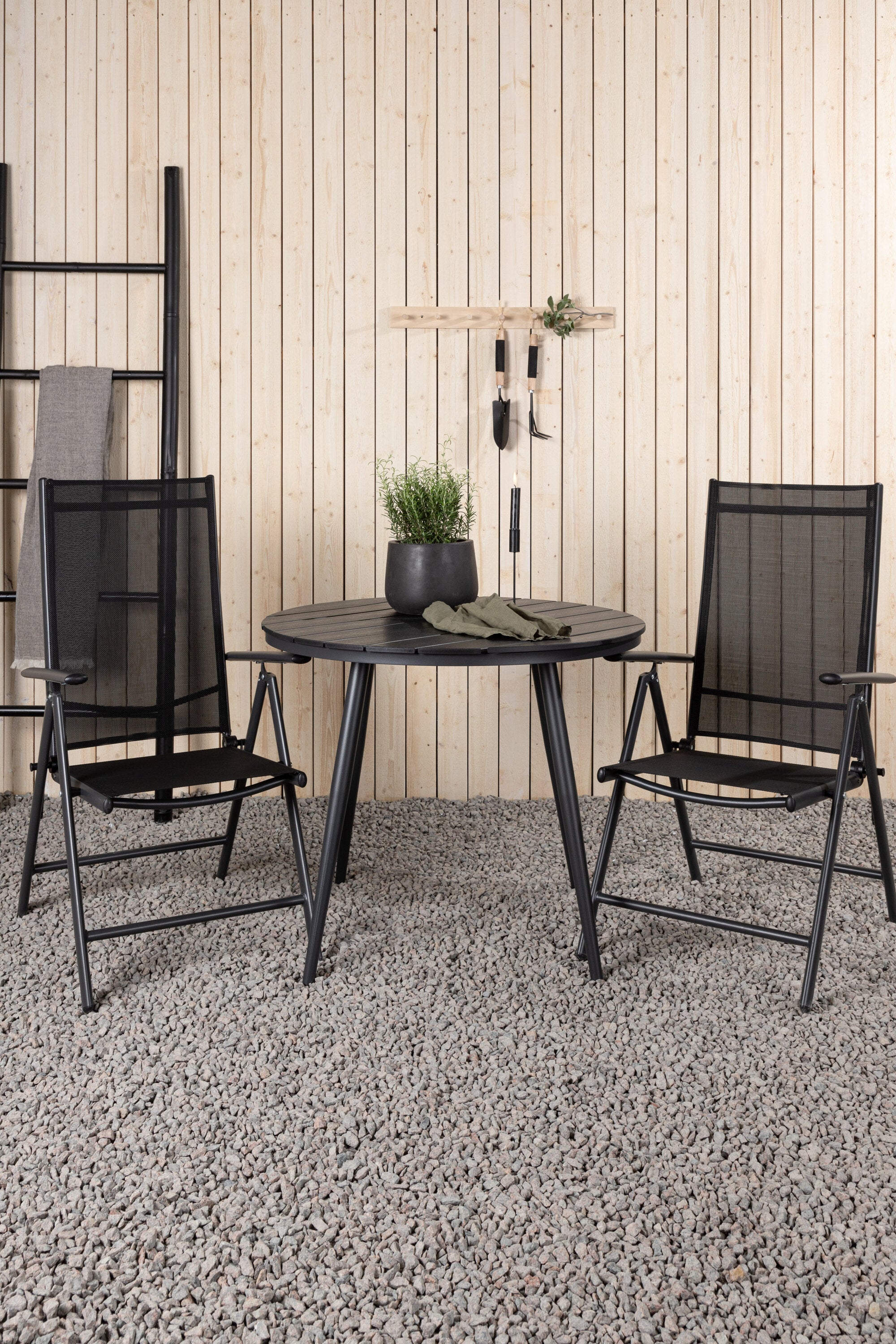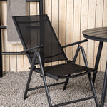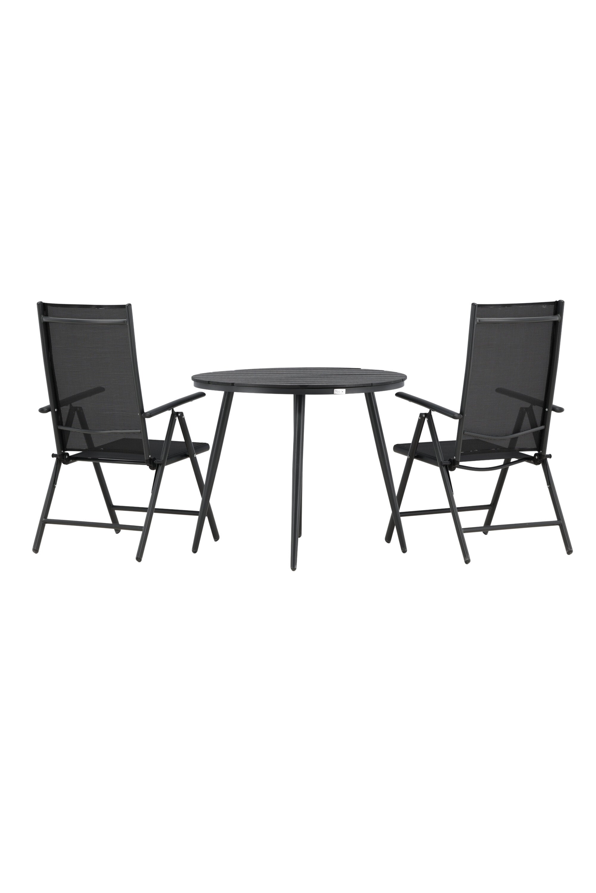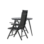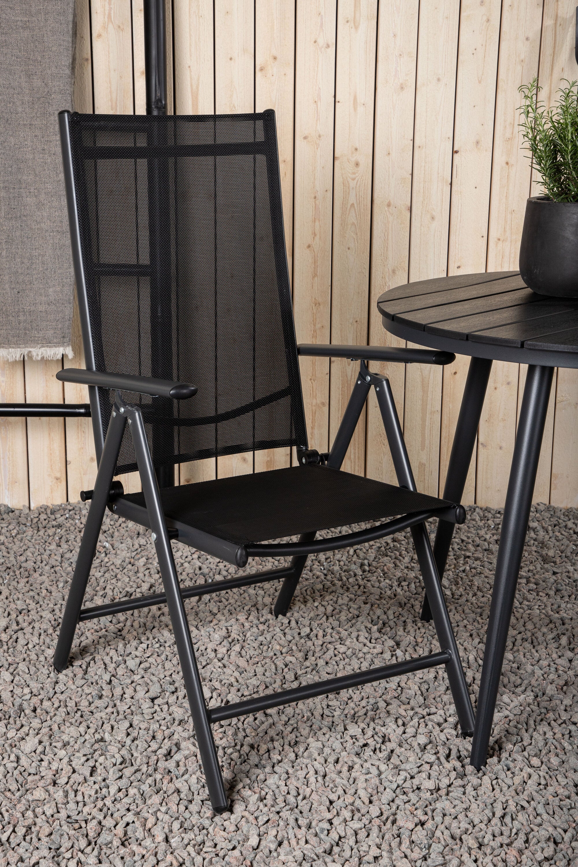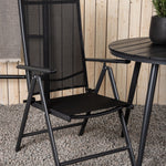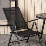 Pohodlná, příjemná a hezká kavárenská skupina v černé barvě ze série Break - snadno sladitelná a nadčasová ve svém designu! Stůl Break má kulatou desku stolu v Aintwood a klasický podvozek v černém hliníku. Zde v dokonalé kombinaci se skládacími jídelními židlemi ze stejné série. Opěradla židlí v černém textilu lze nastavit pro optimální pohodlí a relaxaci u jídelního stolu. Vytvořte si na terase dokonalé místo pro kávu!