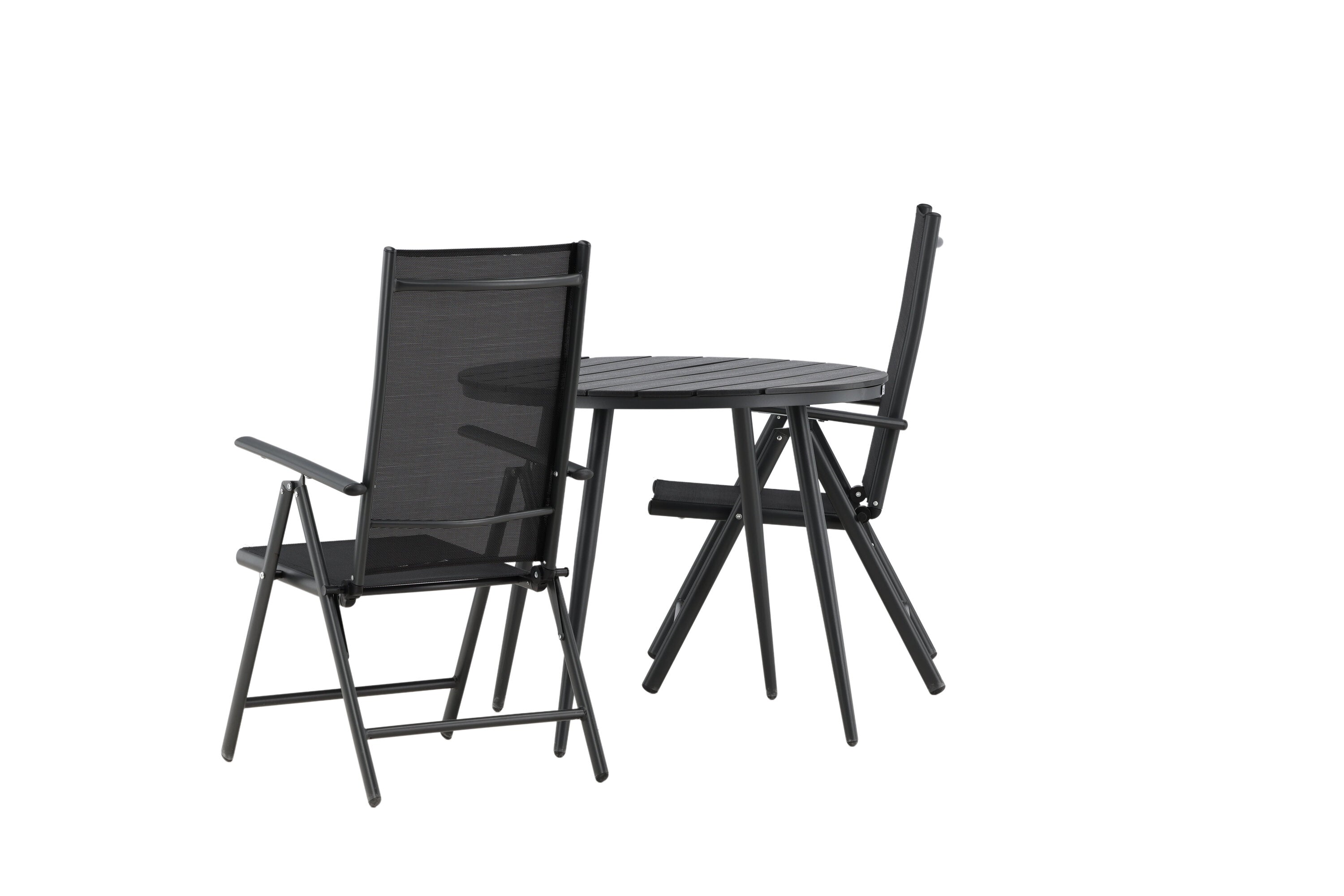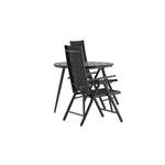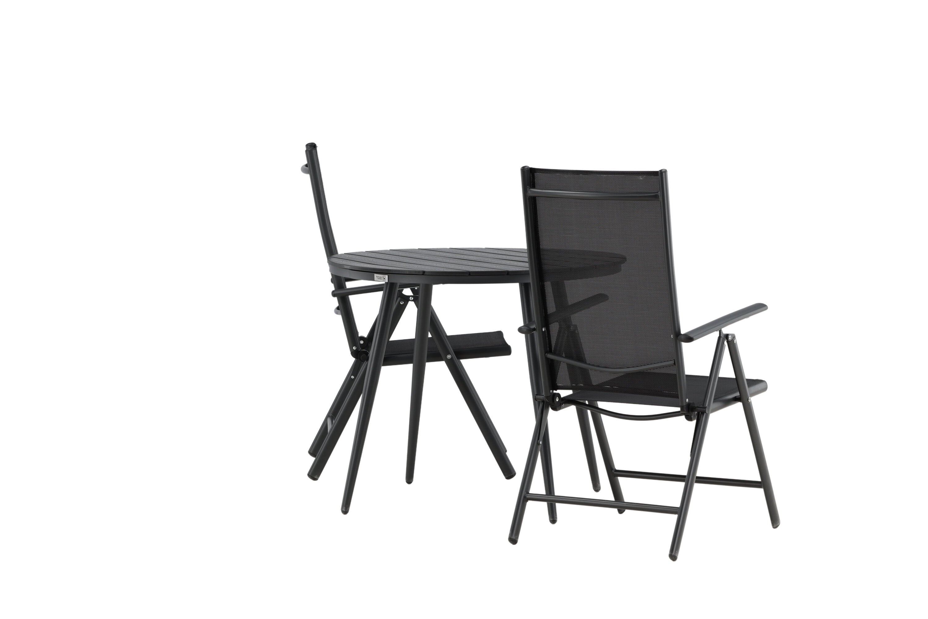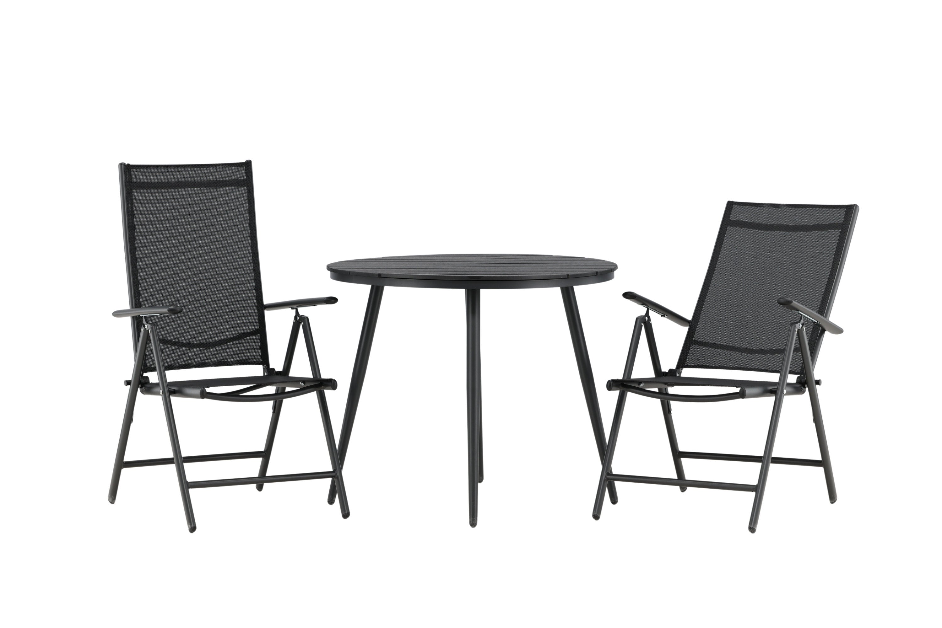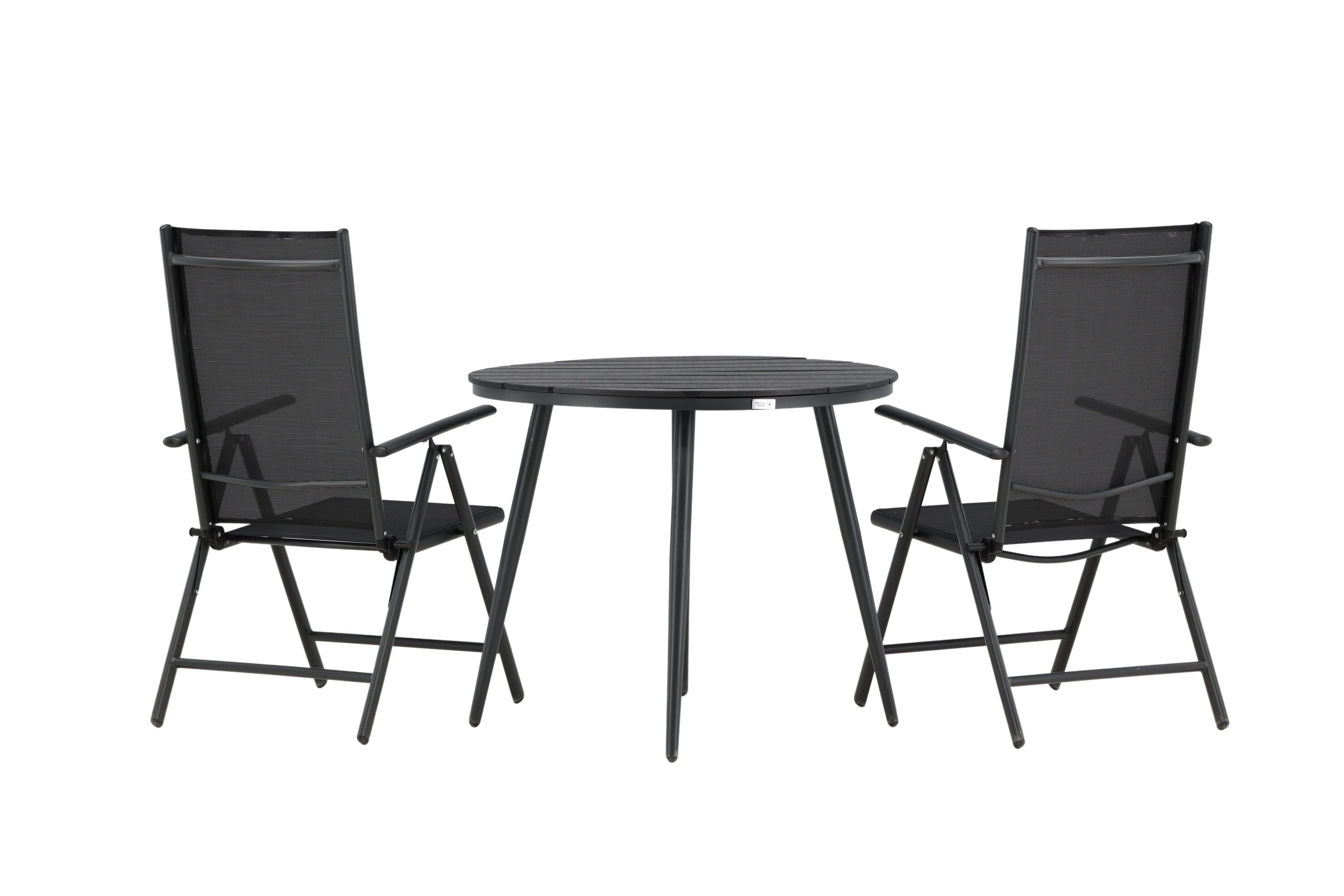 Pohodlná, příjemná a hezká kavárenská skupina v černé barvě ze série Break - snadno sladitelná a nadčasová ve svém designu! Stůl Break má kulatou desku stolu v Aintwood a klasický podvozek v černém hliníku. Zde v dokonalé kombinaci se skládacími jídelními židlemi ze stejné série. Opěradla židlí v černém textilu lze nastavit pro optimální pohodlí a relaxaci u jídelního stolu. Vytvořte si na terase dokonalé místo pro kávu!