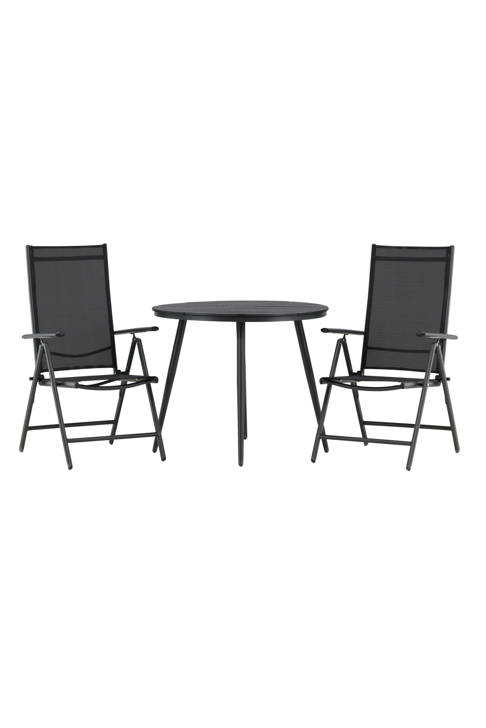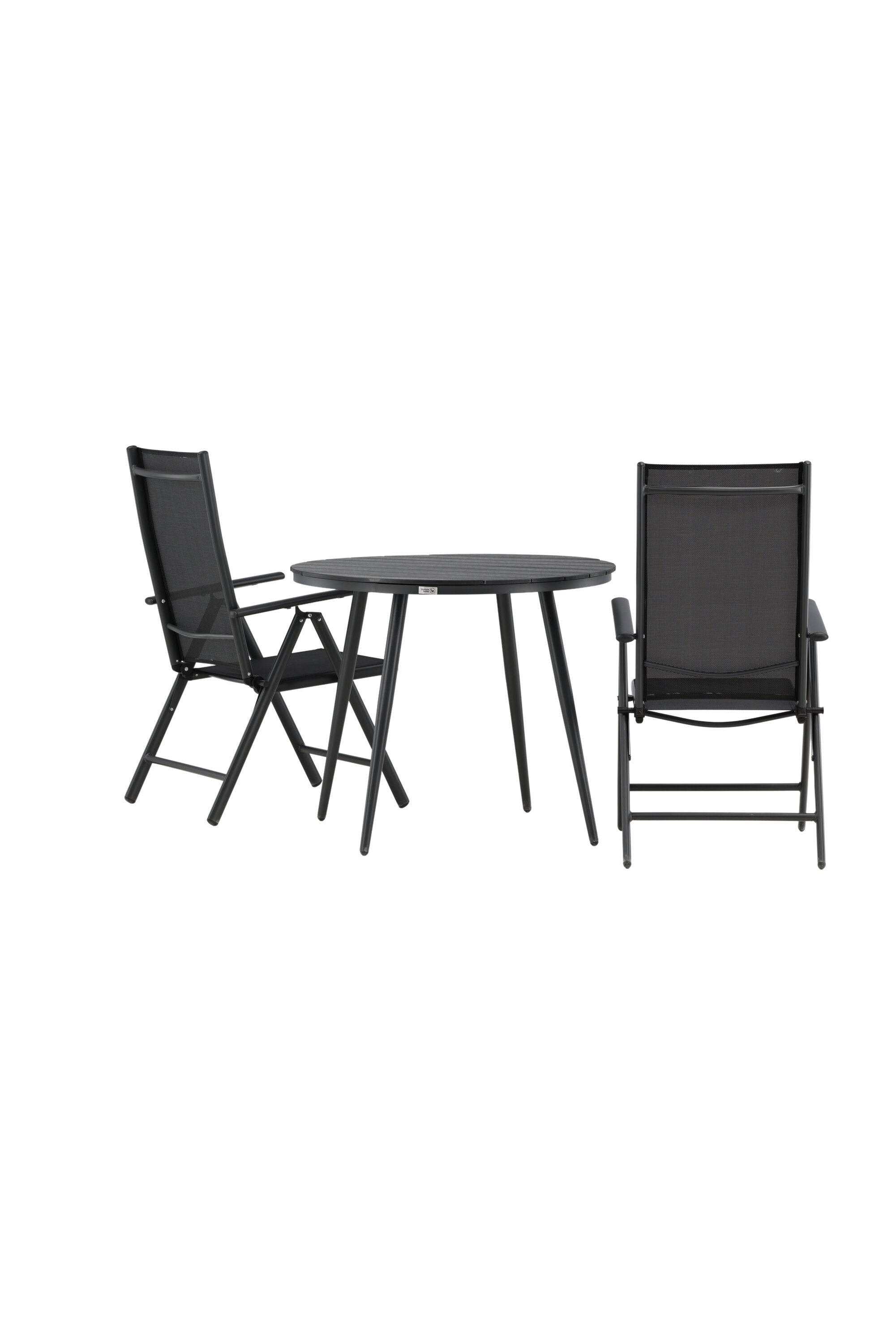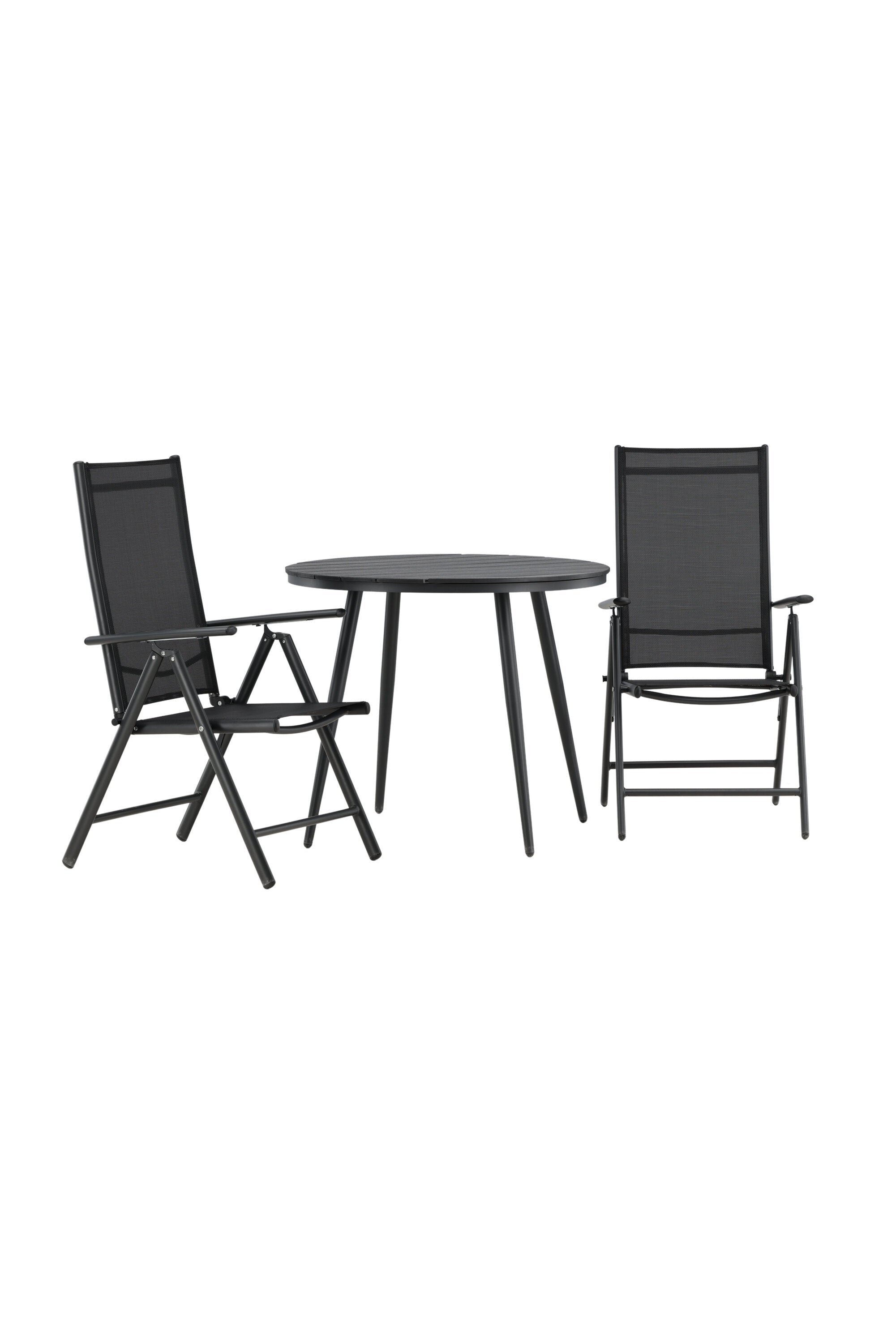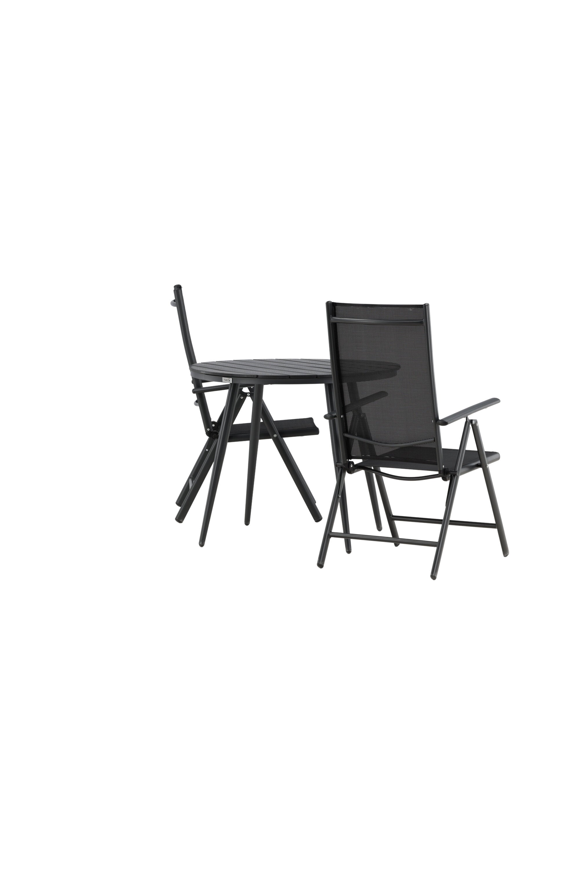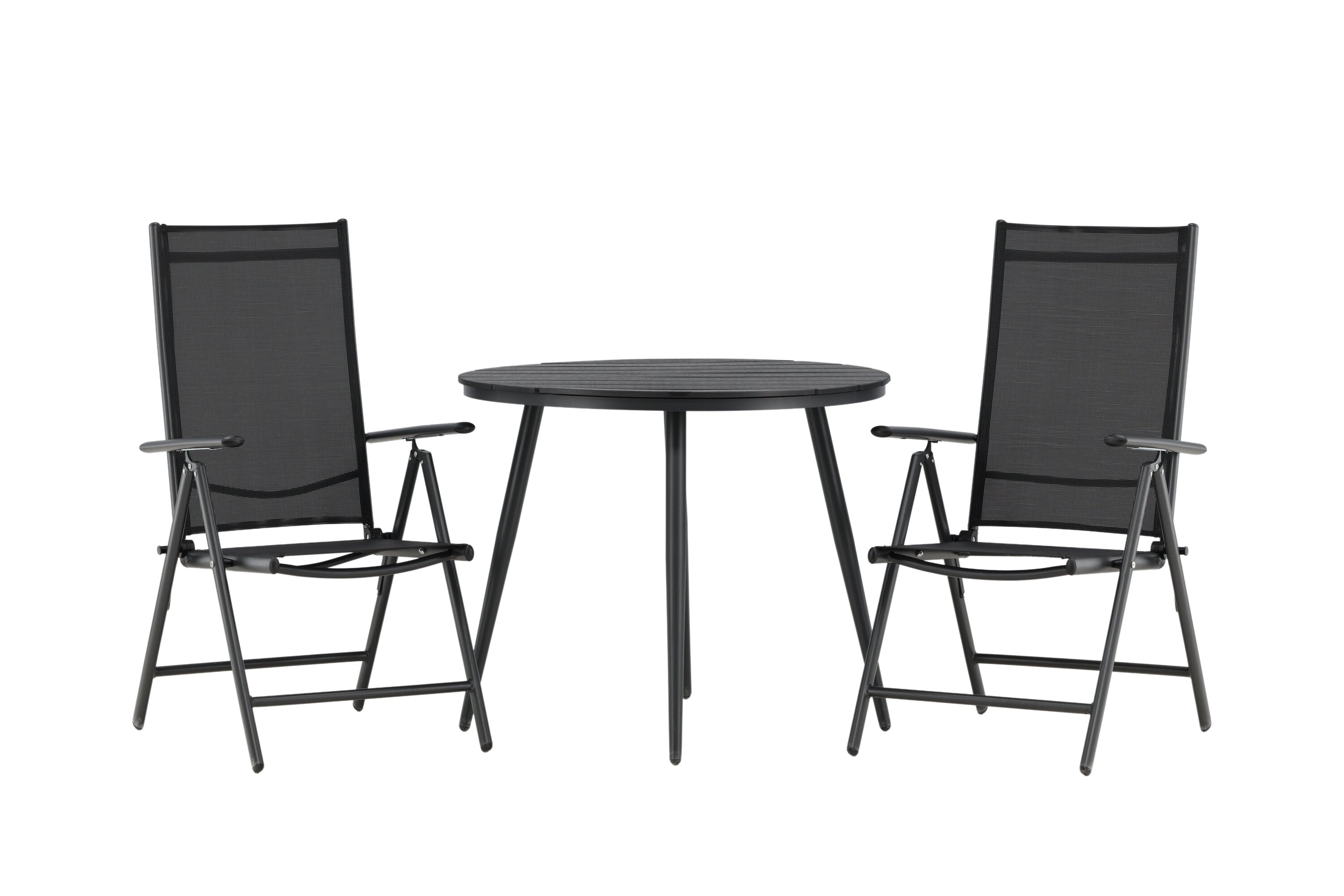 Pohodlná, příjemná a hezká kavárenská skupina v černé barvě ze série Break - snadno sladitelná a nadčasová ve svém designu! Stůl Break má kulatou desku stolu v Aintwood a klasický podvozek v černém hliníku. Zde v dokonalé kombinaci se skládacími jídelními židlemi ze stejné série. Opěradla židlí v černém textilu lze nastavit pro optimální pohodlí a relaxaci u jídelního stolu. Vytvořte si na terase dokonalé místo pro kávu!