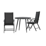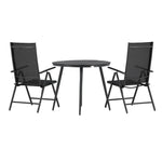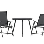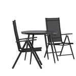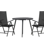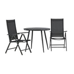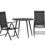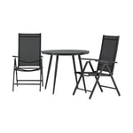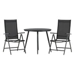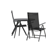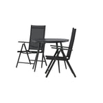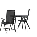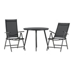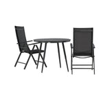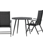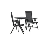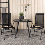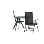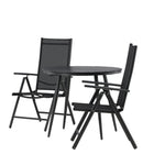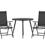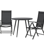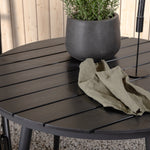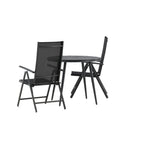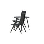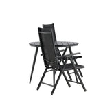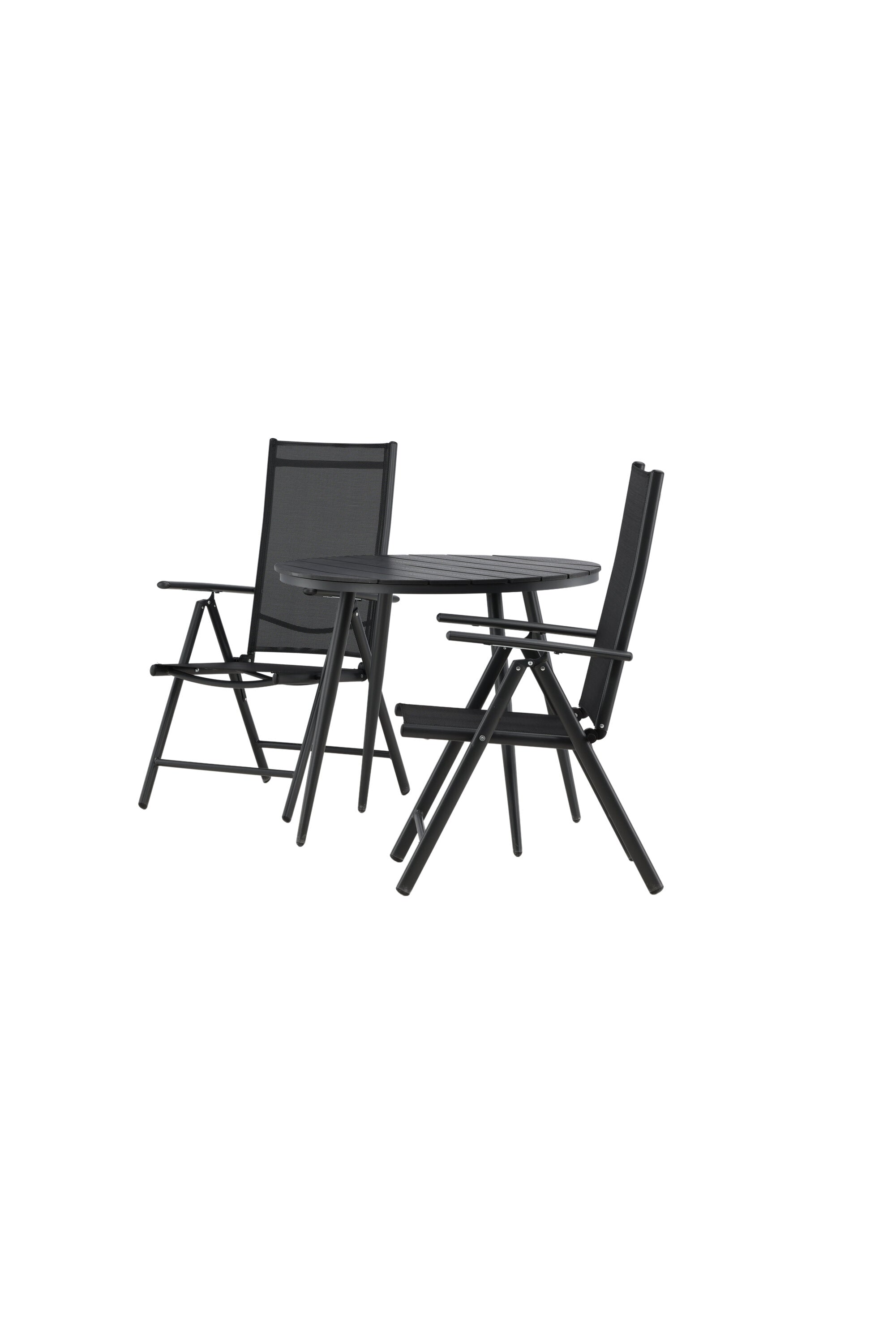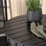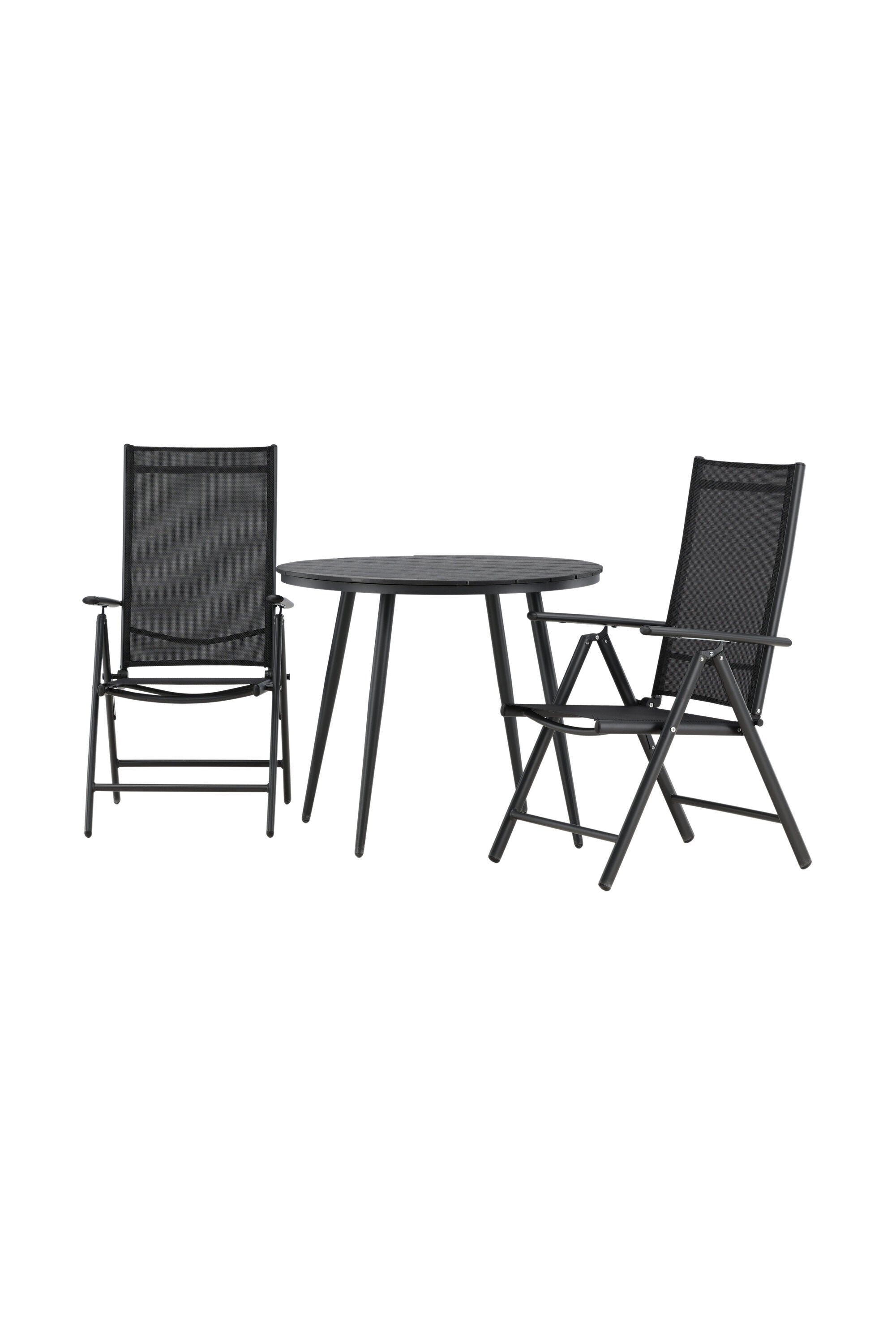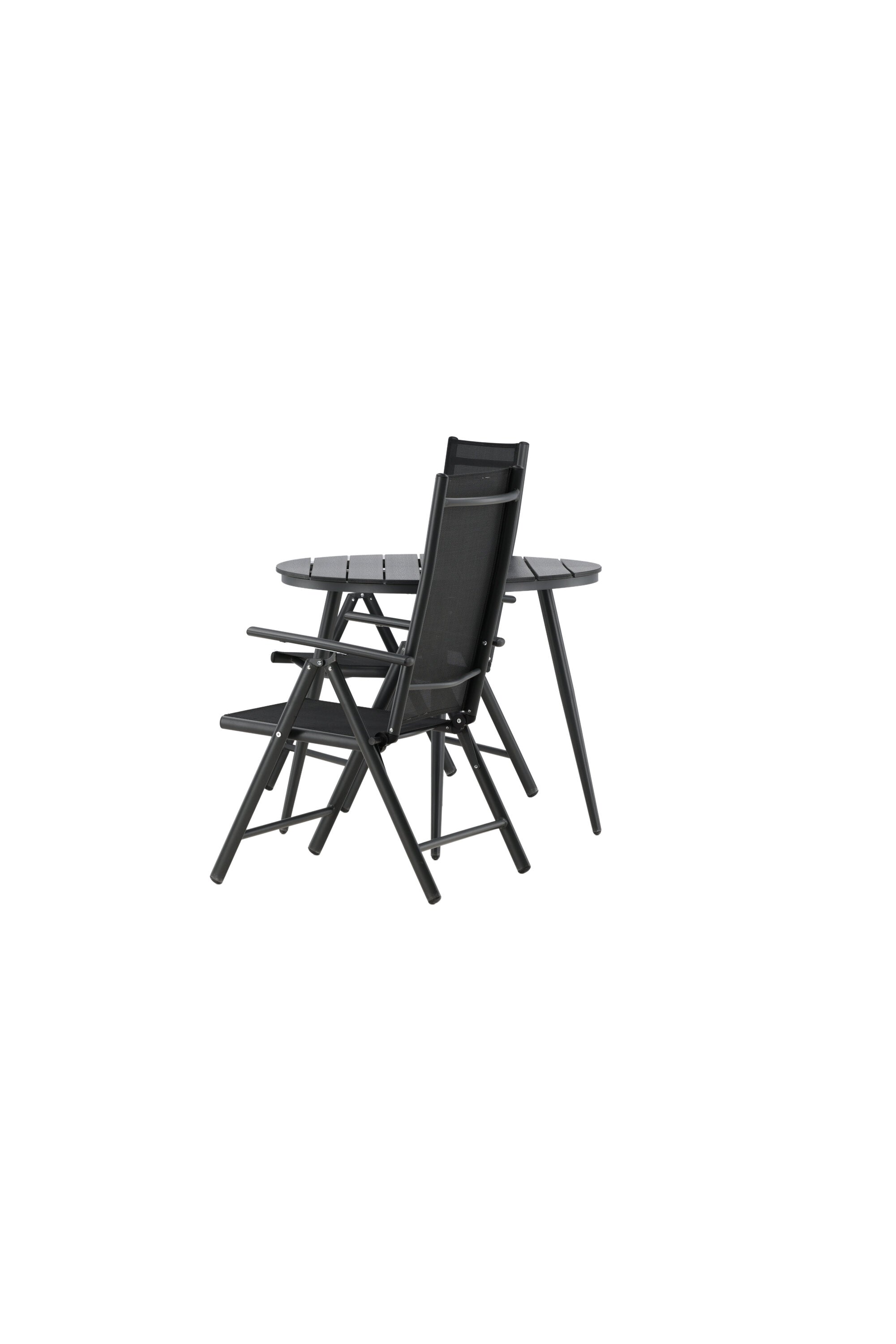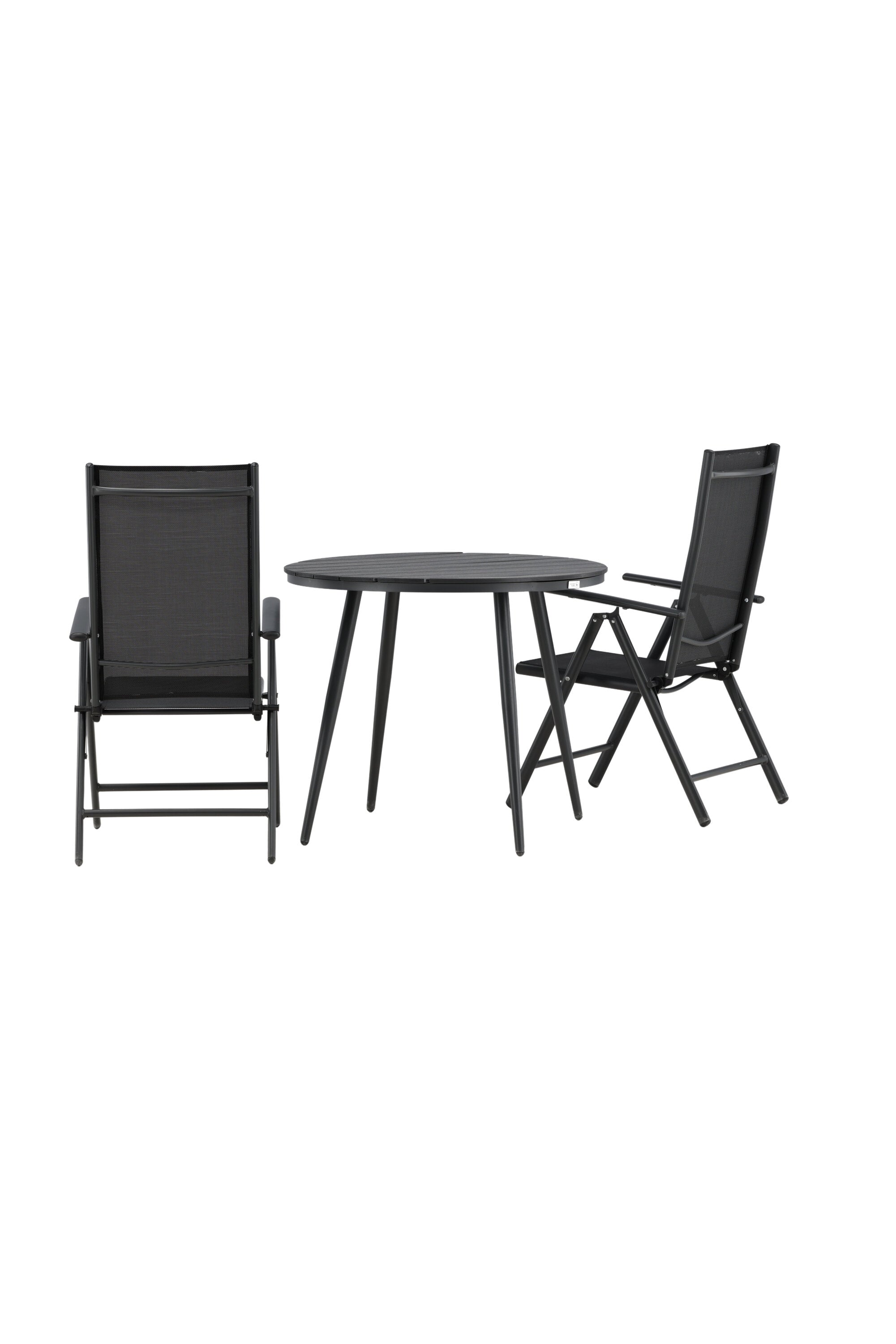 Pohodlná, příjemná a hezká kavárenská skupina v černé barvě ze série Break - snadno sladitelná a nadčasová ve svém designu! Stůl Break má kulatou desku stolu v Aintwood a klasický podvozek v černém hliníku. Zde v dokonalé kombinaci se skládacími jídelními židlemi ze stejné série. Opěradla židlí v černém textilu lze nastavit pro optimální pohodlí a relaxaci u jídelního stolu. Vytvořte si na terase dokonalé místo pro kávu!