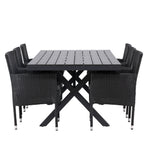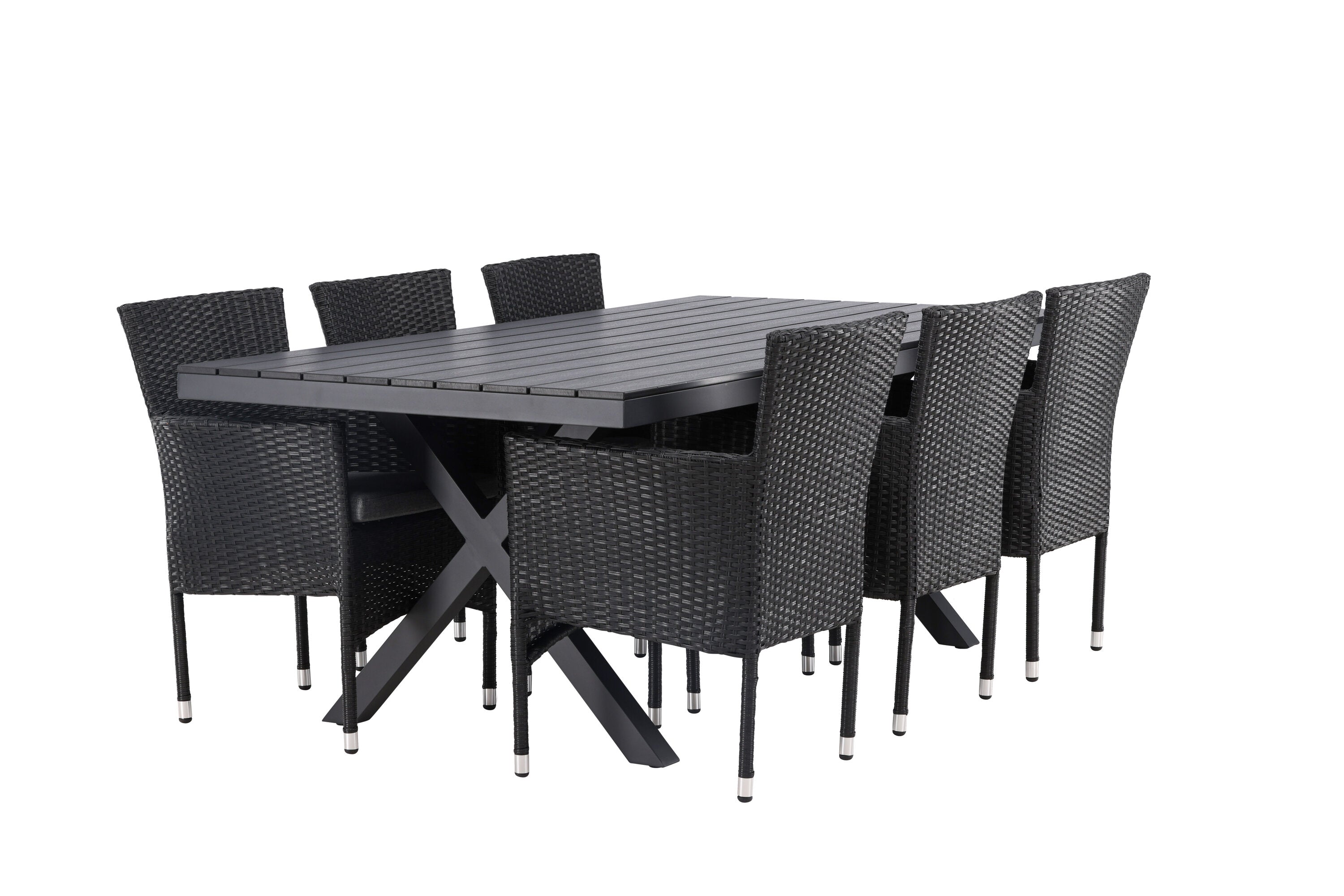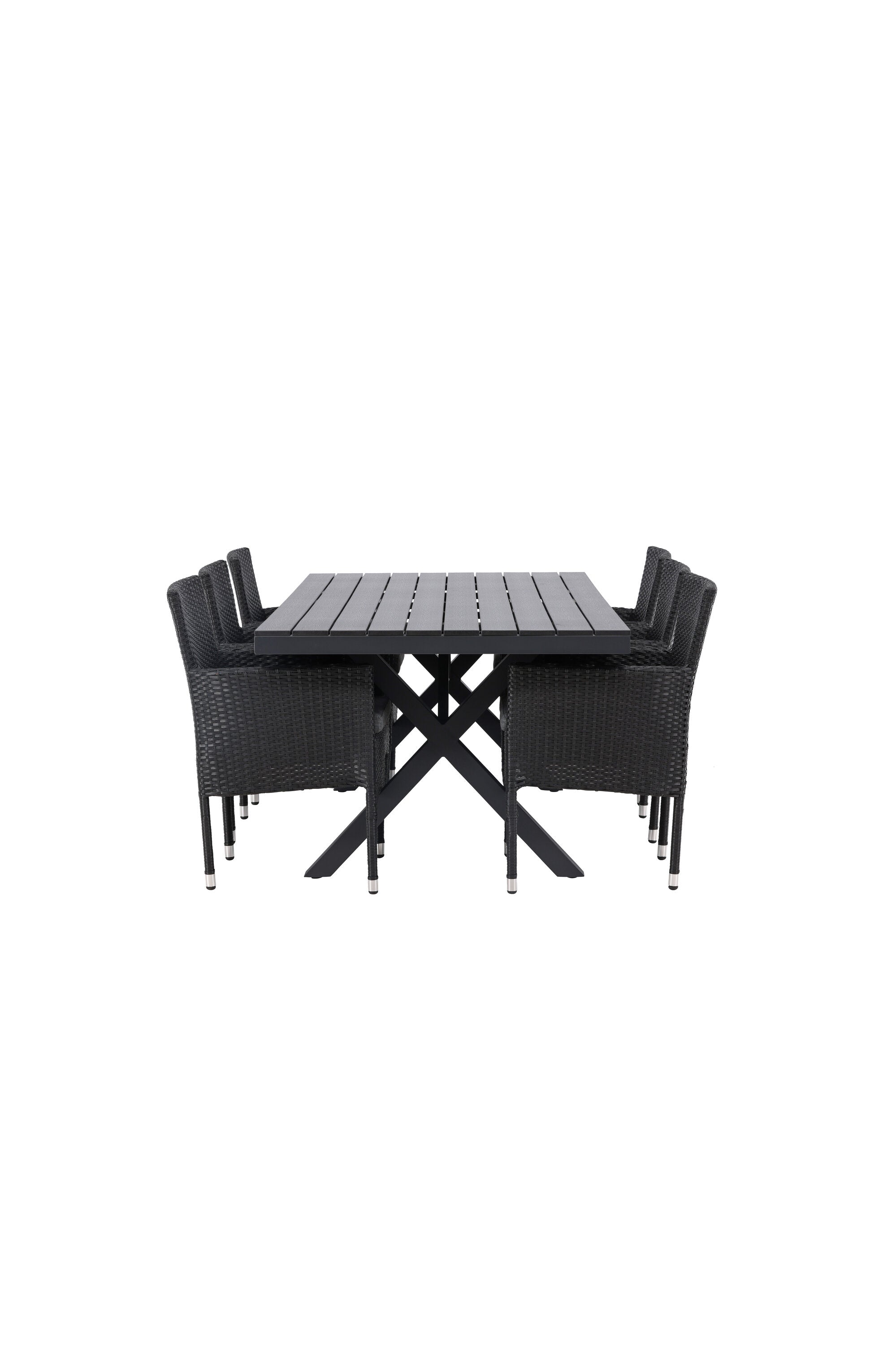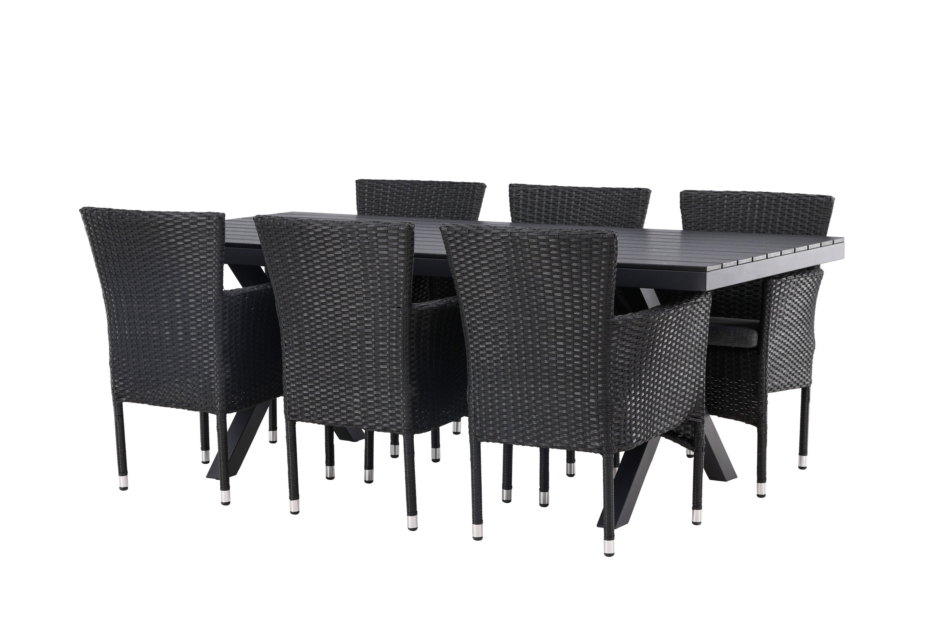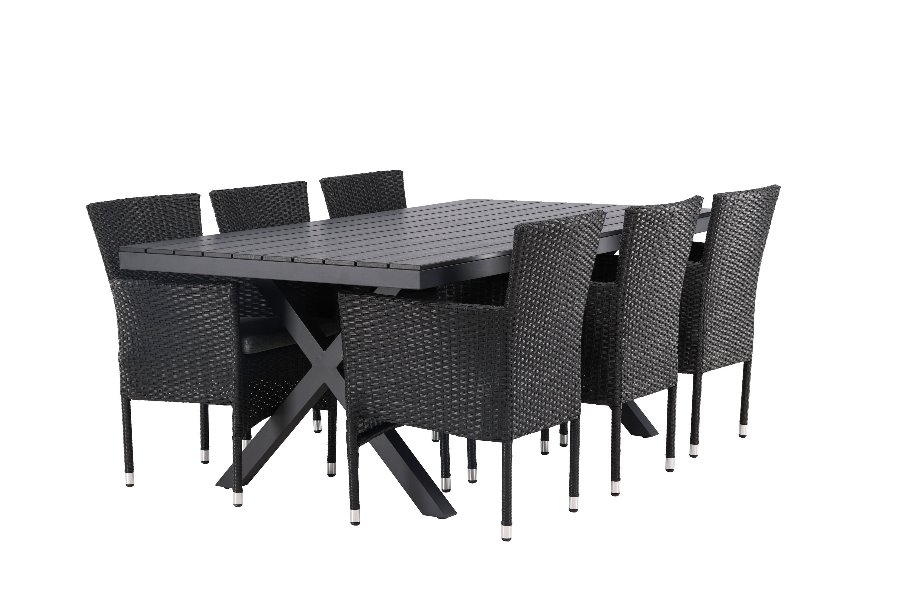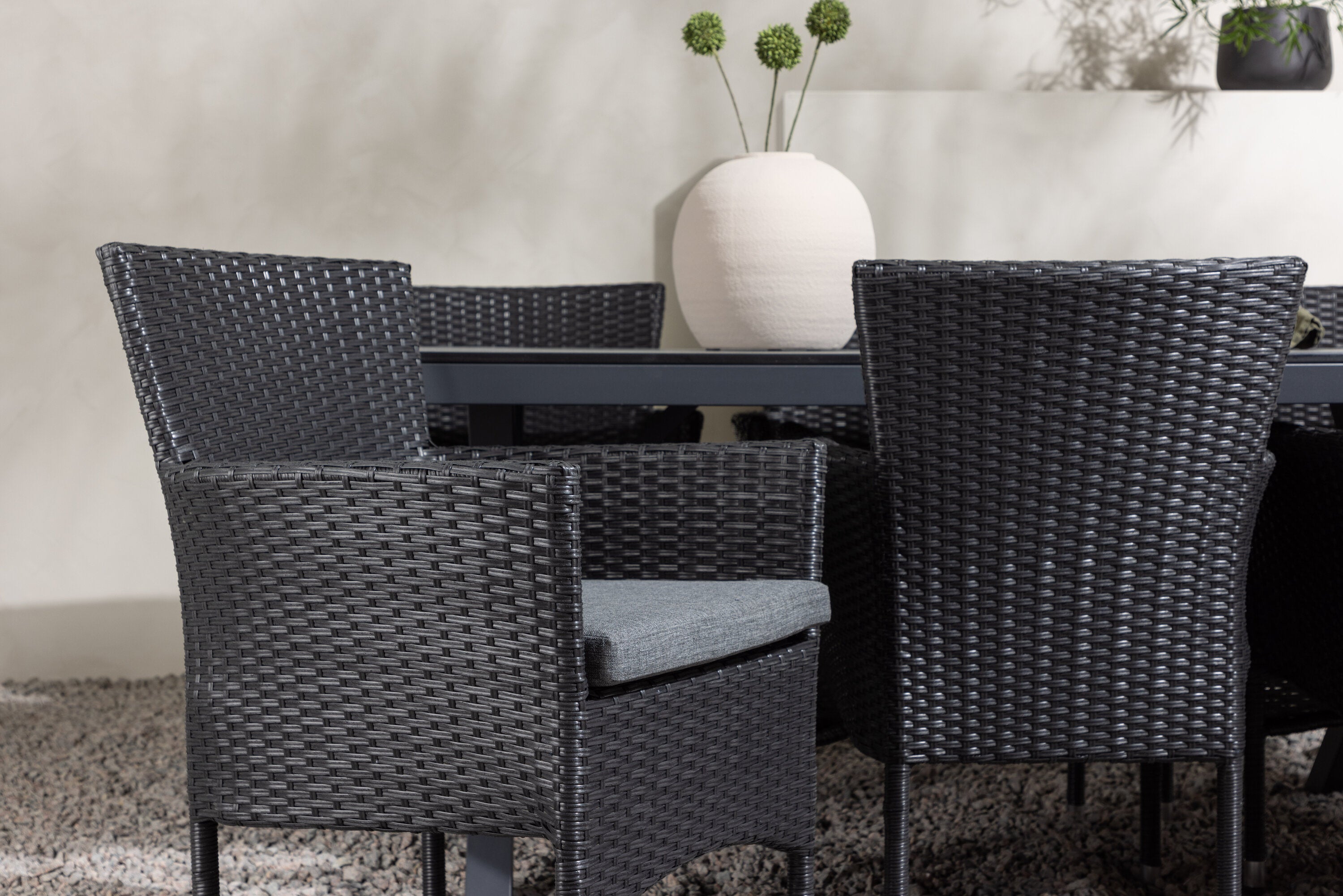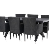 S touto jídelní skupinou snadno zařídíte zimní zahradu nebo terasu moderně a pohodlně! Náš obdélníkový jídelní stůl Garcia má klasický design s deskou stolu v černém aintwood a zkříženými nohami stolu v černém hliníku. Jídelní židle patří do série Malina a zaručeně obstojí ve zkoušce času. Židle má hliníkový rám a je čalouněná pleteným, černým umělým ratanem. Pozvěte své přátele na mnoho skvělých jídel venku v budoucnu! Rozměry stolu: 200 x 100 cm.
