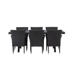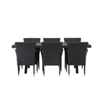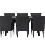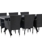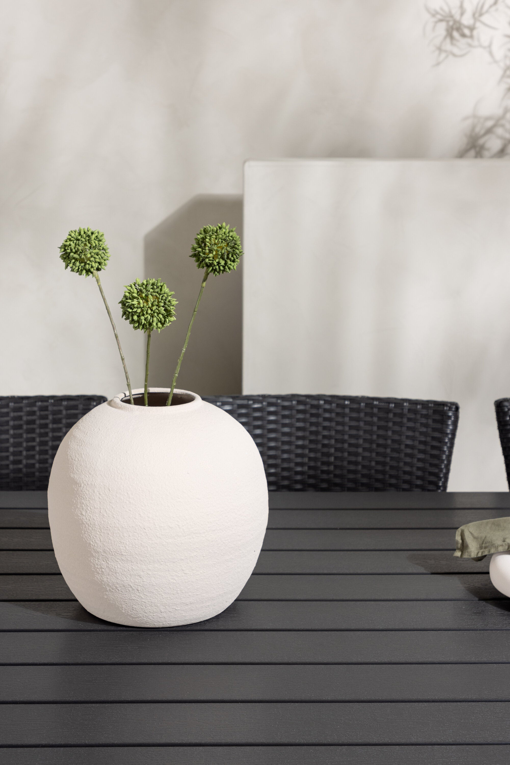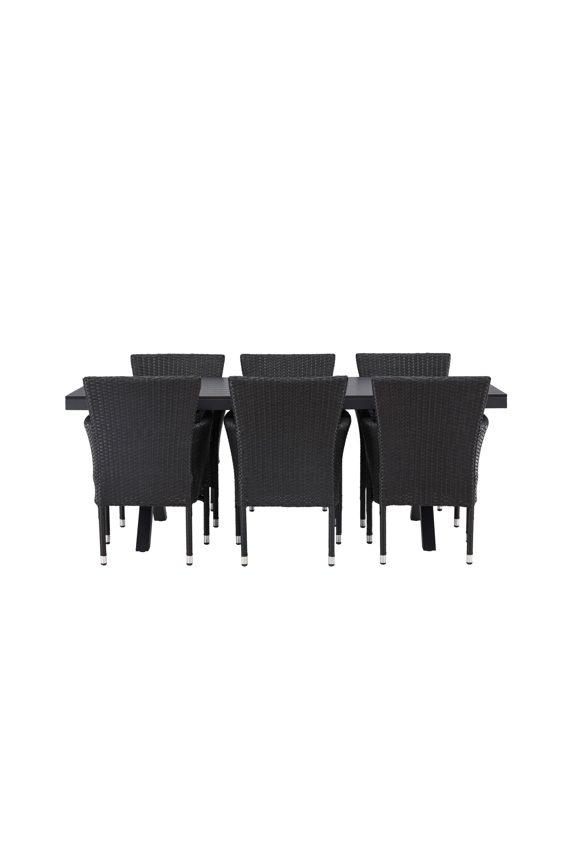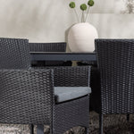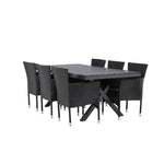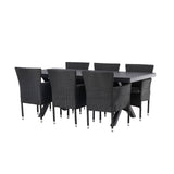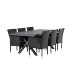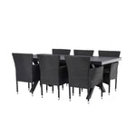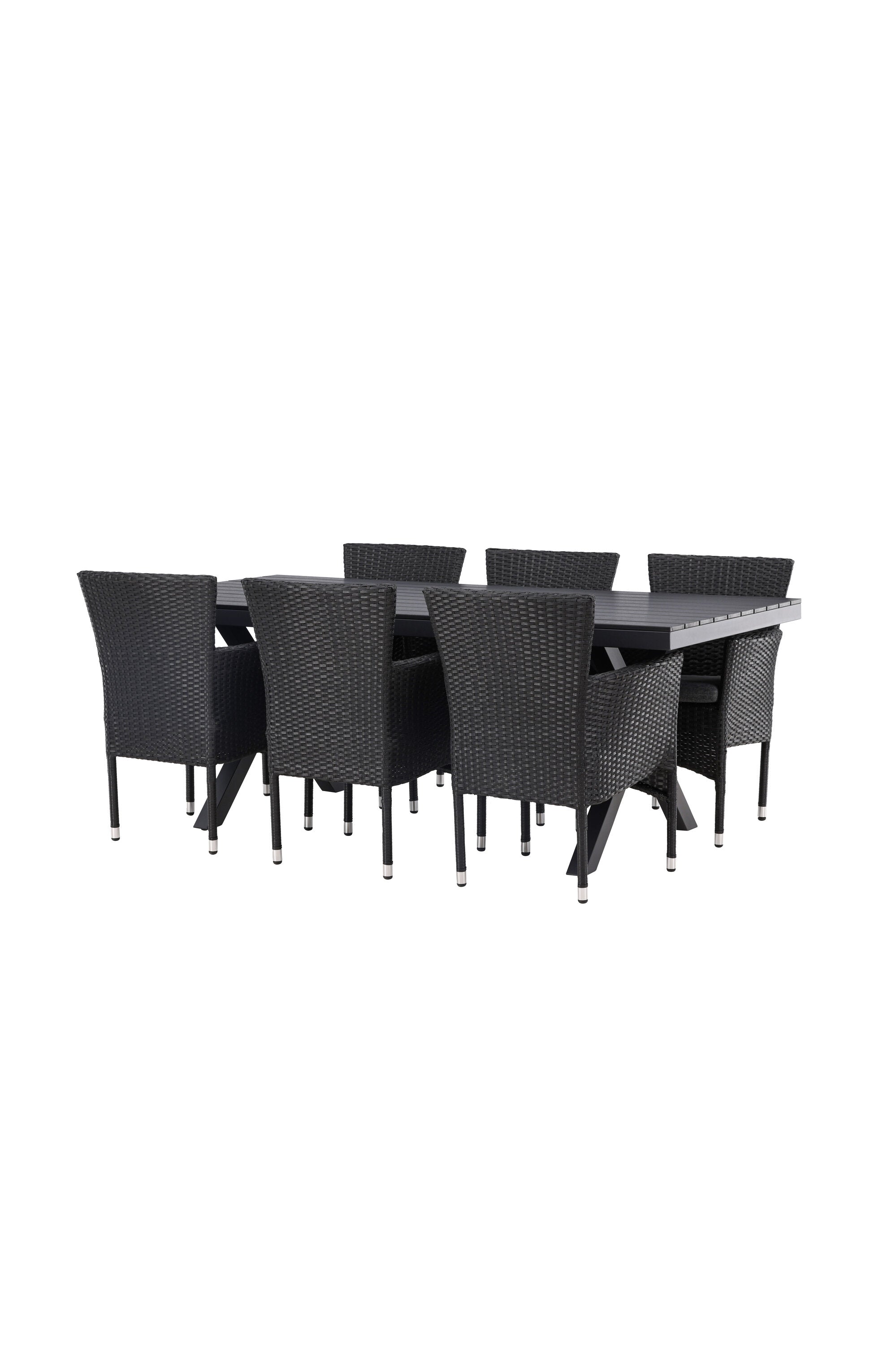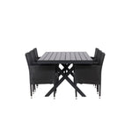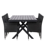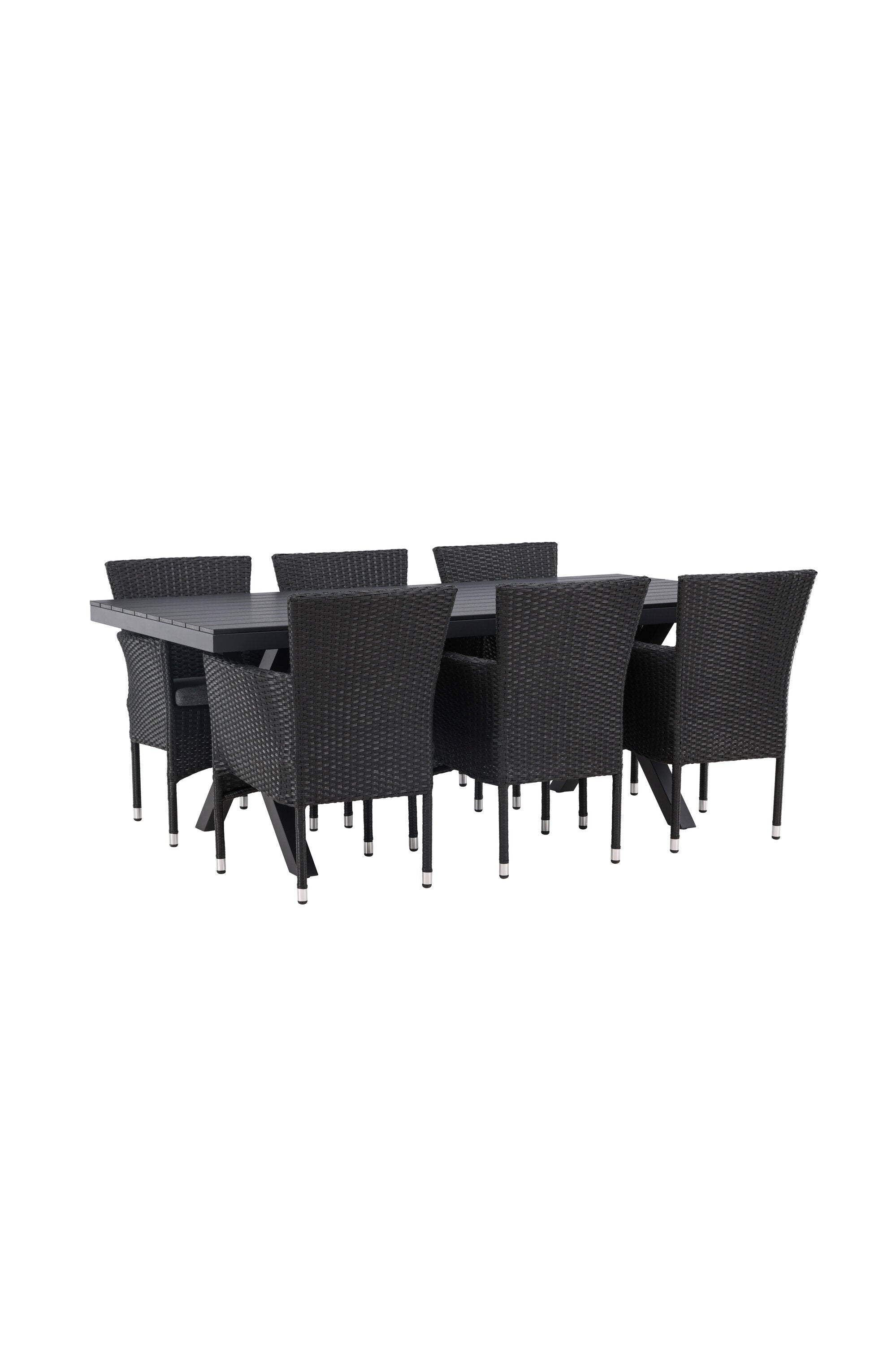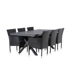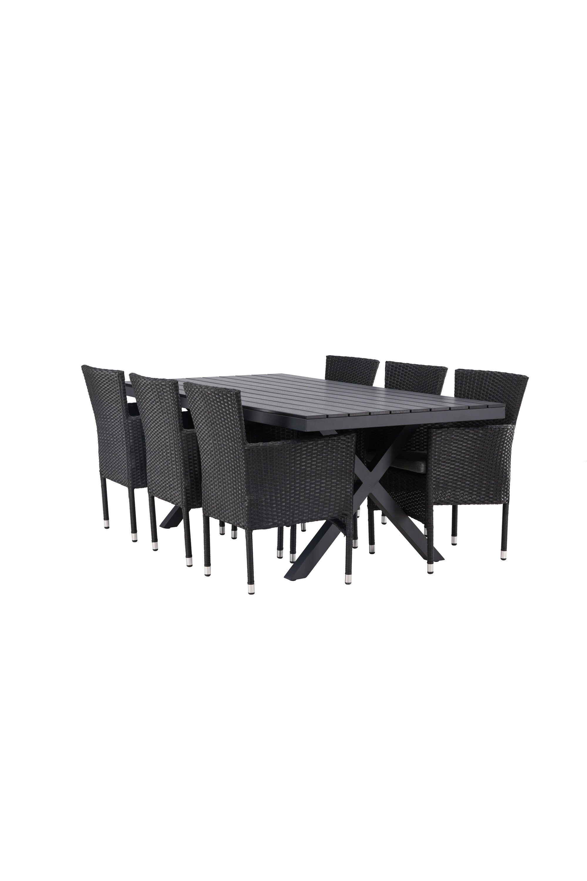 S touto jídelní skupinou snadno zařídíte zimní zahradu nebo terasu moderně a pohodlně! Náš obdélníkový jídelní stůl Garcia má klasický design s deskou stolu v černém aintwood a zkříženými nohami stolu v černém hliníku. Jídelní židle patří do série Malina a zaručeně obstojí ve zkoušce času. Židle má hliníkový rám a je čalouněná pleteným, černým umělým ratanem. Pozvěte své přátele na mnoho skvělých jídel venku v budoucnu! Rozměry stolu: 200 x 100 cm.
