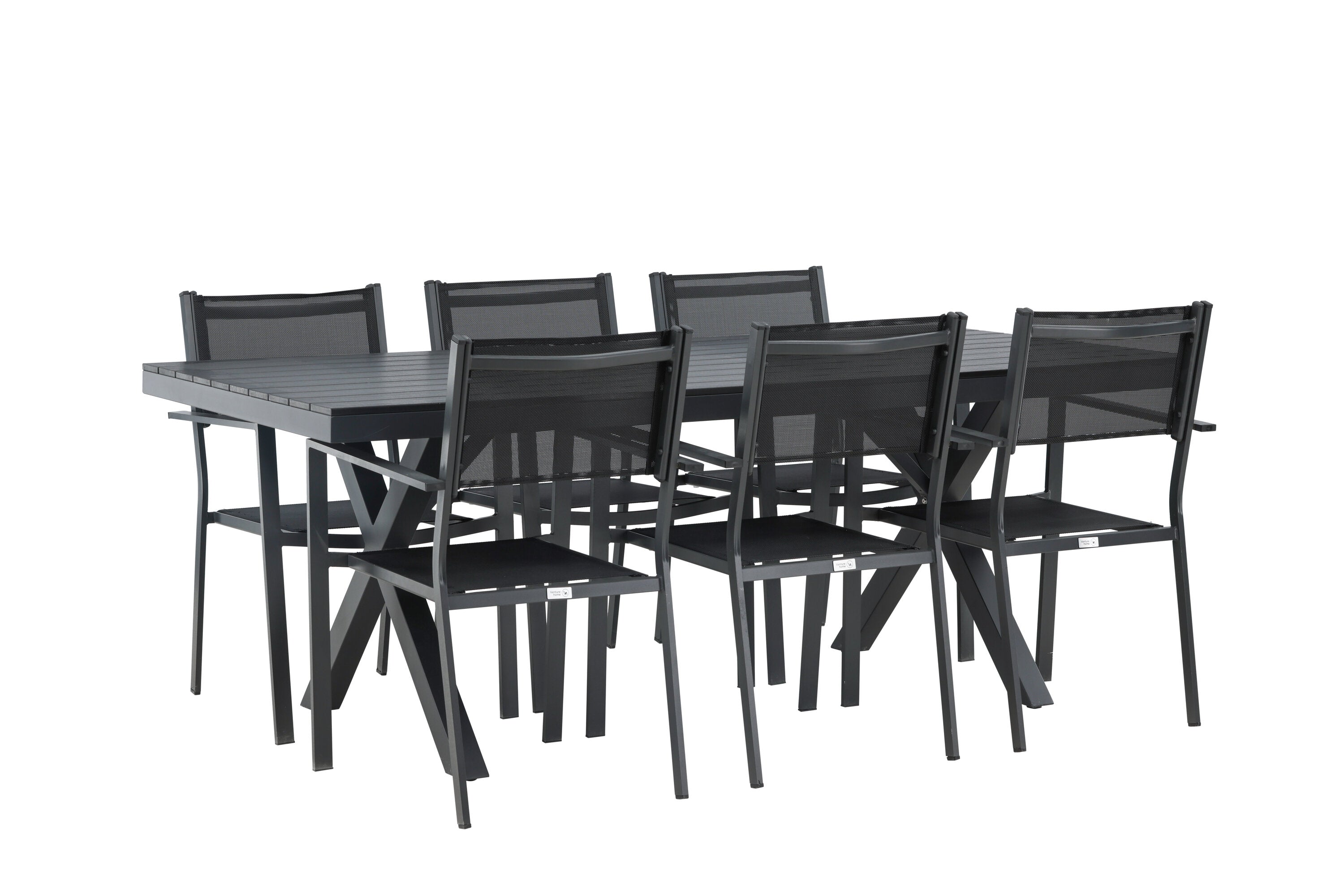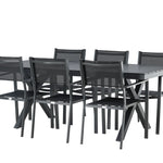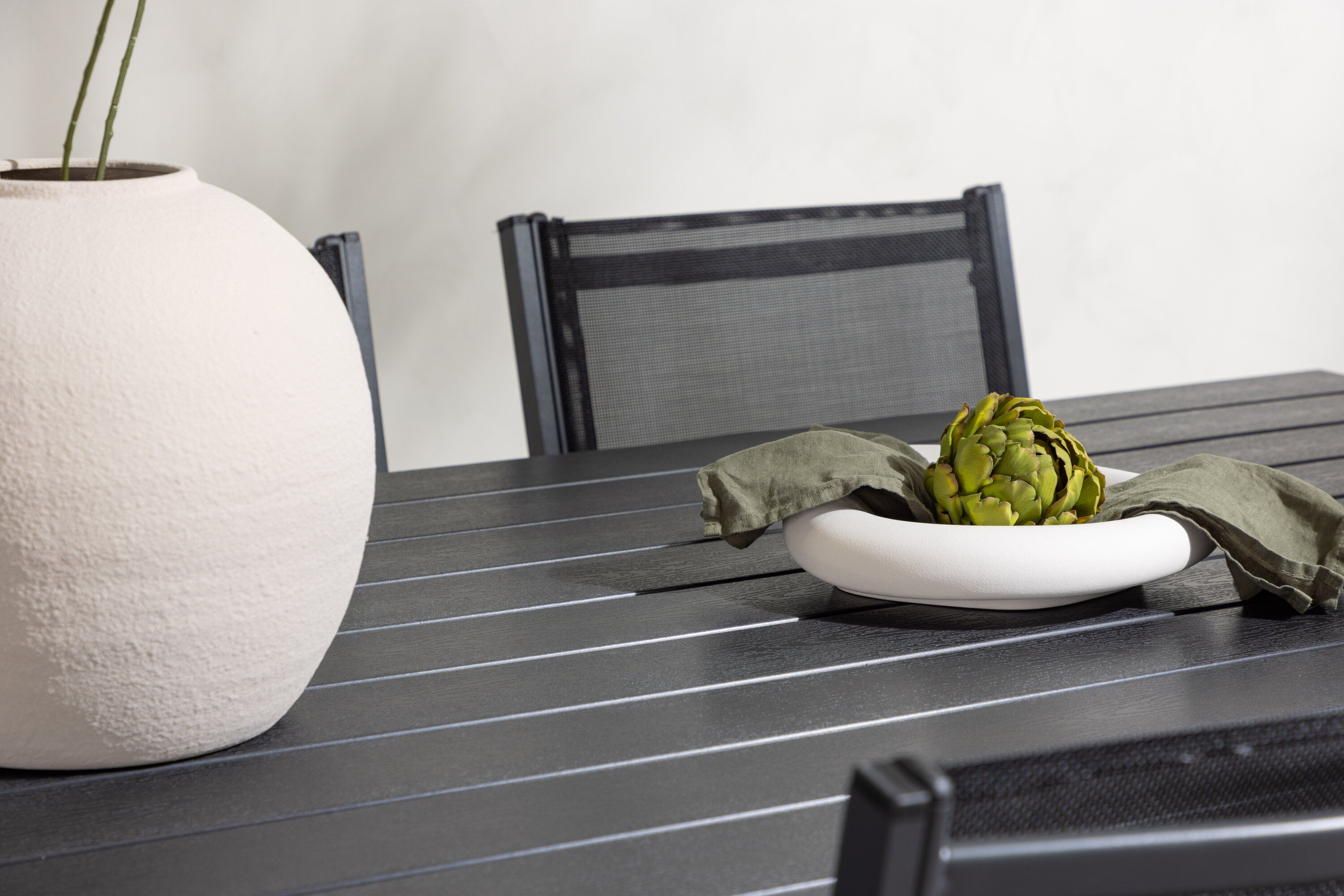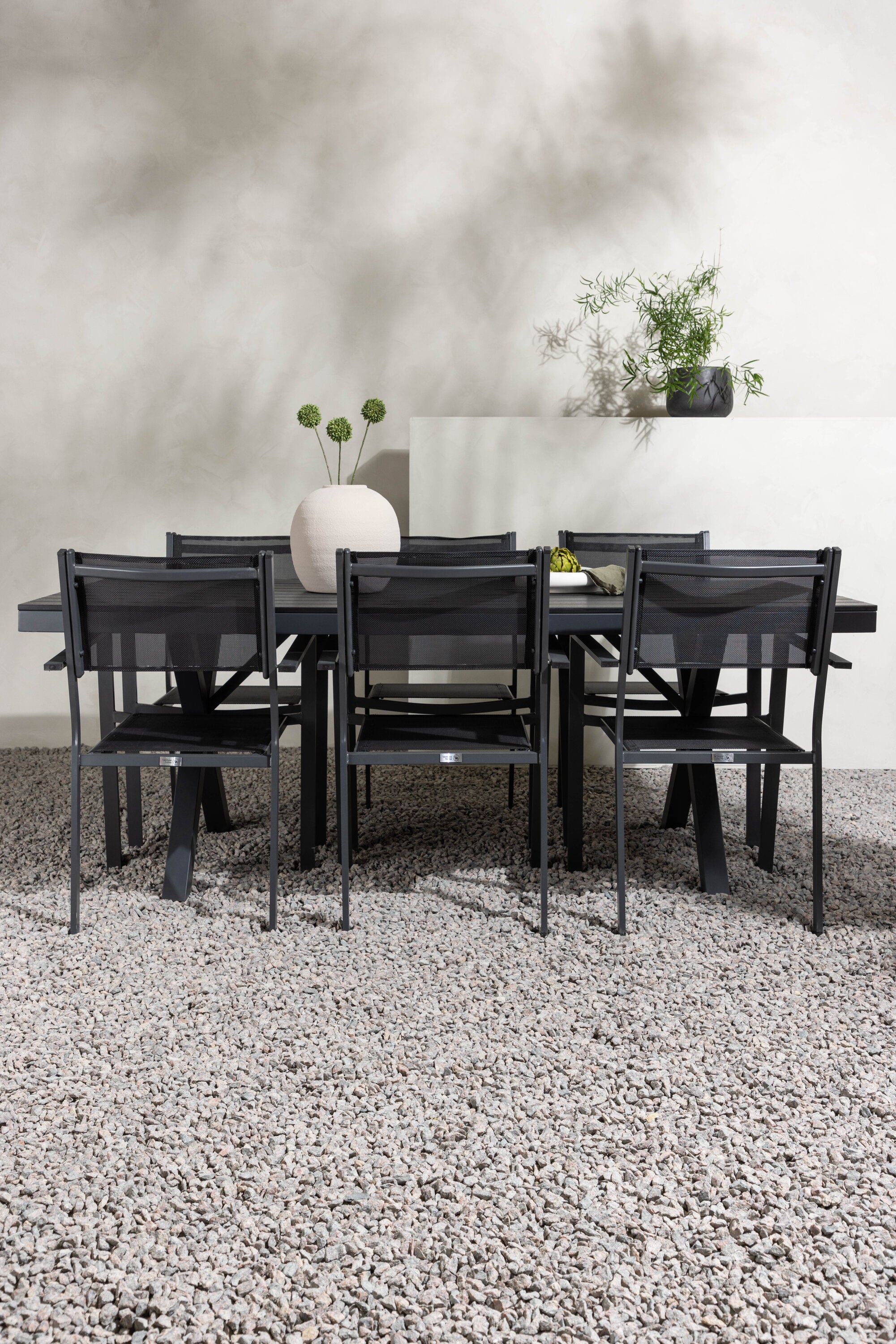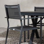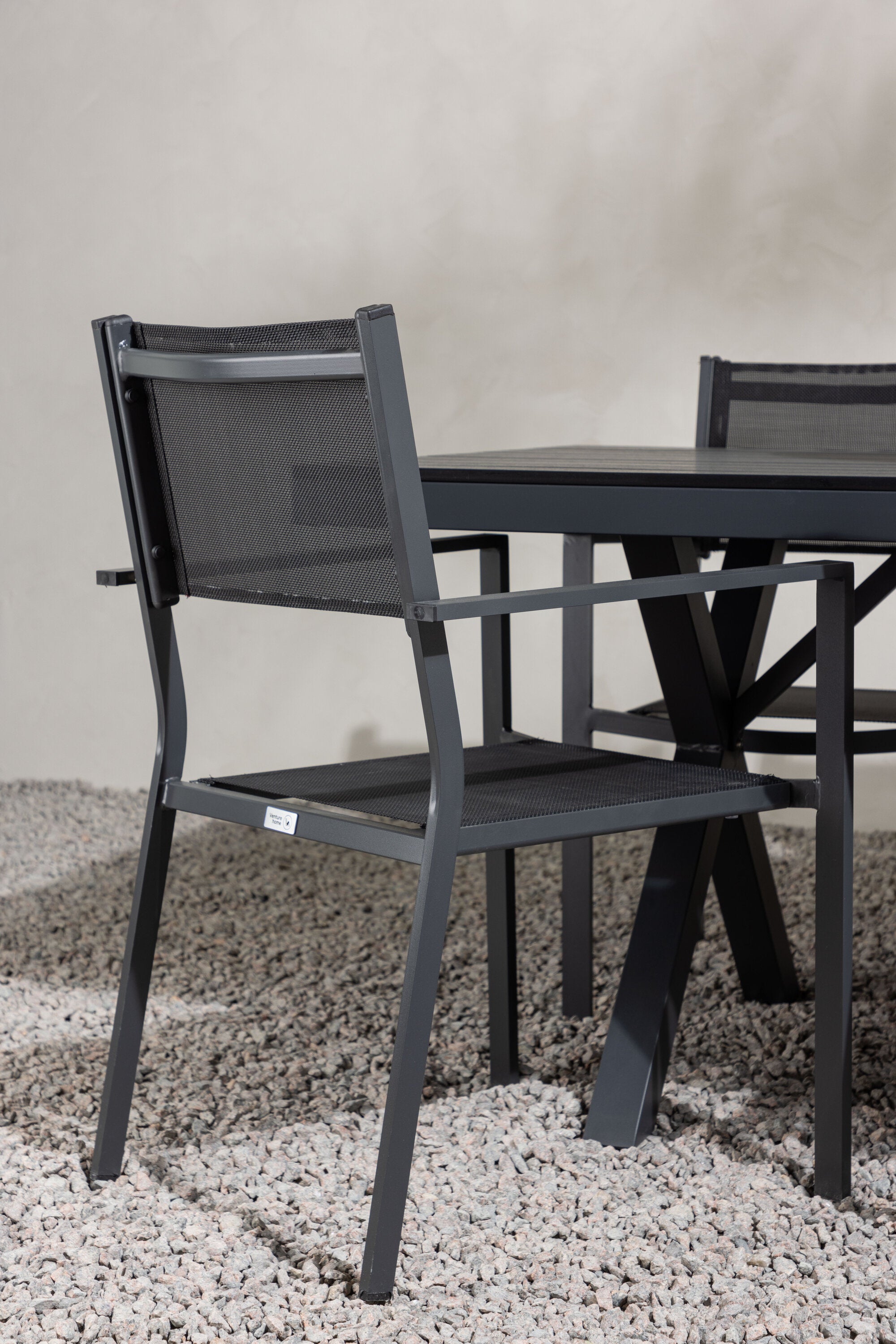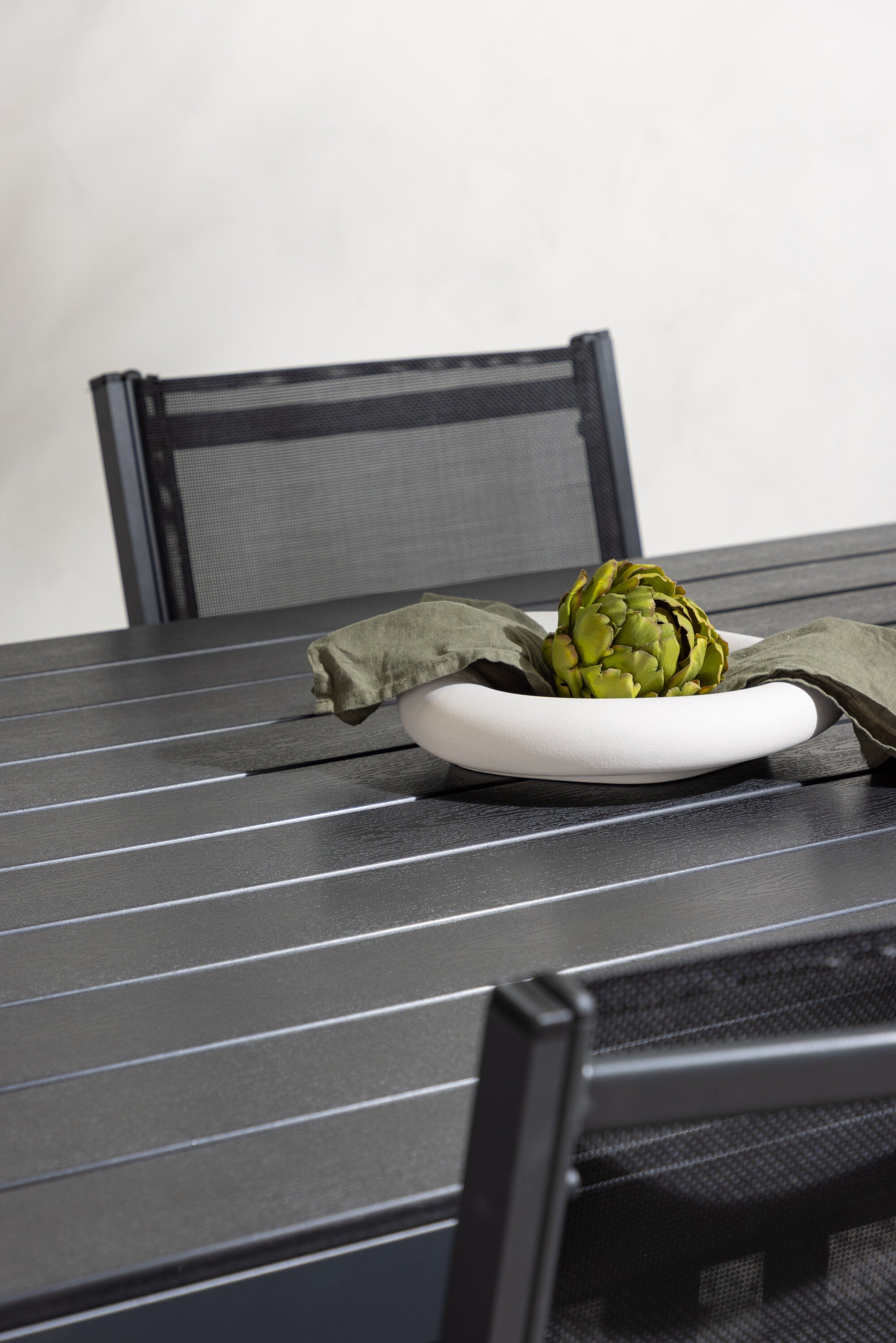 S celočernou jídelní skupinou nikdy neuděláte chybu! Náš obdélníkový jídelní stůl Garcia má klasický design s deskou stolu v černém aintwood a zkříženými nohami stolu v černém hliníku. Zde ve stylové kombinaci s našimi pohodlnými jídelními židlemi ze série Copacabana. Židle má rovný severský design v černém hliníku a sedák z textilu. Zařiďte si terasu lákavě a podle trendů! Rozměry stolu: 200 x 100 cm.