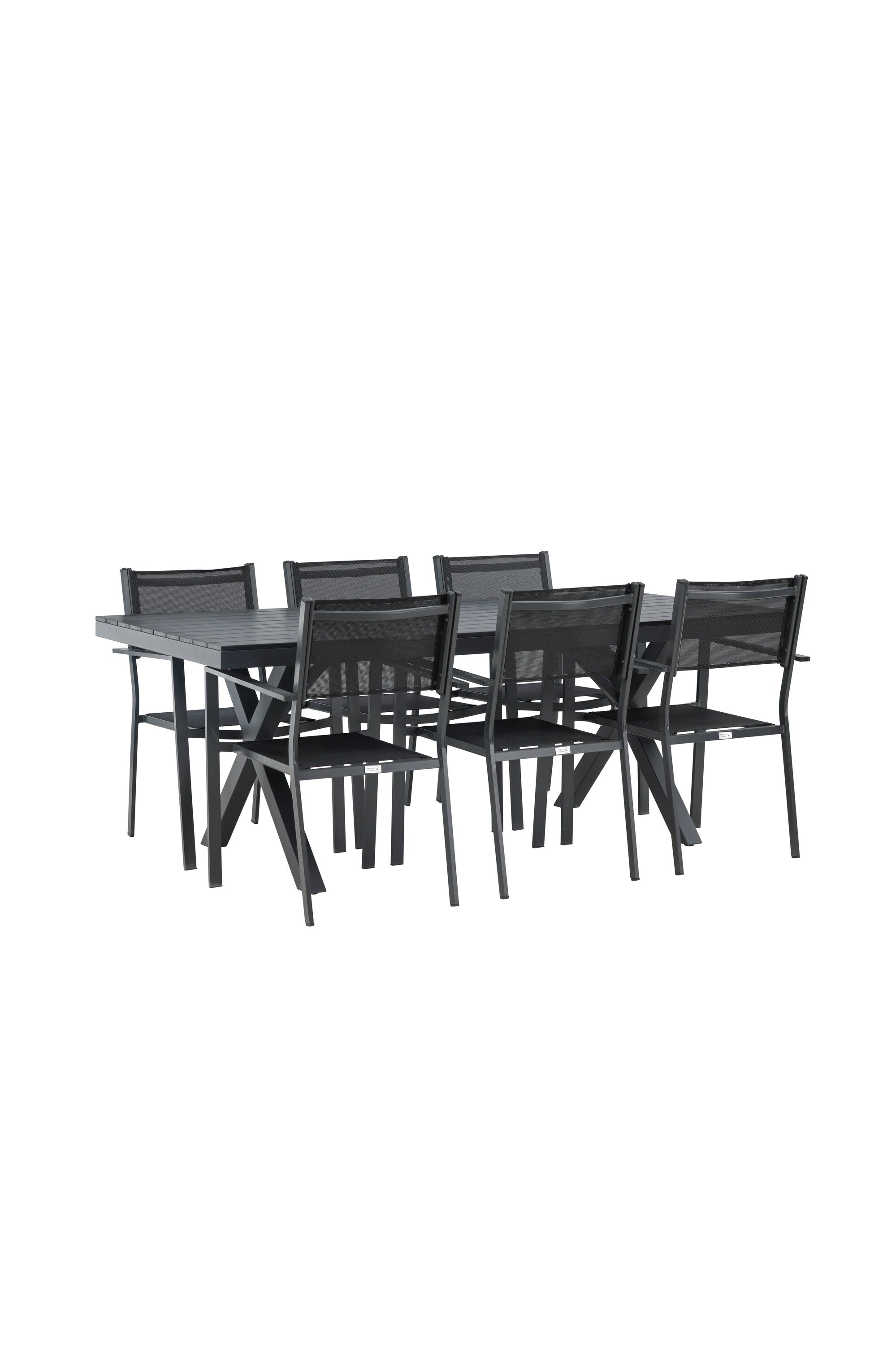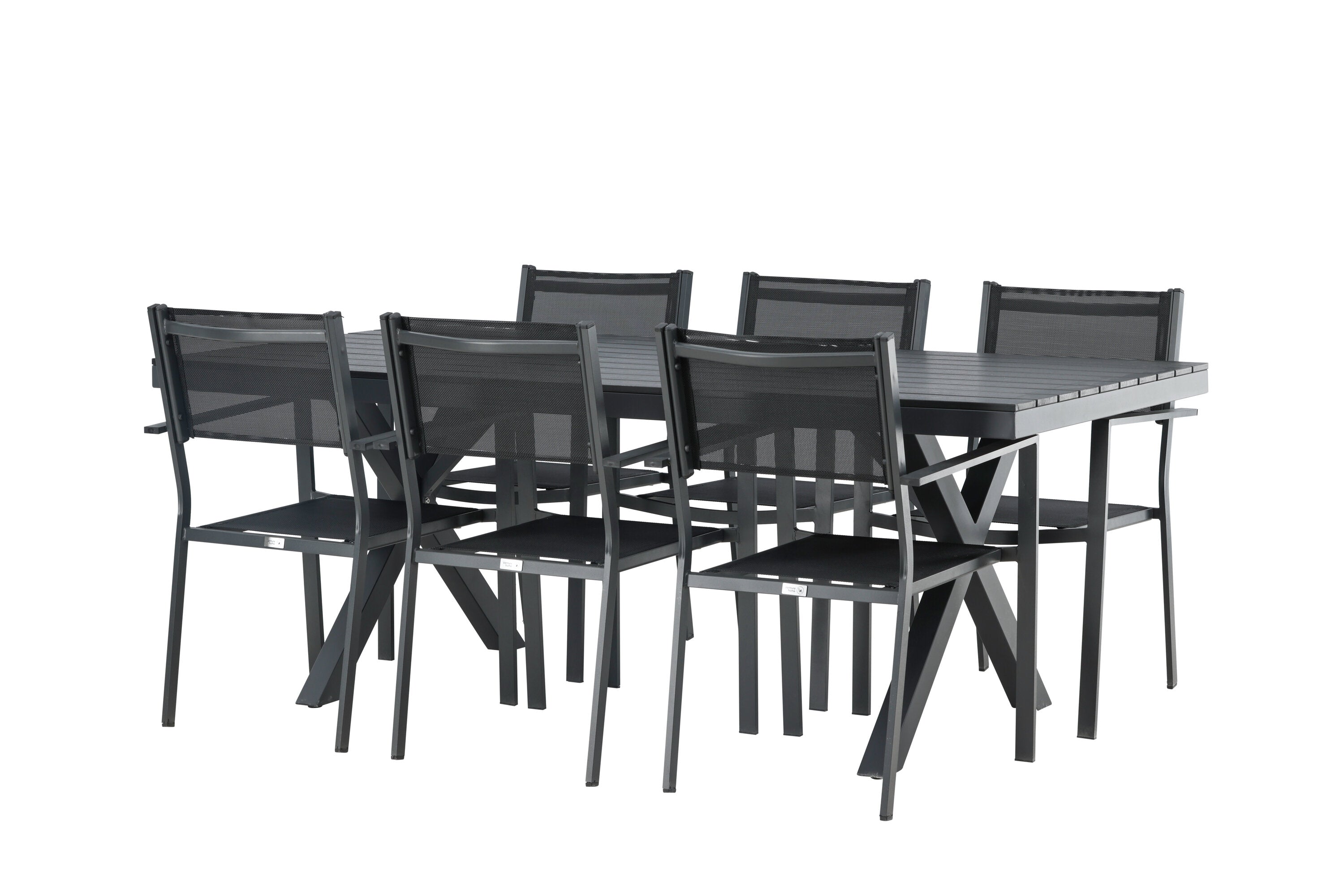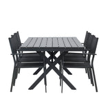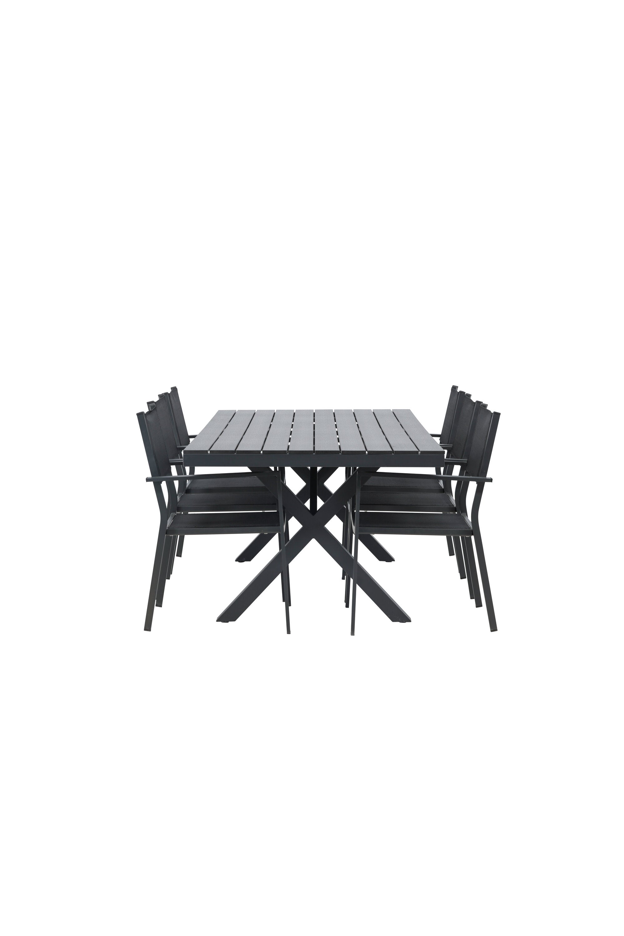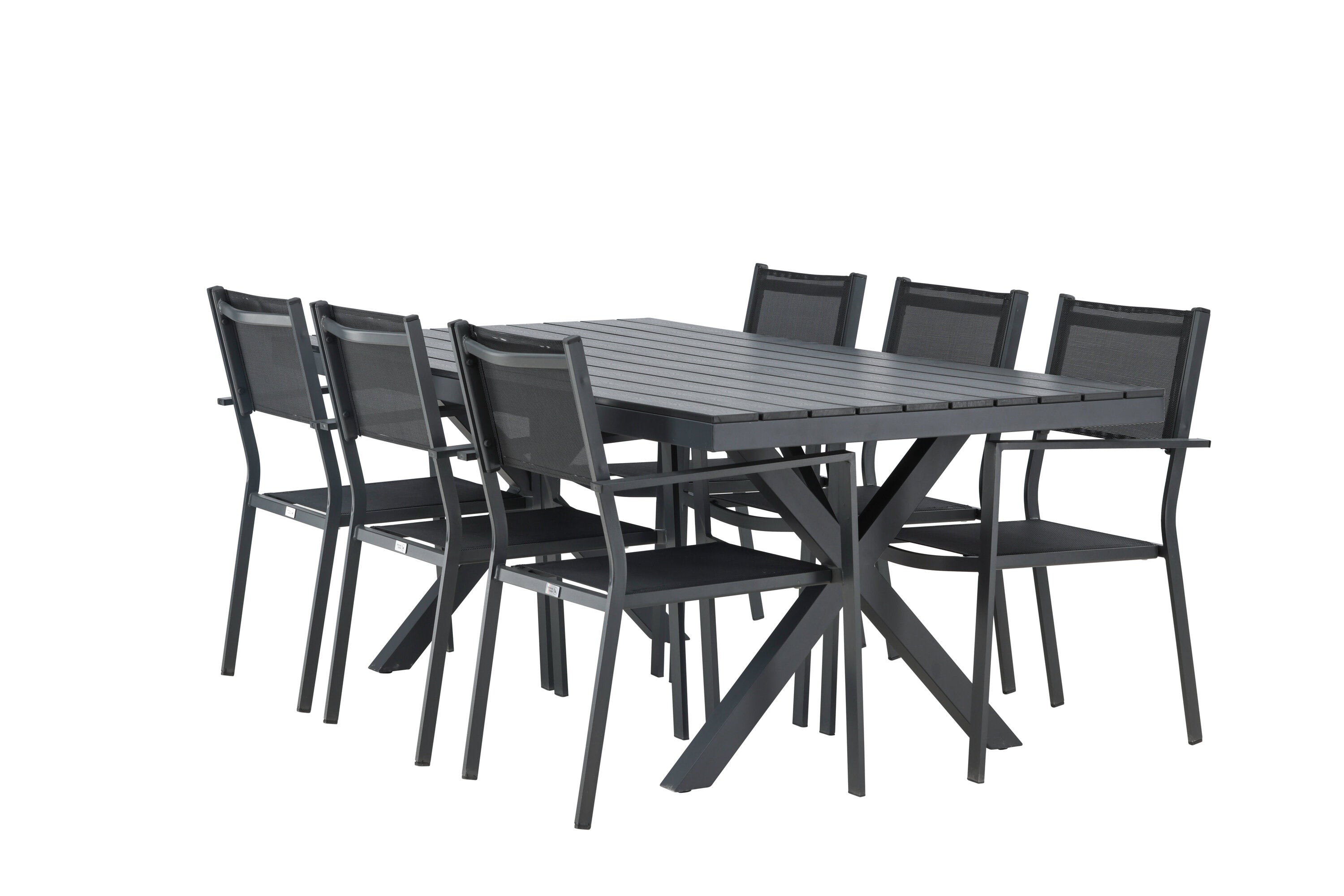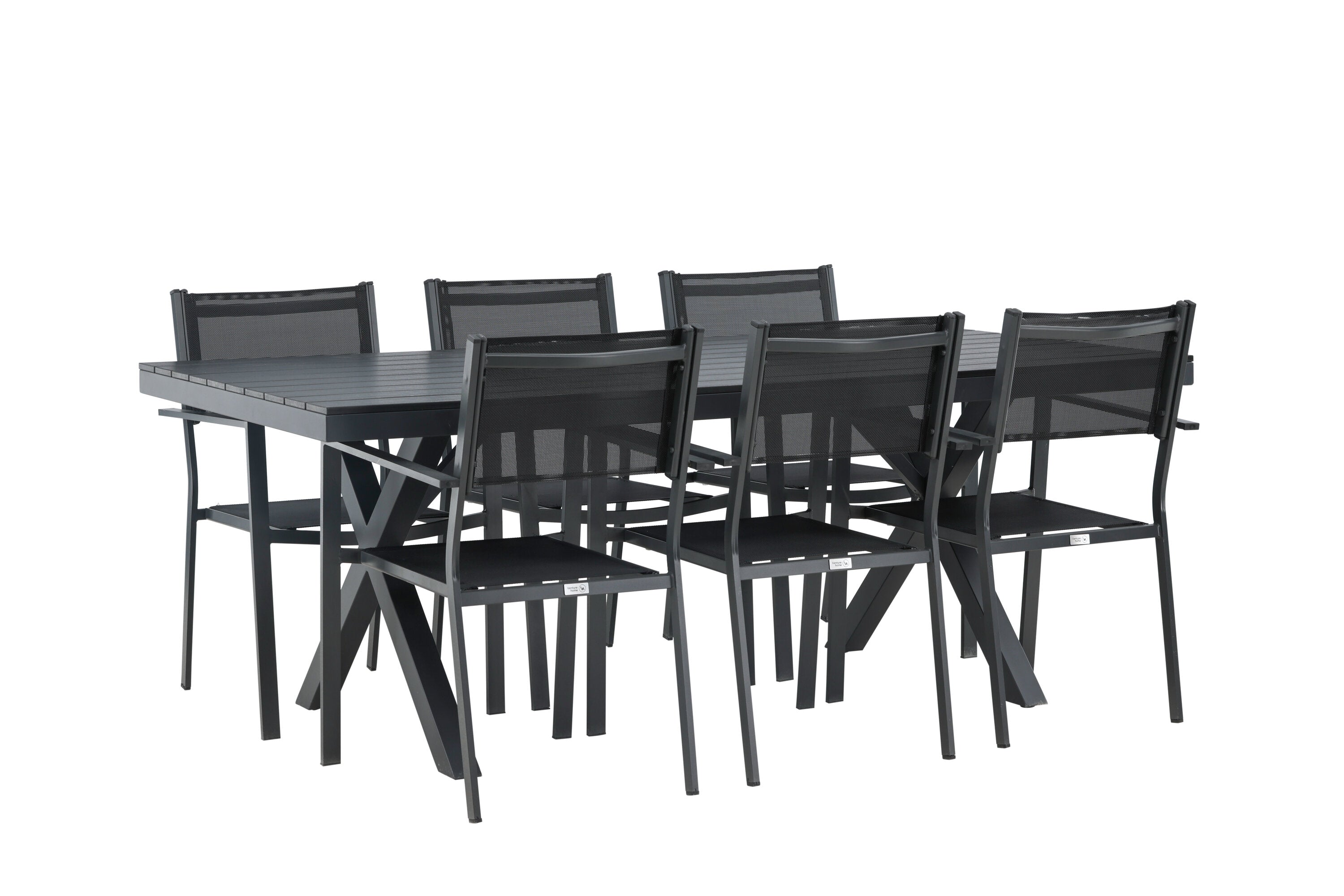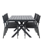 S celočernou jídelní skupinou nikdy neuděláte chybu! Náš obdélníkový jídelní stůl Garcia má klasický design s deskou stolu v černém aintwood a zkříženými nohami stolu v černém hliníku. Zde ve stylové kombinaci s našimi pohodlnými jídelními židlemi ze série Copacabana. Židle má rovný severský design v černém hliníku a sedák z textilu. Zařiďte si terasu lákavě a podle trendů! Rozměry stolu: 200 x 100 cm.
