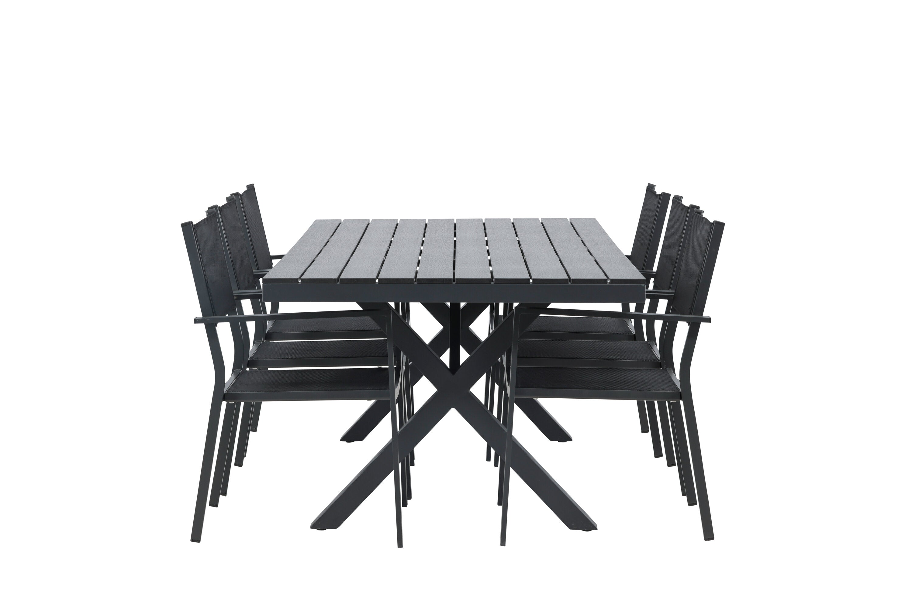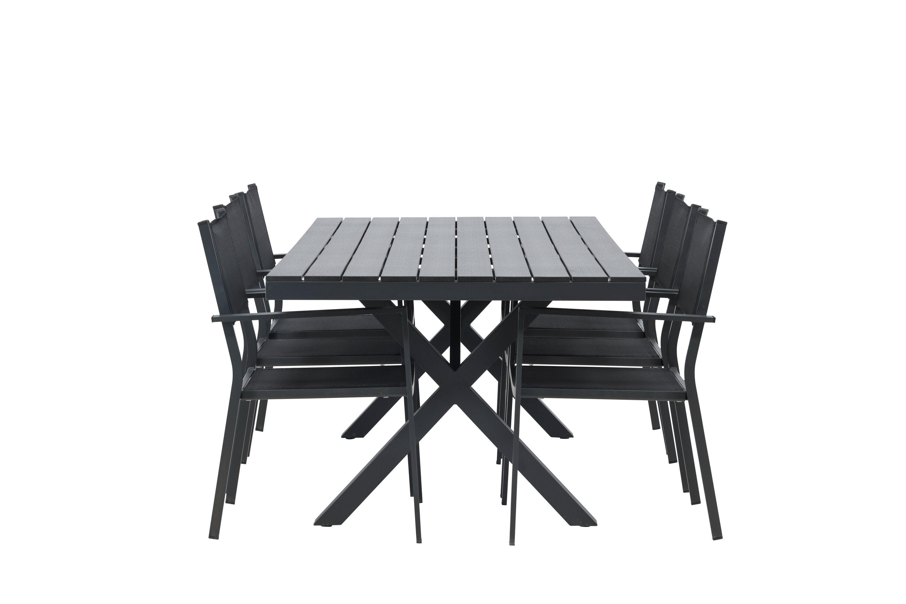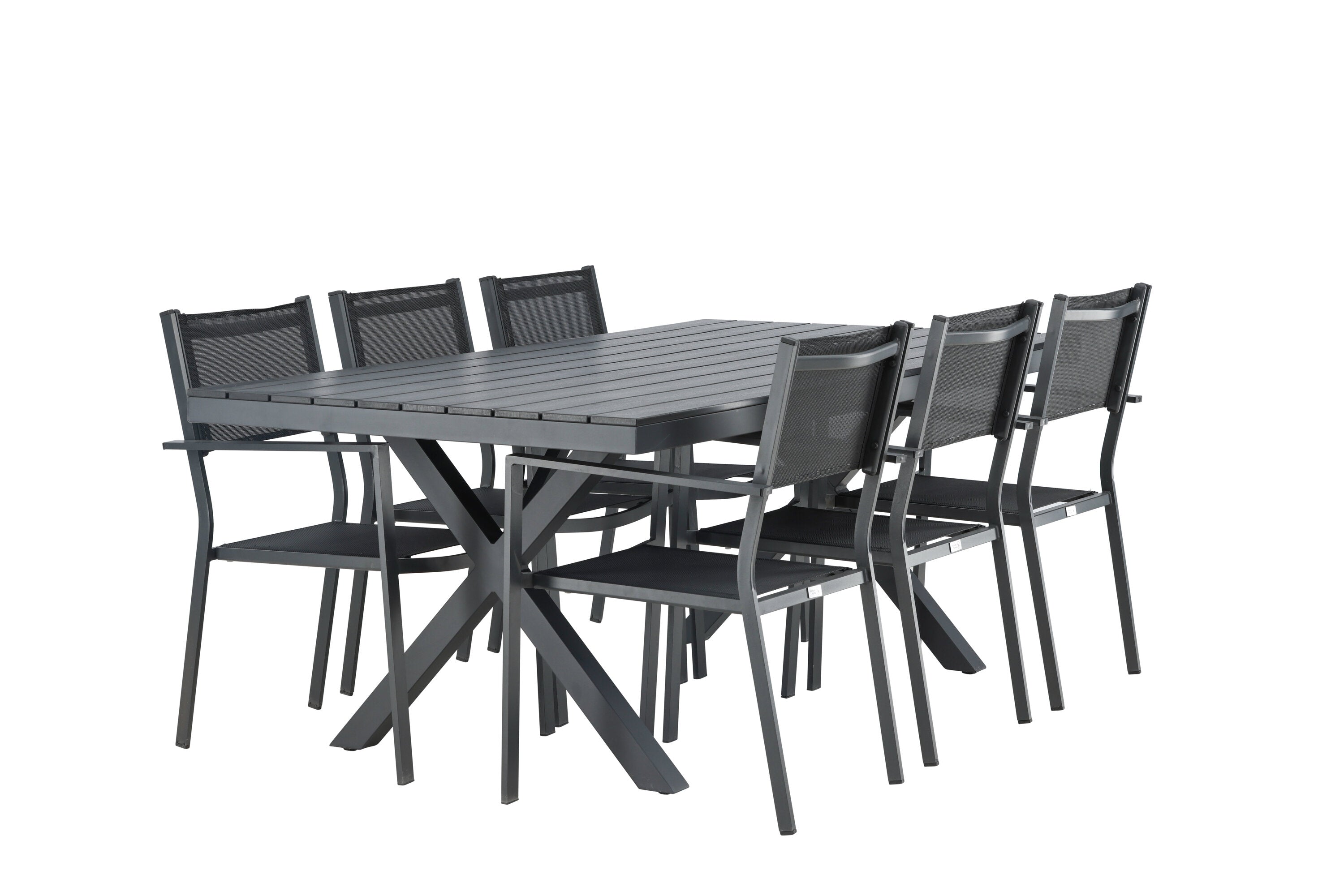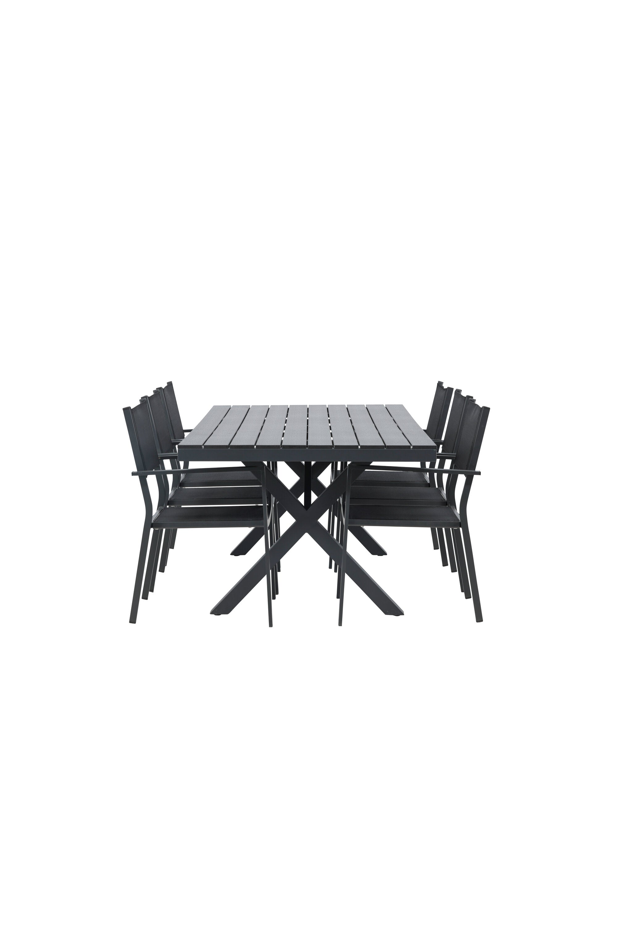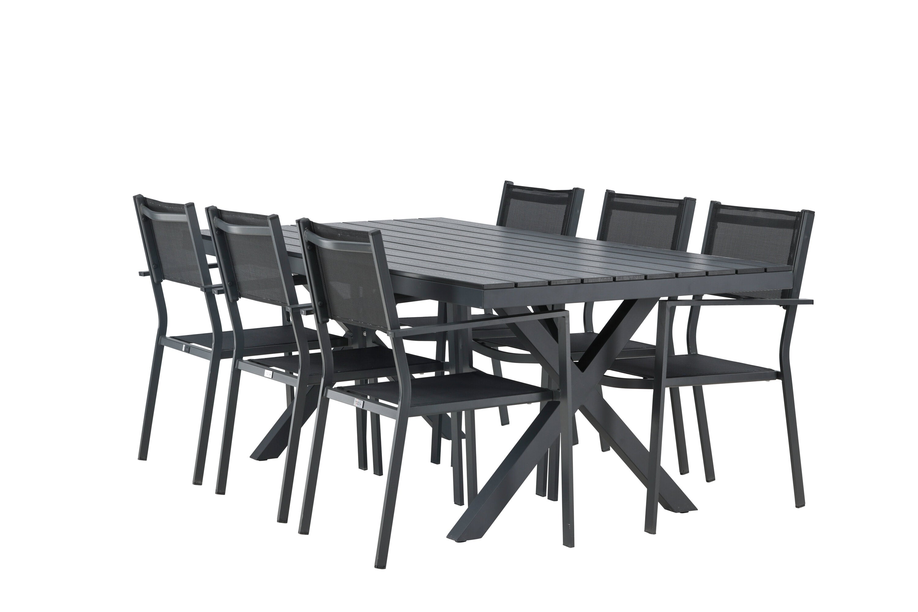 S celočernou jídelní skupinou nikdy neuděláte chybu! Náš obdélníkový jídelní stůl Garcia má klasický design s deskou stolu v černém aintwood a zkříženými nohami stolu v černém hliníku. Zde ve stylové kombinaci s našimi pohodlnými jídelními židlemi ze série Copacabana. Židle má rovný severský design v černém hliníku a sedák z textilu. Zařiďte si terasu lákavě a podle trendů! Rozměry stolu: 200 x 100 cm.
