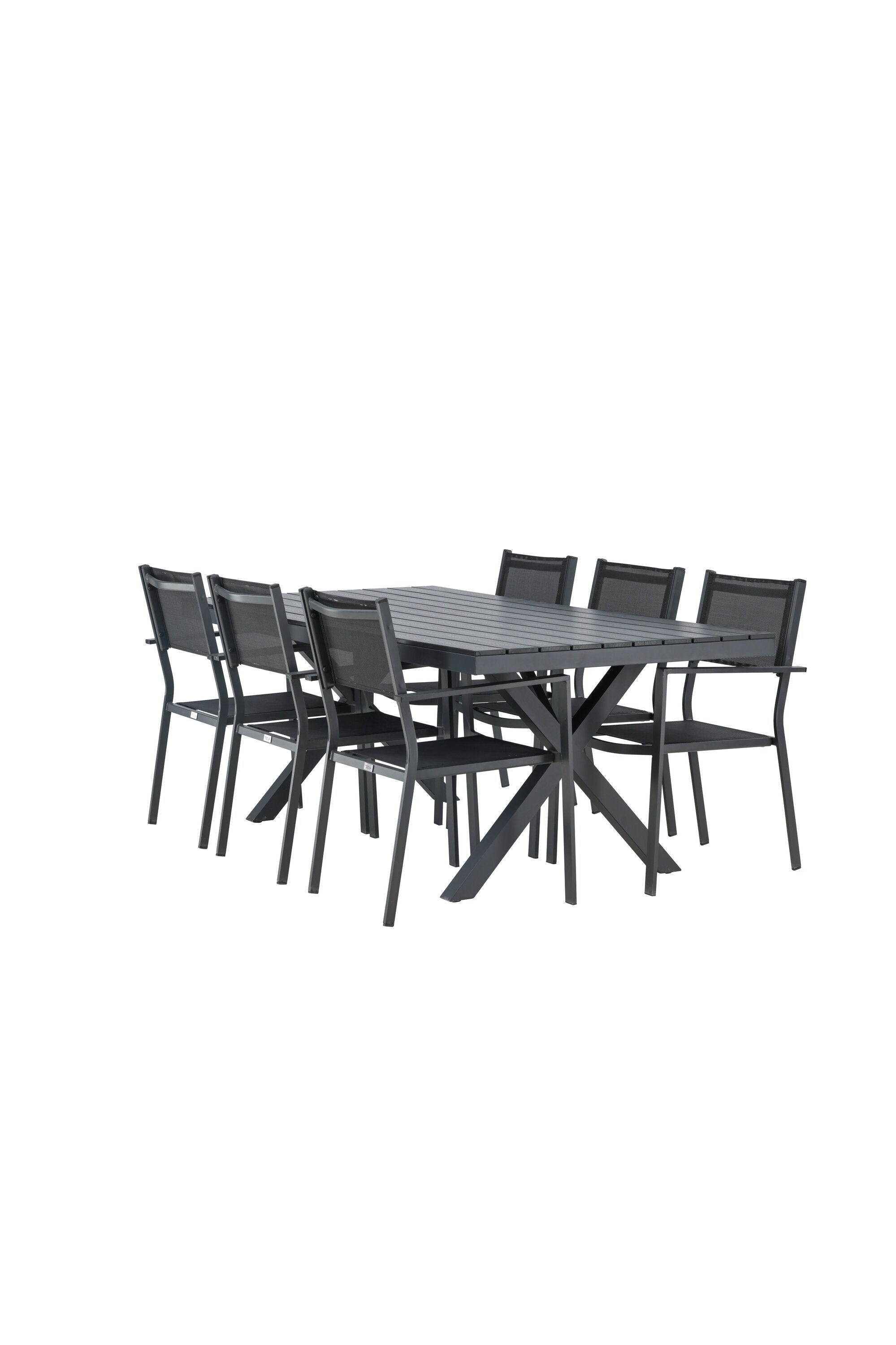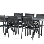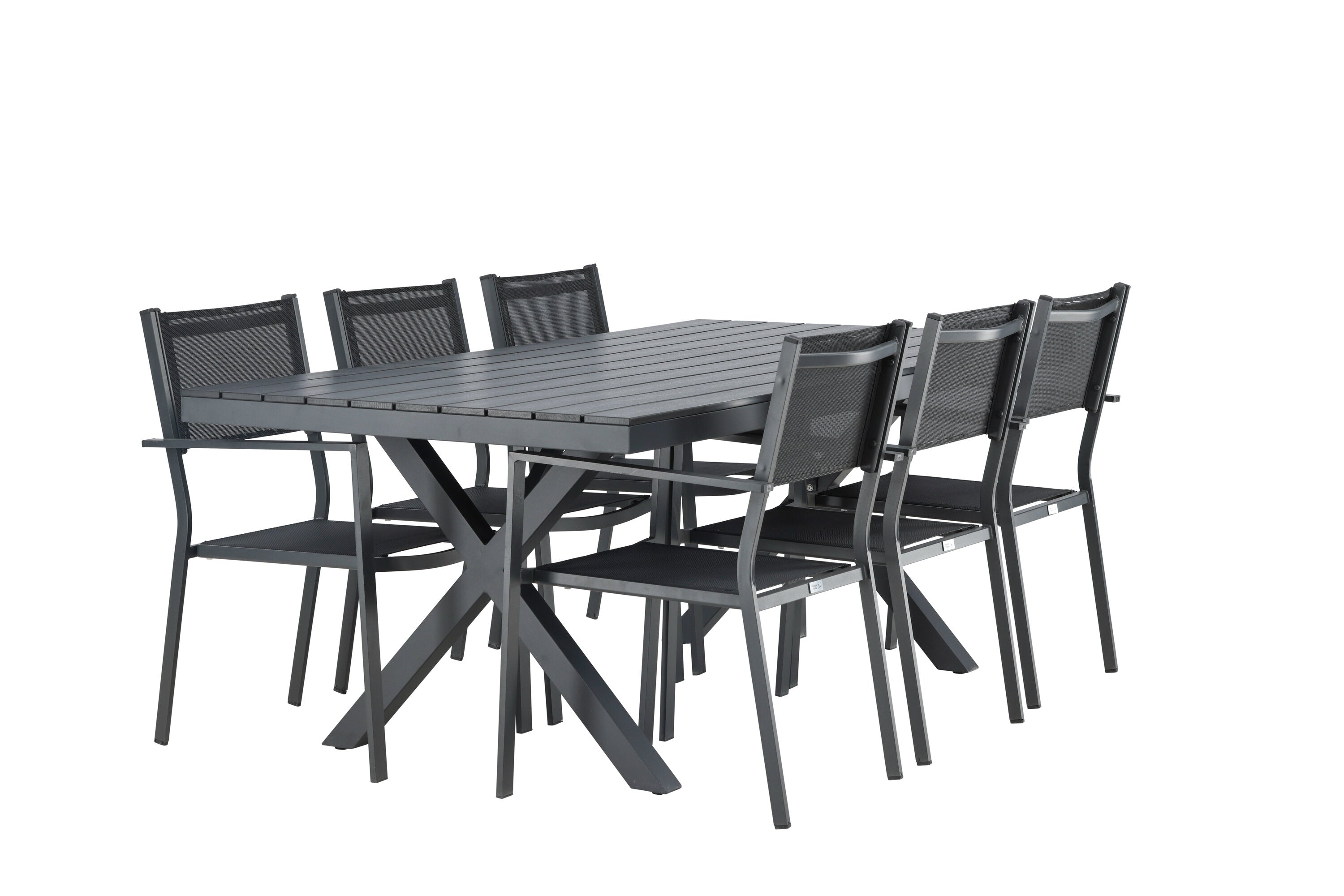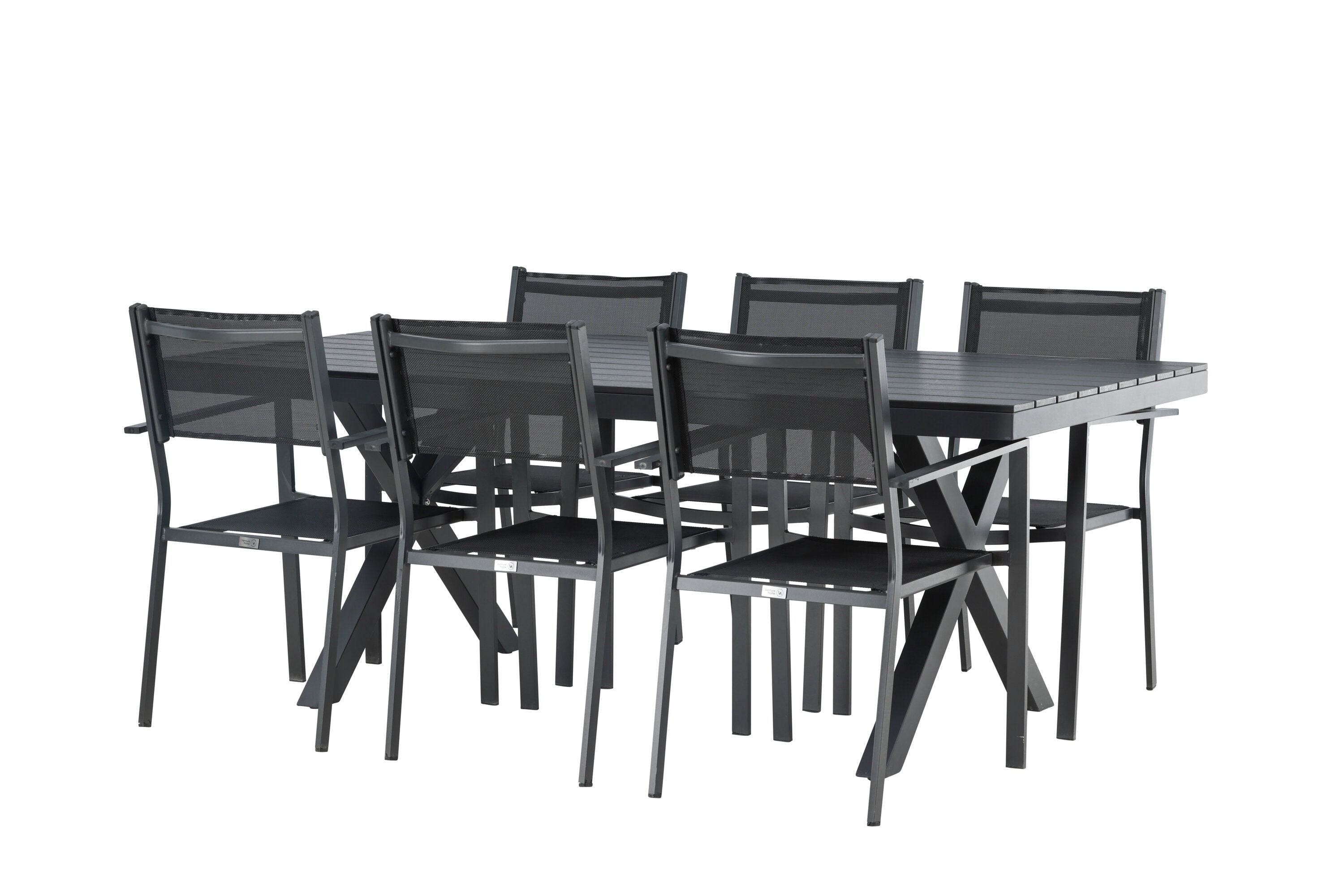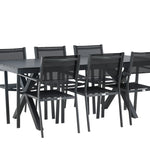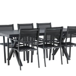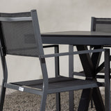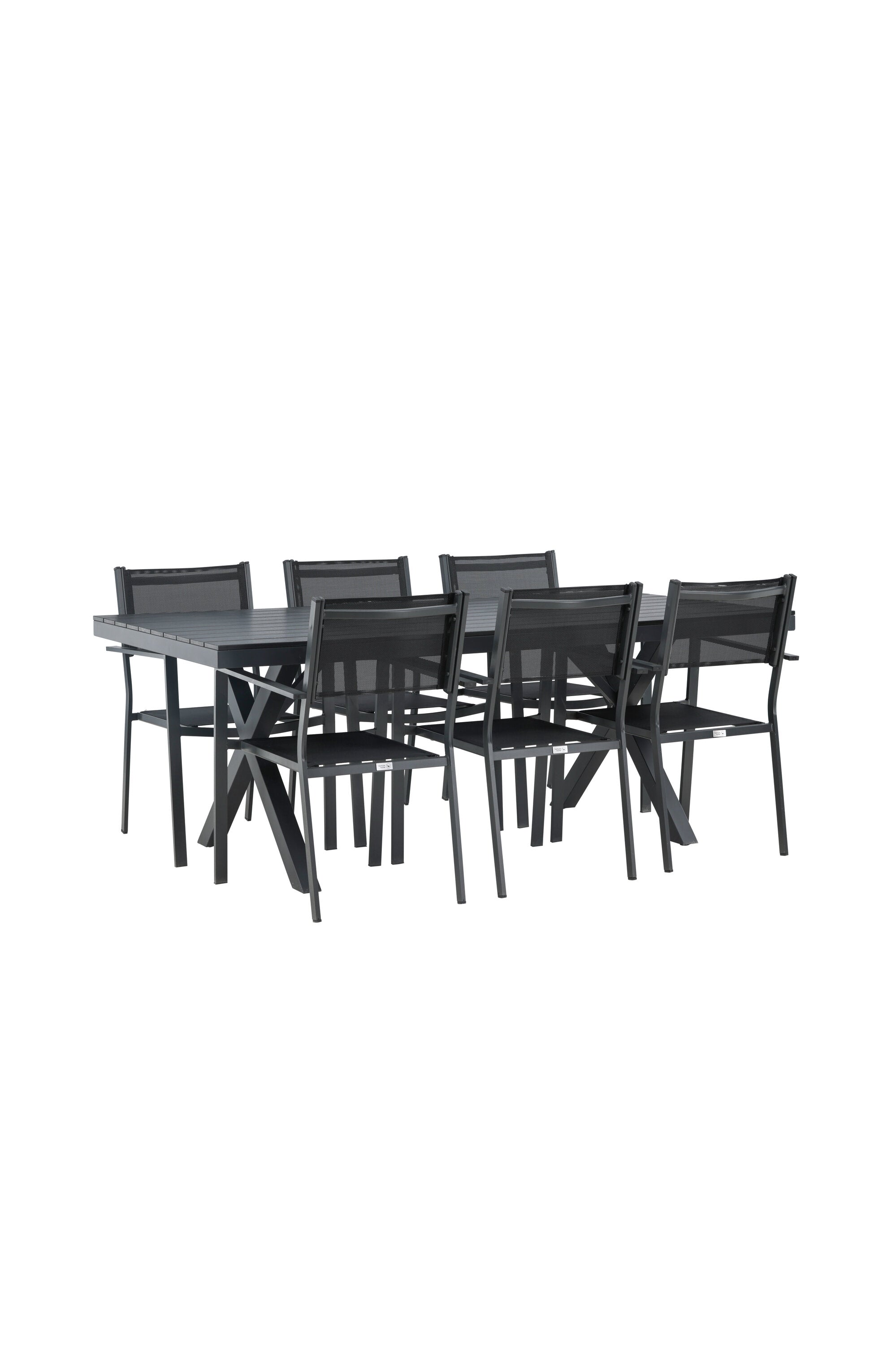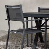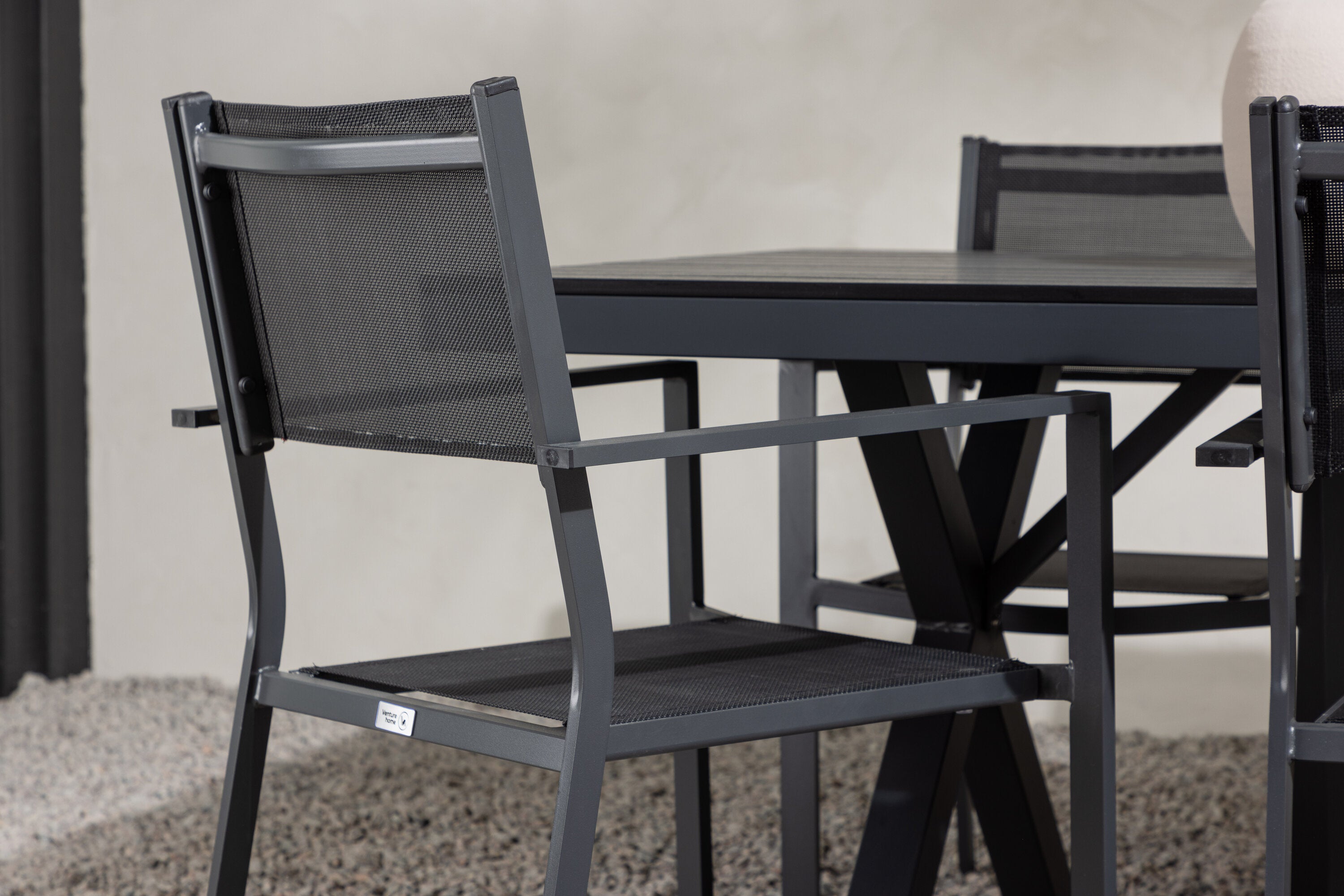 S celočernou jídelní skupinou nikdy neuděláte chybu! Náš obdélníkový jídelní stůl Garcia má klasický design s deskou stolu v černém aintwood a zkříženými nohami stolu v černém hliníku. Zde ve stylové kombinaci s našimi pohodlnými jídelními židlemi ze série Copacabana. Židle má rovný severský design v černém hliníku a sedák z textilu. Zařiďte si terasu lákavě a podle trendů! Rozměry stolu: 200 x 100 cm.