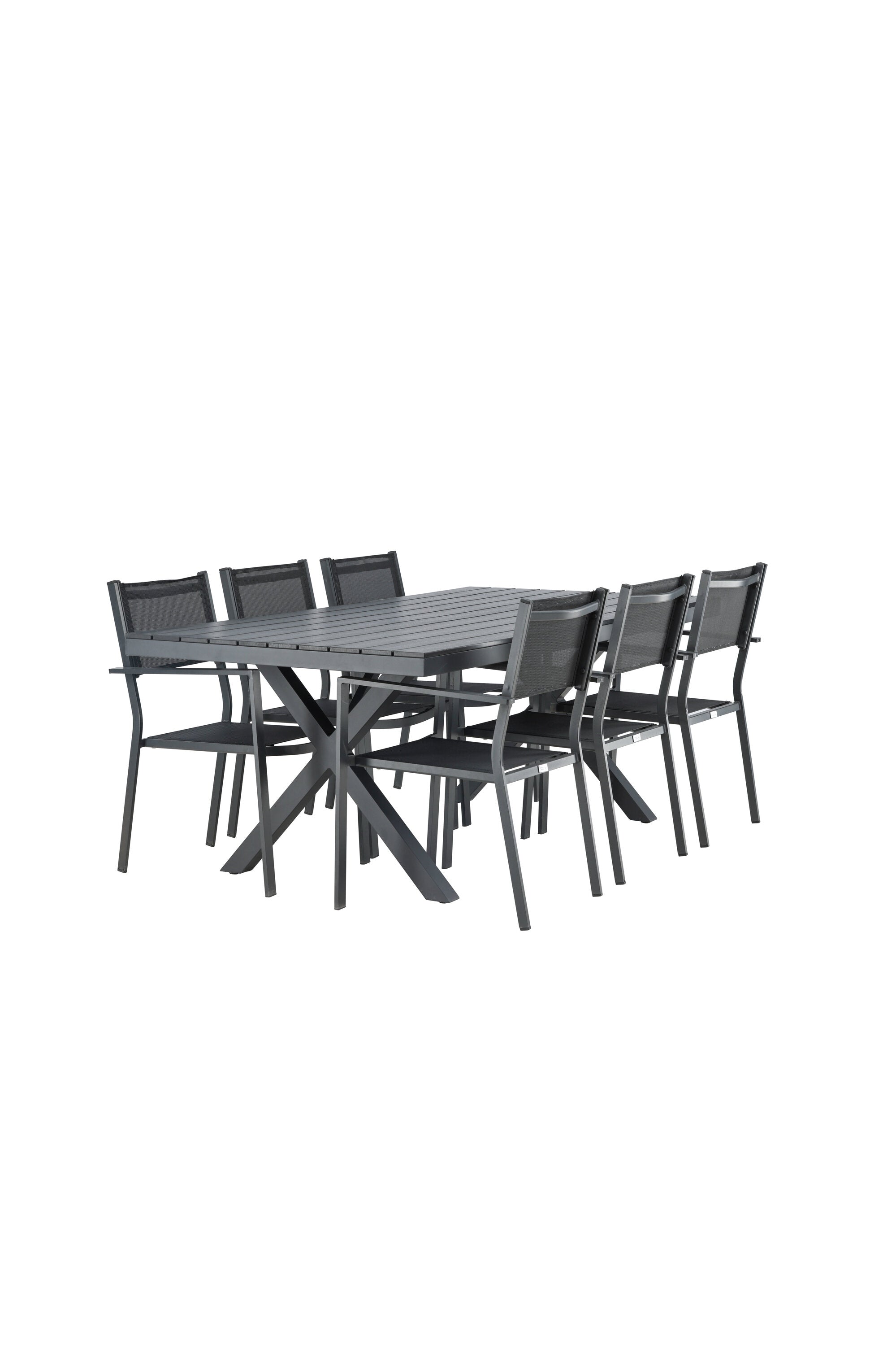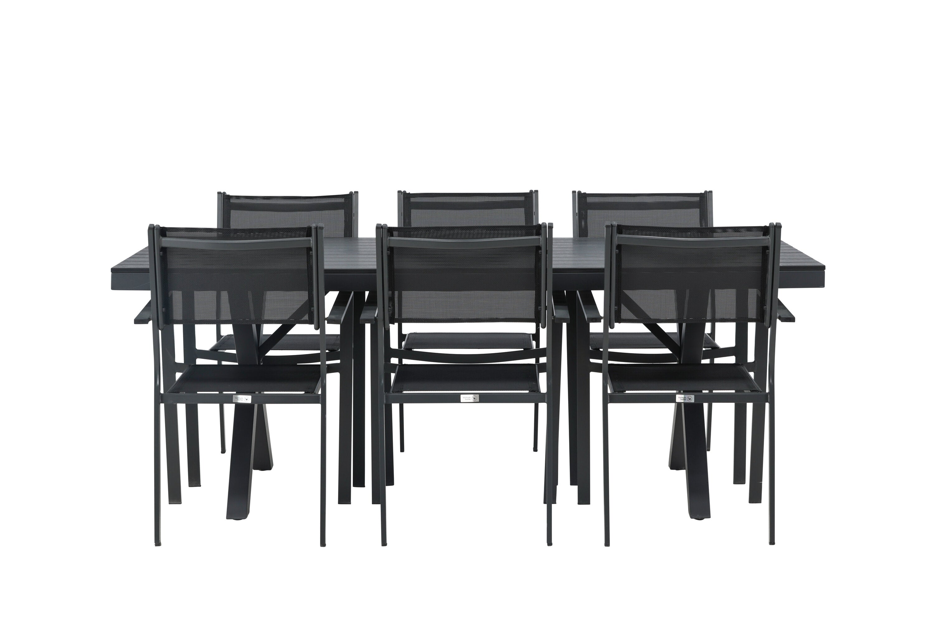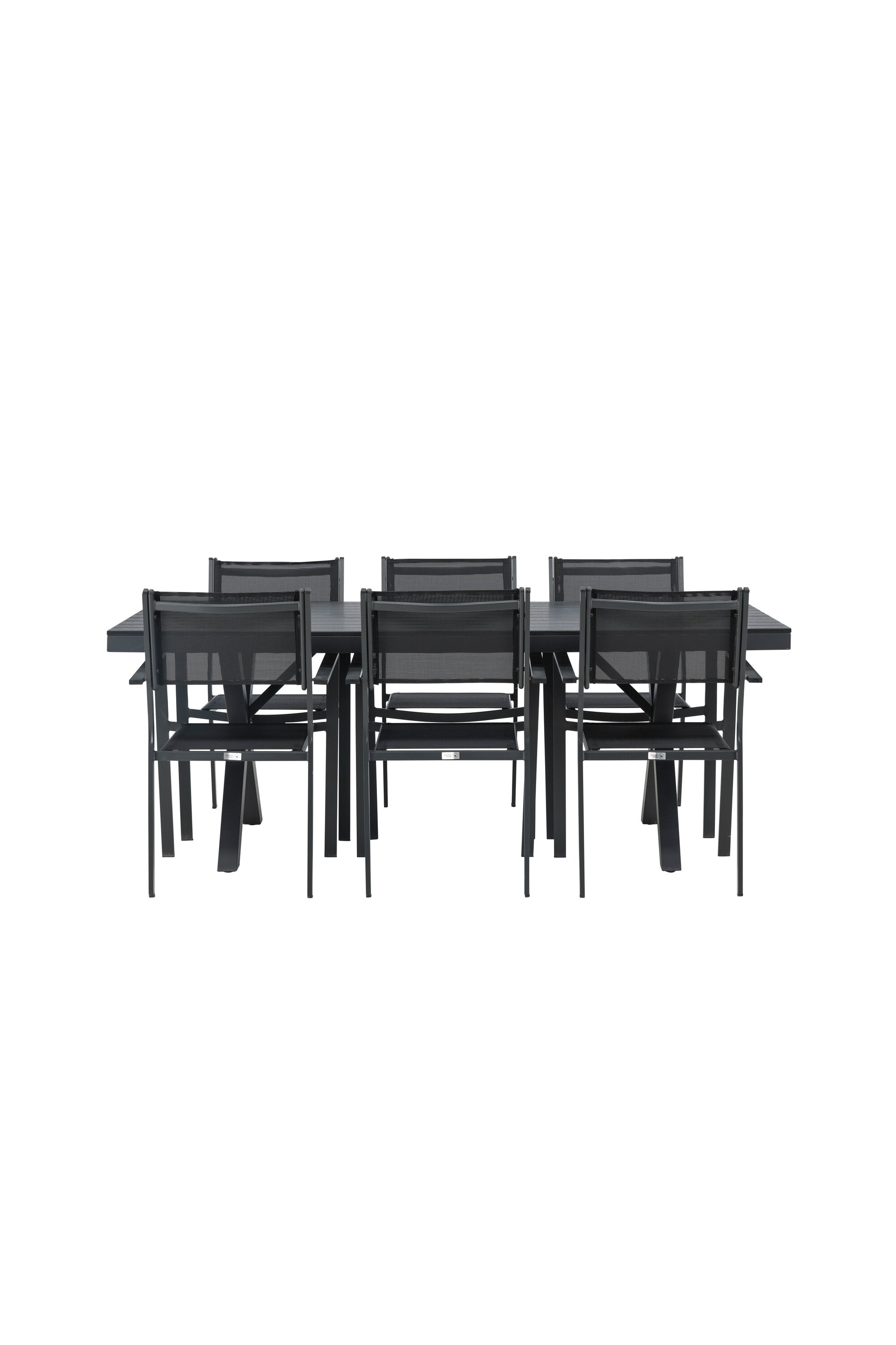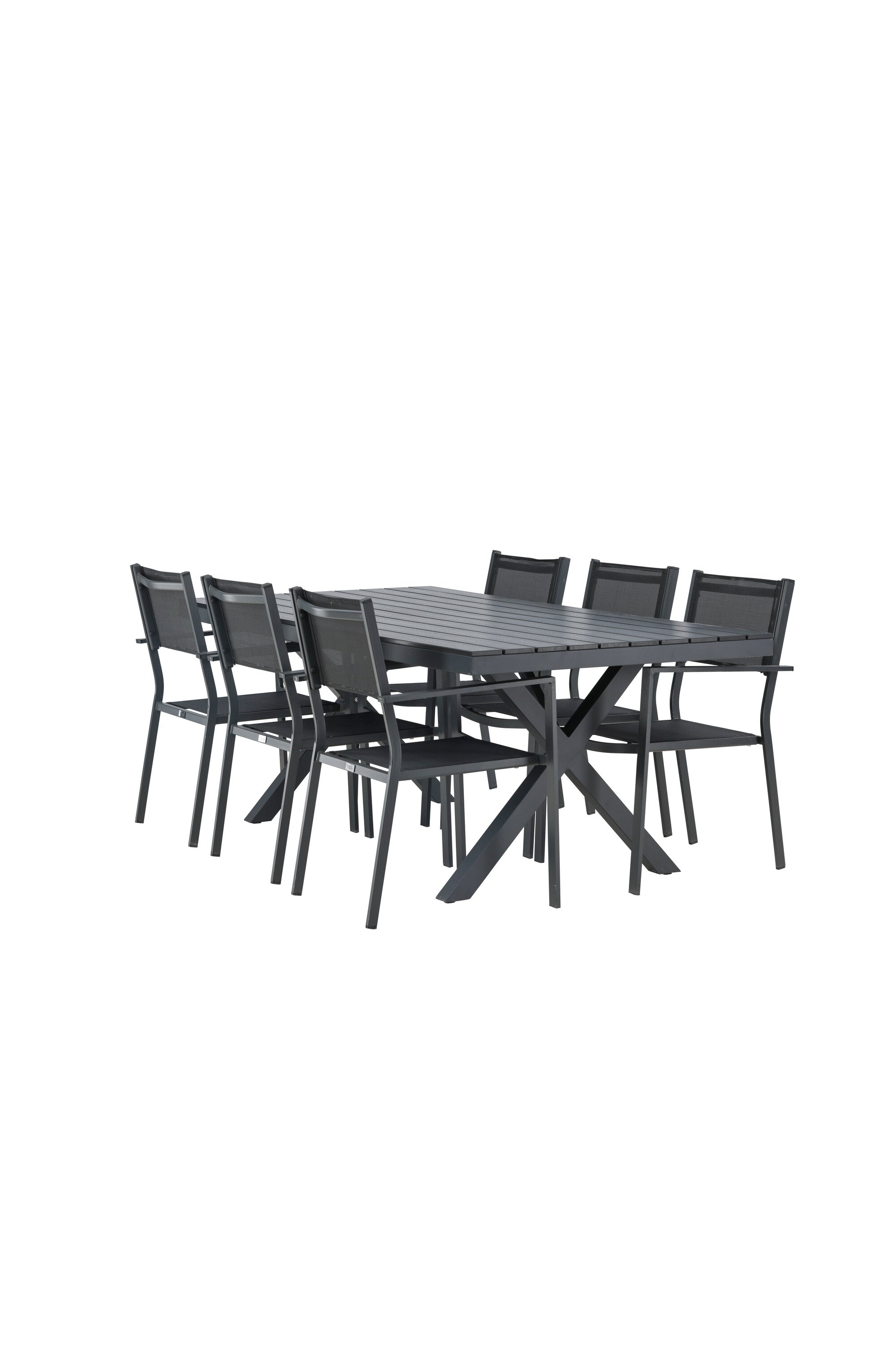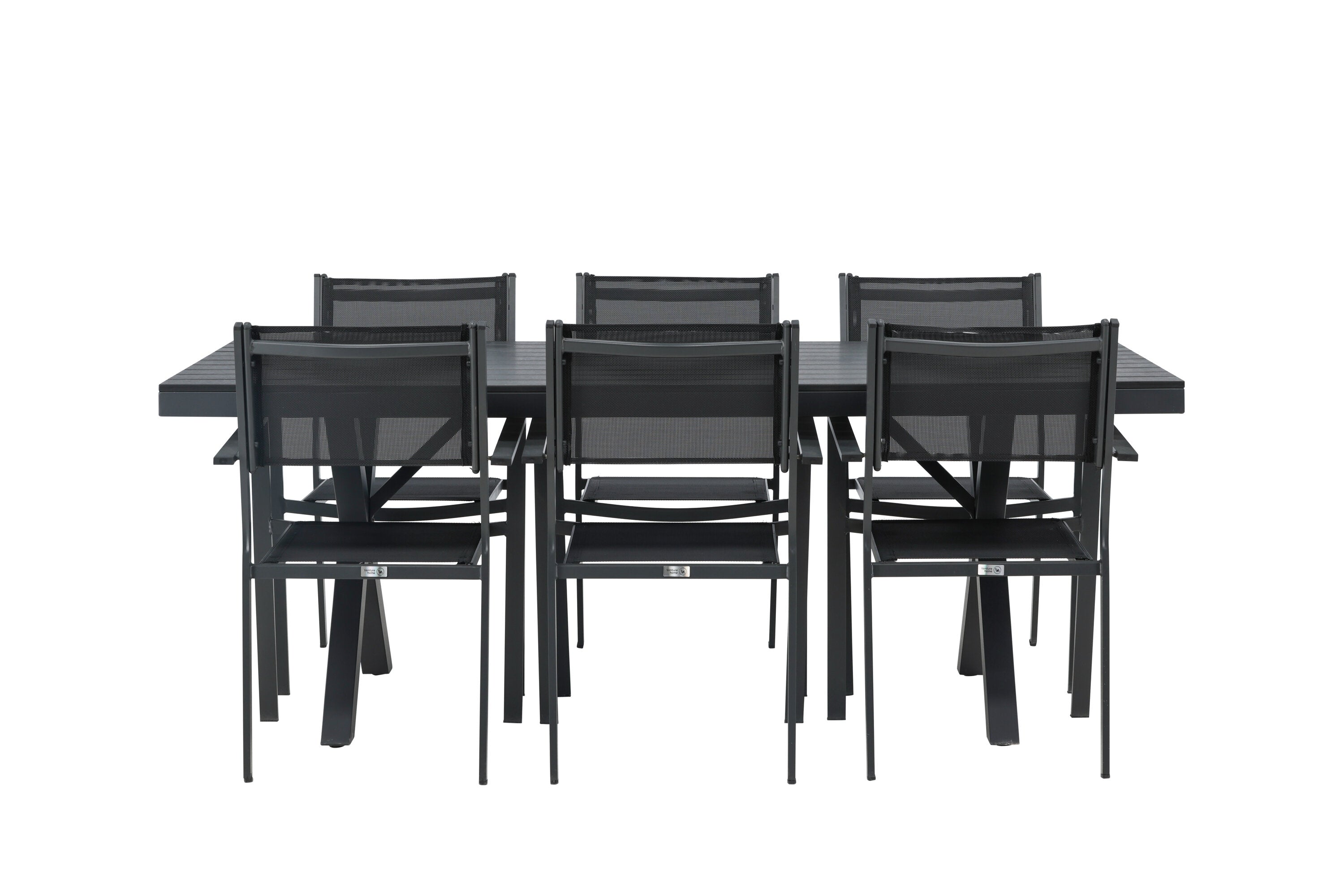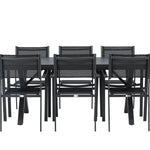 S celočernou jídelní skupinou nikdy neuděláte chybu! Náš obdélníkový jídelní stůl Garcia má klasický design s deskou stolu v černém aintwood a zkříženými nohami stolu v černém hliníku. Zde ve stylové kombinaci s našimi pohodlnými jídelními židlemi ze série Copacabana. Židle má rovný severský design v černém hliníku a sedák z textilu. Zařiďte si terasu lákavě a podle trendů! Rozměry stolu: 200 x 100 cm.