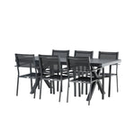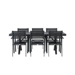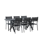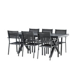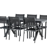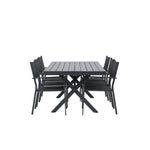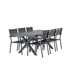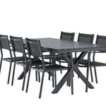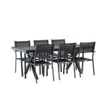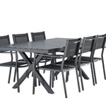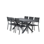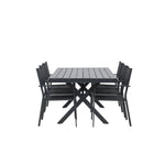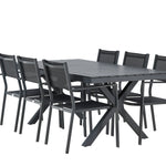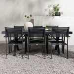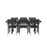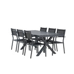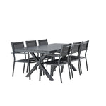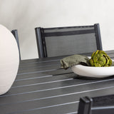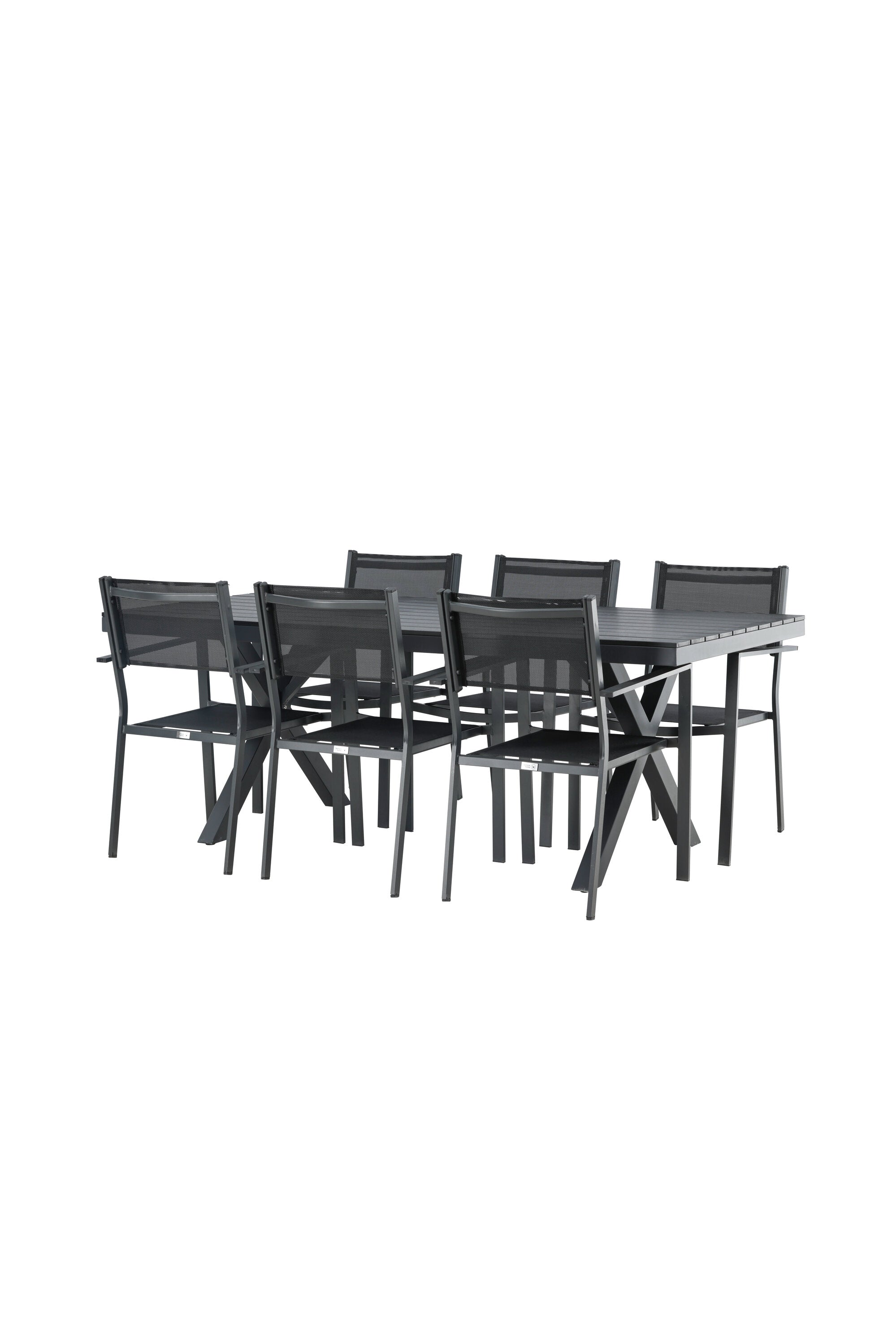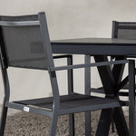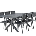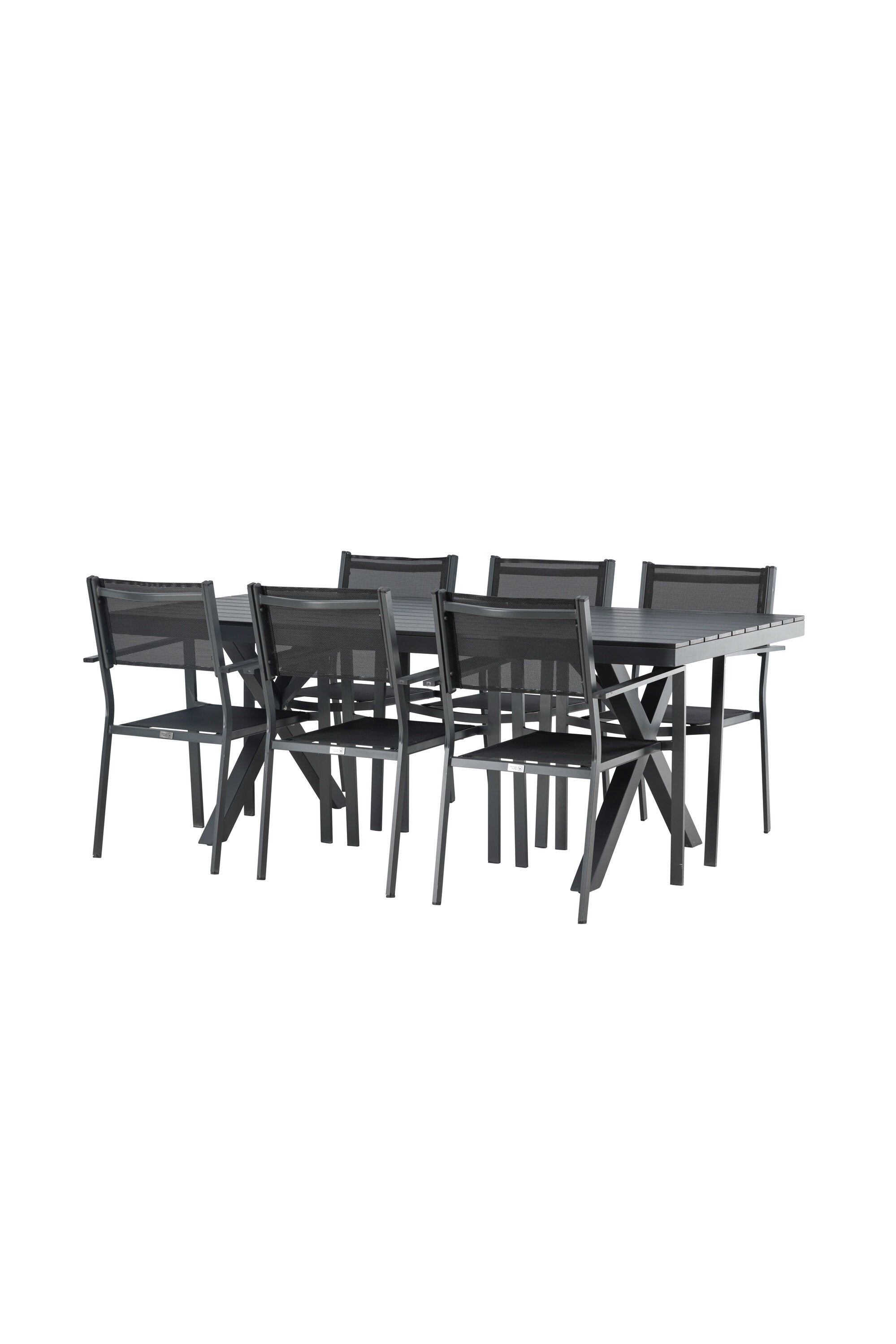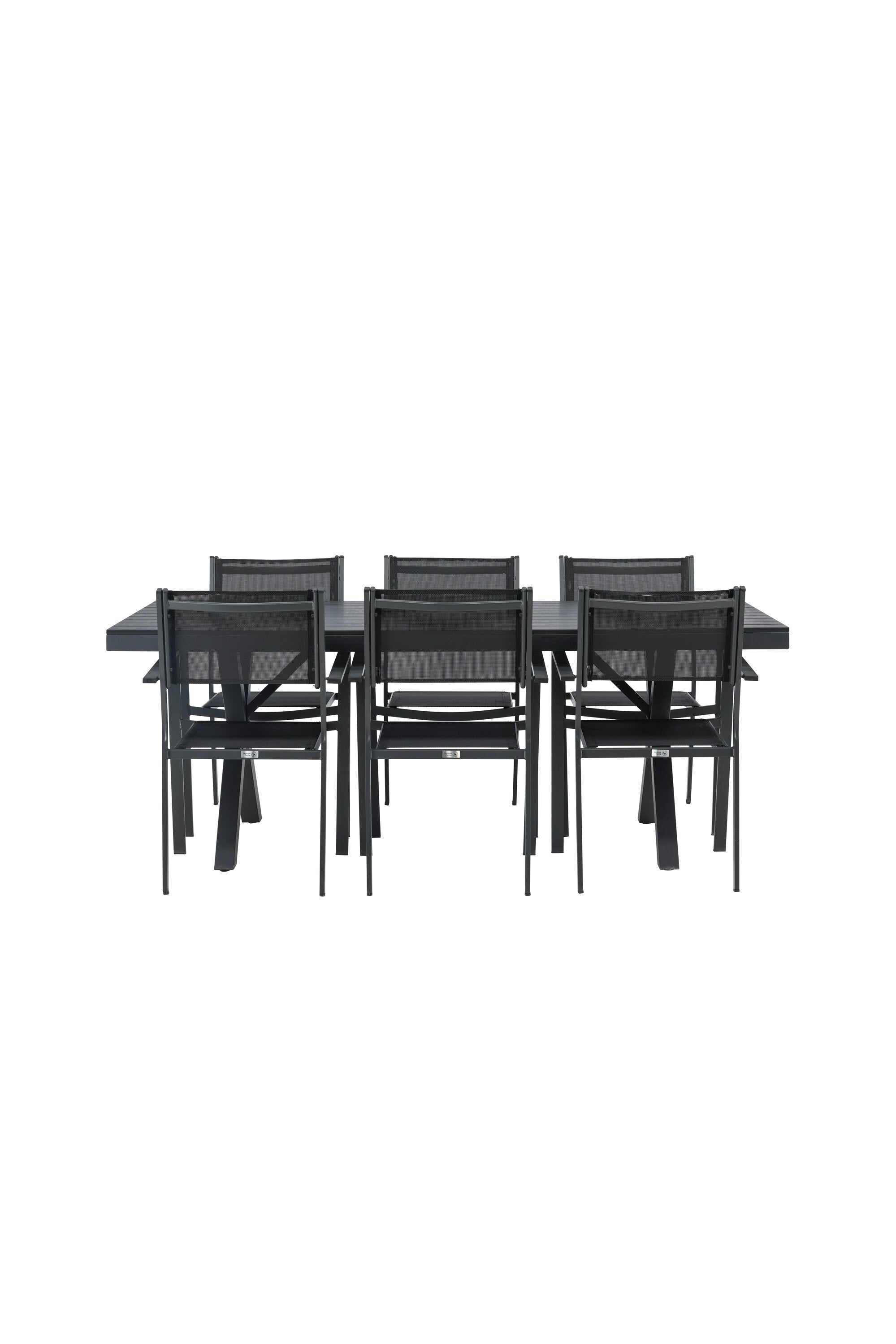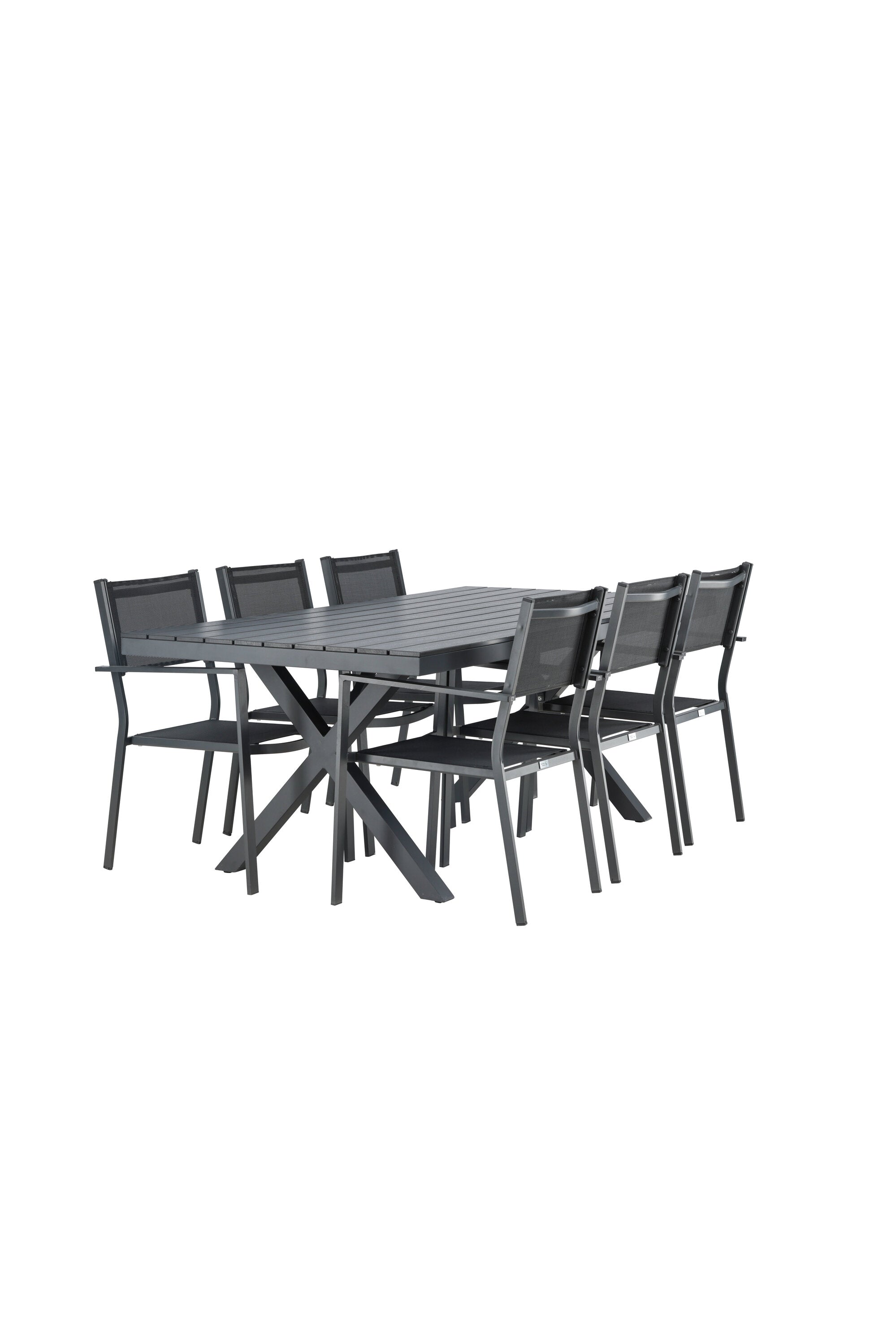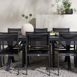 S celočernou jídelní skupinou nikdy neuděláte chybu! Náš obdélníkový jídelní stůl Garcia má klasický design s deskou stolu v černém aintwood a zkříženými nohami stolu v černém hliníku. Zde ve stylové kombinaci s našimi pohodlnými jídelními židlemi ze série Copacabana. Židle má rovný severský design v černém hliníku a sedák z textilu. Zařiďte si terasu lákavě a podle trendů! Rozměry stolu: 200 x 100 cm.