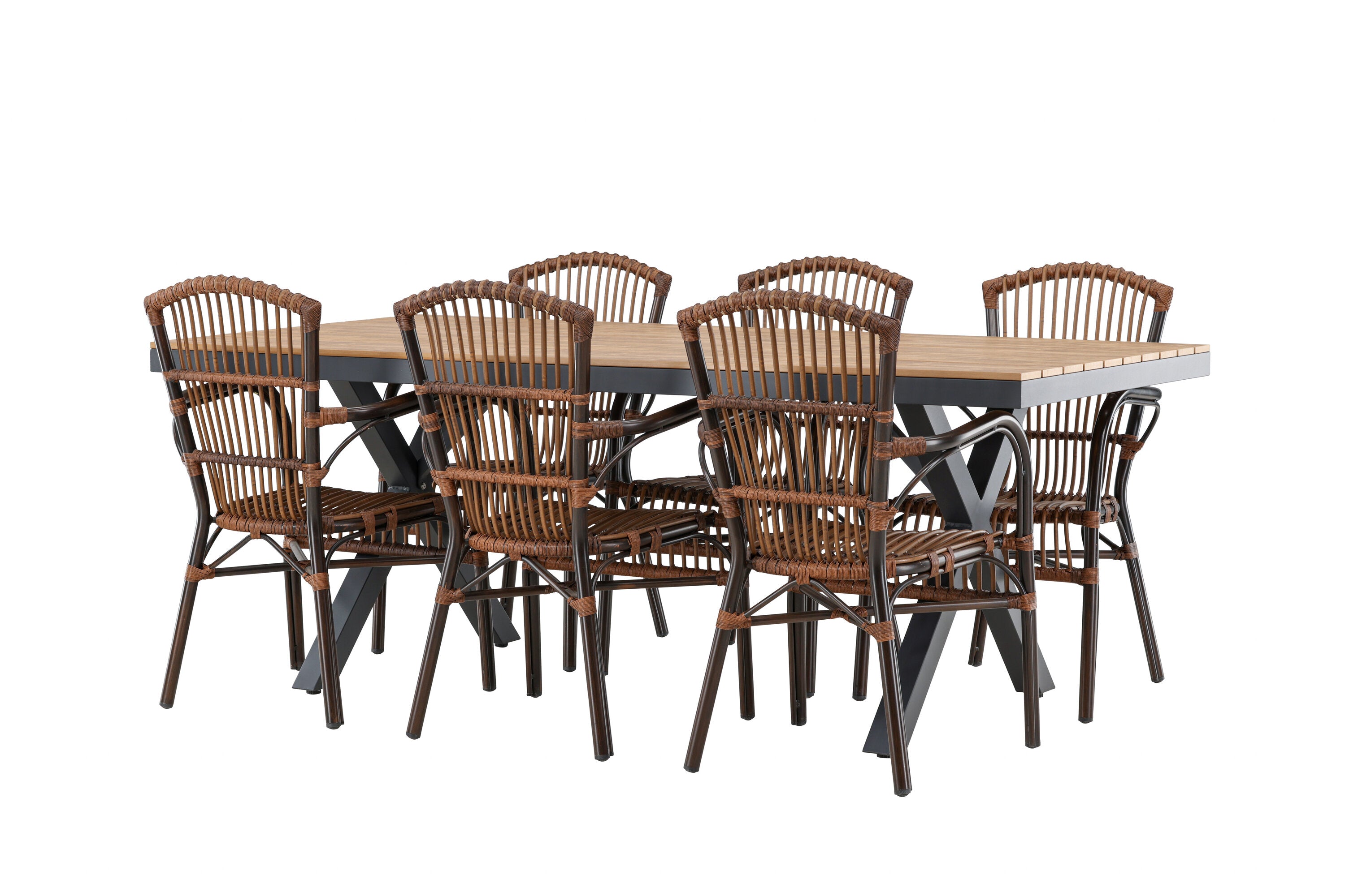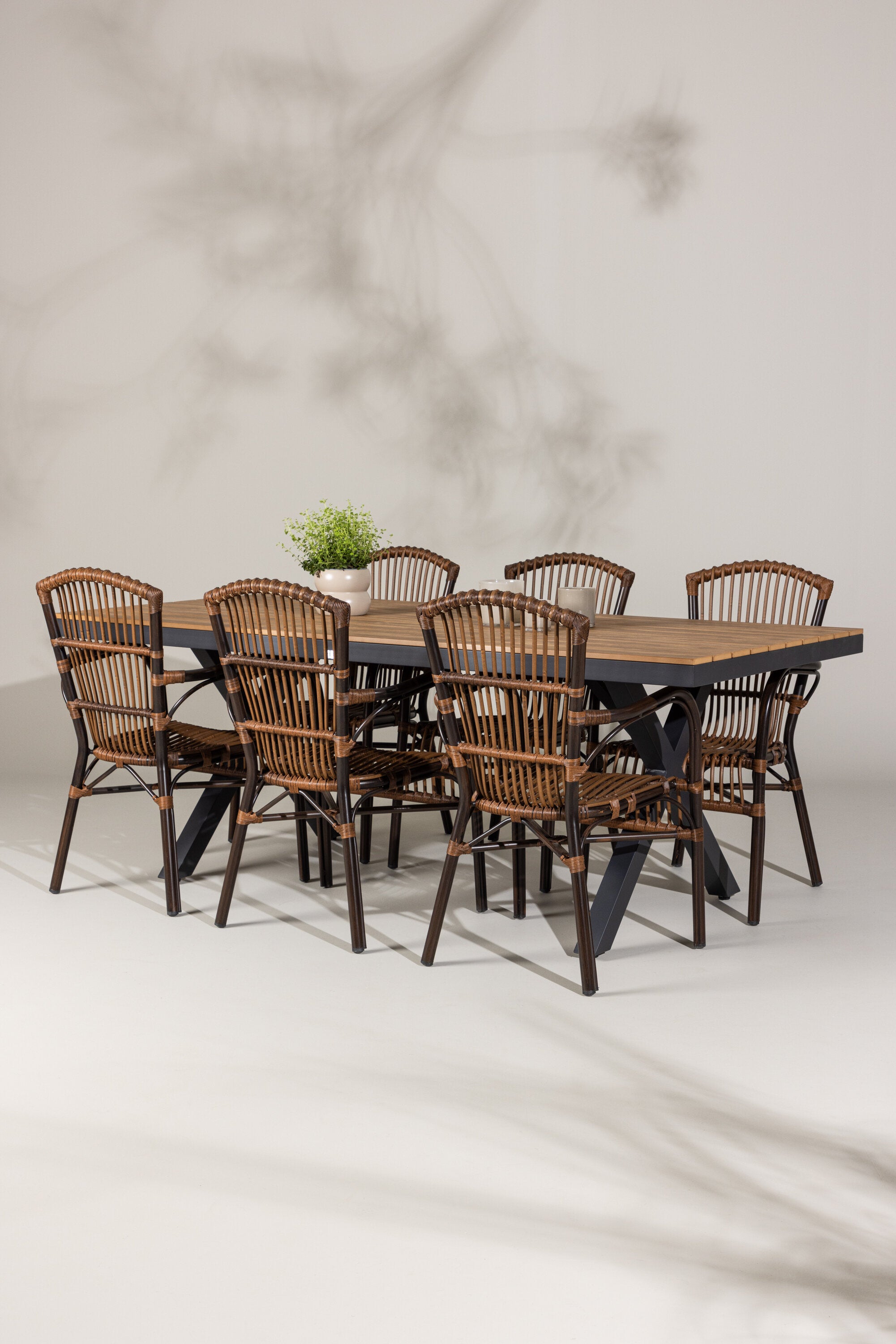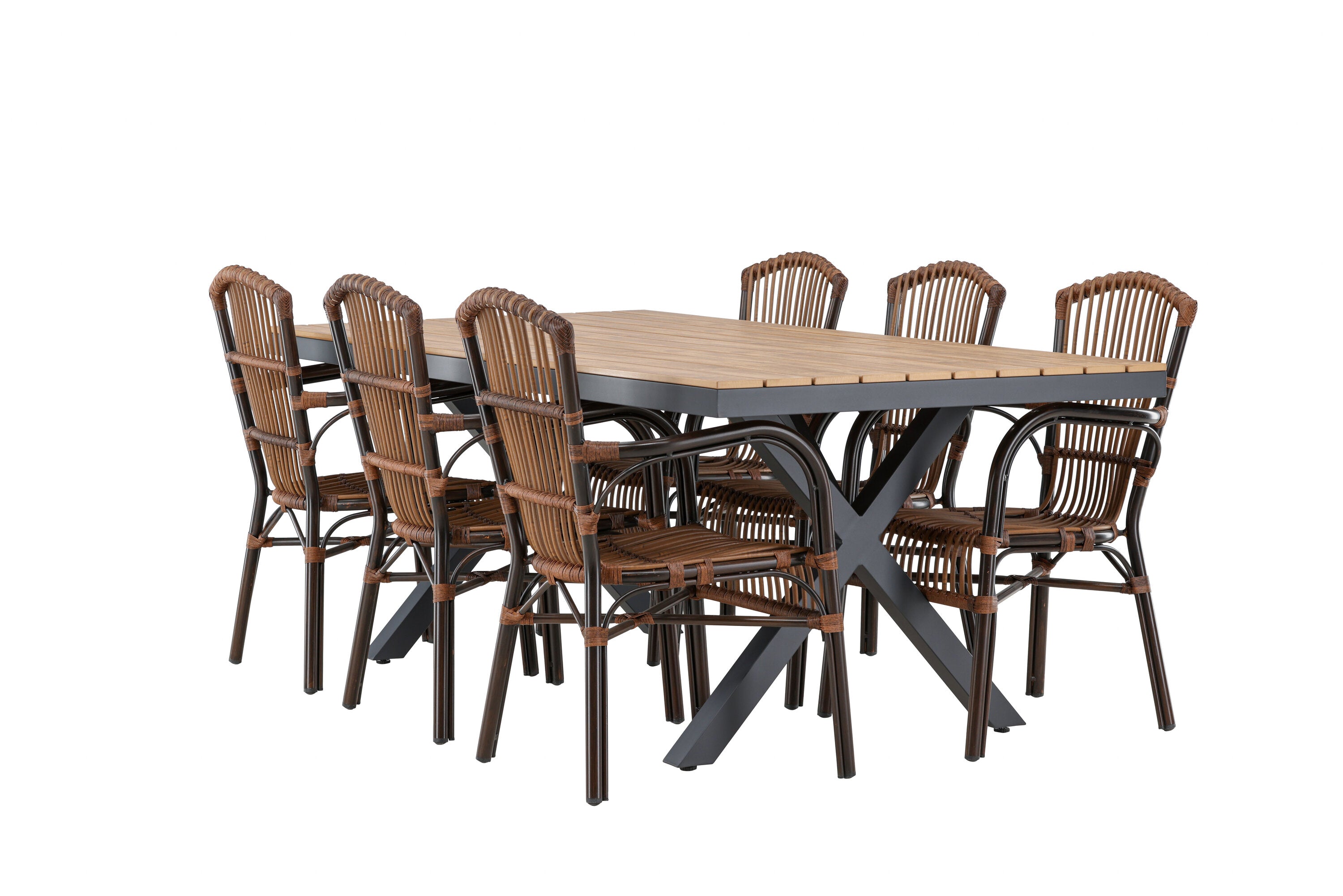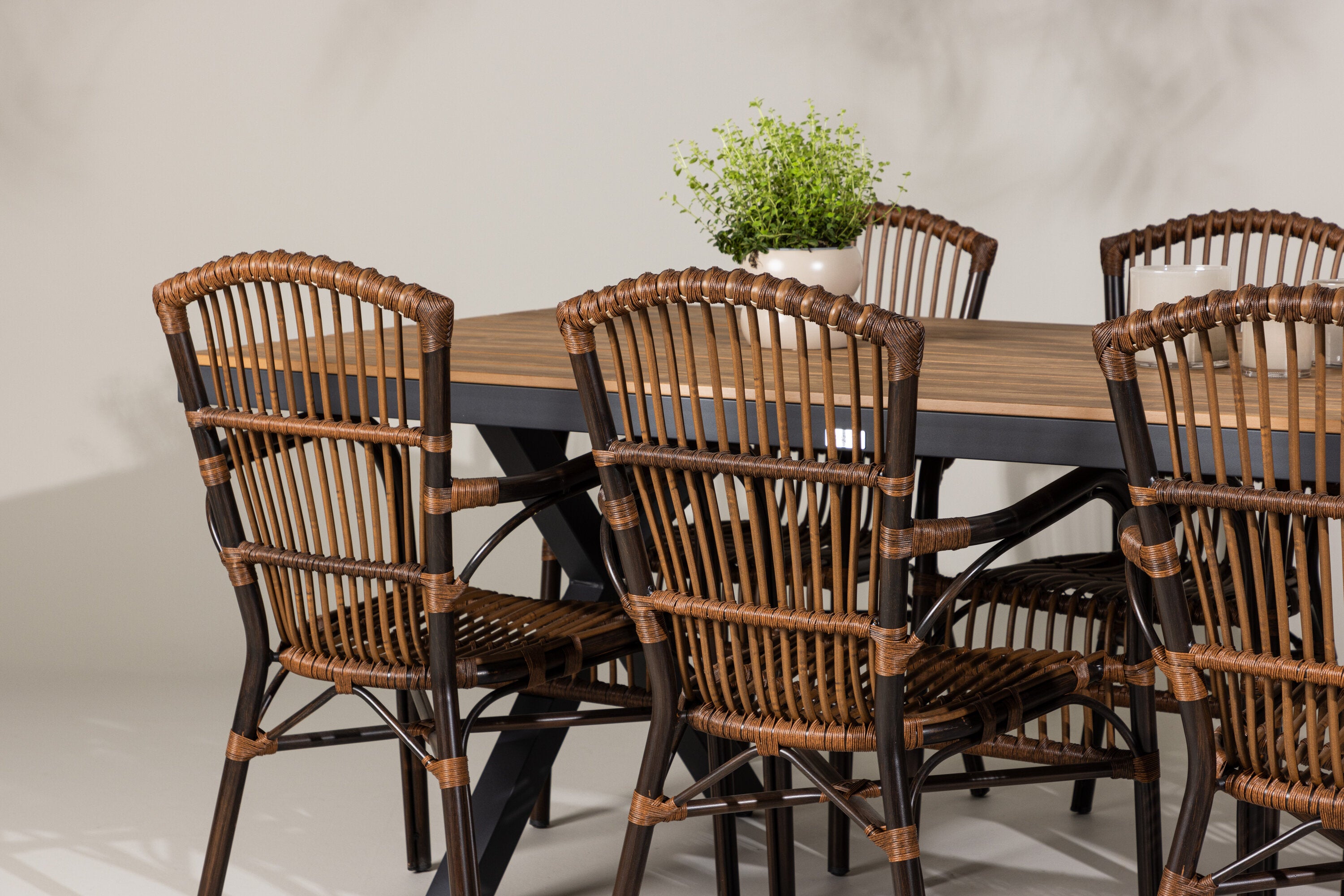 Stůl Garcia je se svými velkorysými rozměry 200x74 cm středobodem této jídelní sestavy. Stolní deska z hnědého dýhovaného materiálu a základna z černého hliníku nabízí moderní a trendy design, který se perfektně hodí do dnešního venkovního prostředí.
