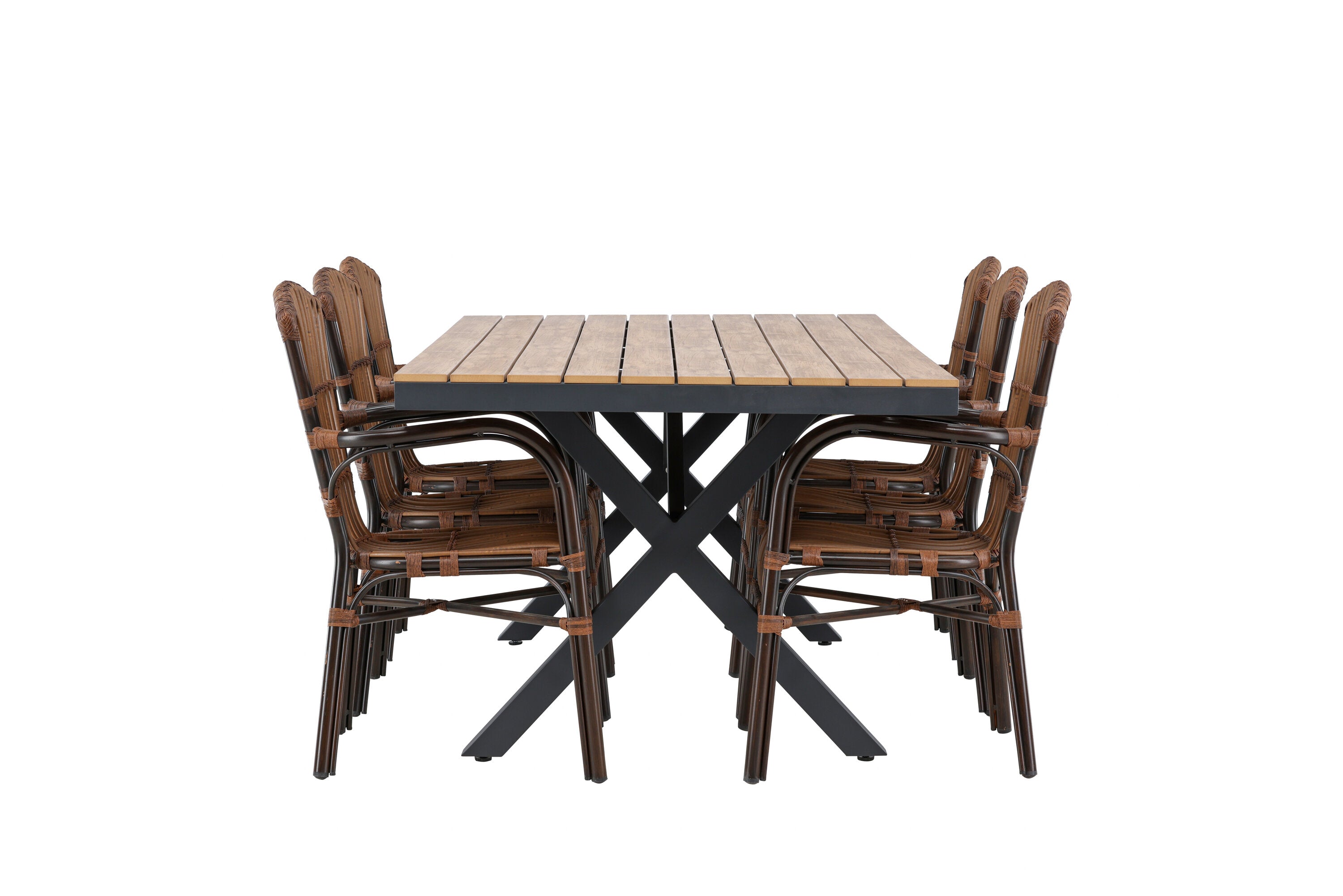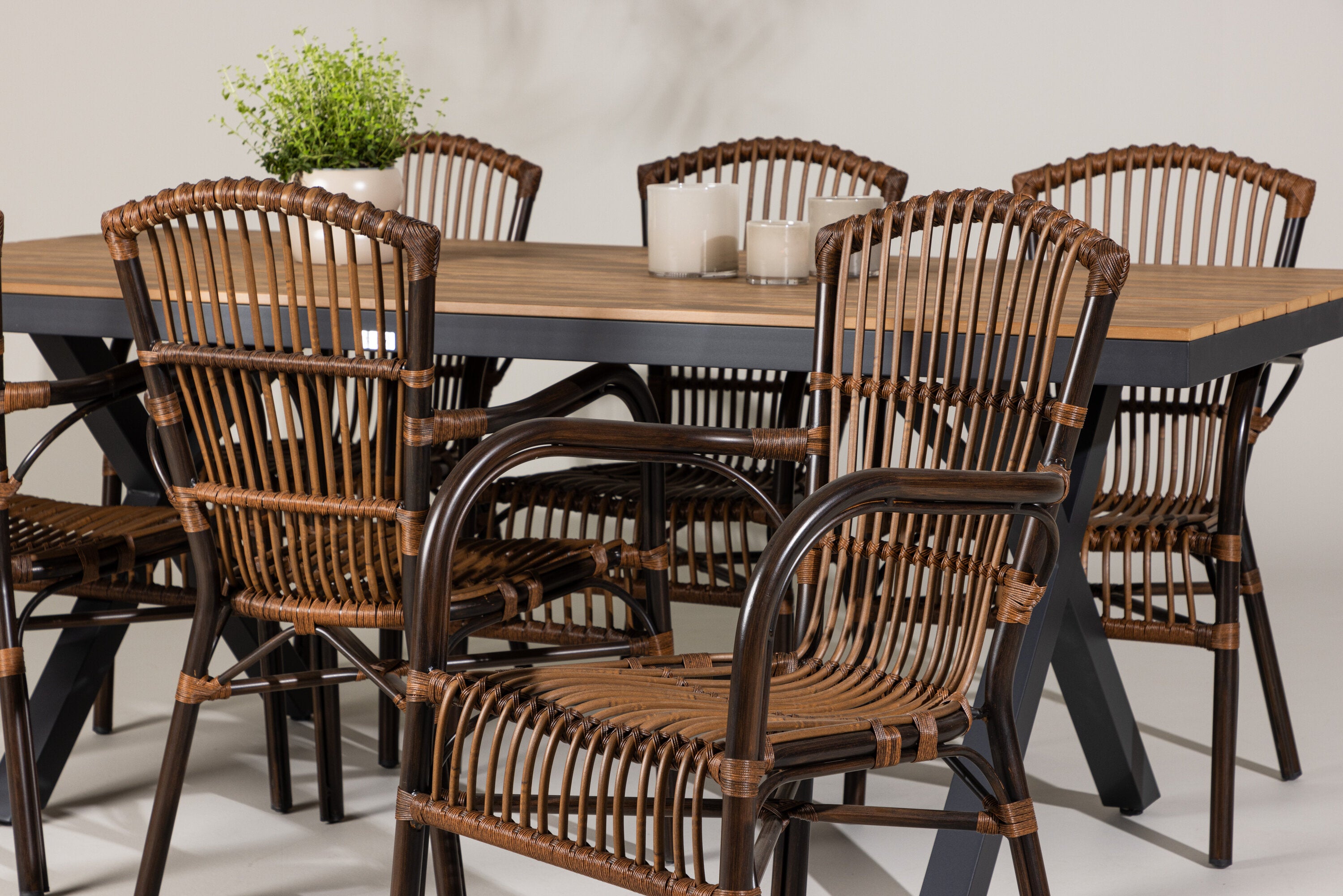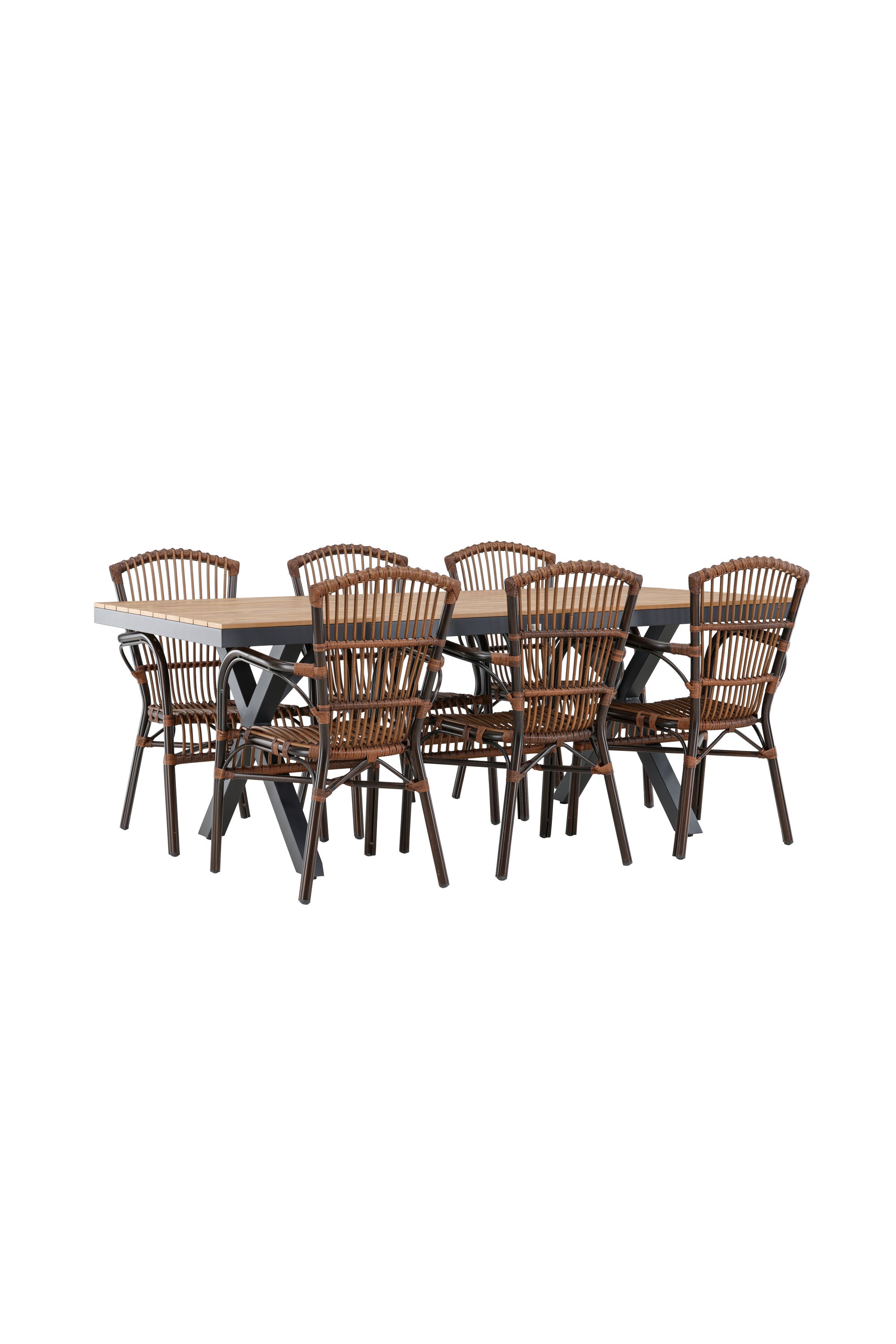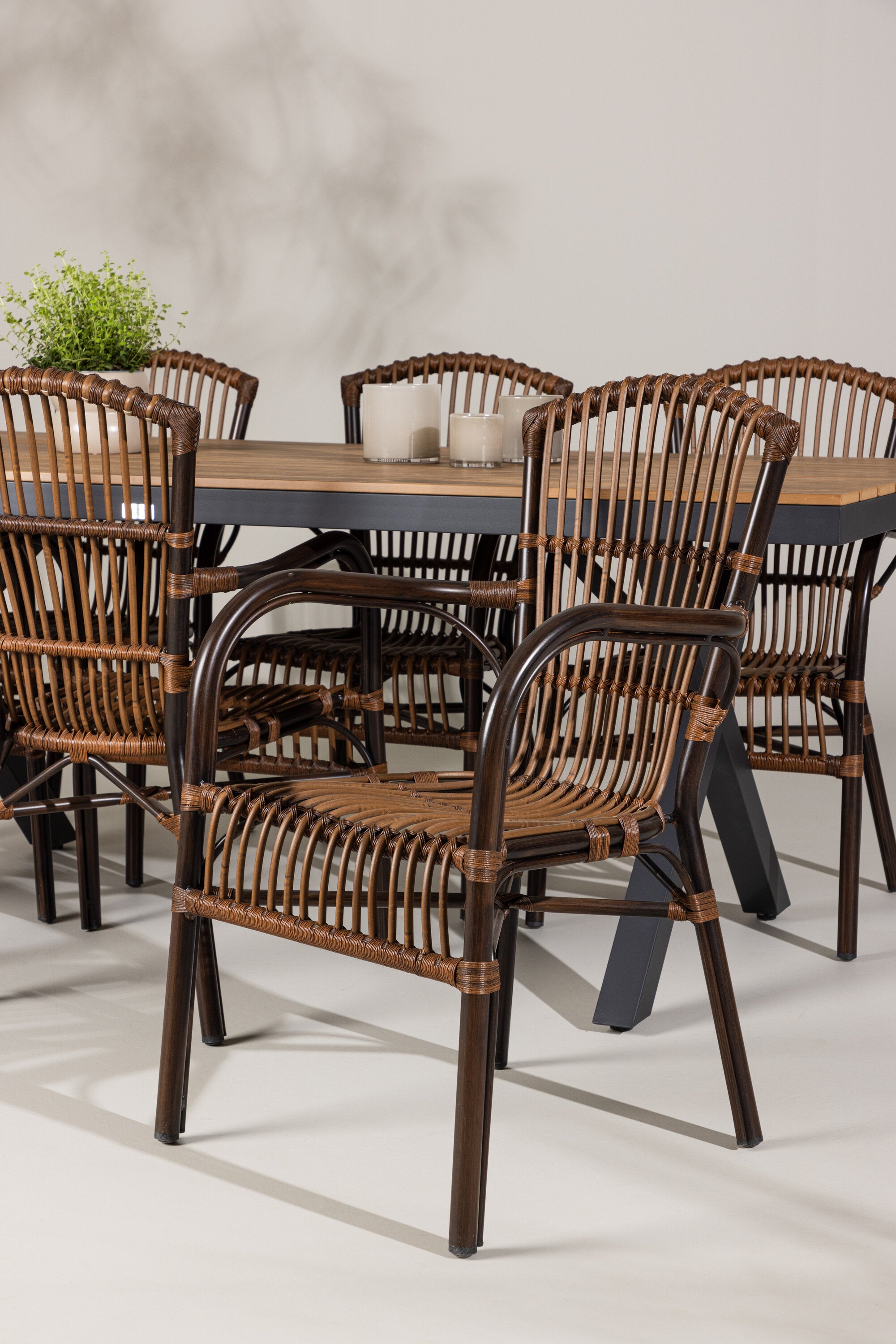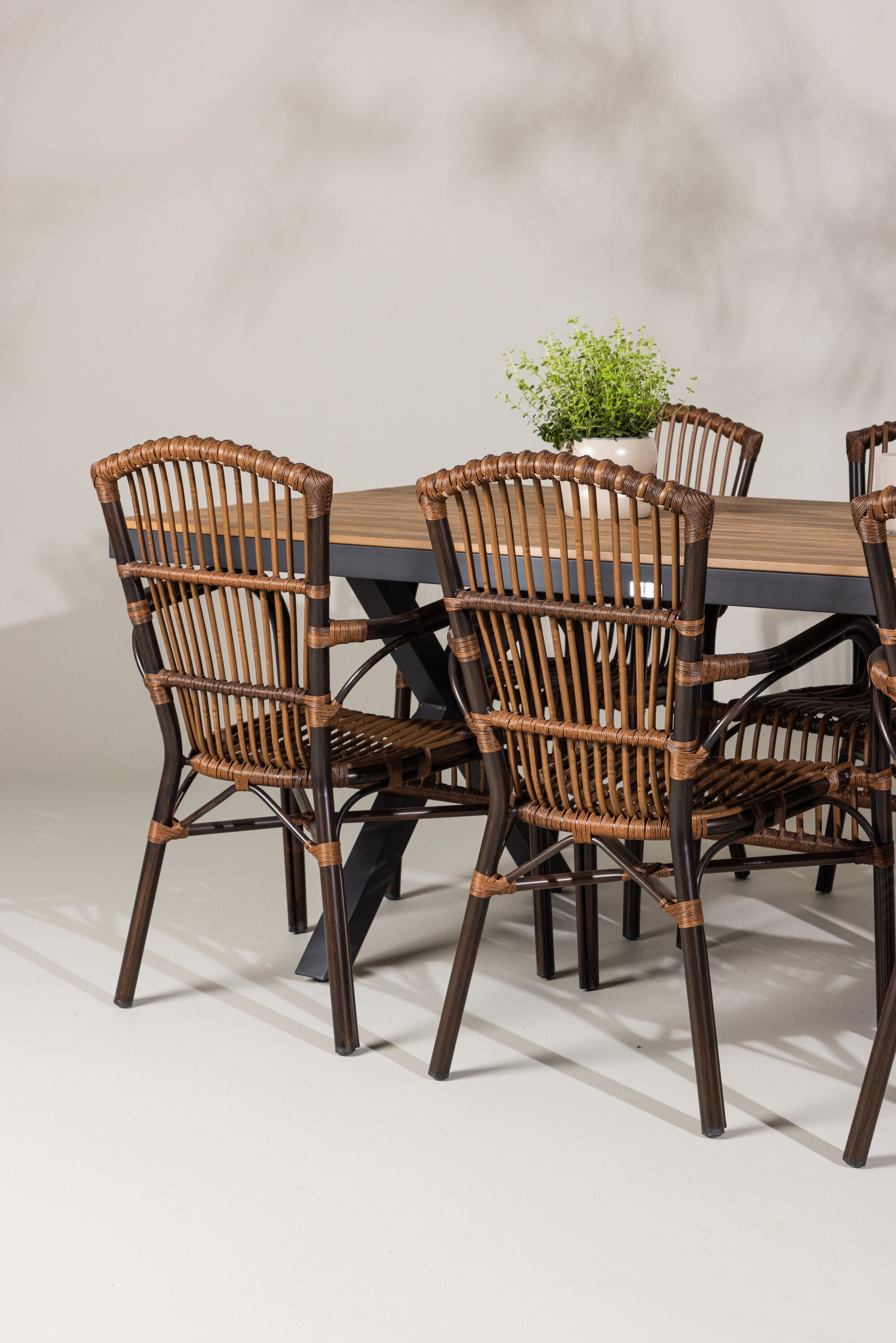 Stůl Garcia je se svými velkorysými rozměry 200x74 cm středobodem této jídelní sestavy. Stolní deska z hnědého dýhovaného materiálu a základna z černého hliníku nabízí moderní a trendy design, který se perfektně hodí do dnešního venkovního prostředí.
