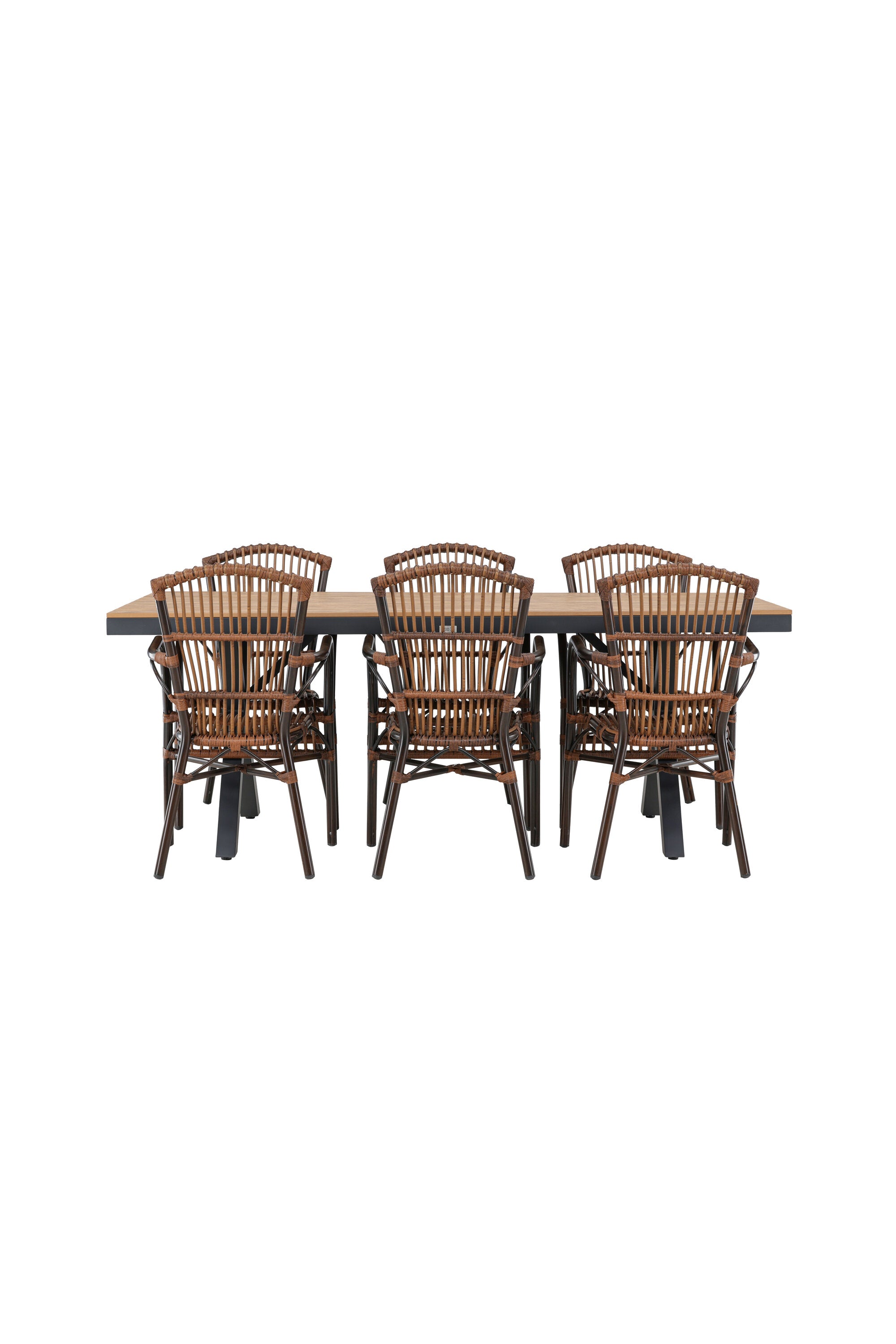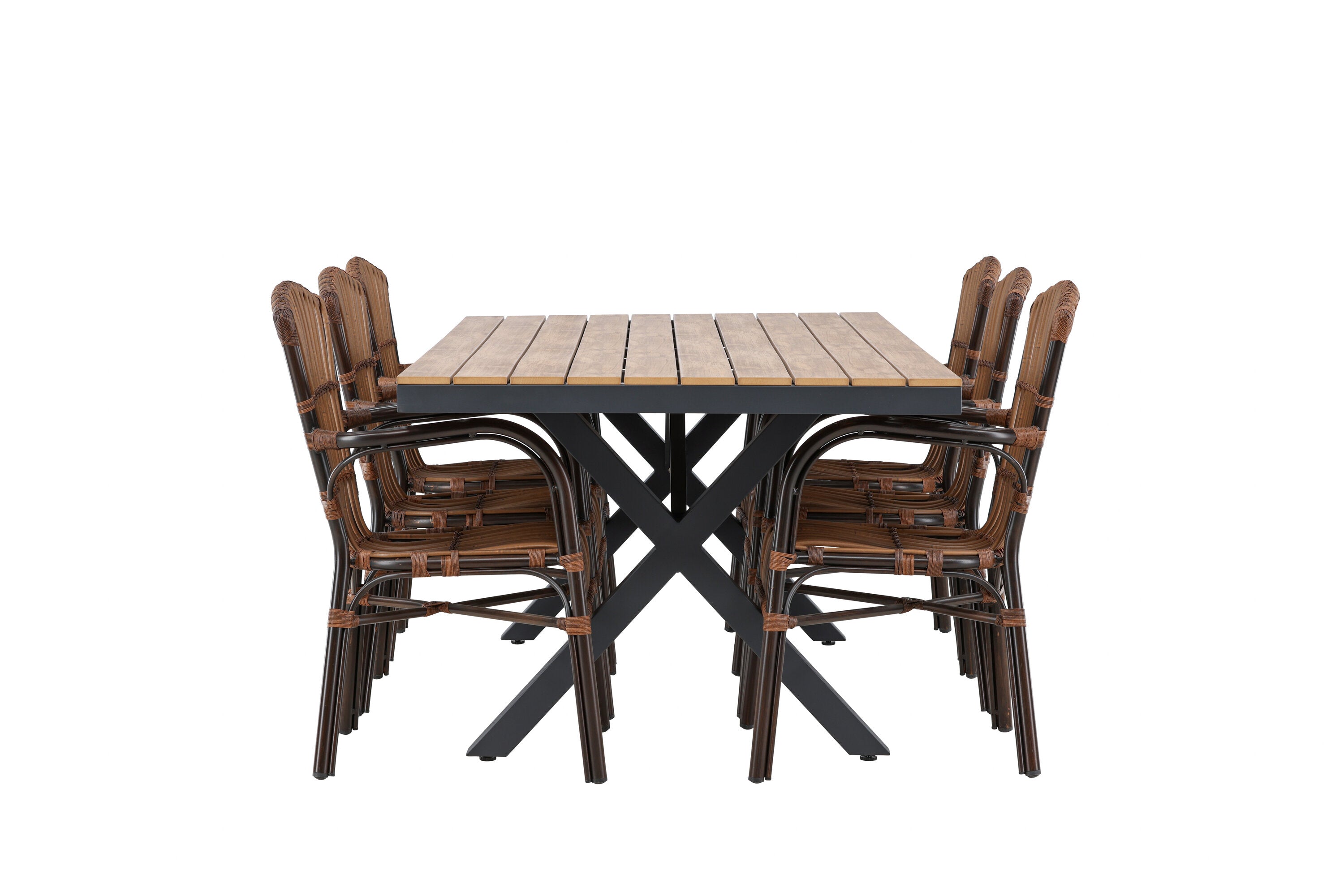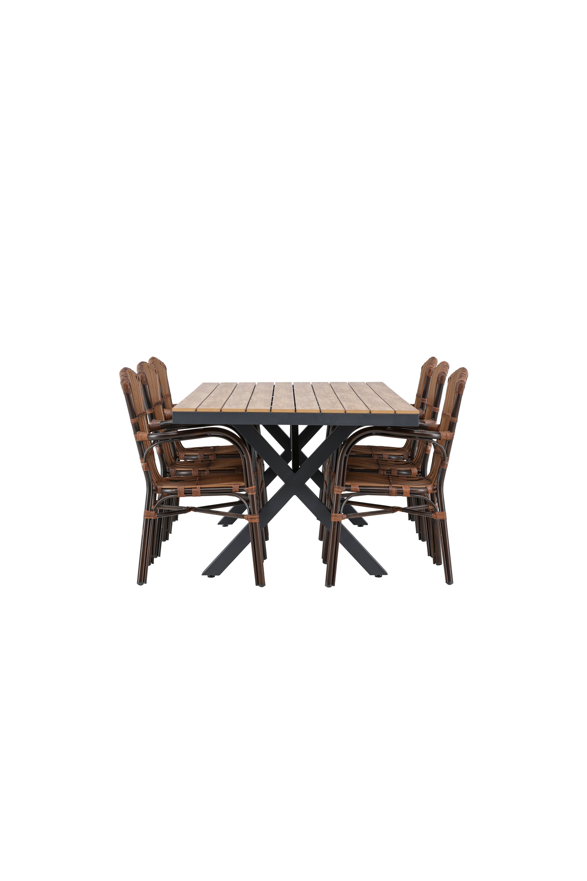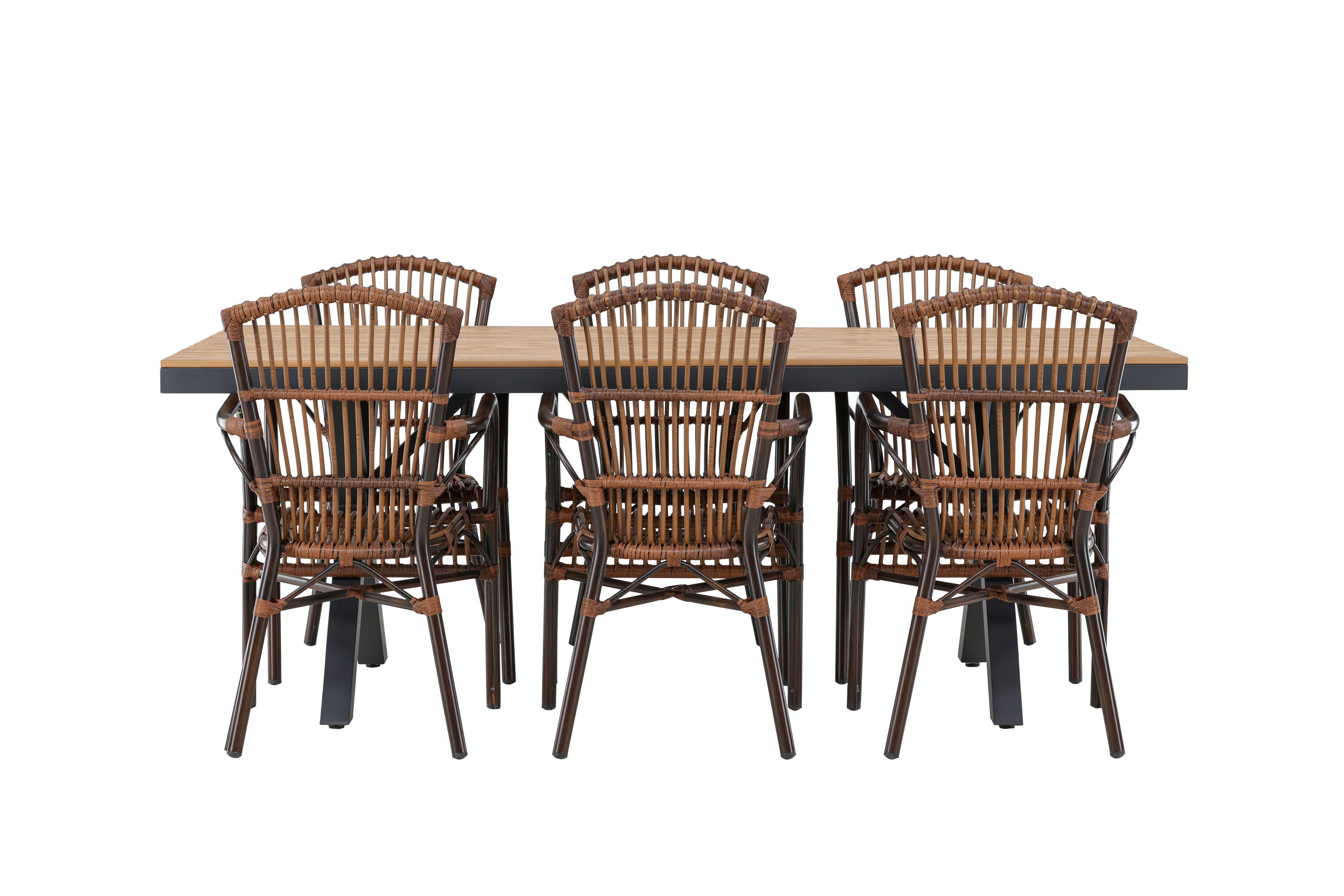 Stůl Garcia je se svými velkorysými rozměry 200x74 cm středobodem této jídelní sestavy. Stolní deska z hnědého dýhovaného materiálu a základna z černého hliníku nabízí moderní a trendy design, který se perfektně hodí do dnešního venkovního prostředí.