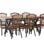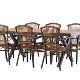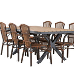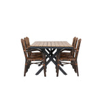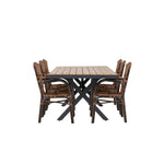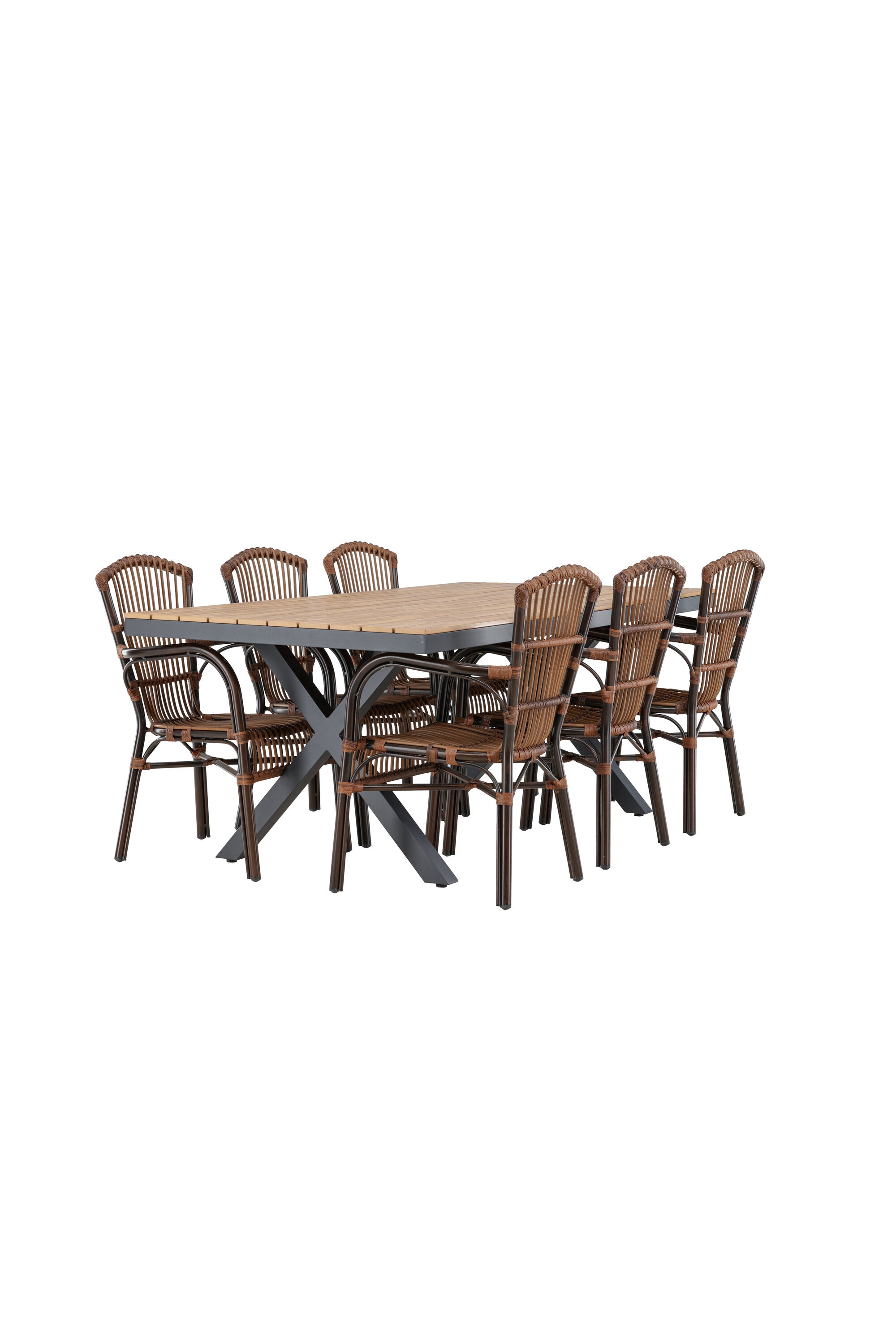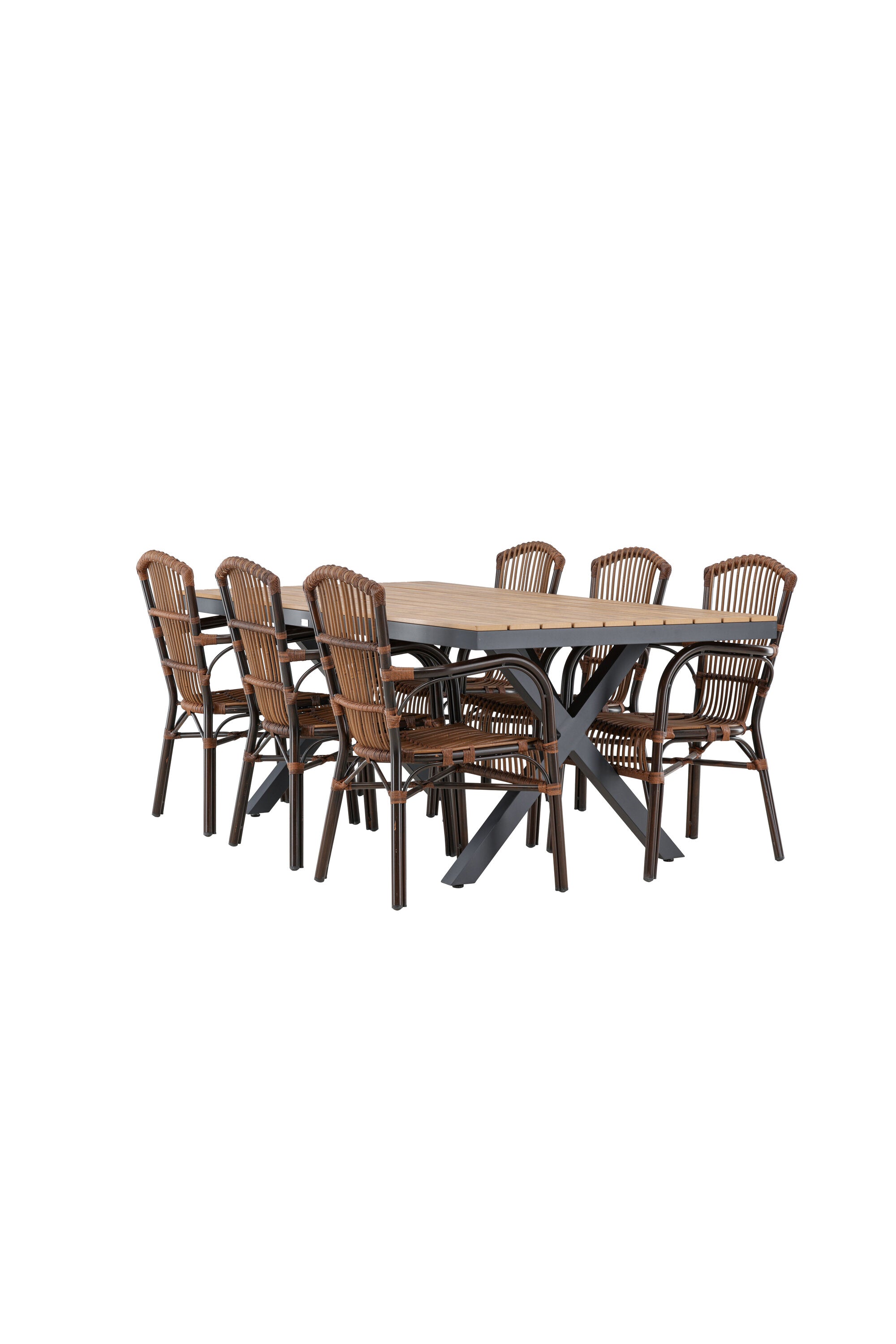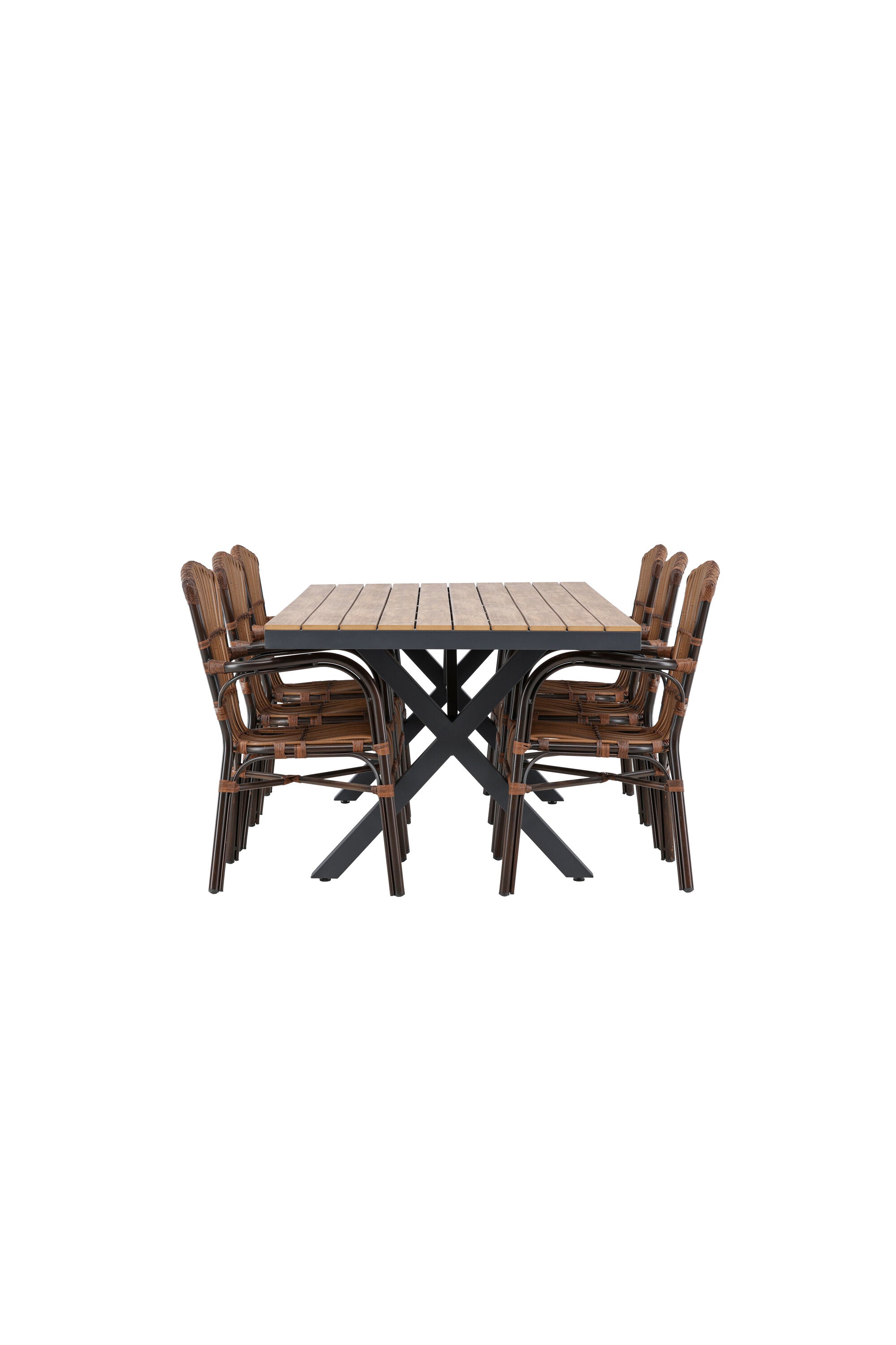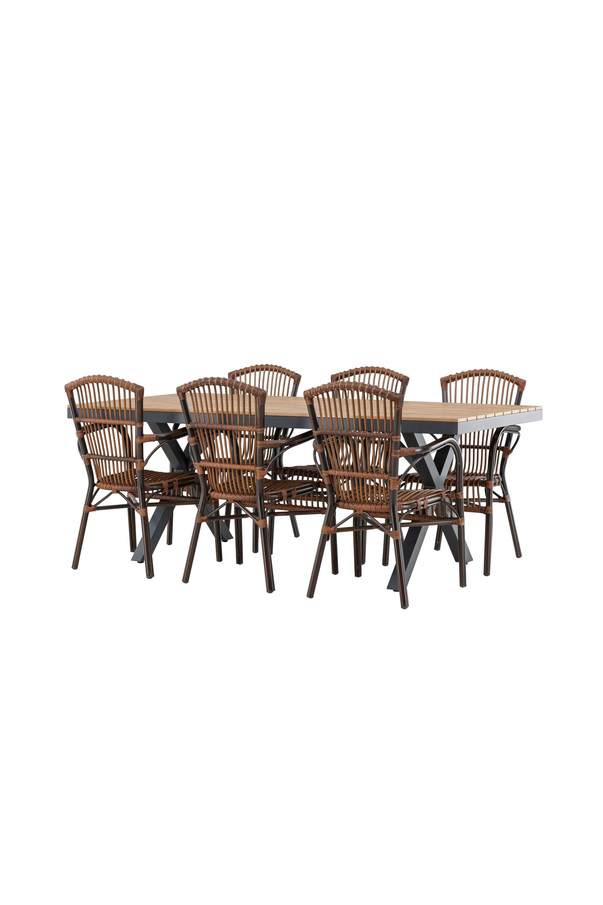 Stůl Garcia je se svými velkorysými rozměry 200x74 cm středobodem této jídelní sestavy. Stolní deska z hnědého dýhovaného materiálu a základna z černého hliníku nabízí moderní a trendy design, který se perfektně hodí do dnešního venkovního prostředí.