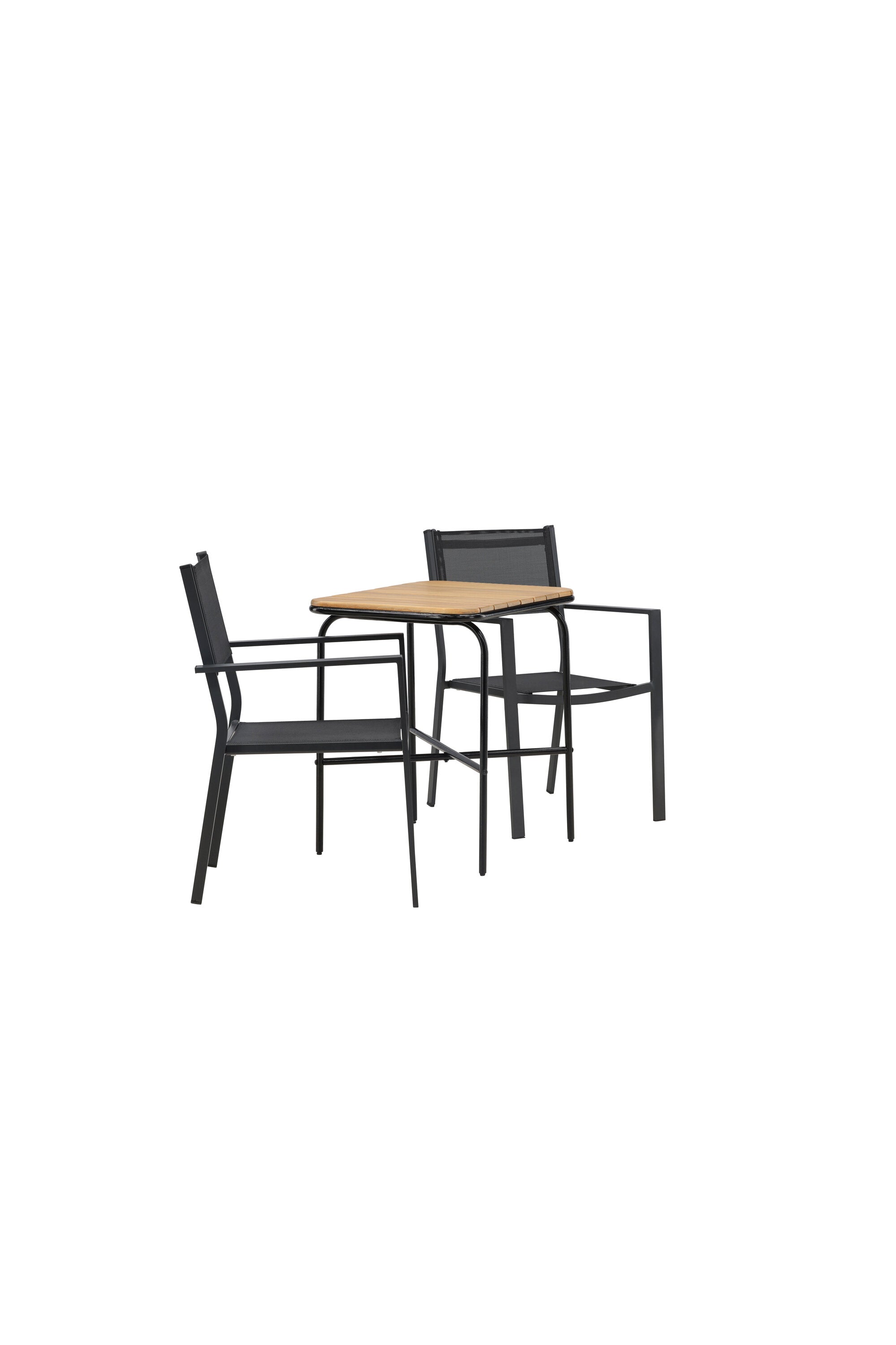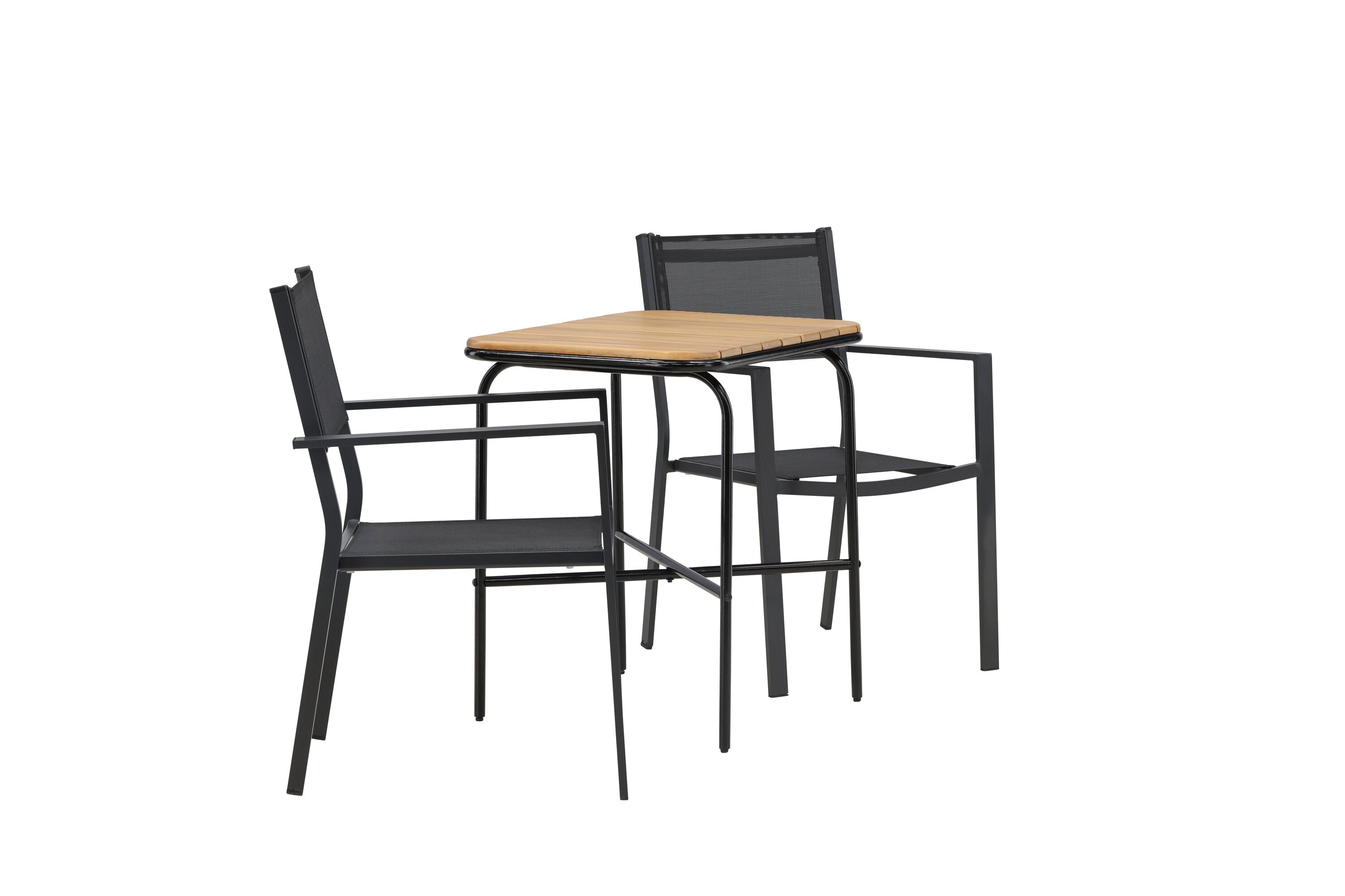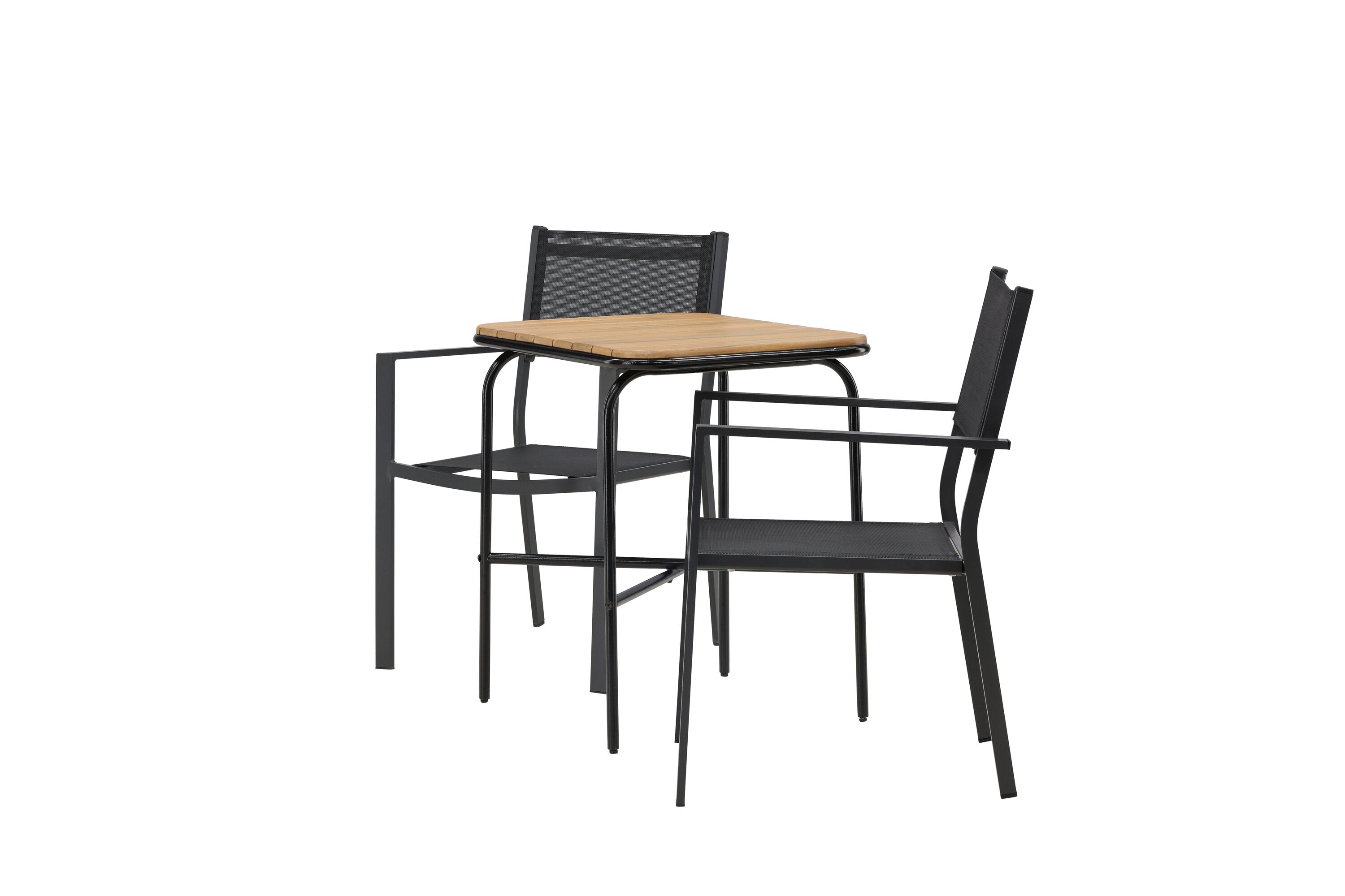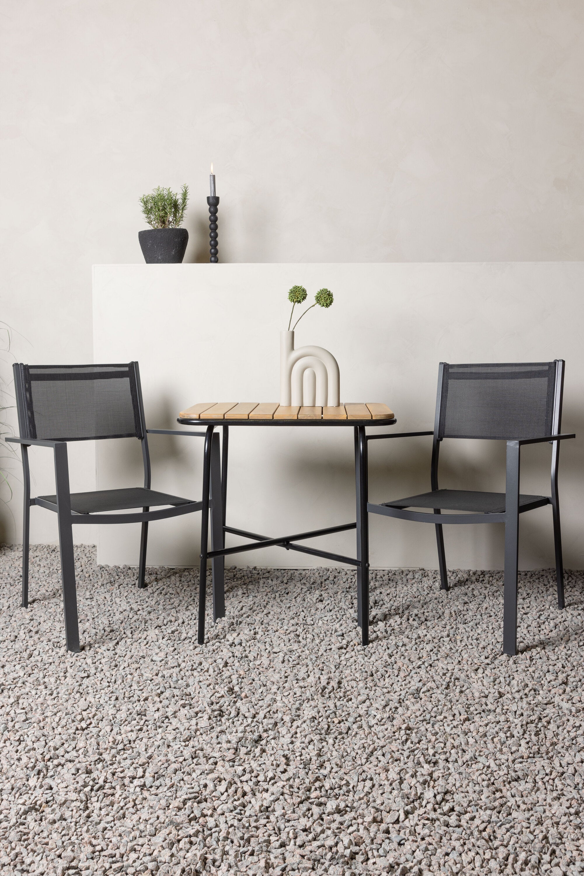 Poutavá kavárenská skupina pro letošní letní přestávky na kávu! Náš stylový kavárenský stůl Holmbeck má moderní žebrovanou desku z akácie a minimalistickou základnu z černé oceli. Zde ve stylové kombinaci se 2 černými jídelními židlemi ze série Copacabana. Židle má rovný severský design v černém hliníku a sedák z textilu. Tato skupina se perfektně hodí k malému balkonu nebo slunnému koutu terasy! Rozměry stolu: 74 x 70 x 55 cm.