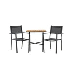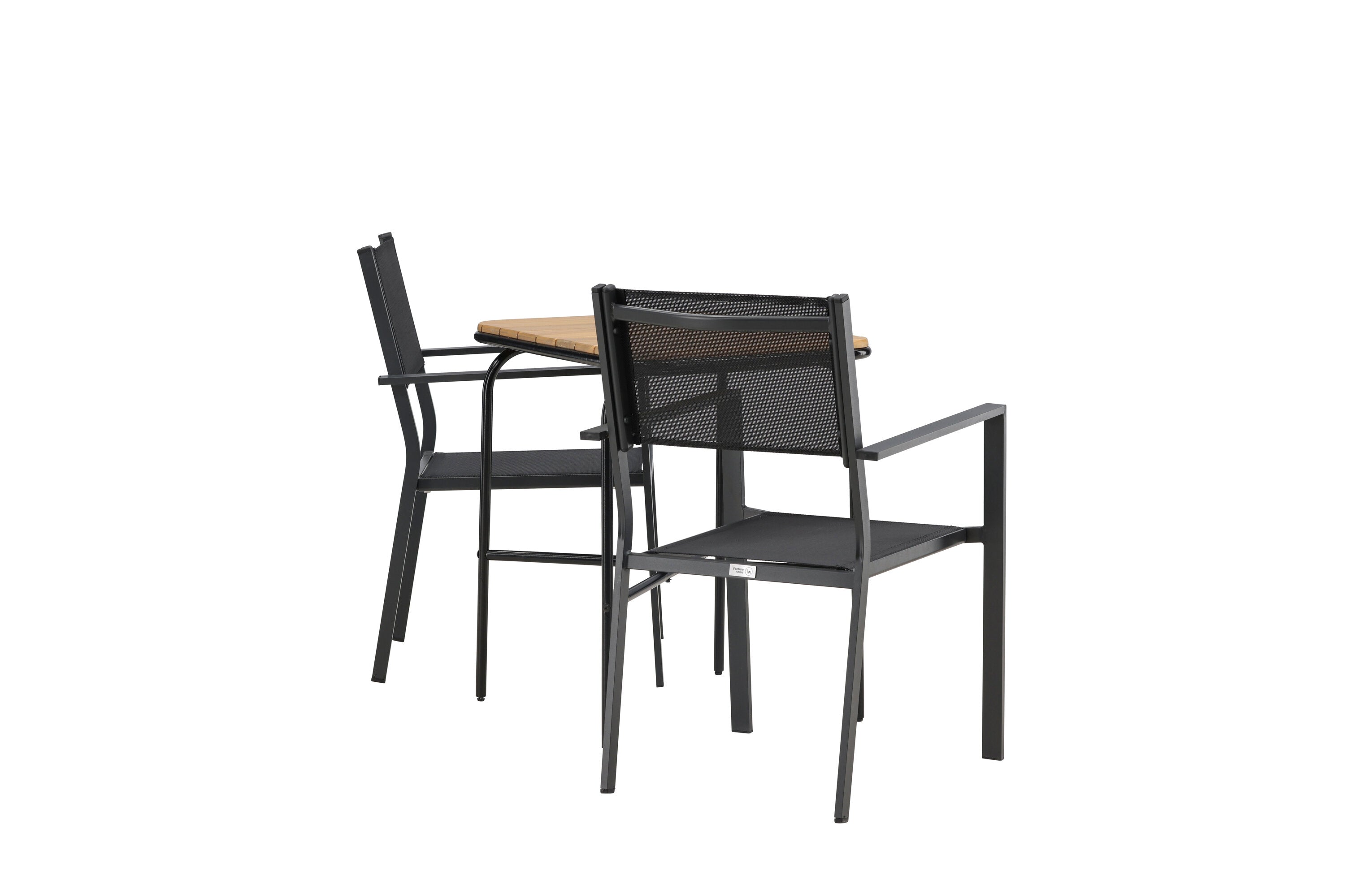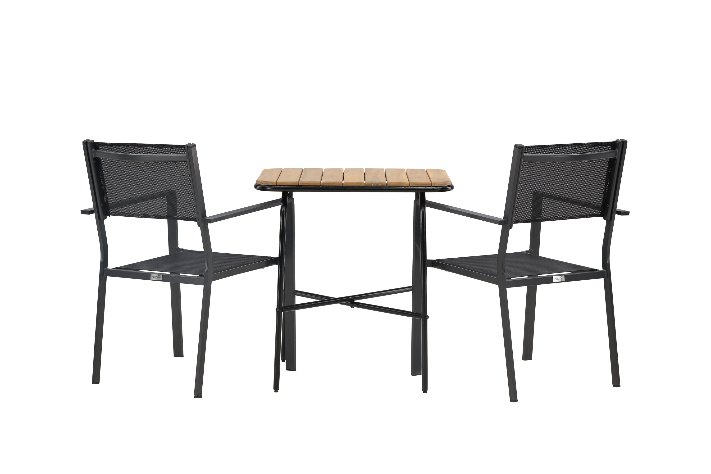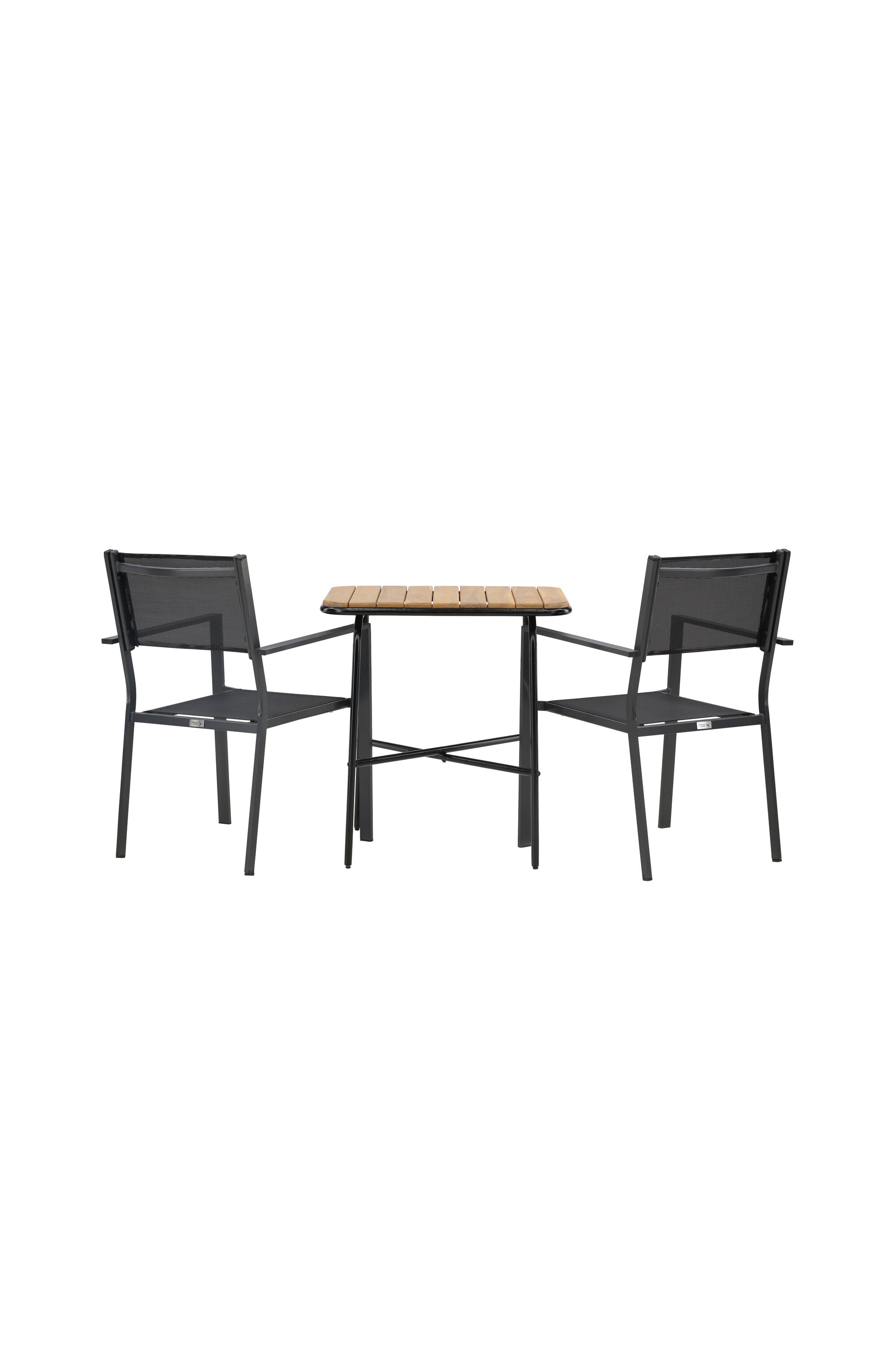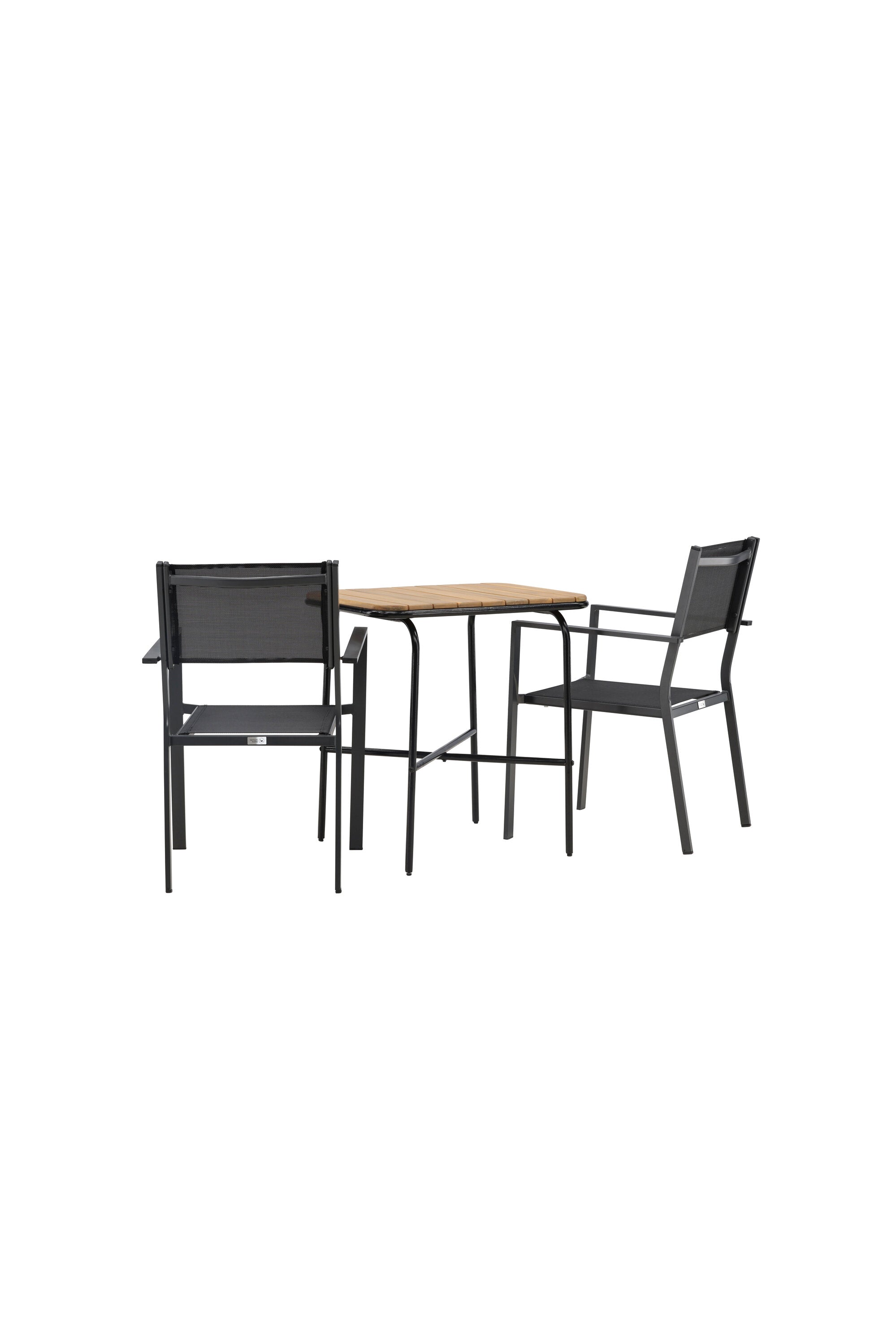 Poutavá kavárenská skupina pro letošní letní přestávky na kávu! Náš stylový kavárenský stůl Holmbeck má moderní žebrovanou desku z akácie a minimalistickou základnu z černé oceli. Zde ve stylové kombinaci se 2 černými jídelními židlemi ze série Copacabana. Židle má rovný severský design v černém hliníku a sedák z textilu. Tato skupina se perfektně hodí k malému balkonu nebo slunnému koutu terasy! Rozměry stolu: 74 x 70 x 55 cm.