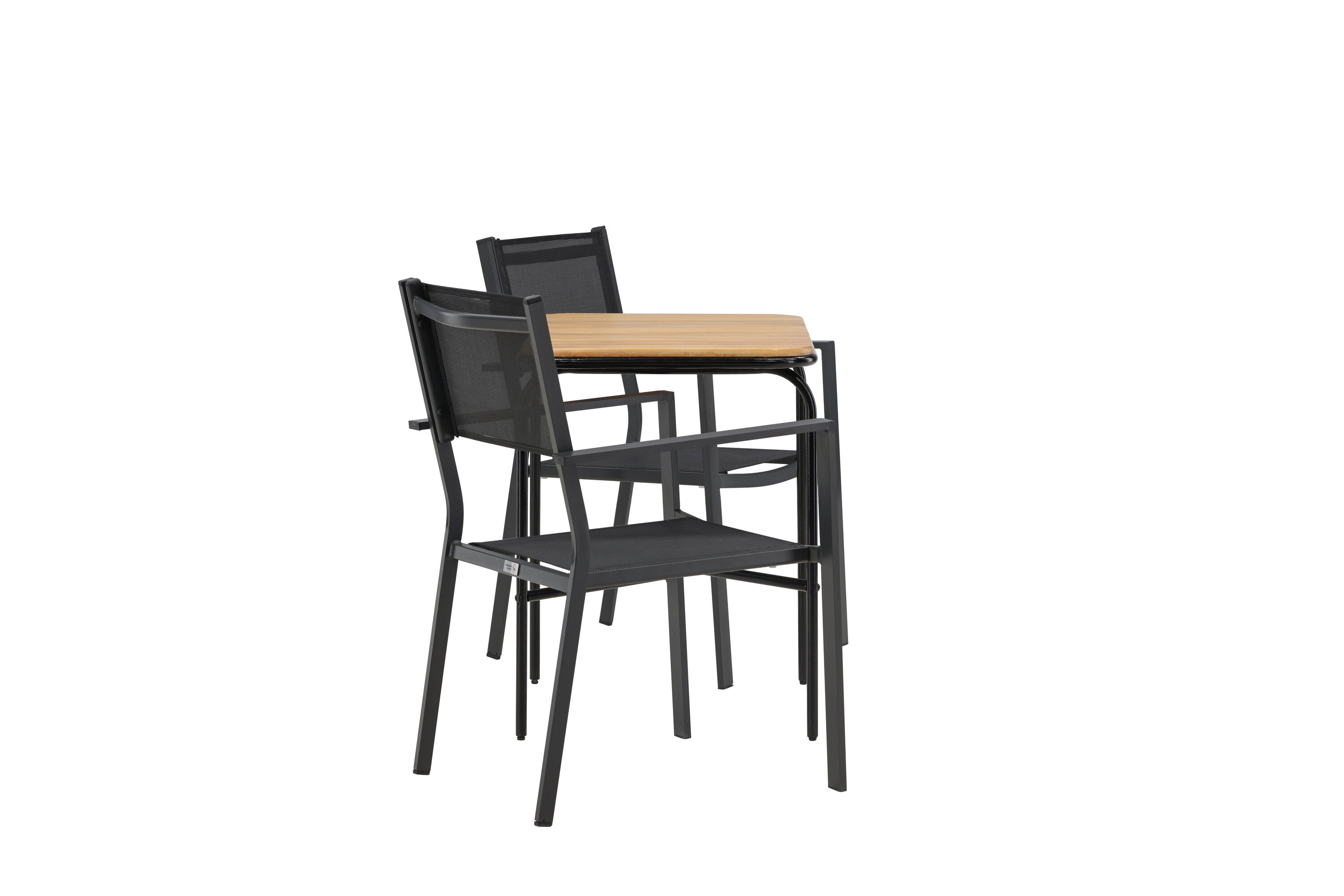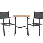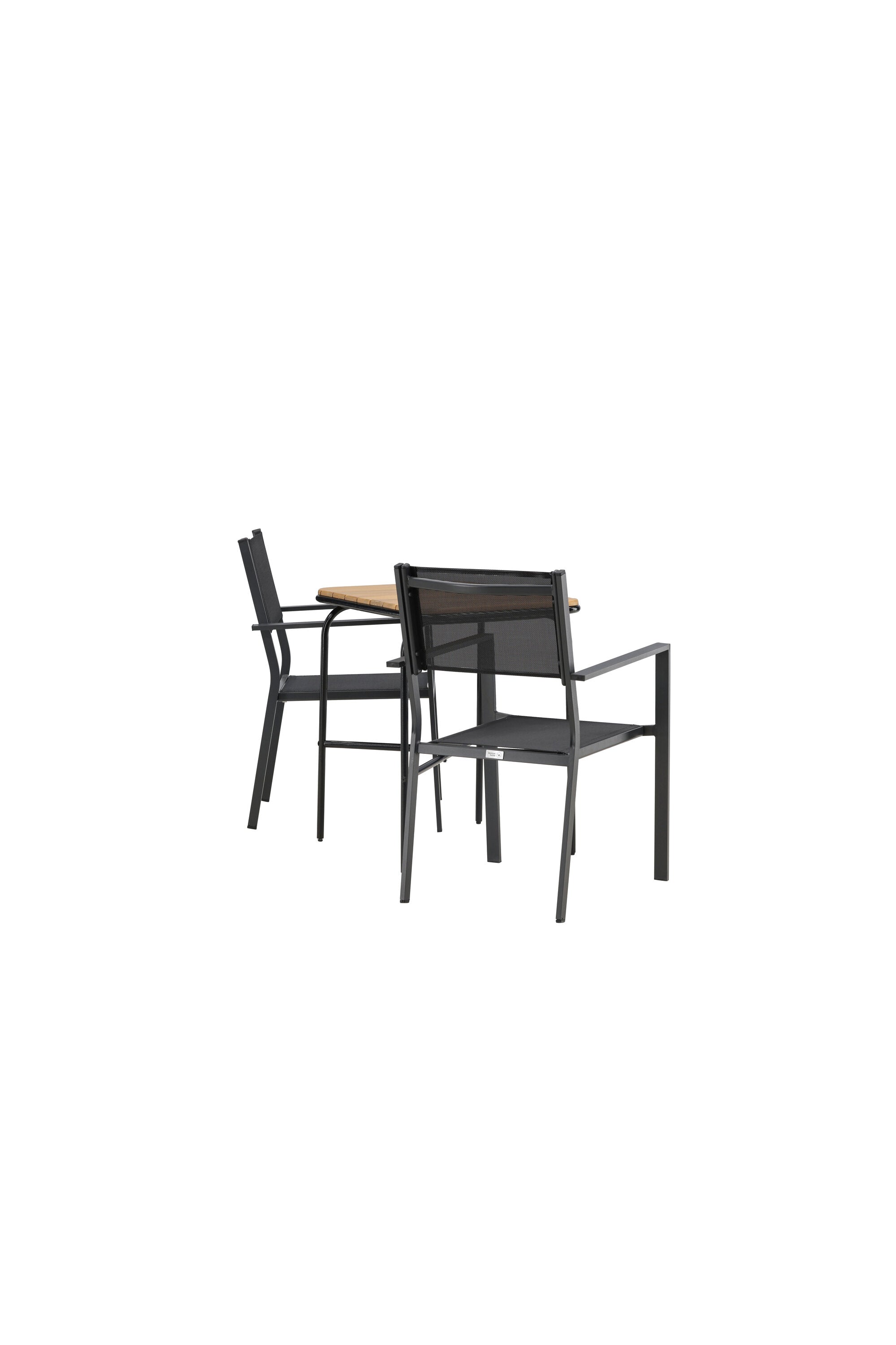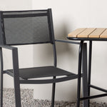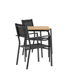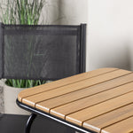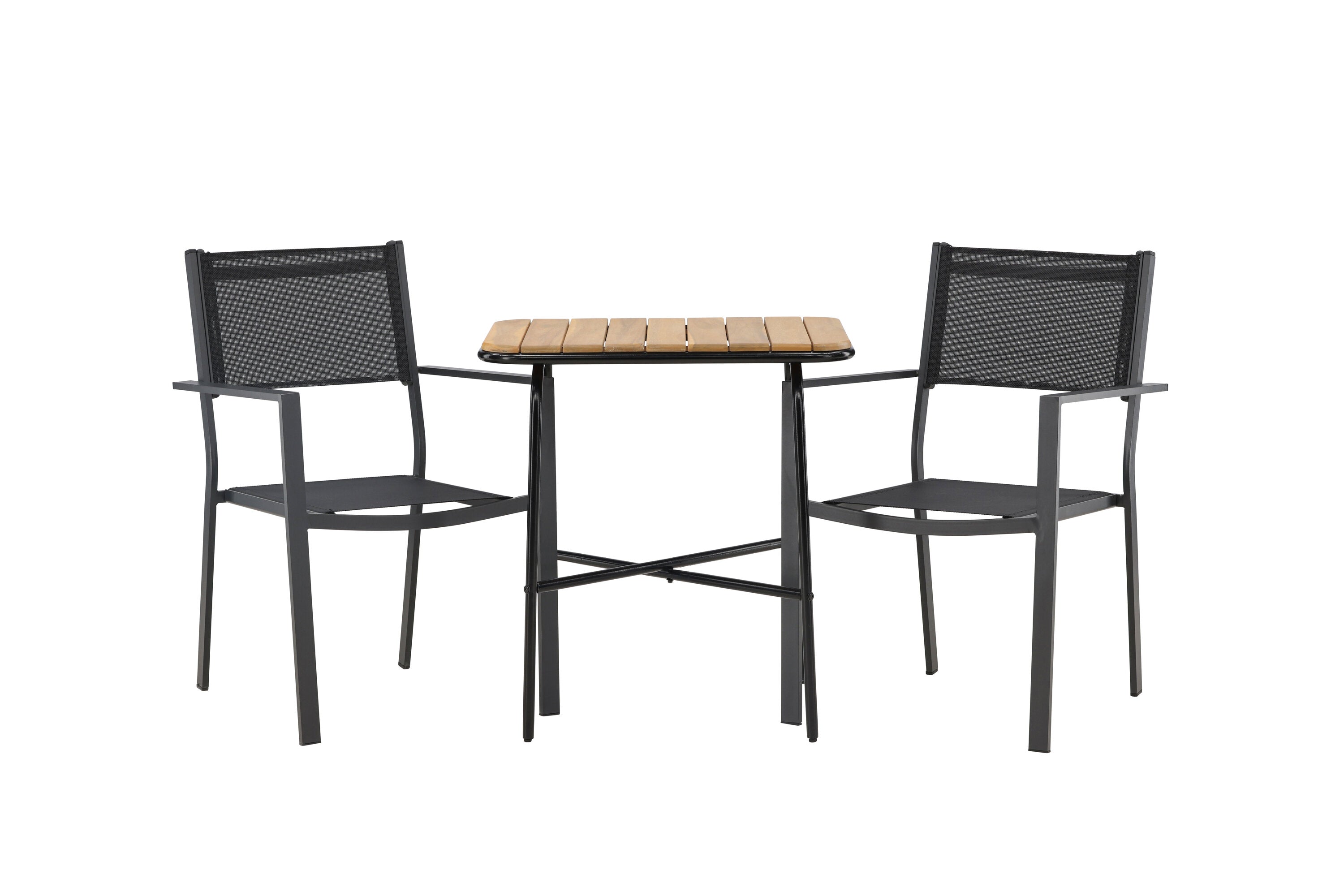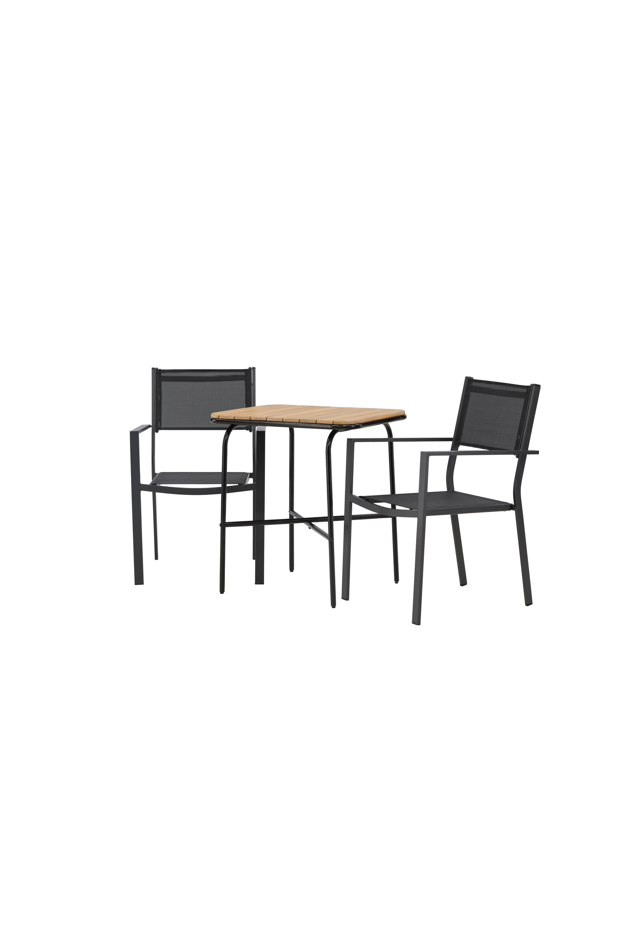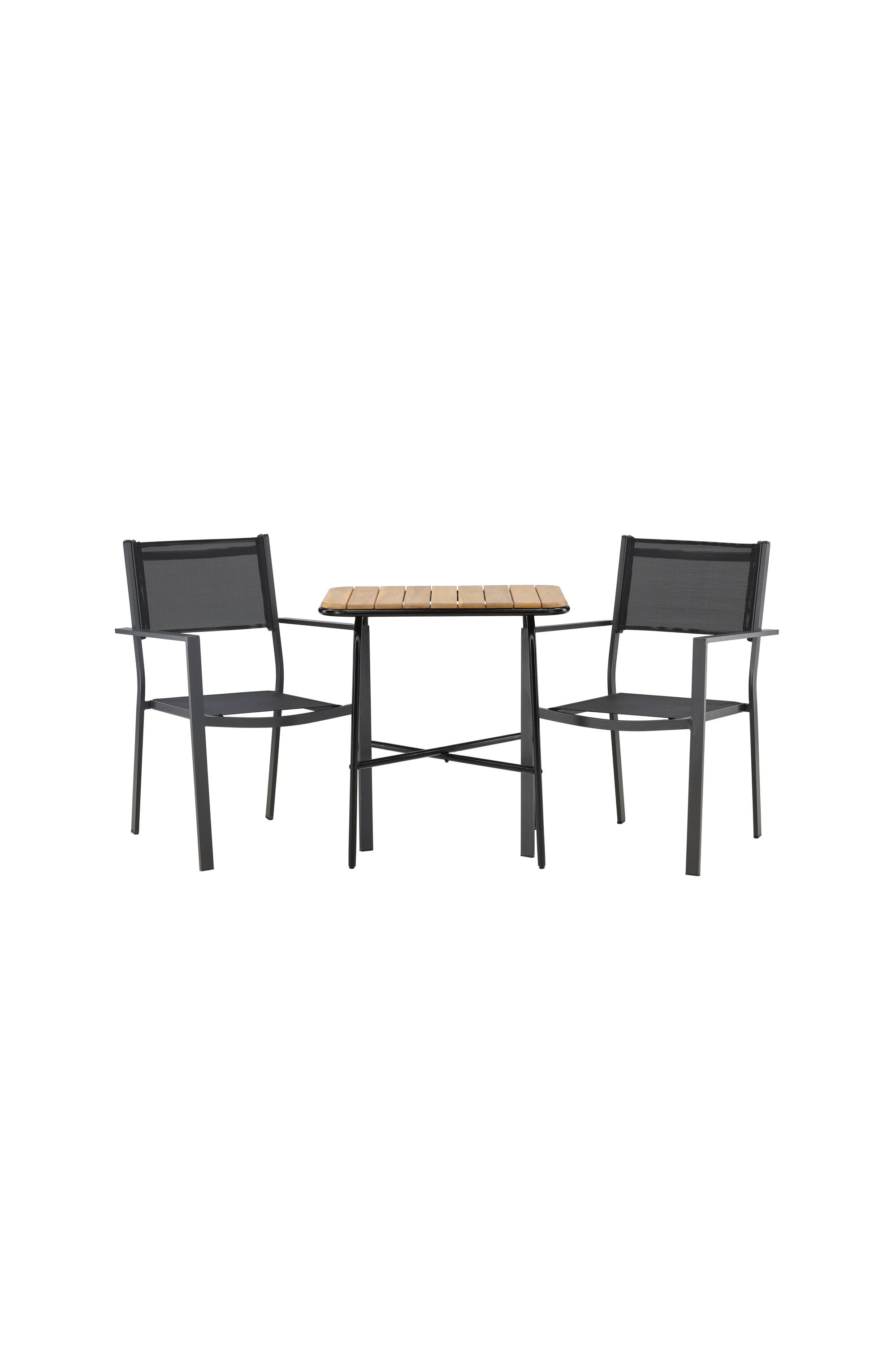 Poutavá kavárenská skupina pro letošní letní přestávky na kávu! Náš stylový kavárenský stůl Holmbeck má moderní žebrovanou desku z akácie a minimalistickou základnu z černé oceli. Zde ve stylové kombinaci se 2 černými jídelními židlemi ze série Copacabana. Židle má rovný severský design v černém hliníku a sedák z textilu. Tato skupina se perfektně hodí k malému balkonu nebo slunnému koutu terasy! Rozměry stolu: 74 x 70 x 55 cm.