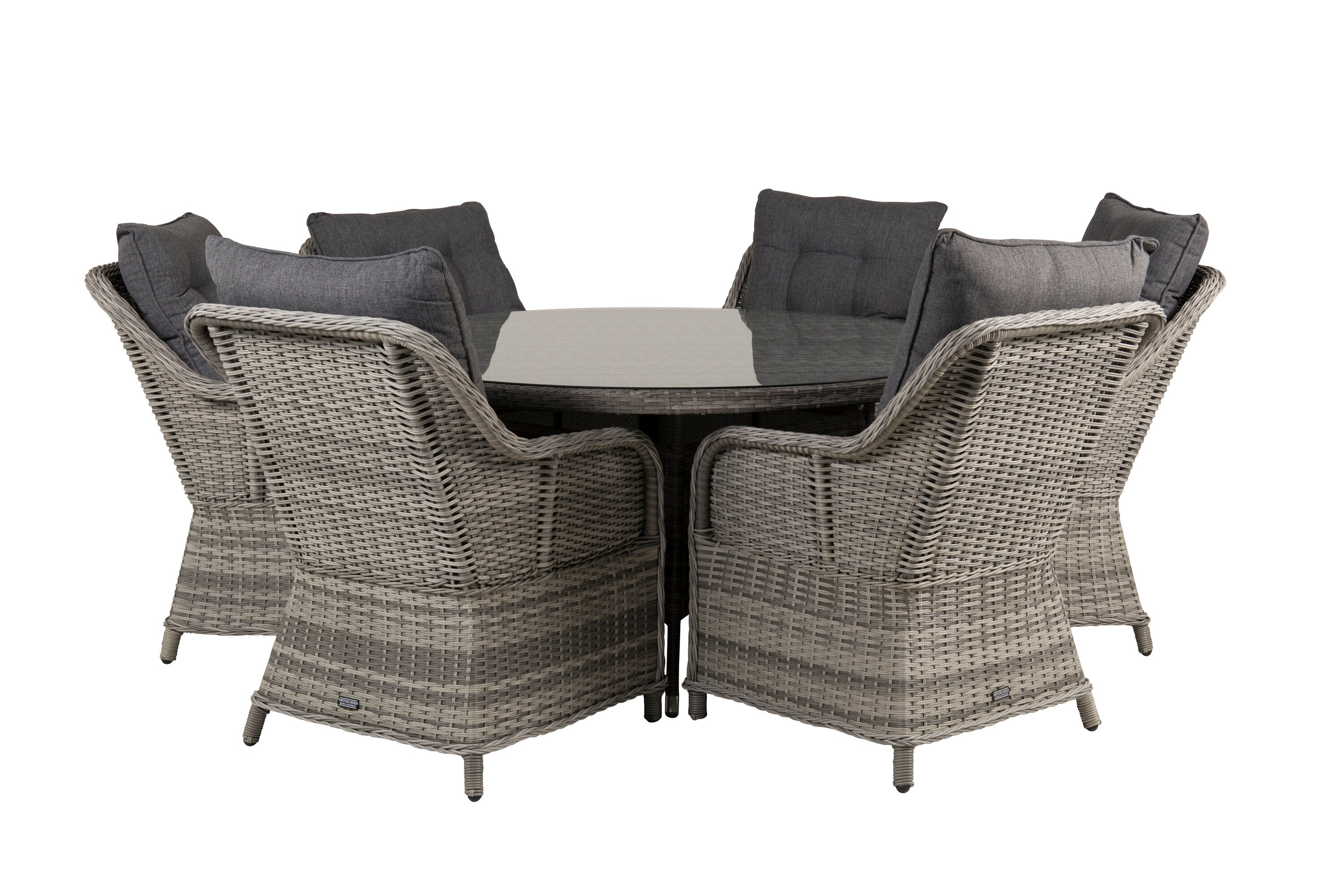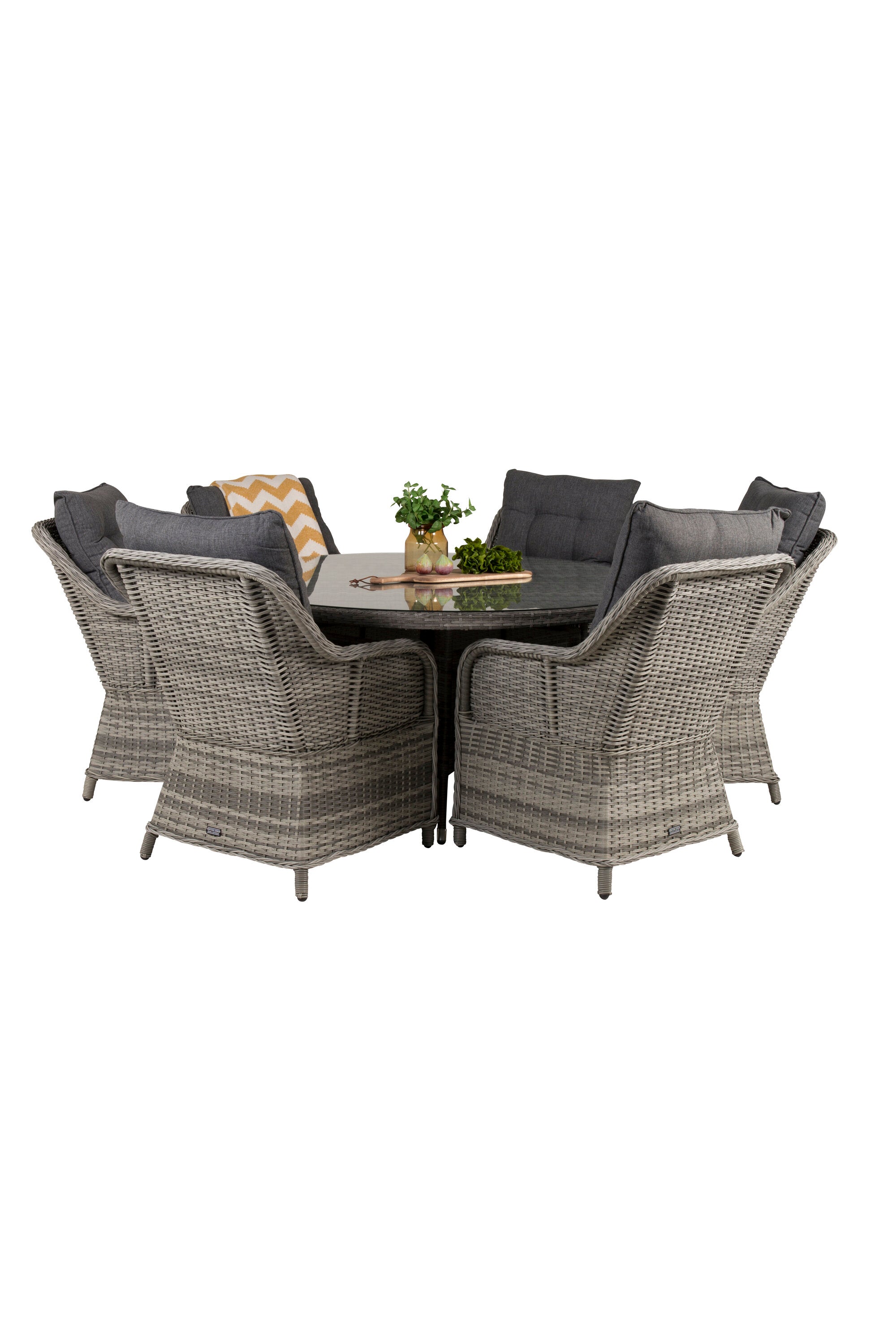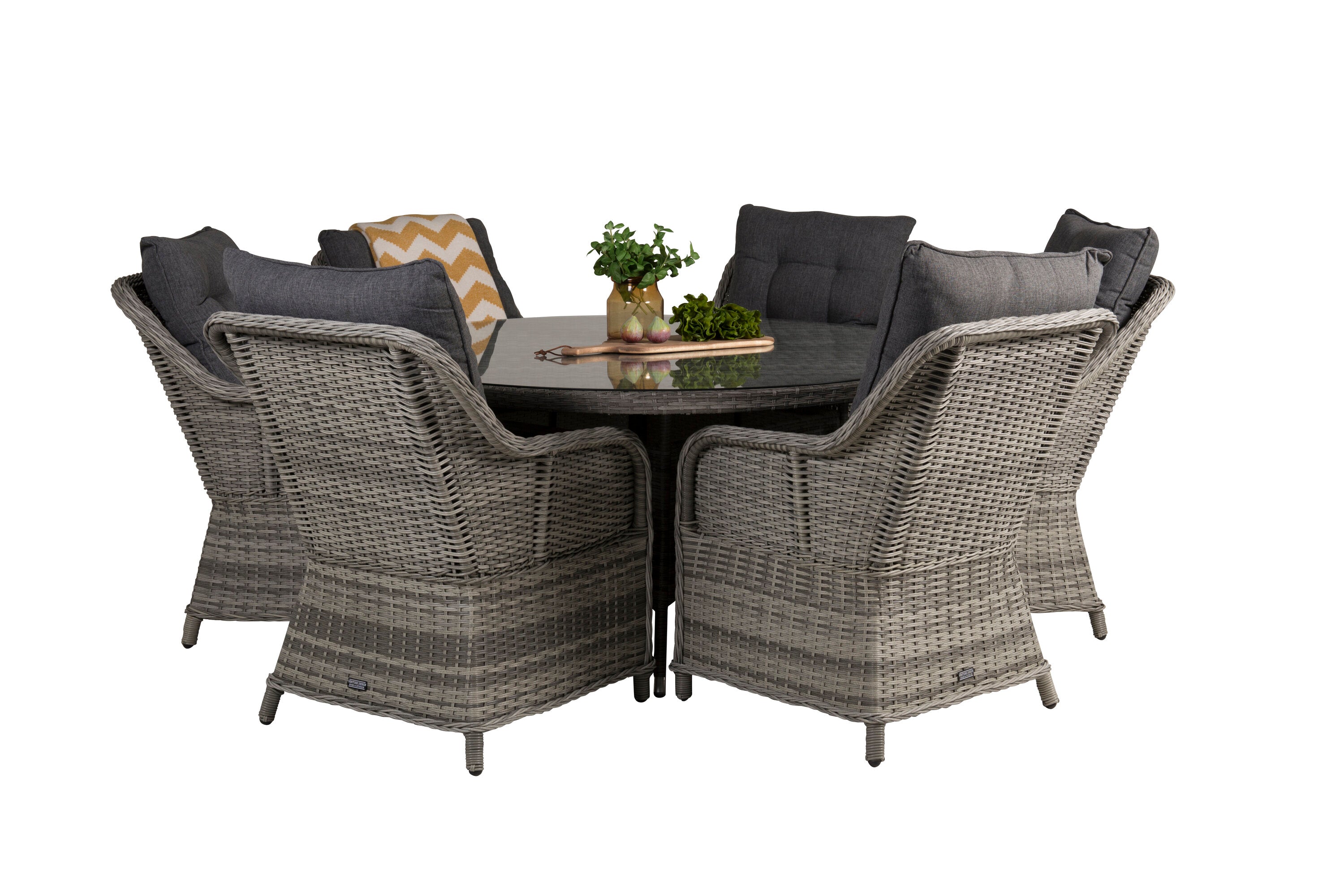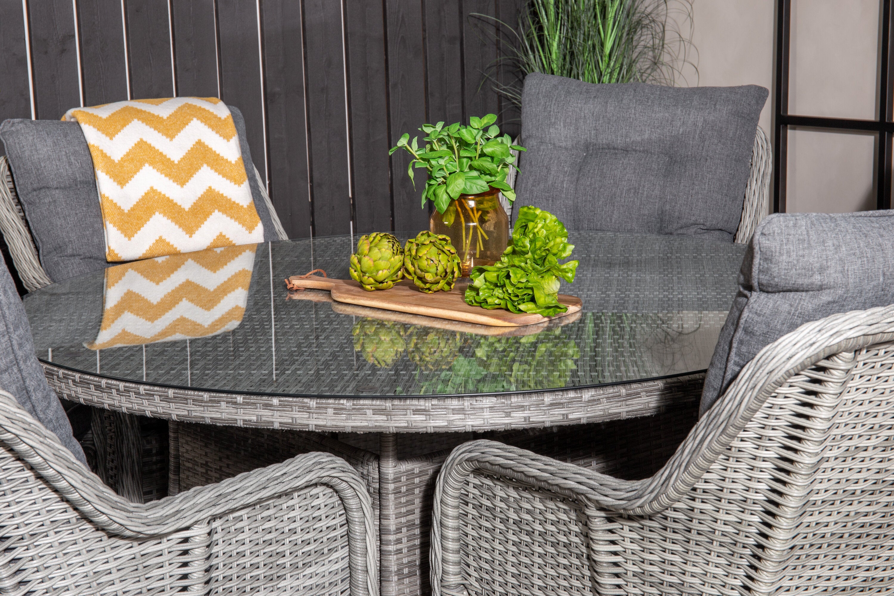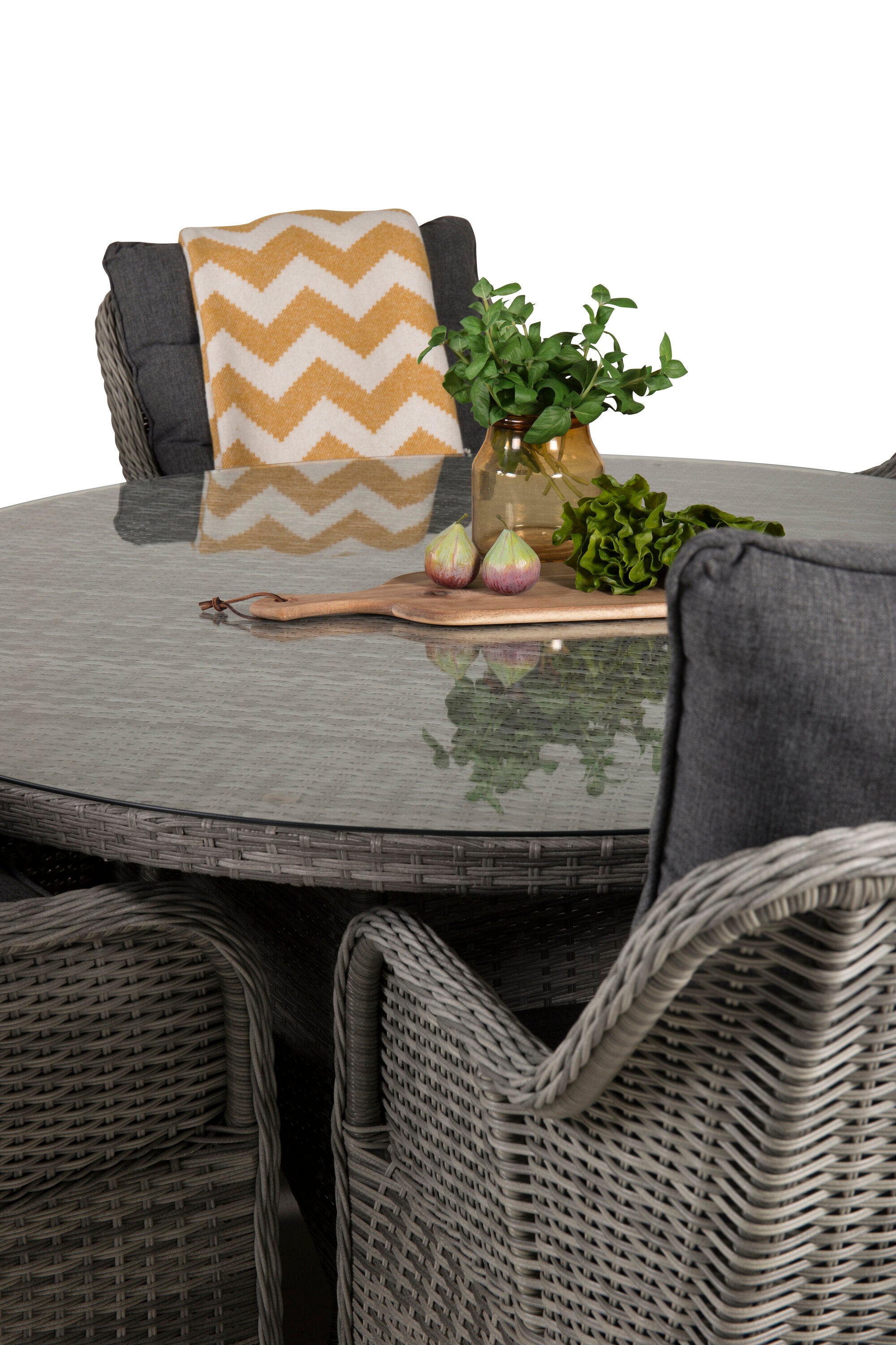 Kulaté skupiny potravin poskytují skvělý rodinný pocit a pospolitost! Jídelní stůl Volta spolu s našimi robustními umělými křesly Vikelund vám dává pompézní skupinu jídel, která stojí v čase!