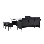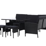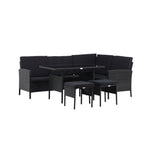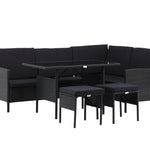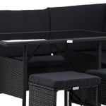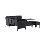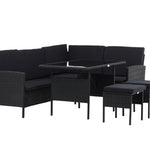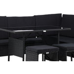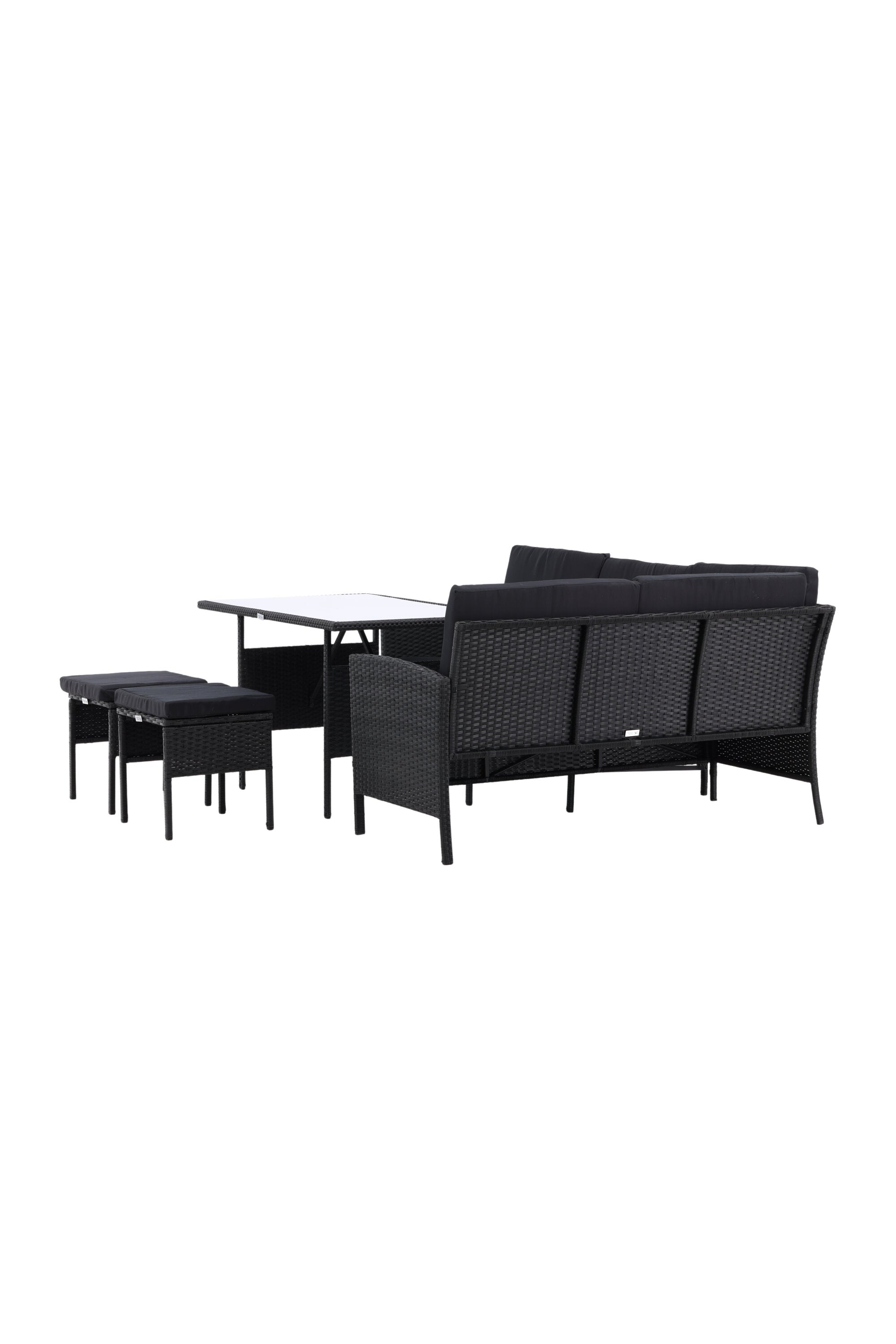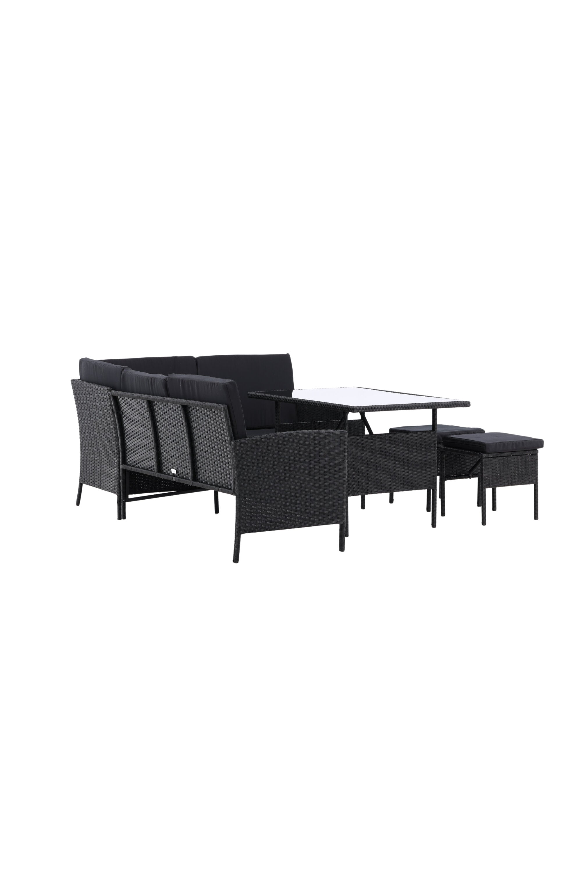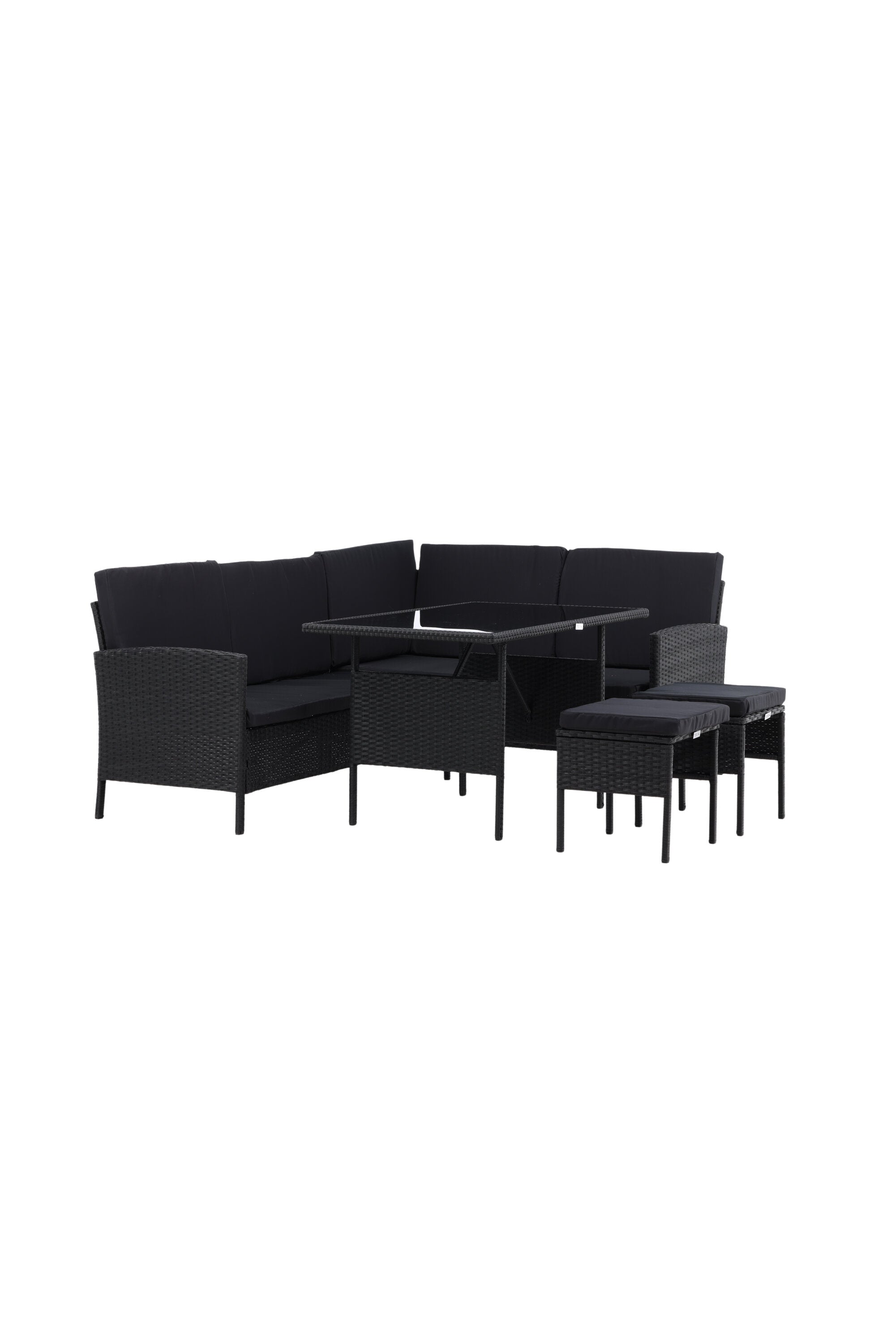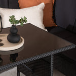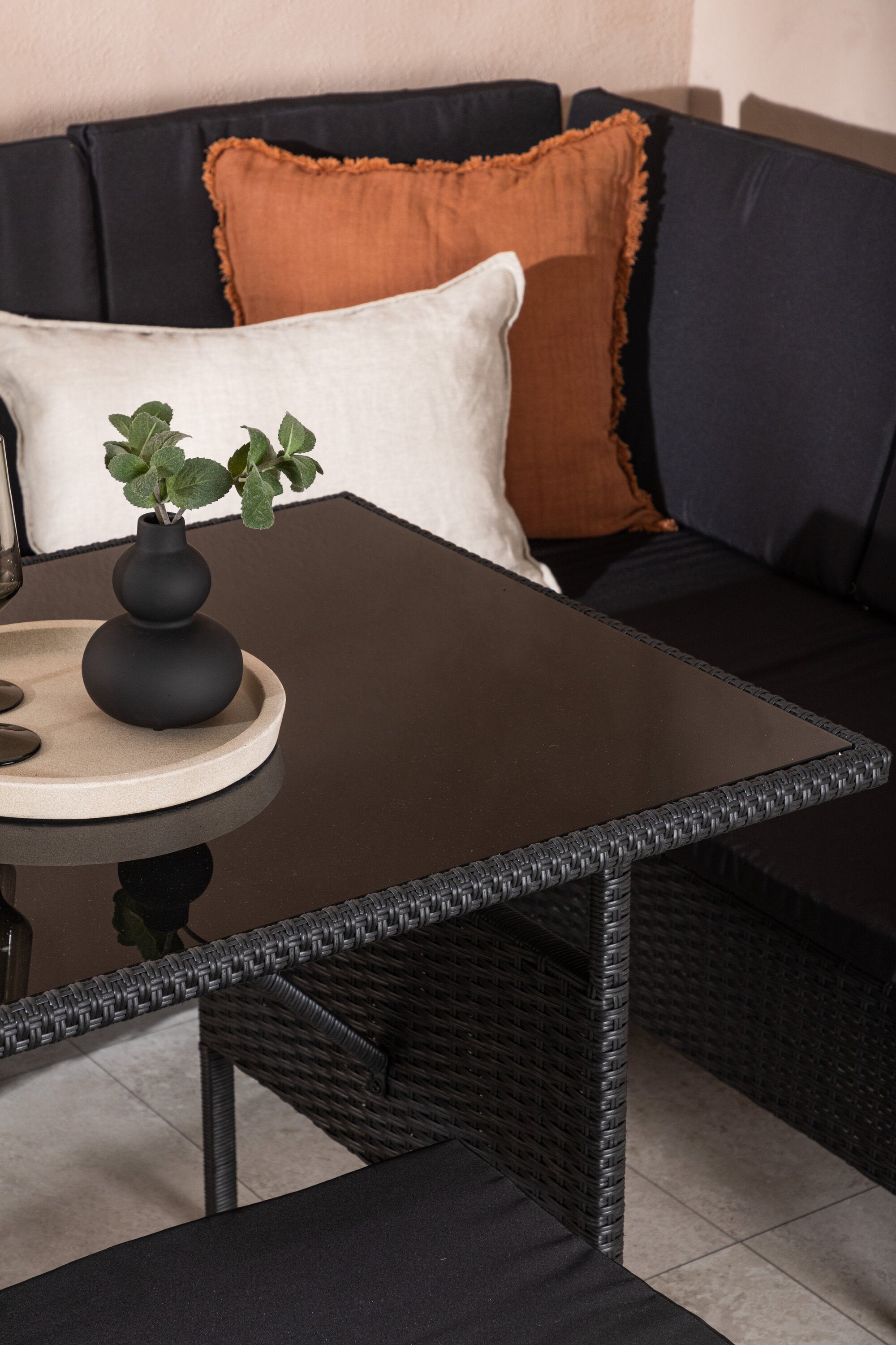 Skupina pohovek Knock je skvělá pro vaši terasu nebo terasu a je vytvořena s důrazem na pohodlí a nadčasový design. Sedací soupravu tvoří rohová sedací souprava v černém umělém ratanu se čtyřmi sedáky a jedním rohovým dílem, dvěma kohouty a vyšším stolem z umělého ratanu se skleněným stolem. Černé polštáře jsou součástí skupiny pohovek a přispívají k příjemnému pocitu!