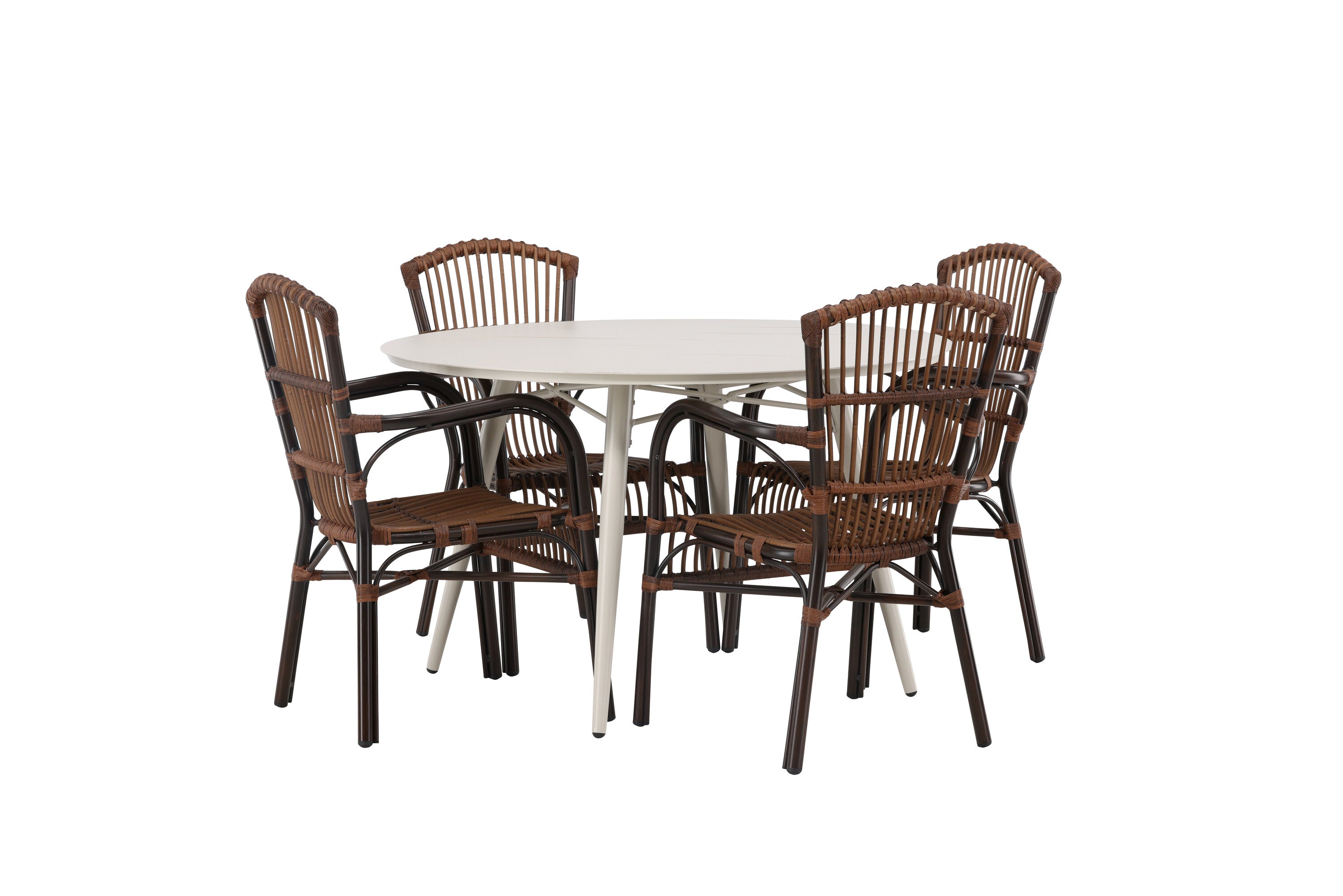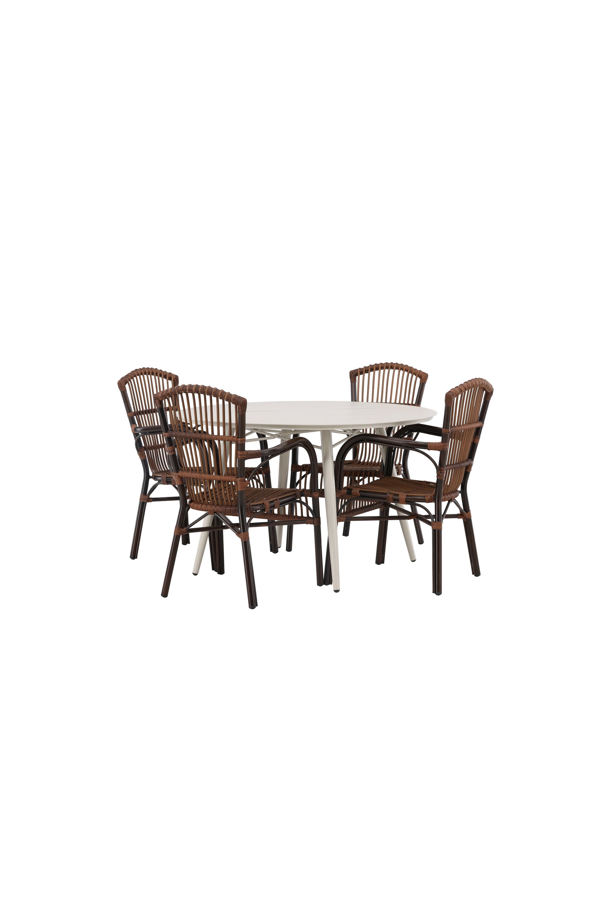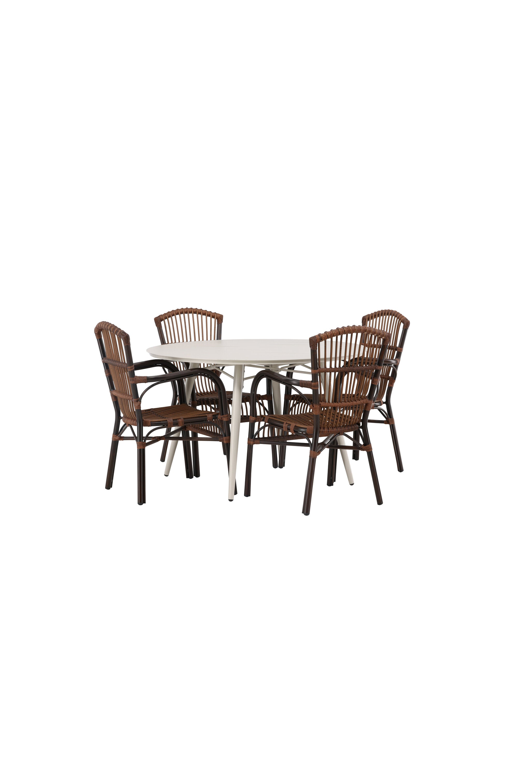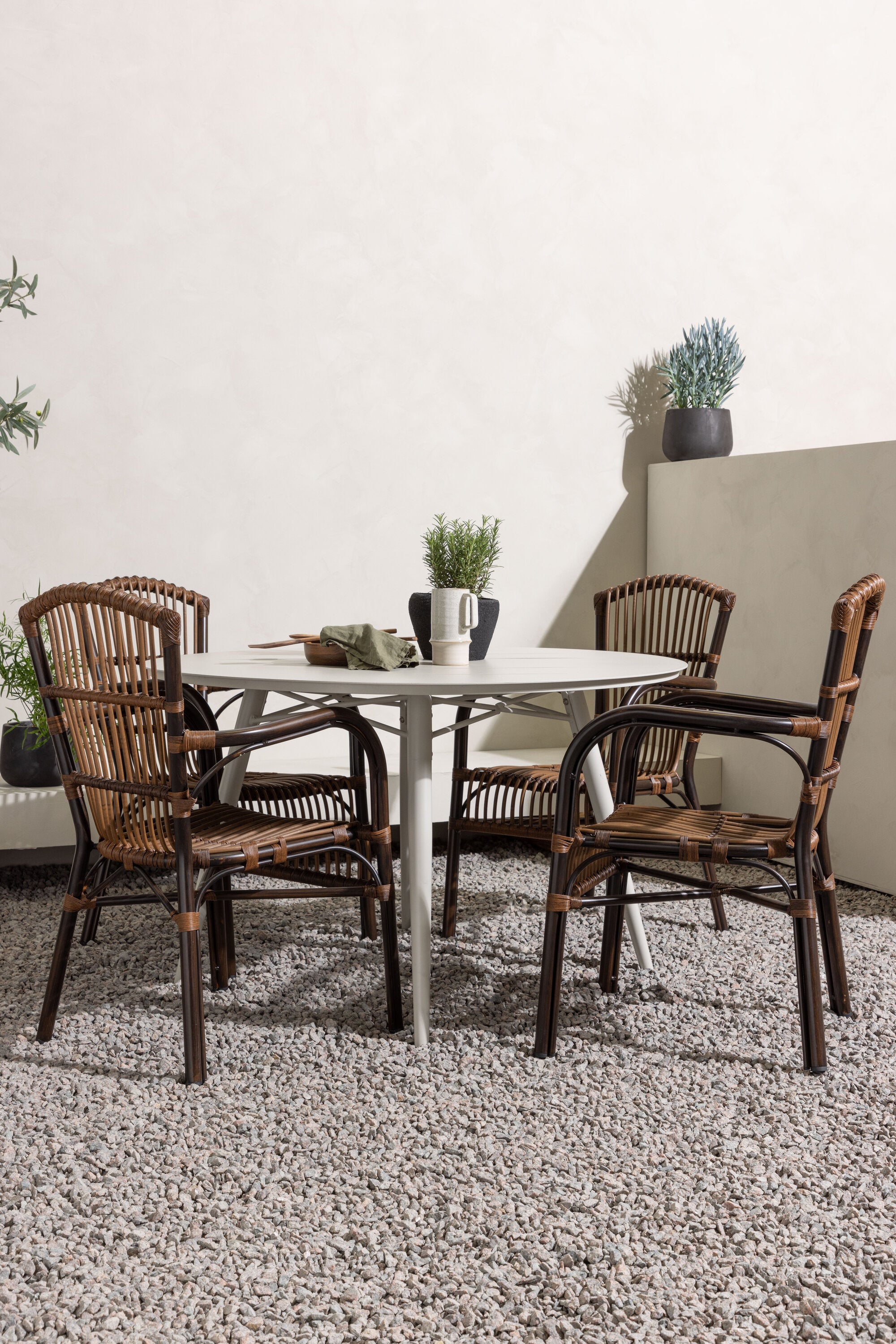 Vytvořte na terase poutač, který zapůsobí na vaše hosty pomocí této předem sestavené jídelní sestavy! Jednoduchý, ale elegantní, kulatý jídelní stůl ze série Lina má svěží design a hřejivou béžovou barvu. Horní deska je tenká s ozdobnými štěrbinami a nohy stolu mírně rozšířené; důsledně vyrobeno z oceli. Zde společně se 4 moderními židlemi ze série Galera. Židle má moderní barvu v ořechu a vkusné provedení v materiálu pletené proutí. Hliníková rámová konstrukce je robustní s vysokými područkami pro extra pohodlí. Prostřete toto léto stůl venku a nechte čas zde, aby byl vrcholem vašeho dne! Průměr stolu: 120 cm.