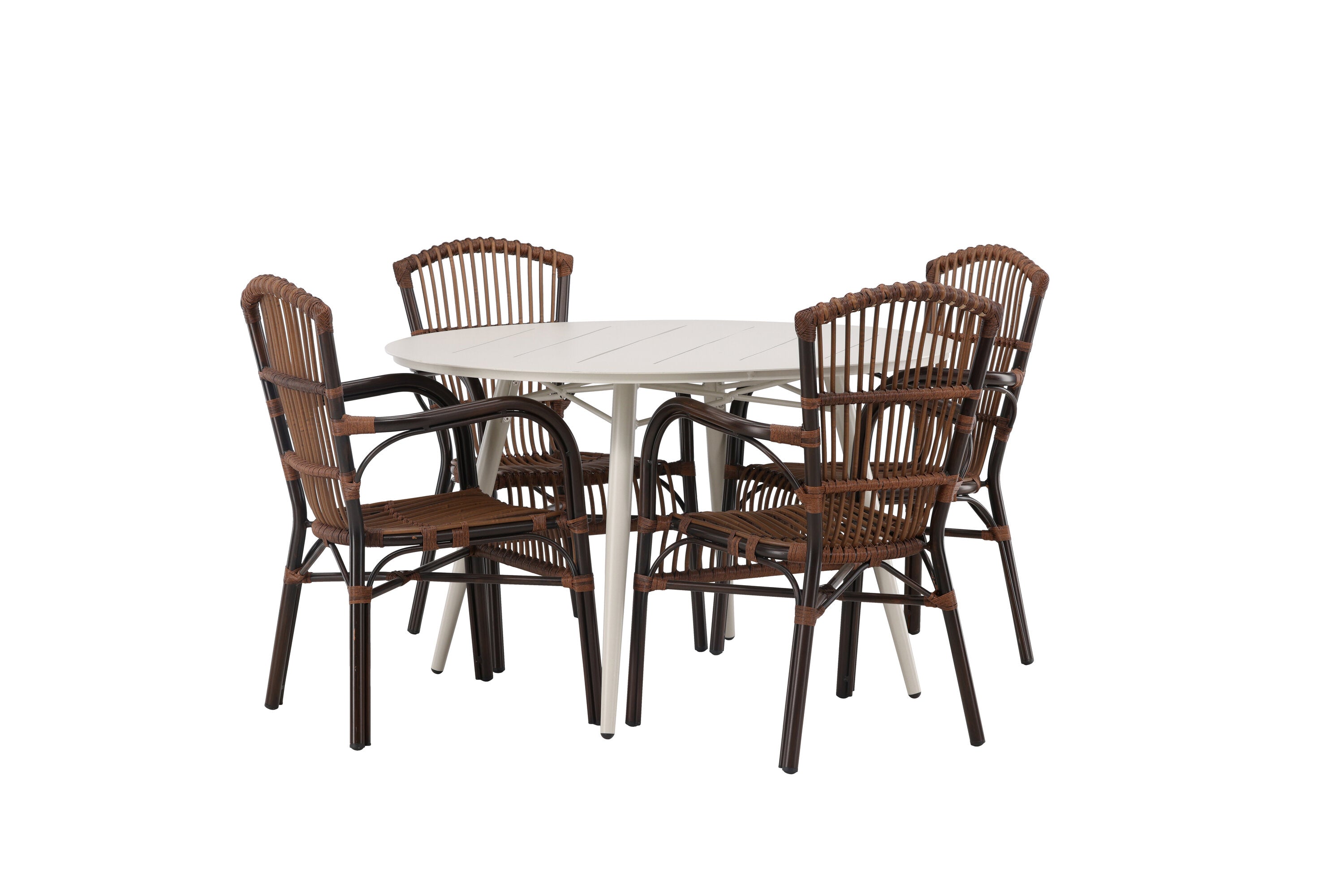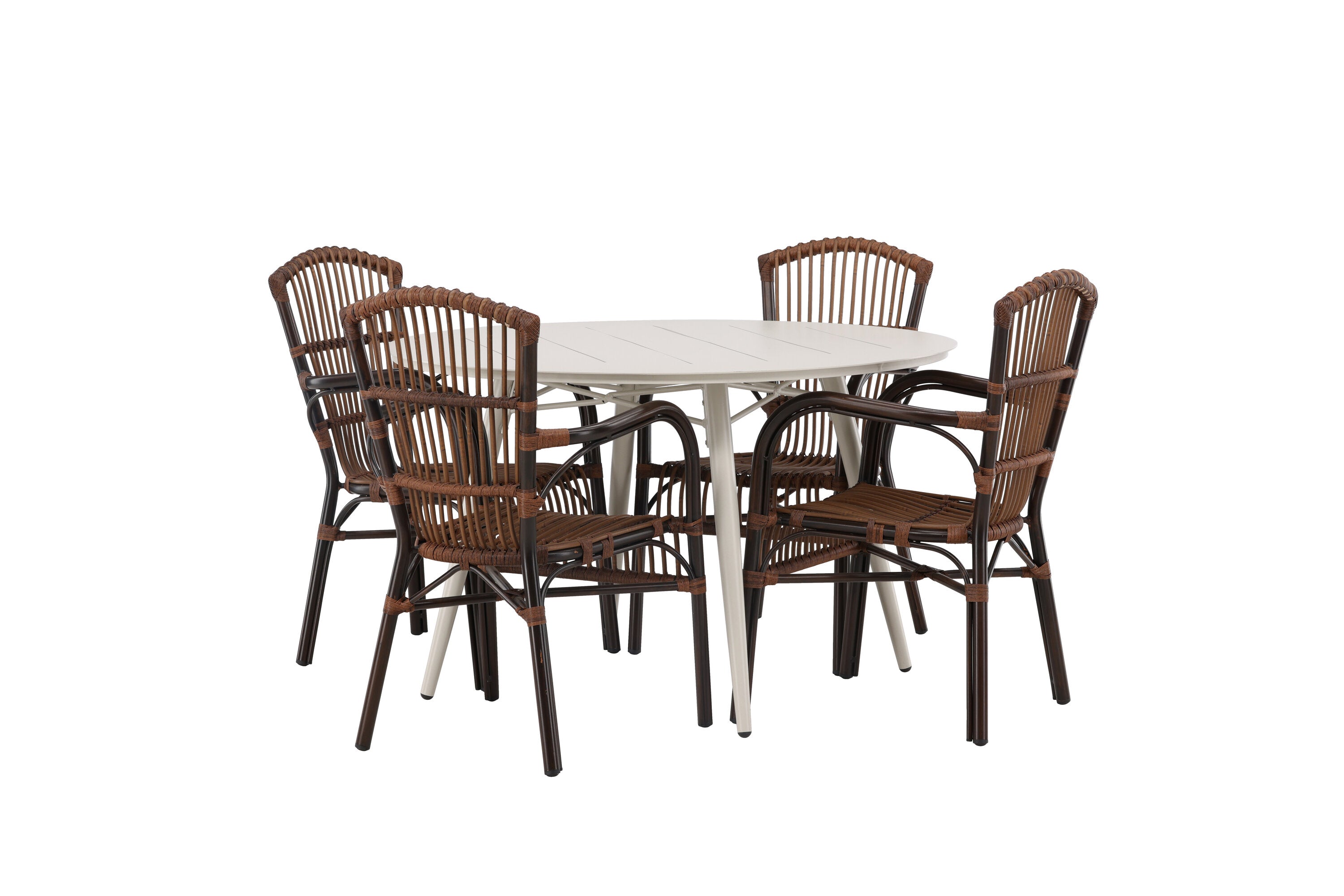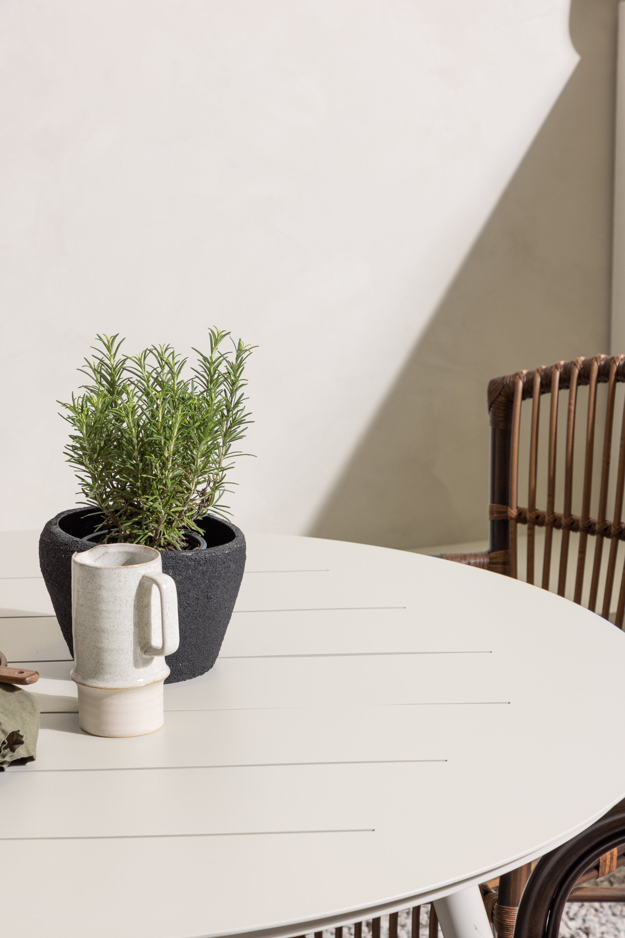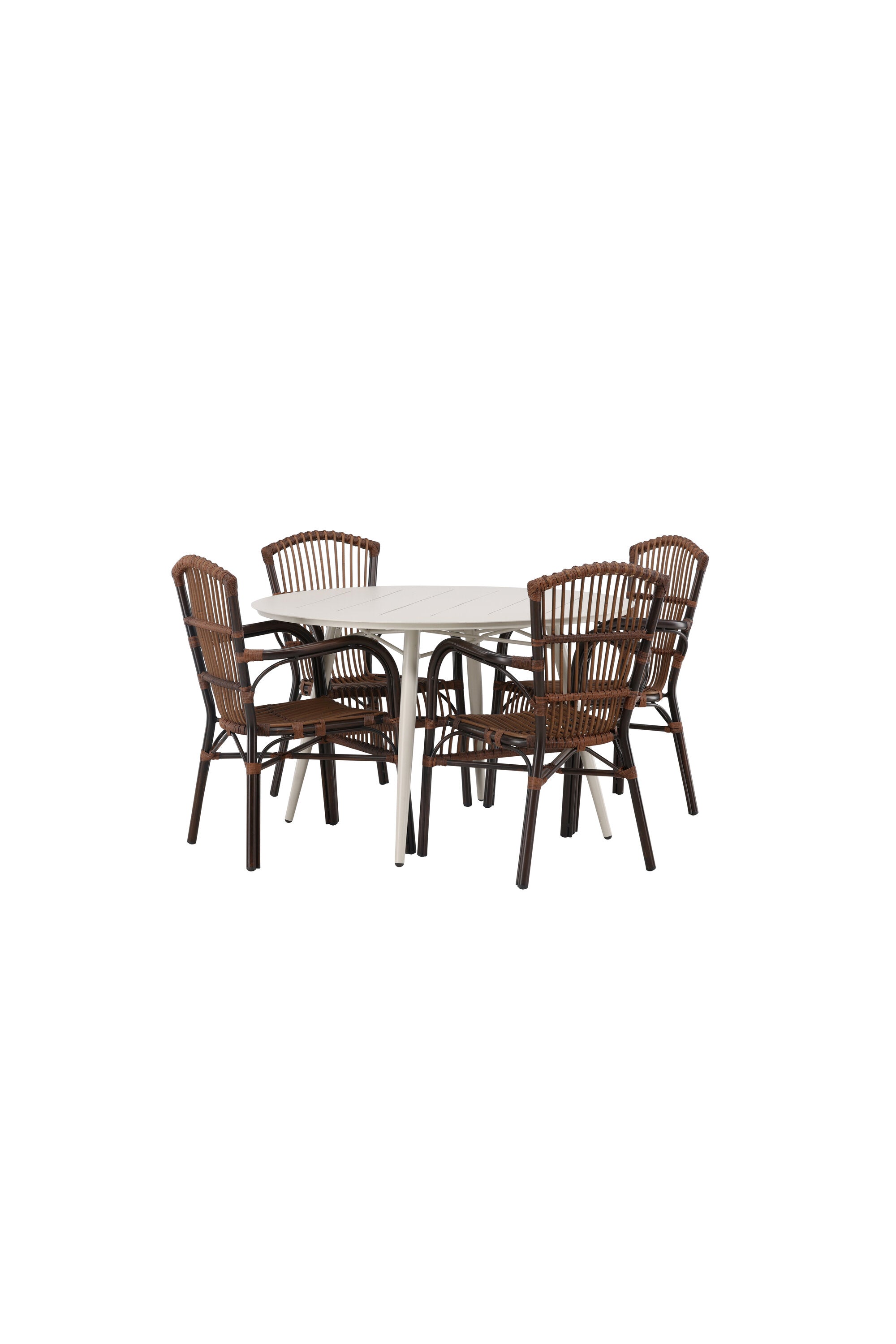 Vytvořte na terase poutač, který zapůsobí na vaše hosty pomocí této předem sestavené jídelní sestavy! Jednoduchý, ale elegantní, kulatý jídelní stůl ze série Lina má svěží design a hřejivou béžovou barvu. Horní deska je tenká s ozdobnými štěrbinami a nohy stolu mírně rozšířené; důsledně vyrobeno z oceli. Zde společně se 4 moderními židlemi ze série Galera. Židle má moderní barvu v ořechu a vkusné provedení v materiálu pletené proutí. Hliníková rámová konstrukce je robustní s vysokými područkami pro extra pohodlí. Prostřete toto léto stůl venku a nechte čas zde, aby byl vrcholem vašeho dne! Průměr stolu: 120 cm.