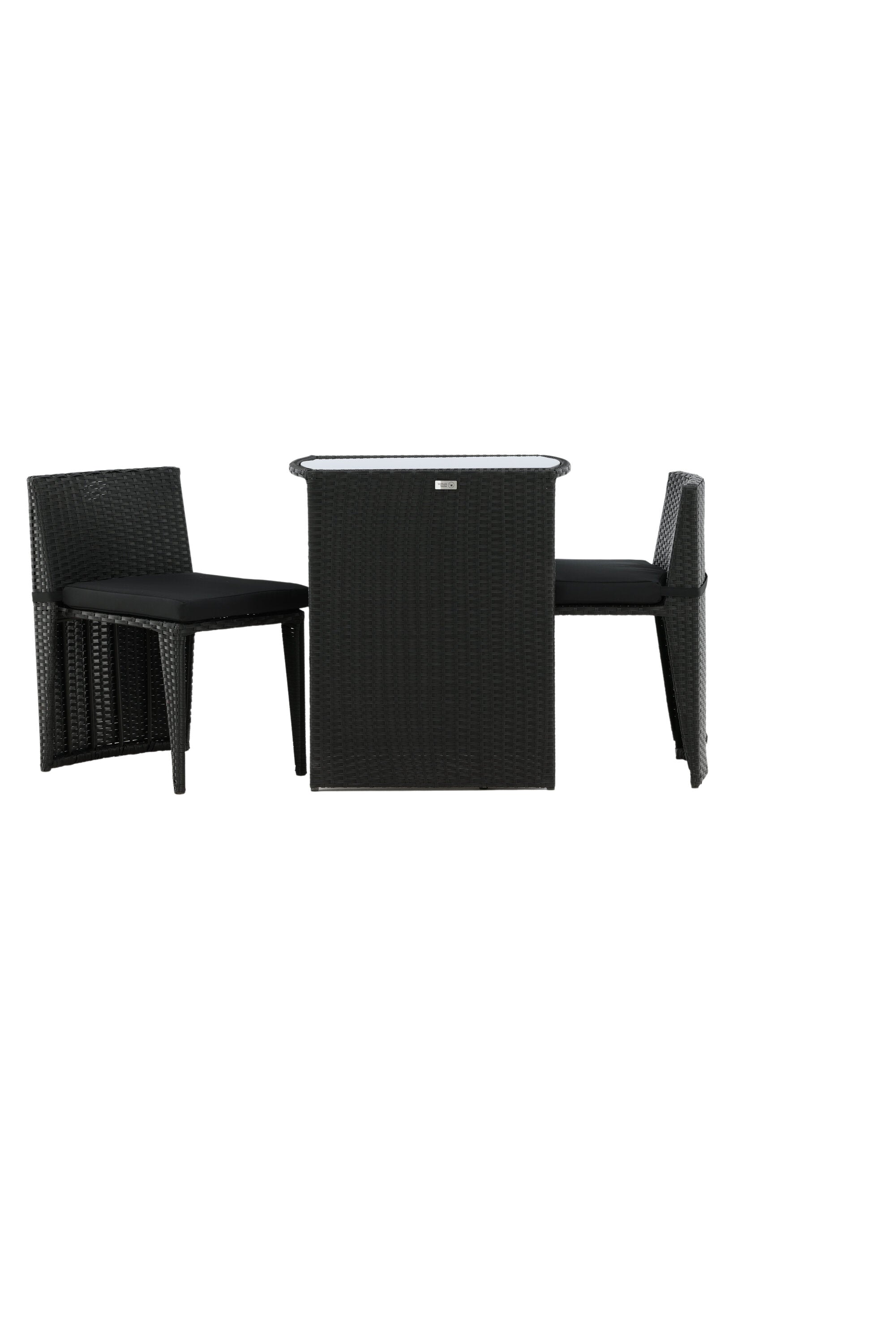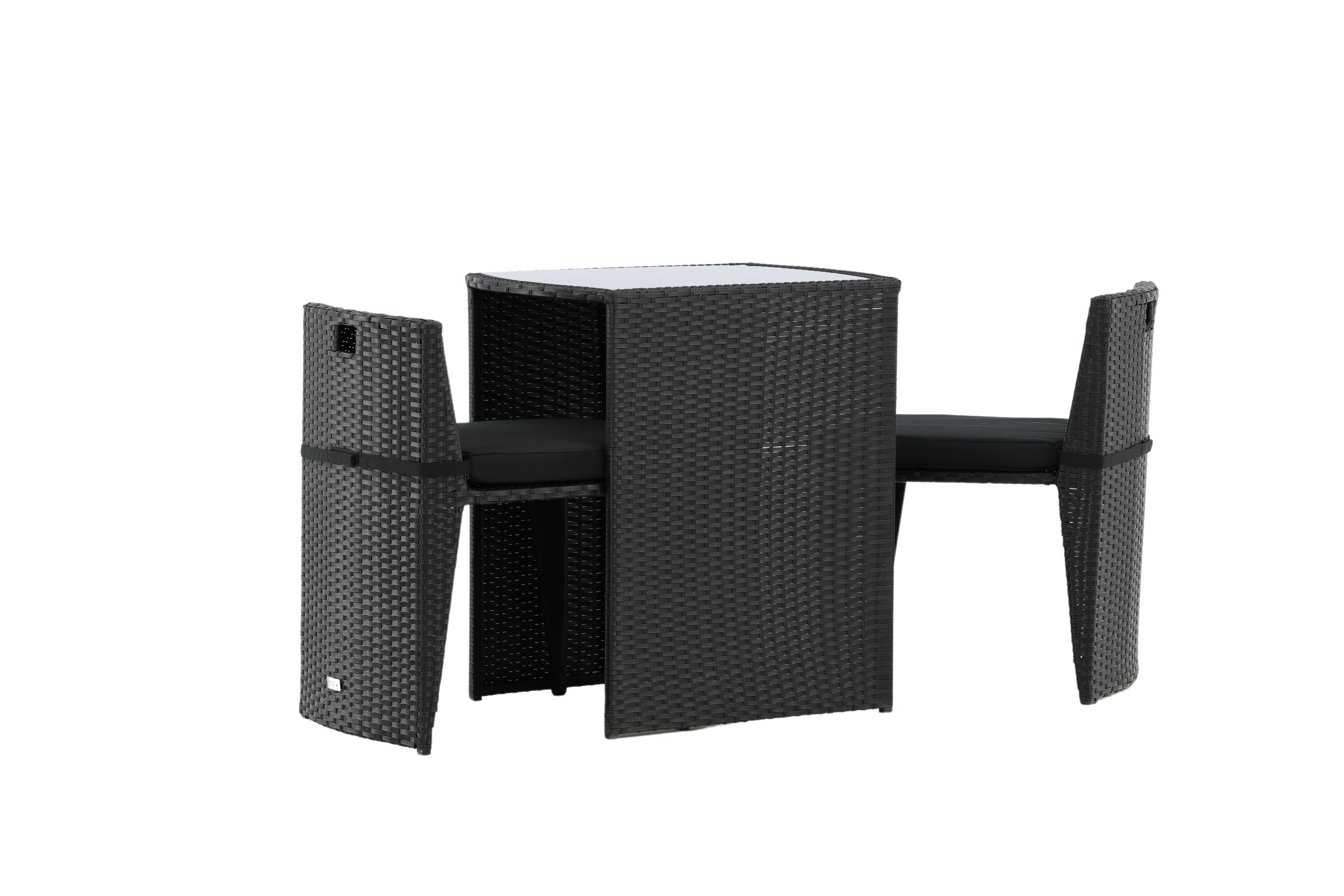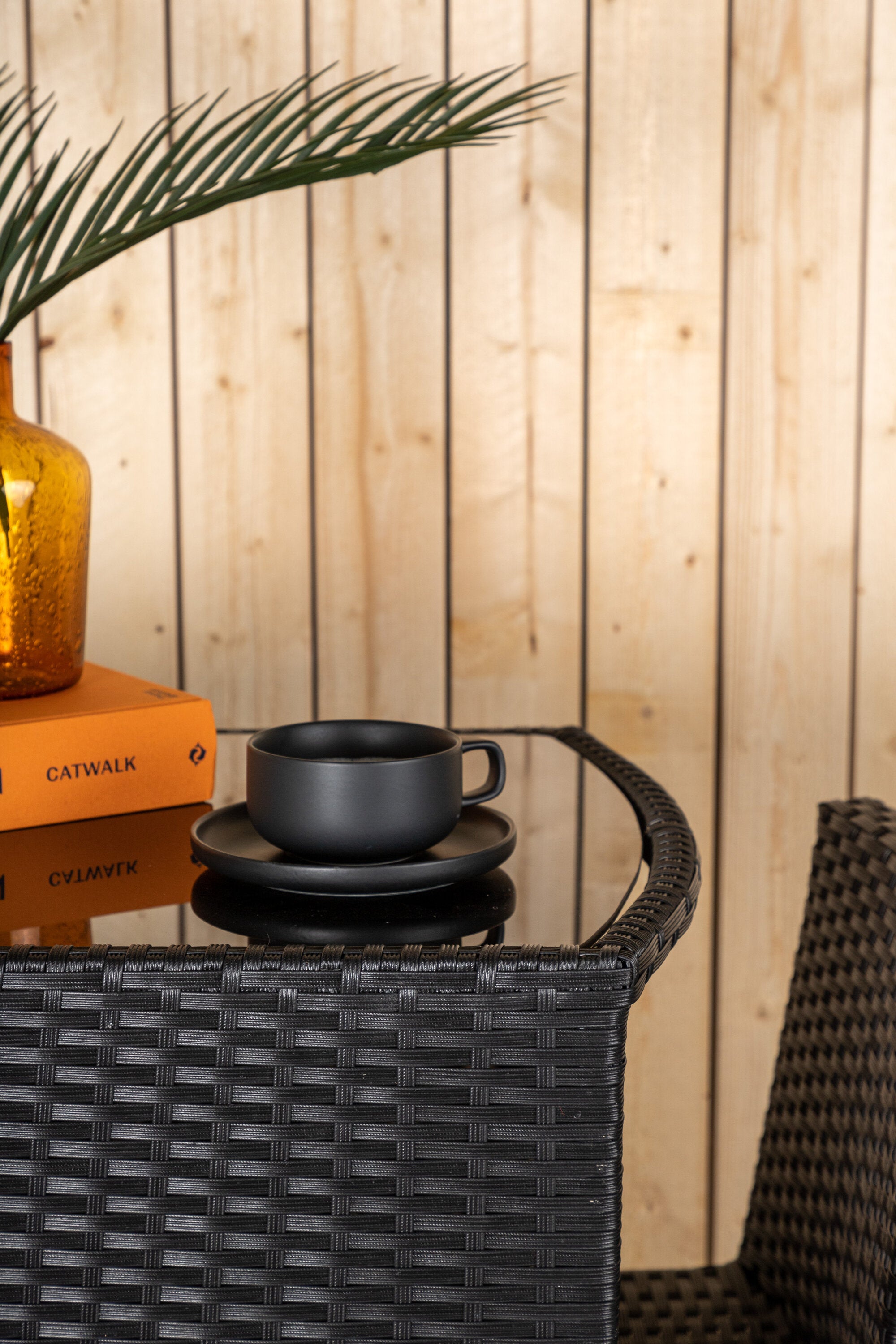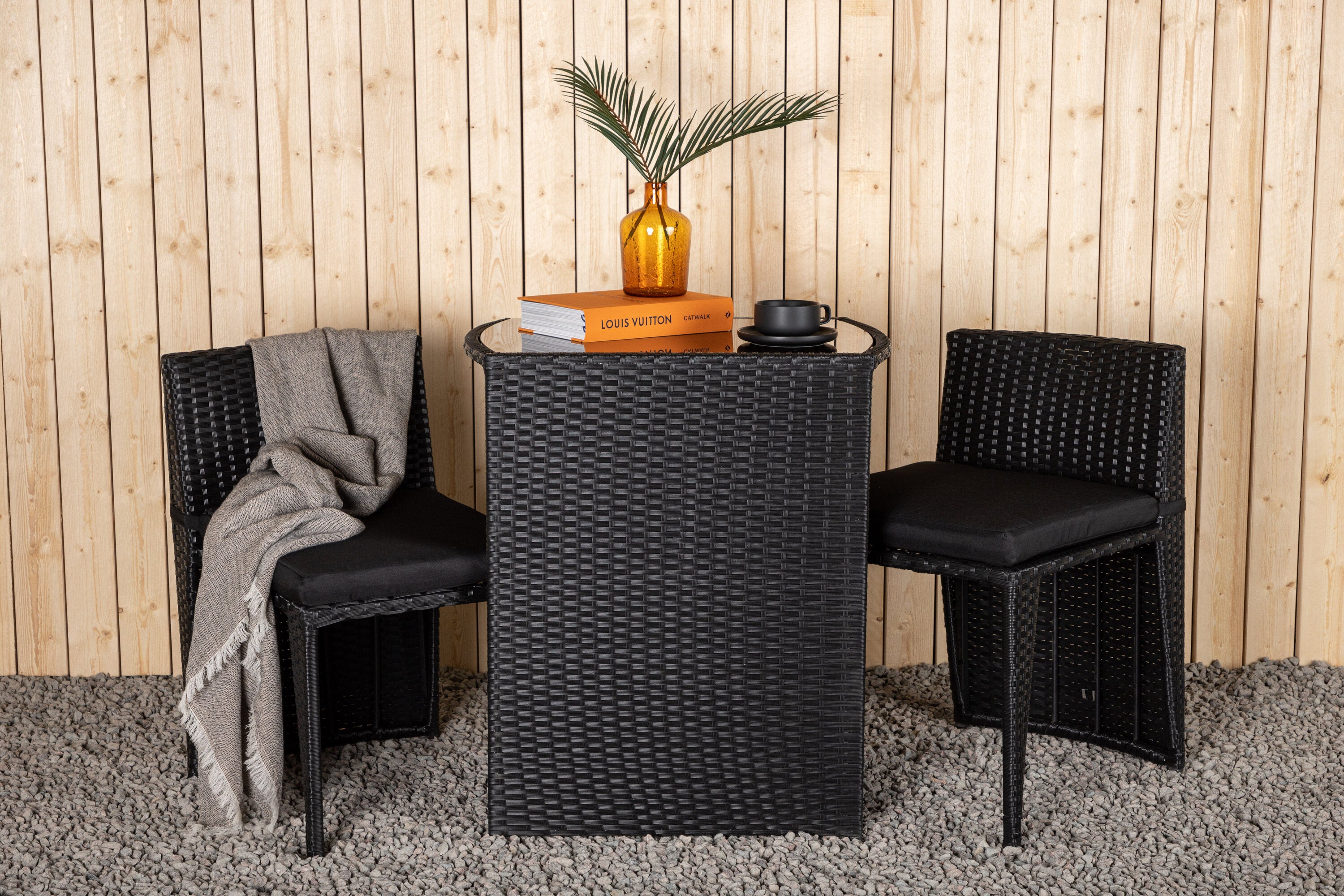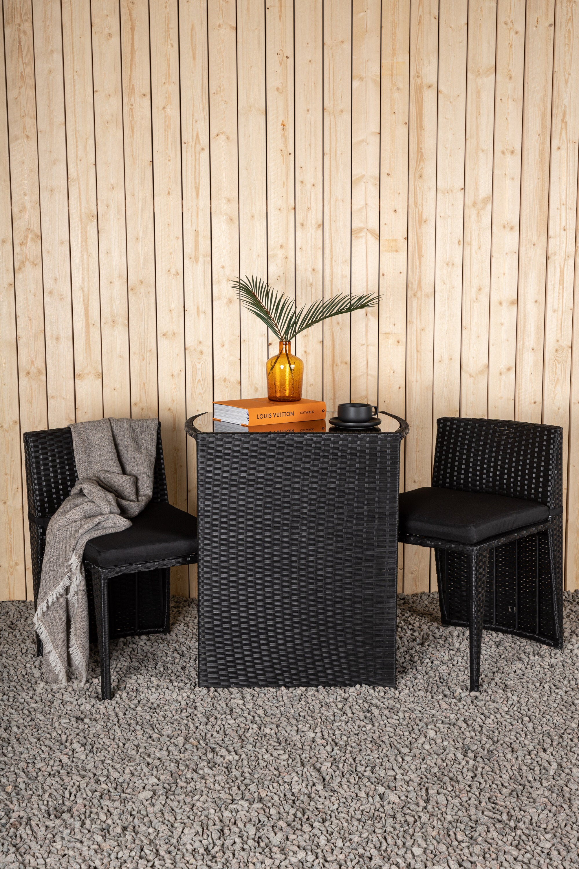 Útulný černý kavárenský set v hezkém designu vyrobený z odolného umělého ratanu, který se perfektně hodí na menší terasu. Kavárenský set se skládá ze dvou židlí a stolu s přidruženou skleněnou deskou, která zastupuje počasí i vítr, úhledné židle jsou dodávány s měkkými sedáky a židle můžete snadno zasunout pod stůl pro snadné skladování a úsporu místa.