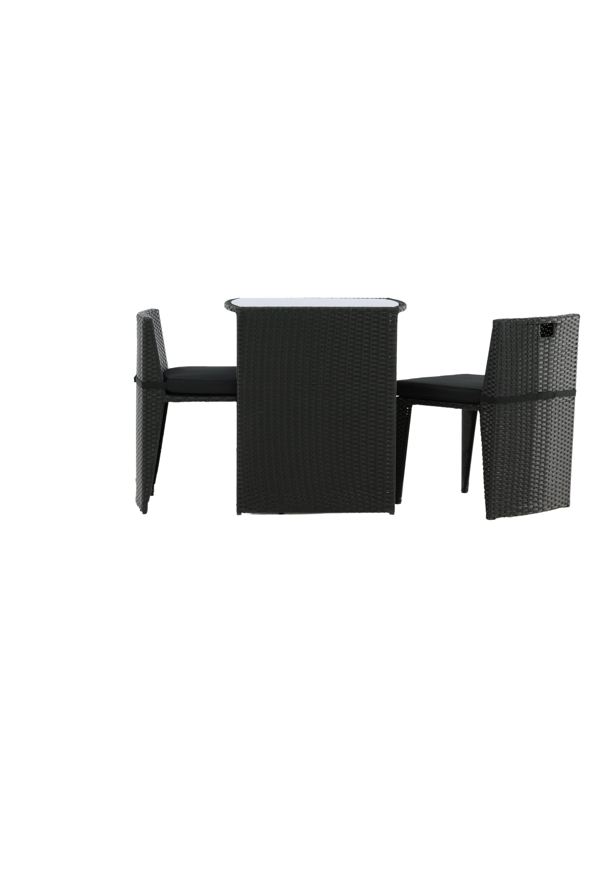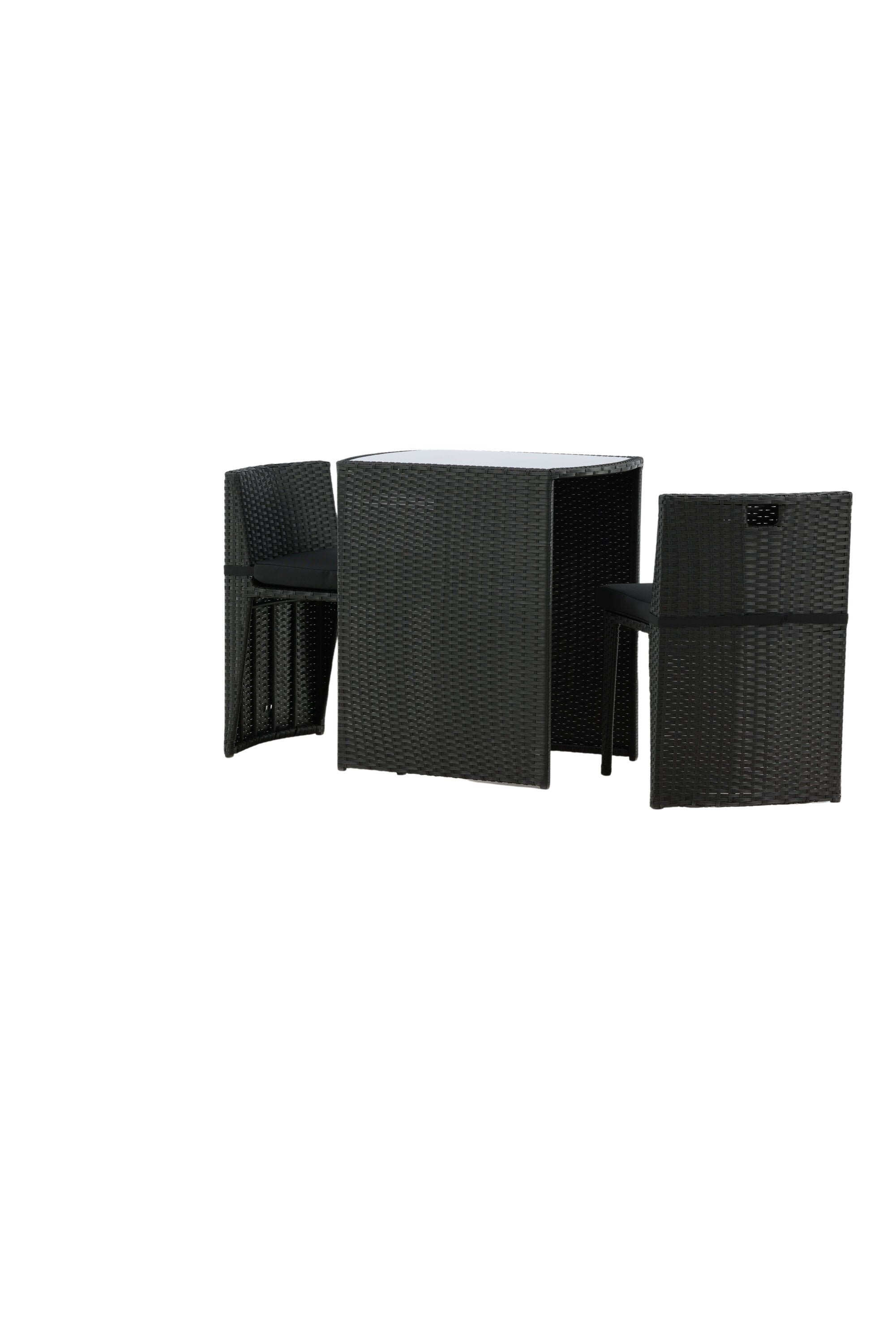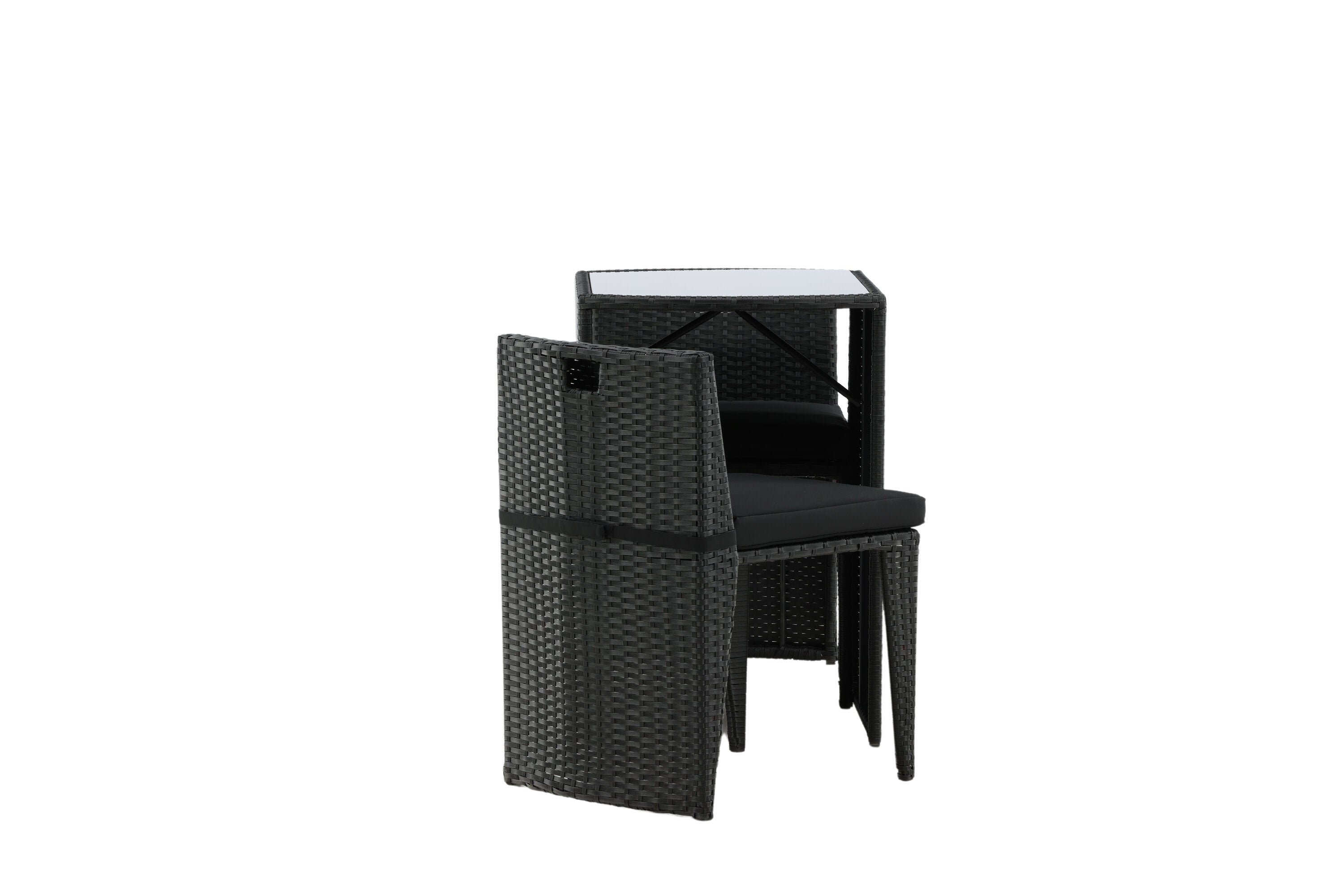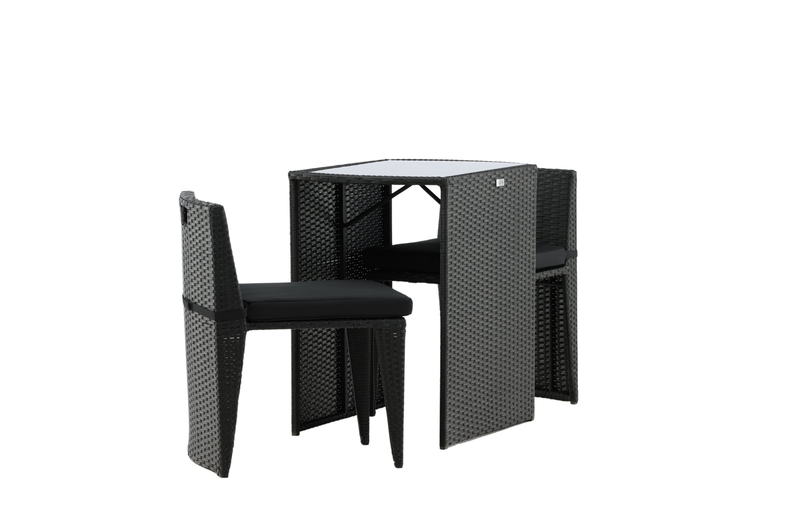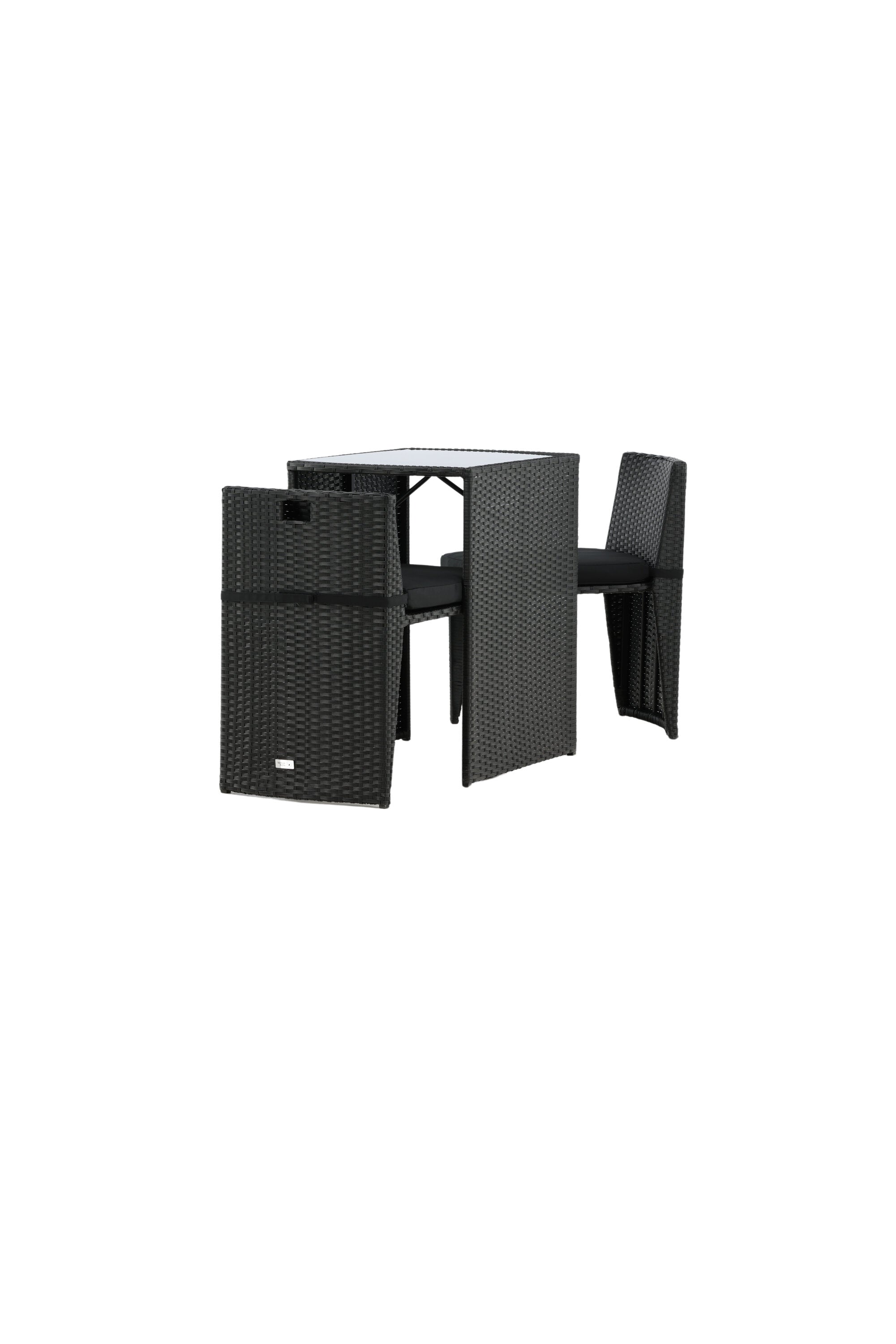 Útulný černý kavárenský set v hezkém designu vyrobený z odolného umělého ratanu, který se perfektně hodí na menší terasu. Kavárenský set se skládá ze dvou židlí a stolu s přidruženou skleněnou deskou, která zastupuje počasí i vítr, úhledné židle jsou dodávány s měkkými sedáky a židle můžete snadno zasunout pod stůl pro snadné skladování a úsporu místa.