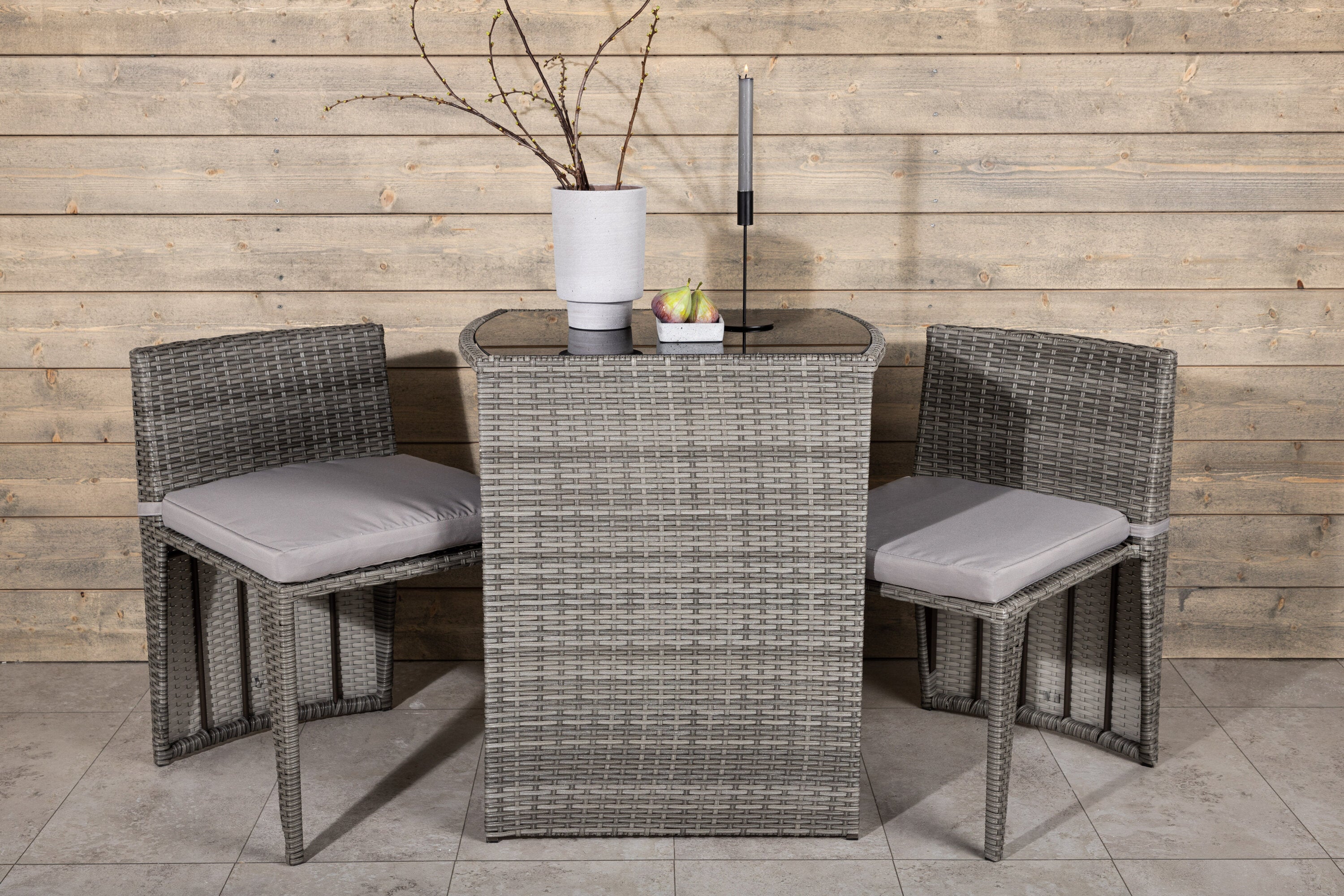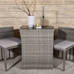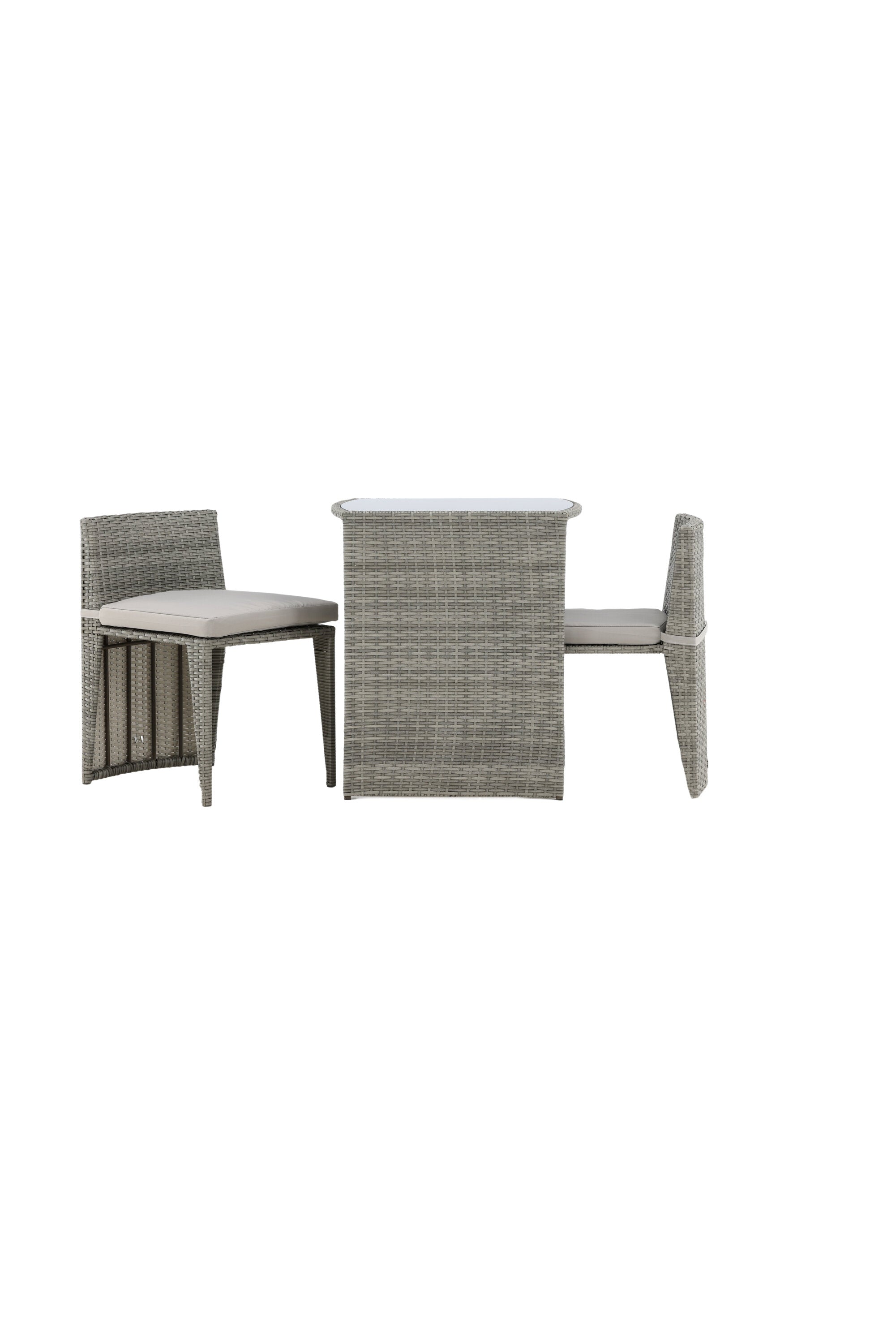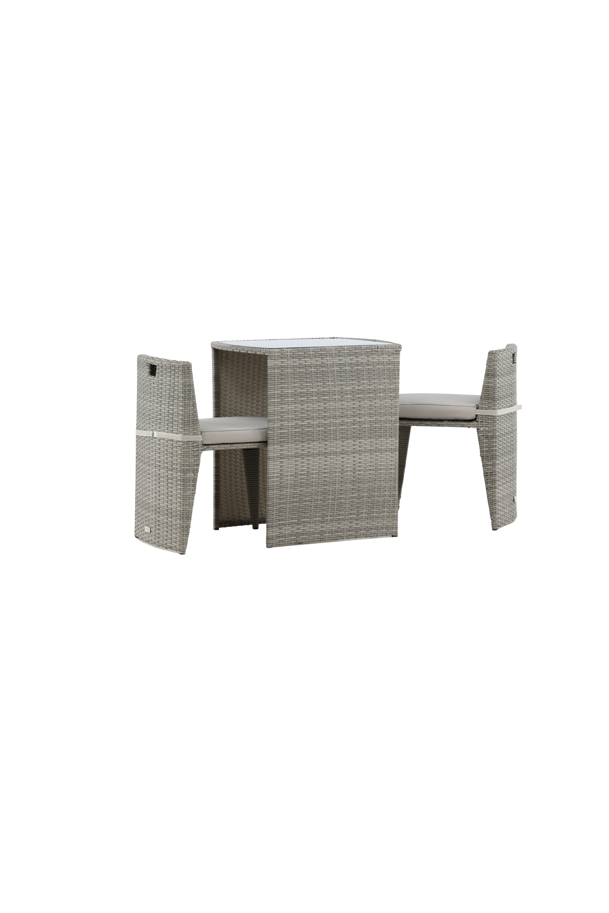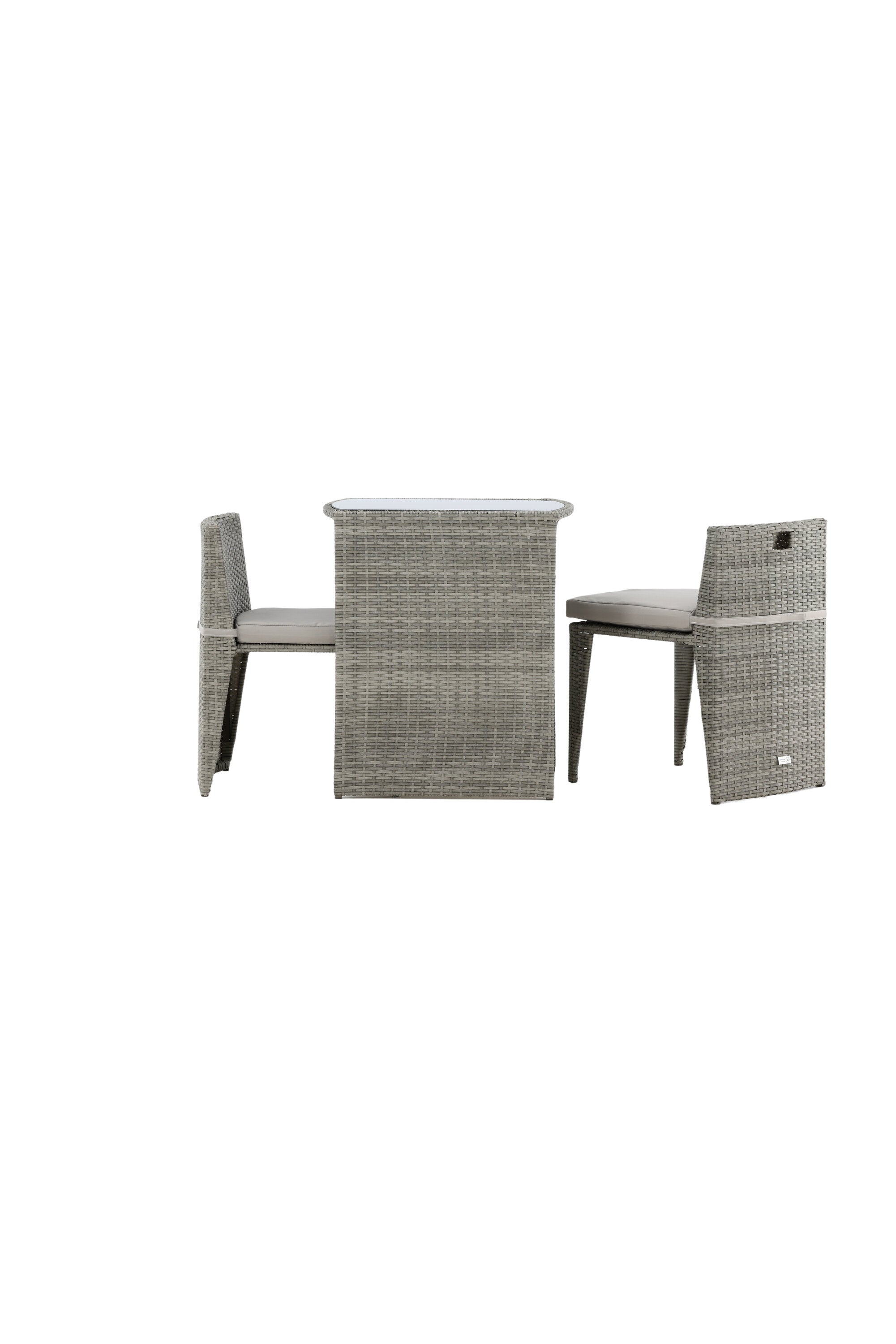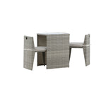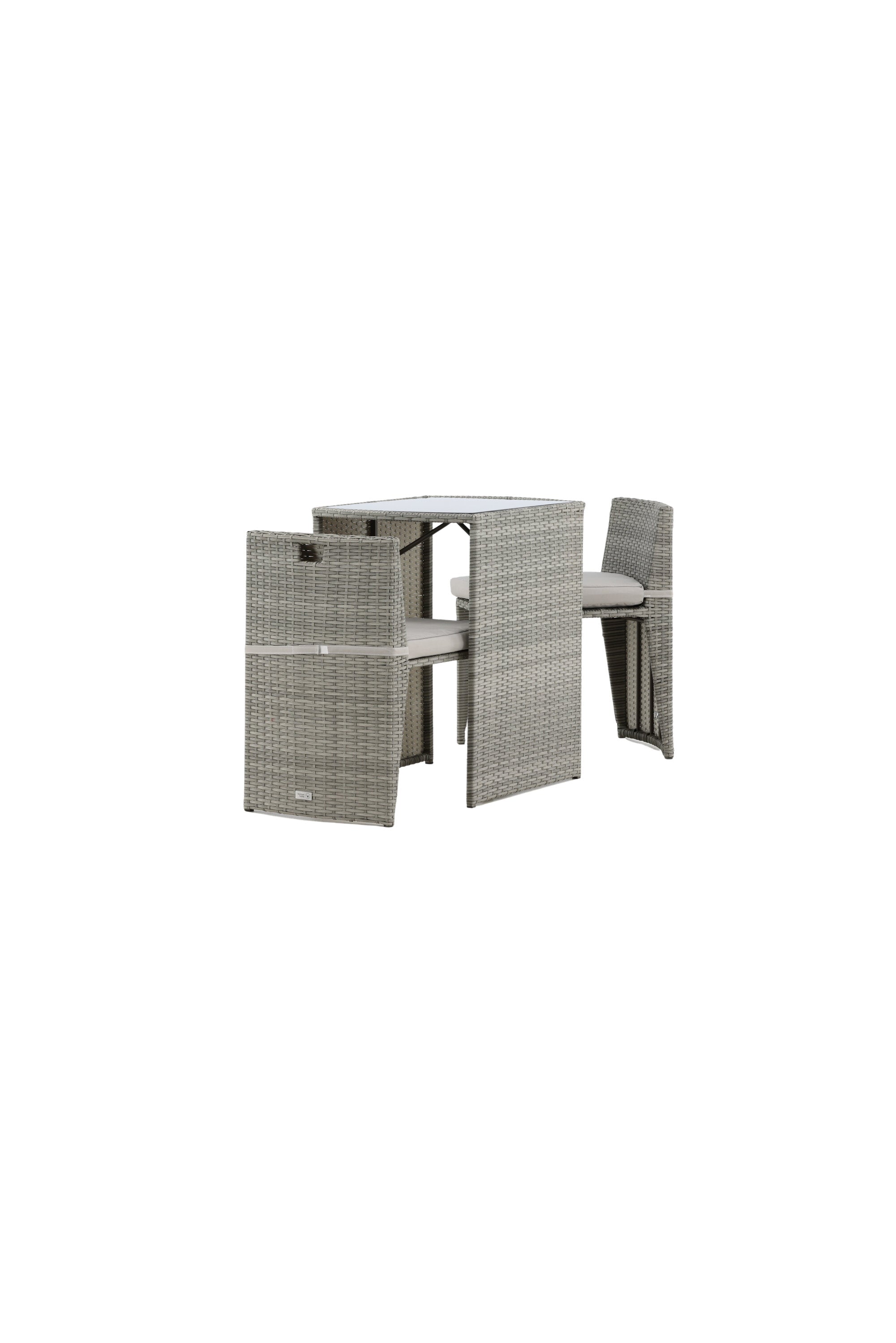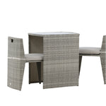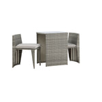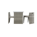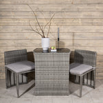 Útulný šedý kavárenský set v hezkém designu vyrobený z odolného umělého ratanu, který se perfektně hodí na menší terasu. Kavárenský set se skládá ze dvou židlí a stolu s přidruženou skleněnou deskou, která zastupuje počasí i vítr, úhledné židle jsou dodávány s měkkými sedáky a židle můžete snadno zasunout pod stůl pro snadné skladování a úsporu místa.