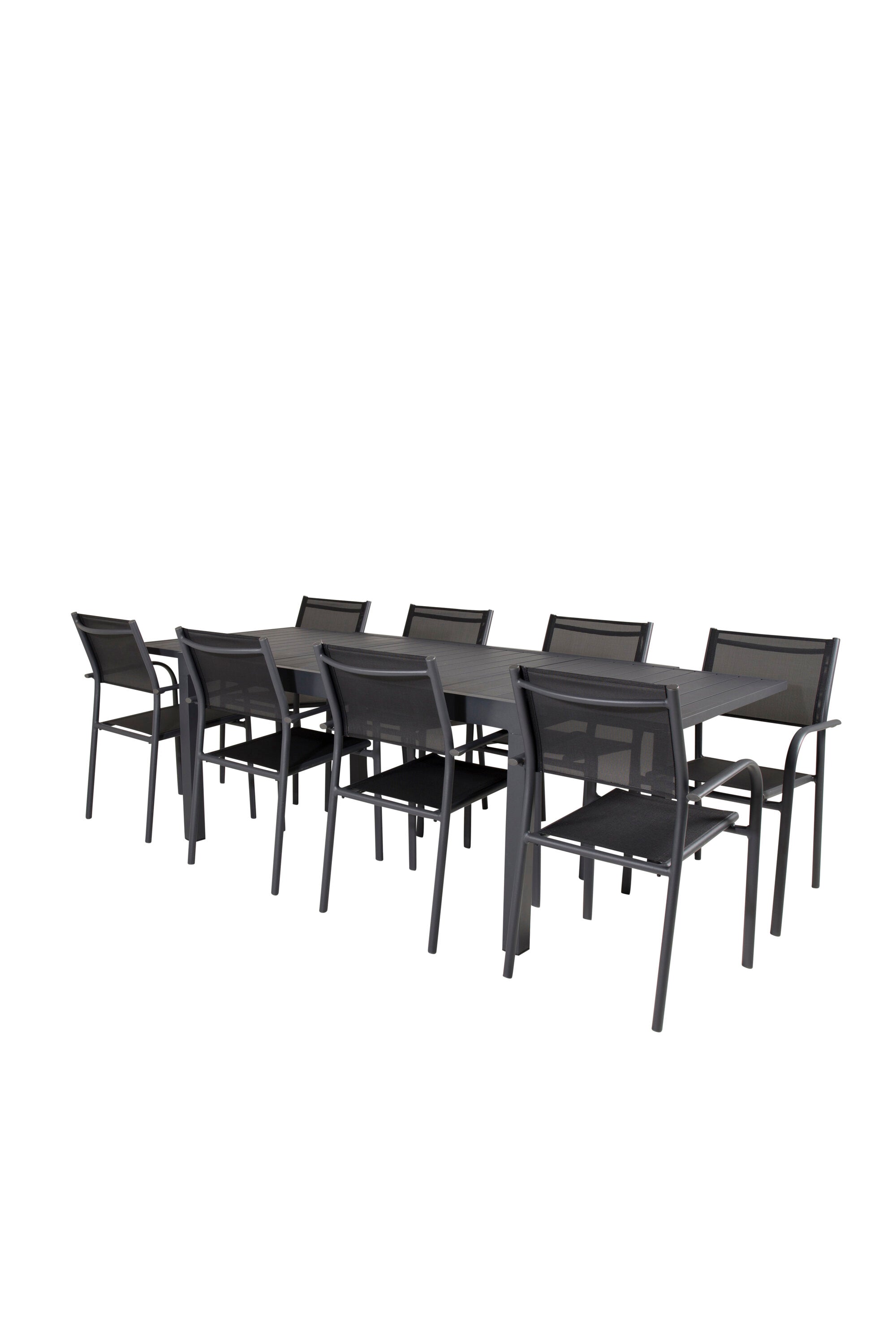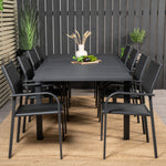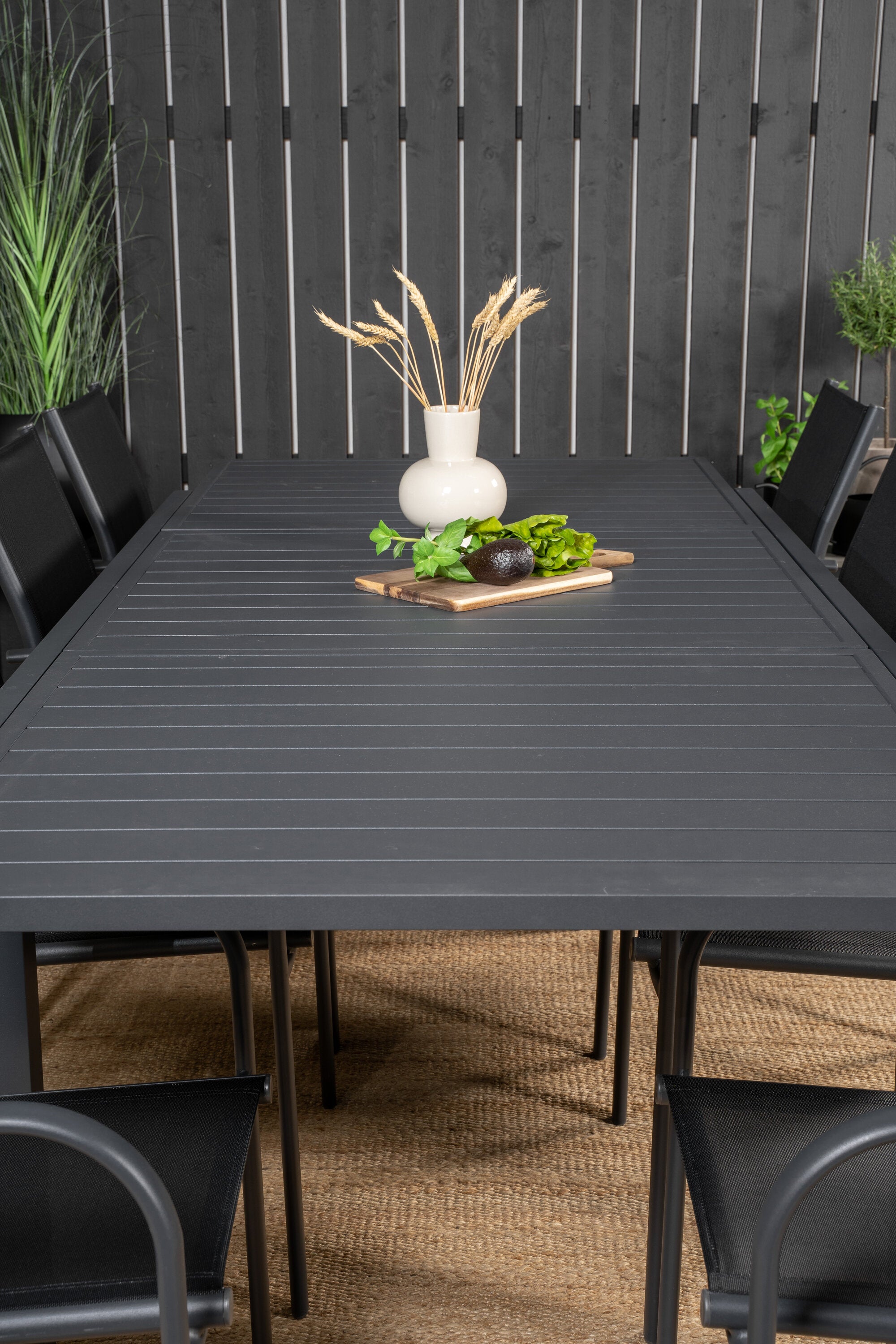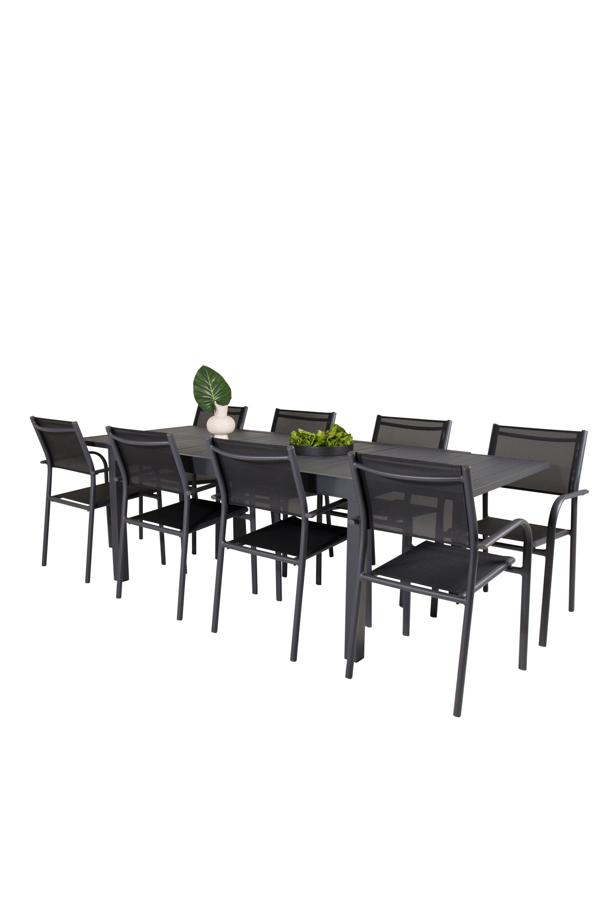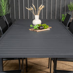 Skupina potravin v celé černé. Zde je náš rozkládací jídelní stůl Marbella kombinován s našimi moderními jídelními židlemi Santorini. Toužíte po venkovní sezóně s námi!