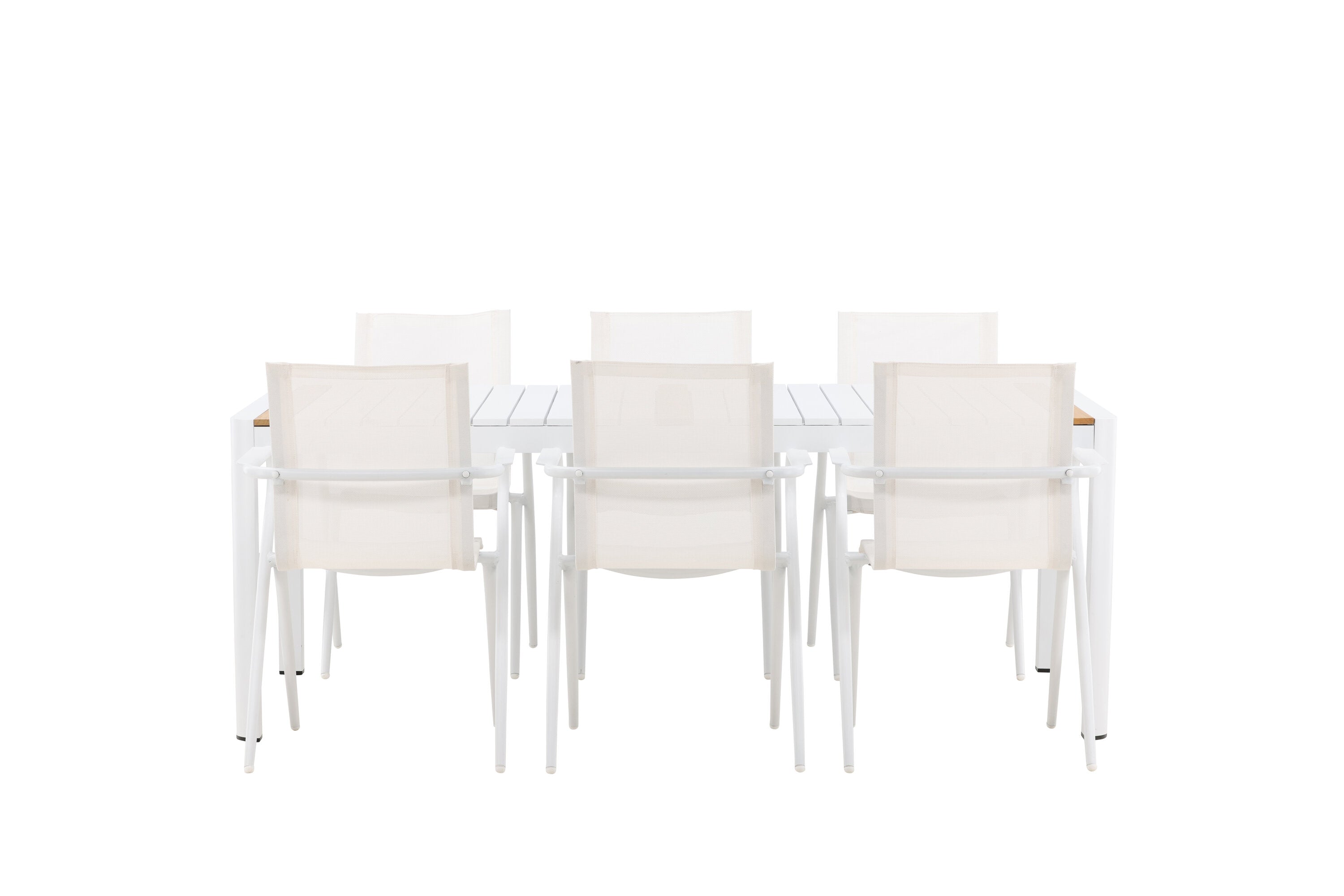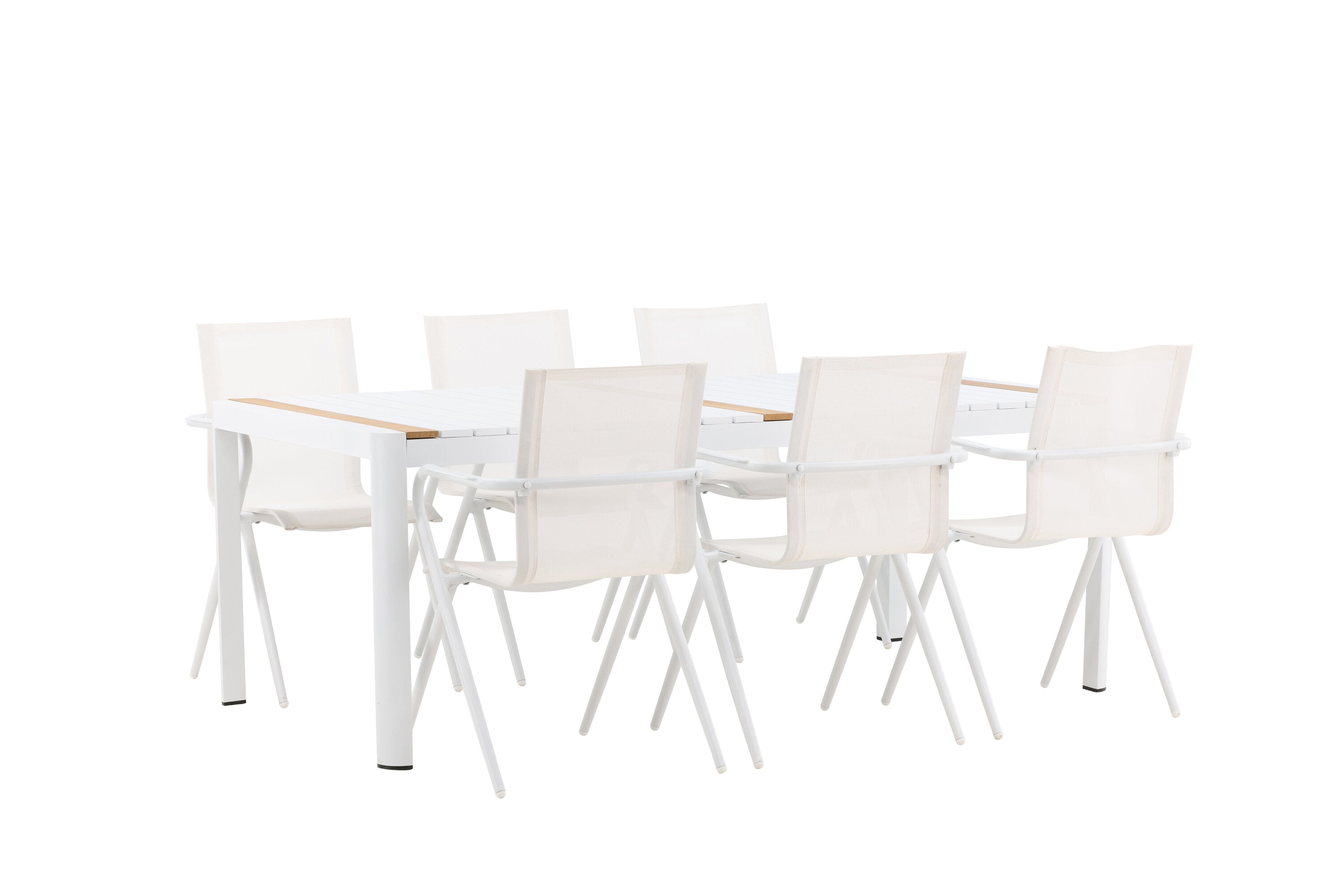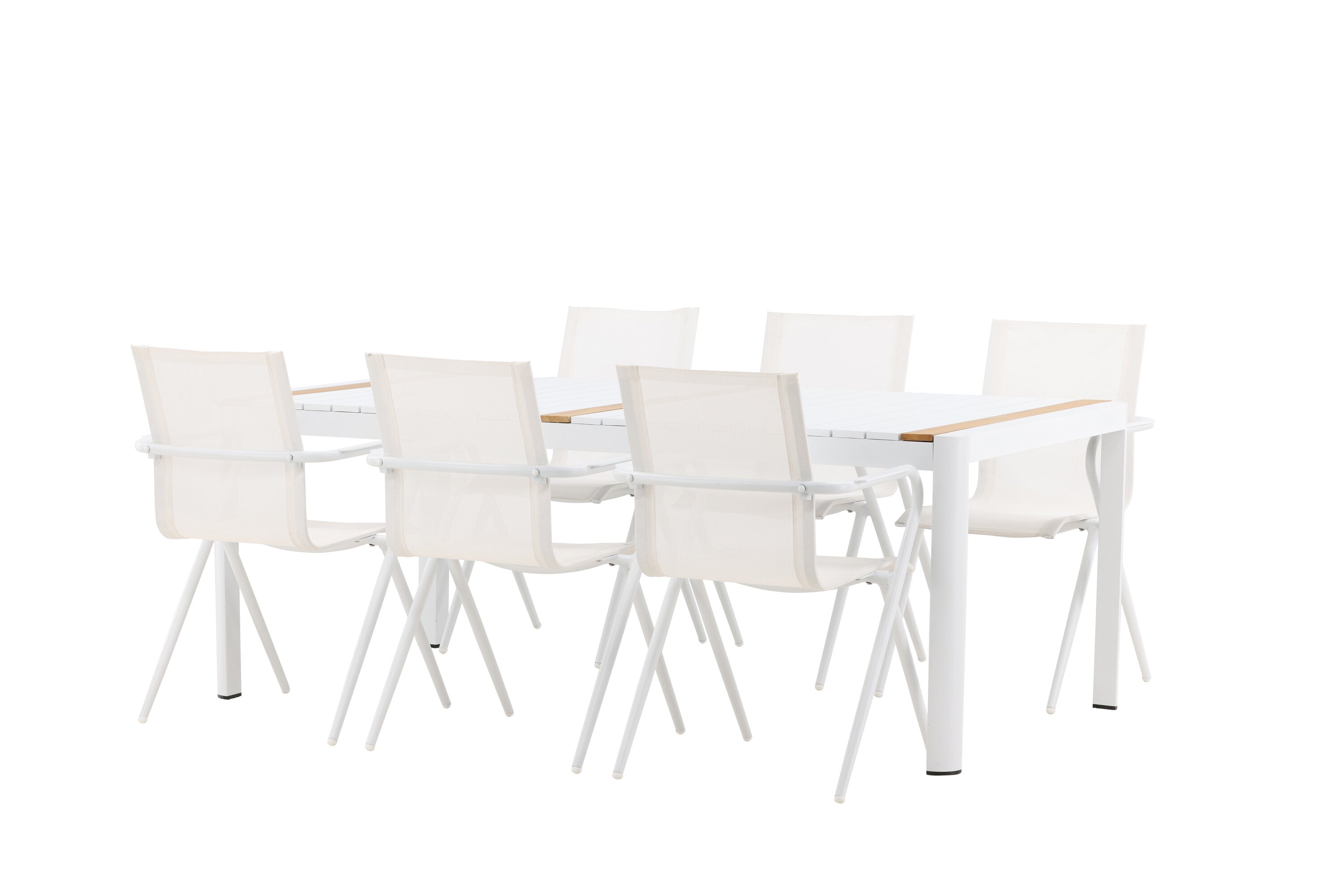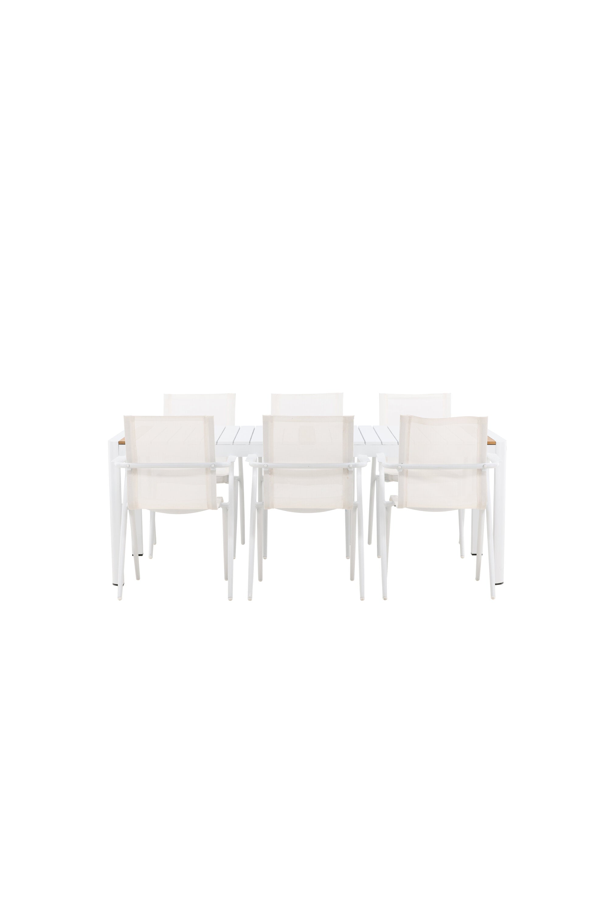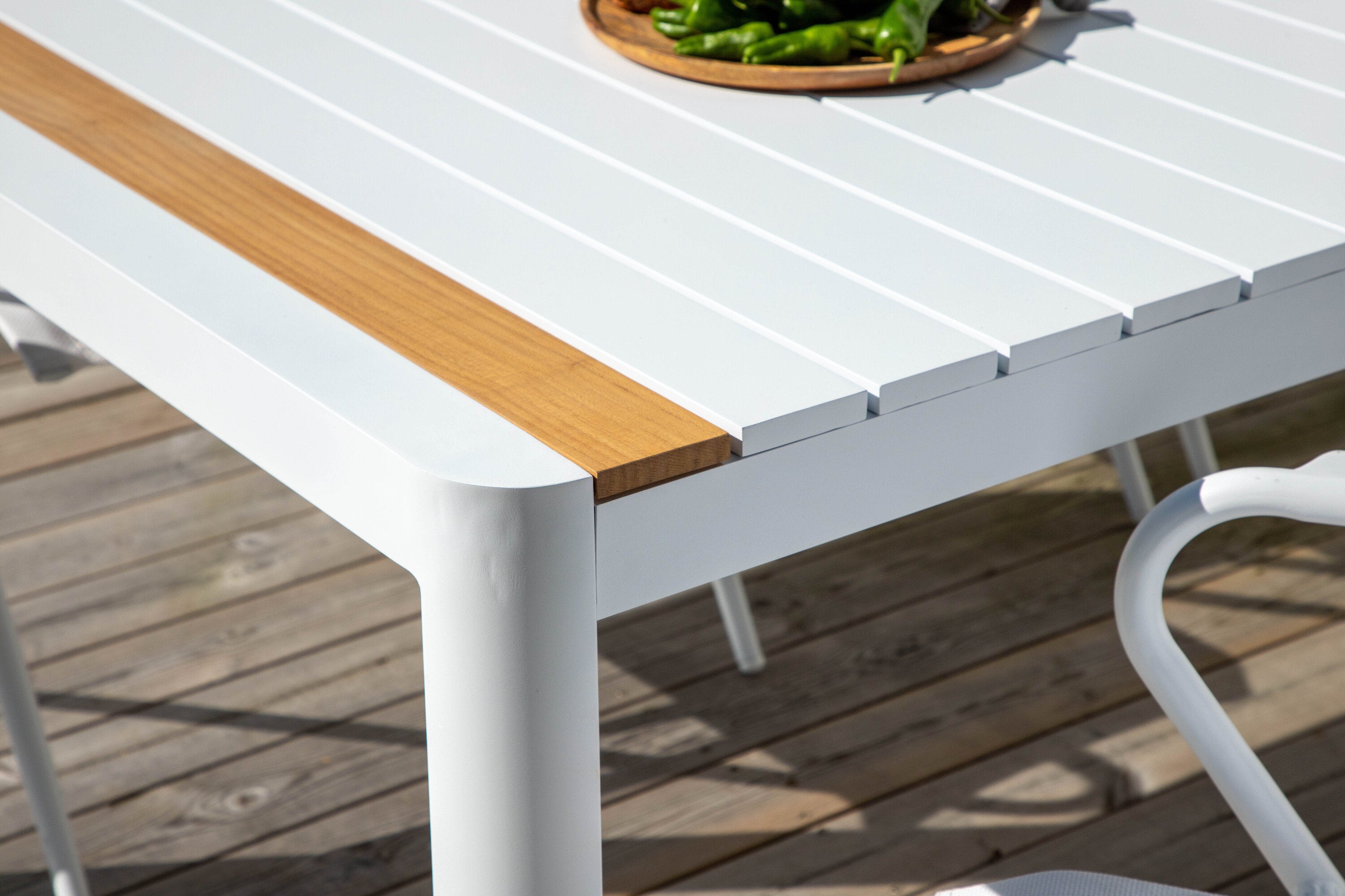 Togo - Jídelní stůl - Bílá / Teak - Allu / Teak - 200*100 _1+ Jídelní židle Alina - bílá Alu / Bílá textilie _6