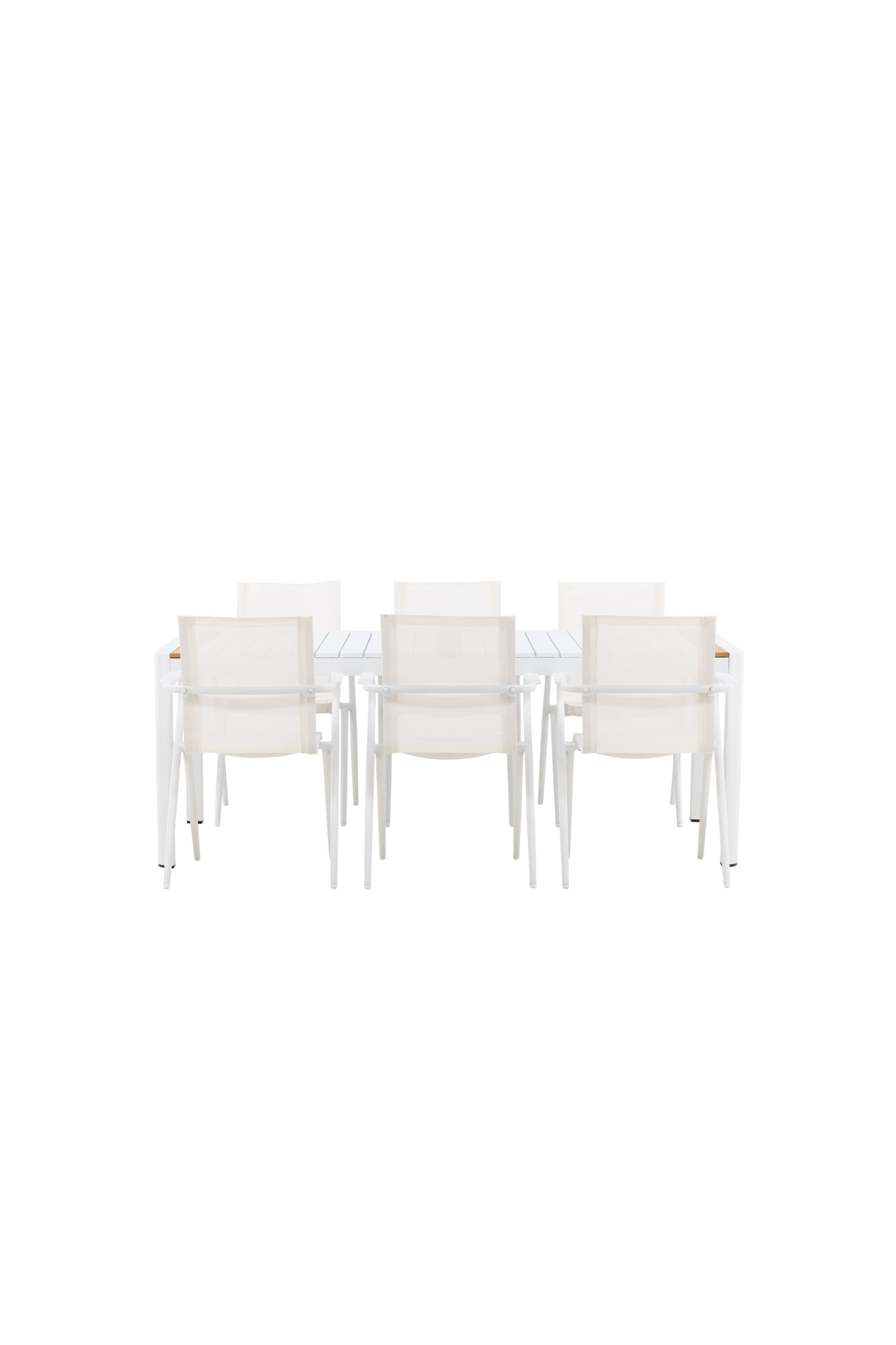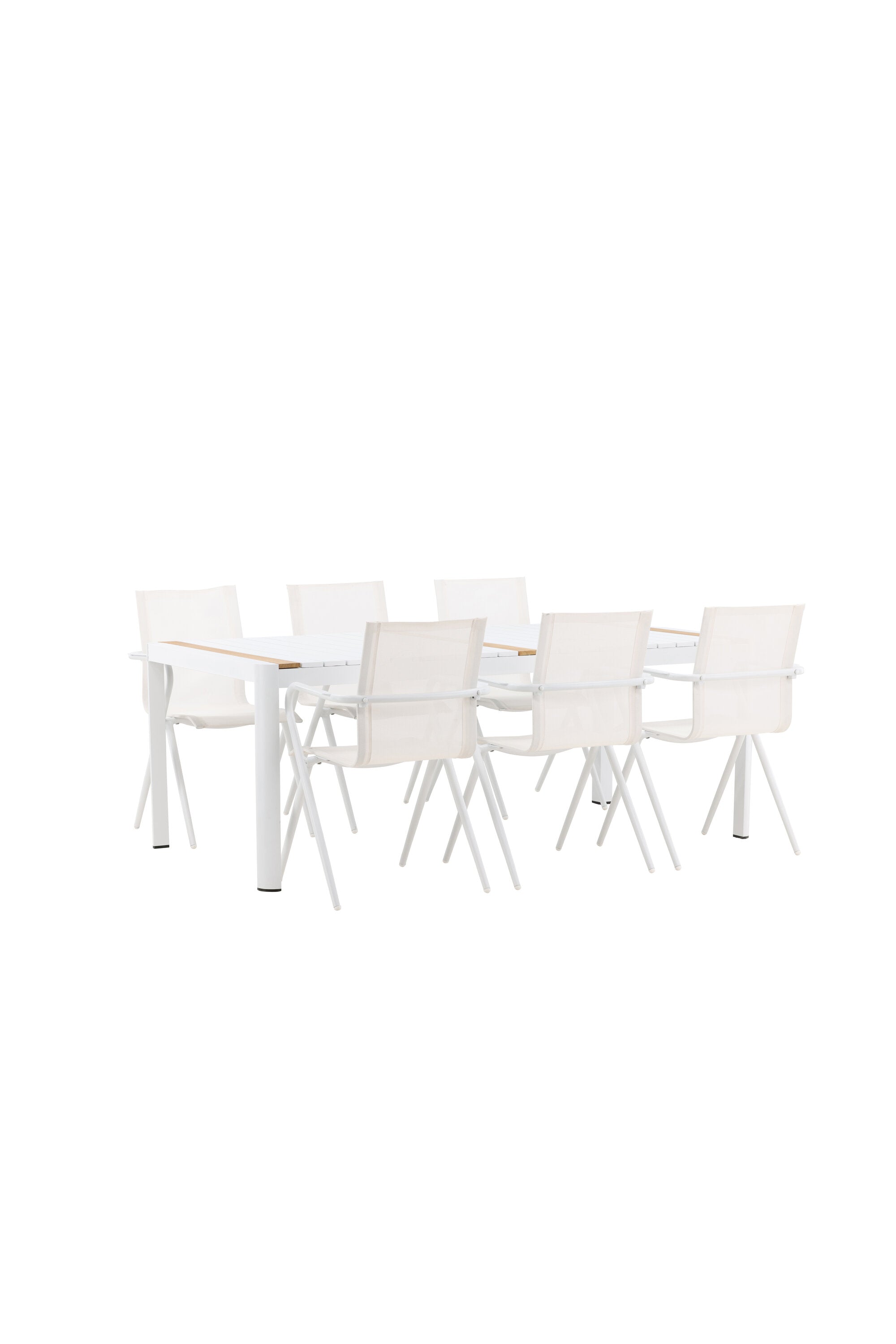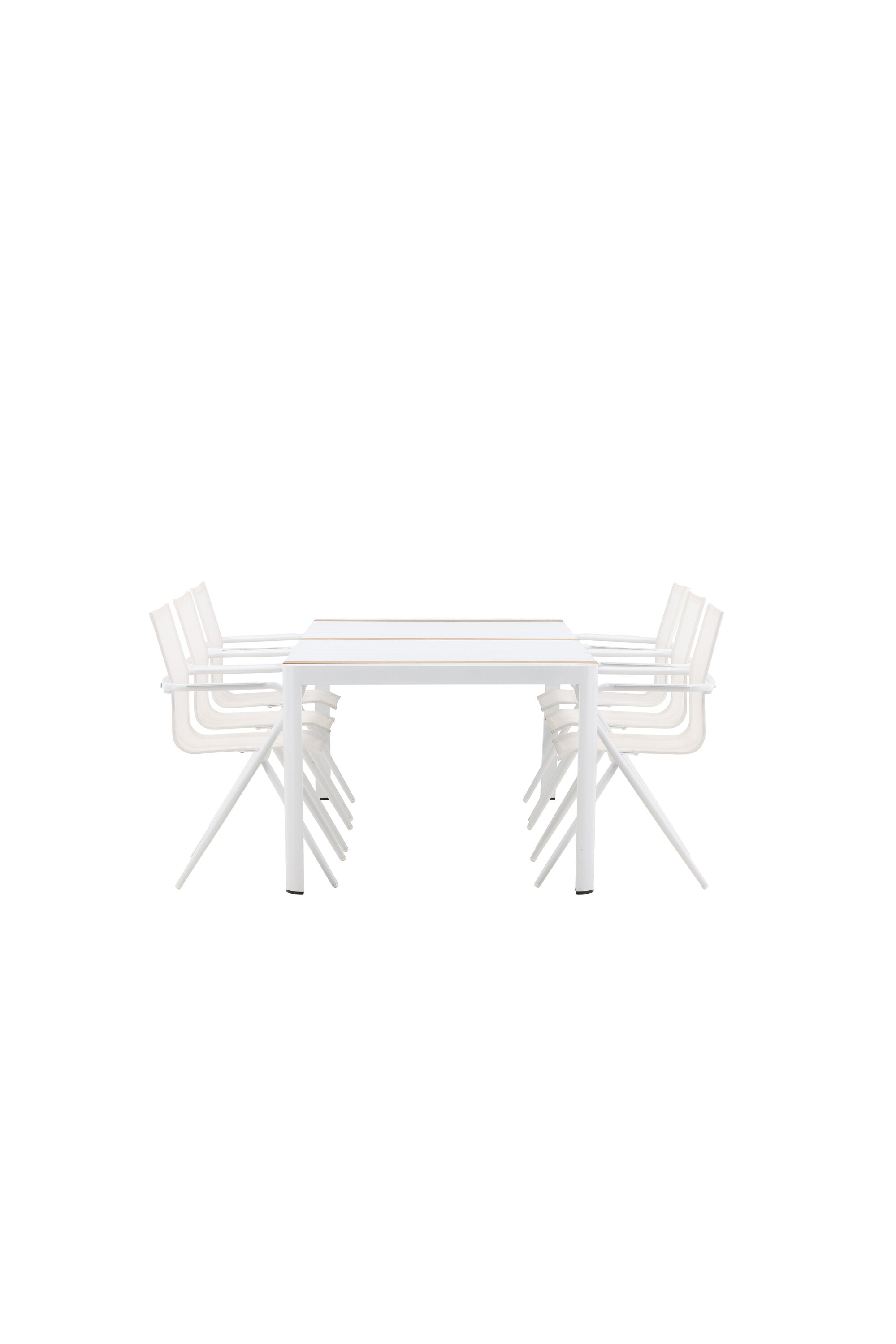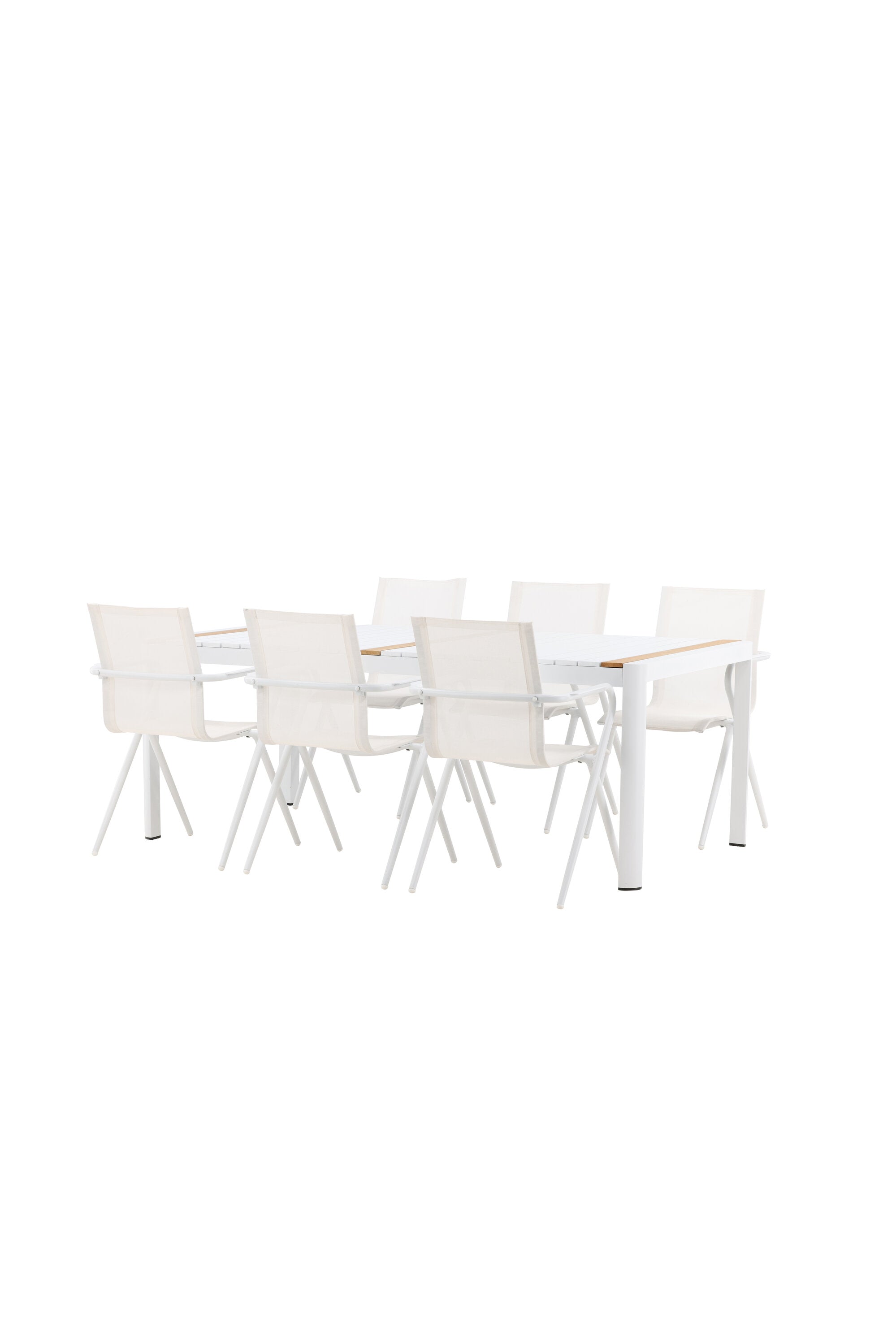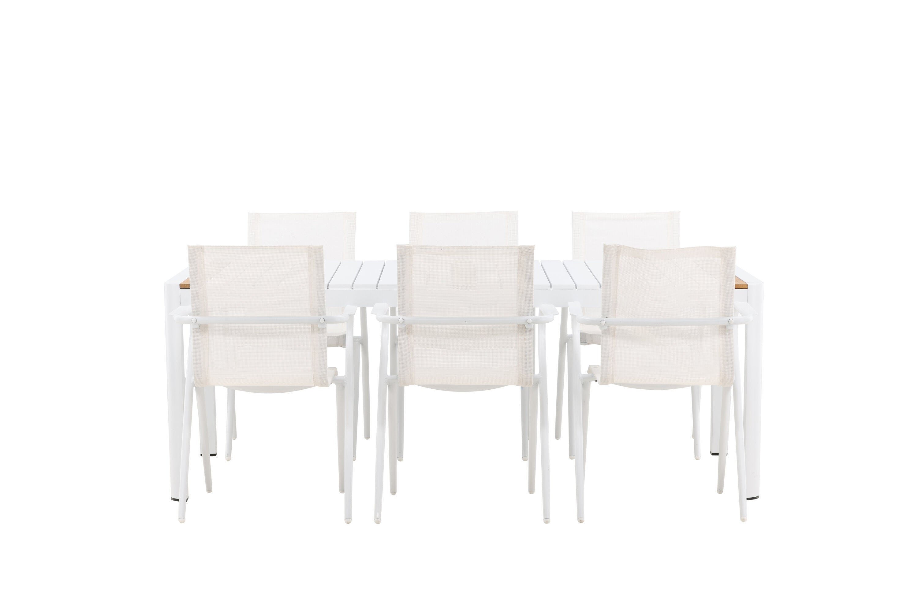 Togo - Jídelní stůl - Bílá / Teak - Allu / Teak - 200*100 _1+ Jídelní židle Alina - bílá Alu / Bílá textilie _6
