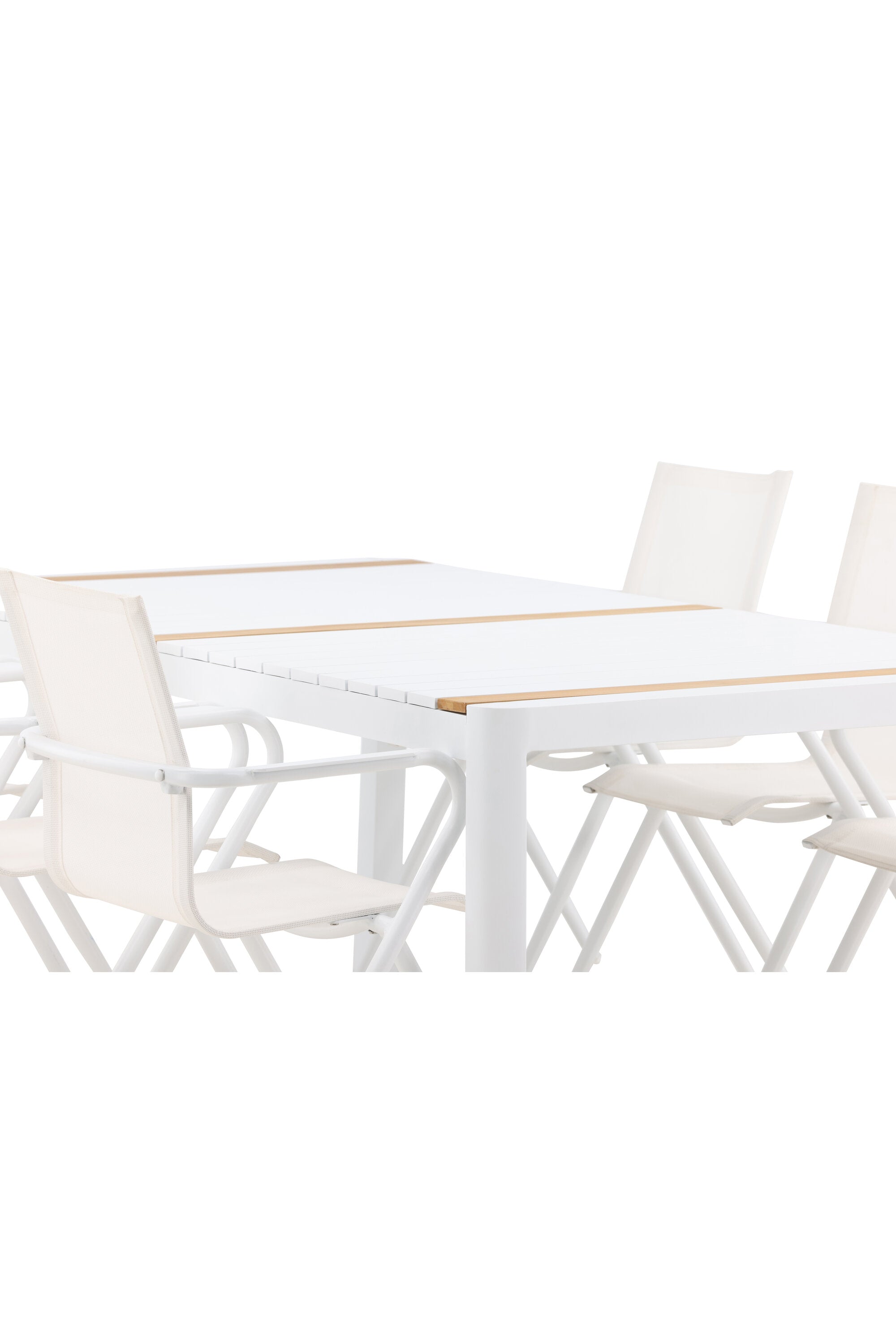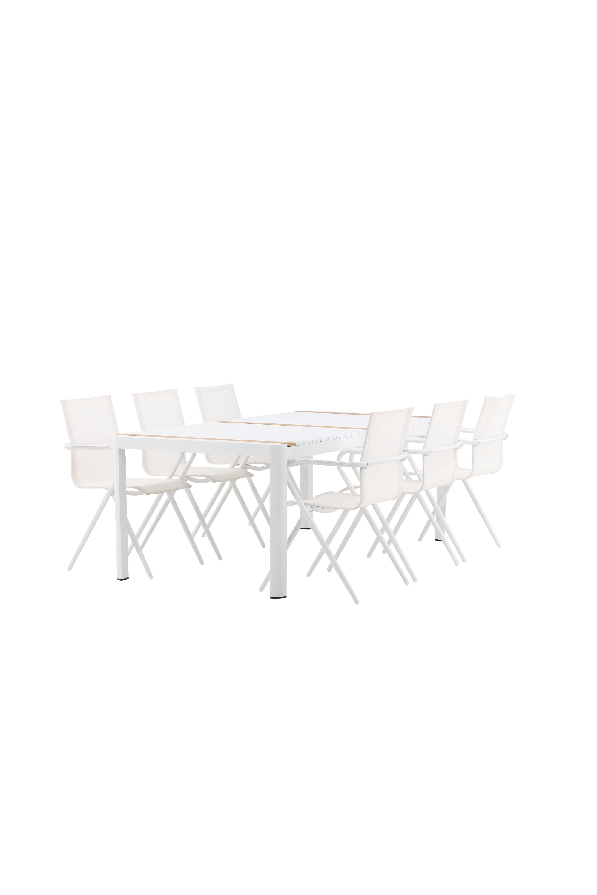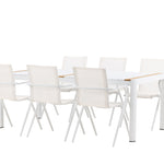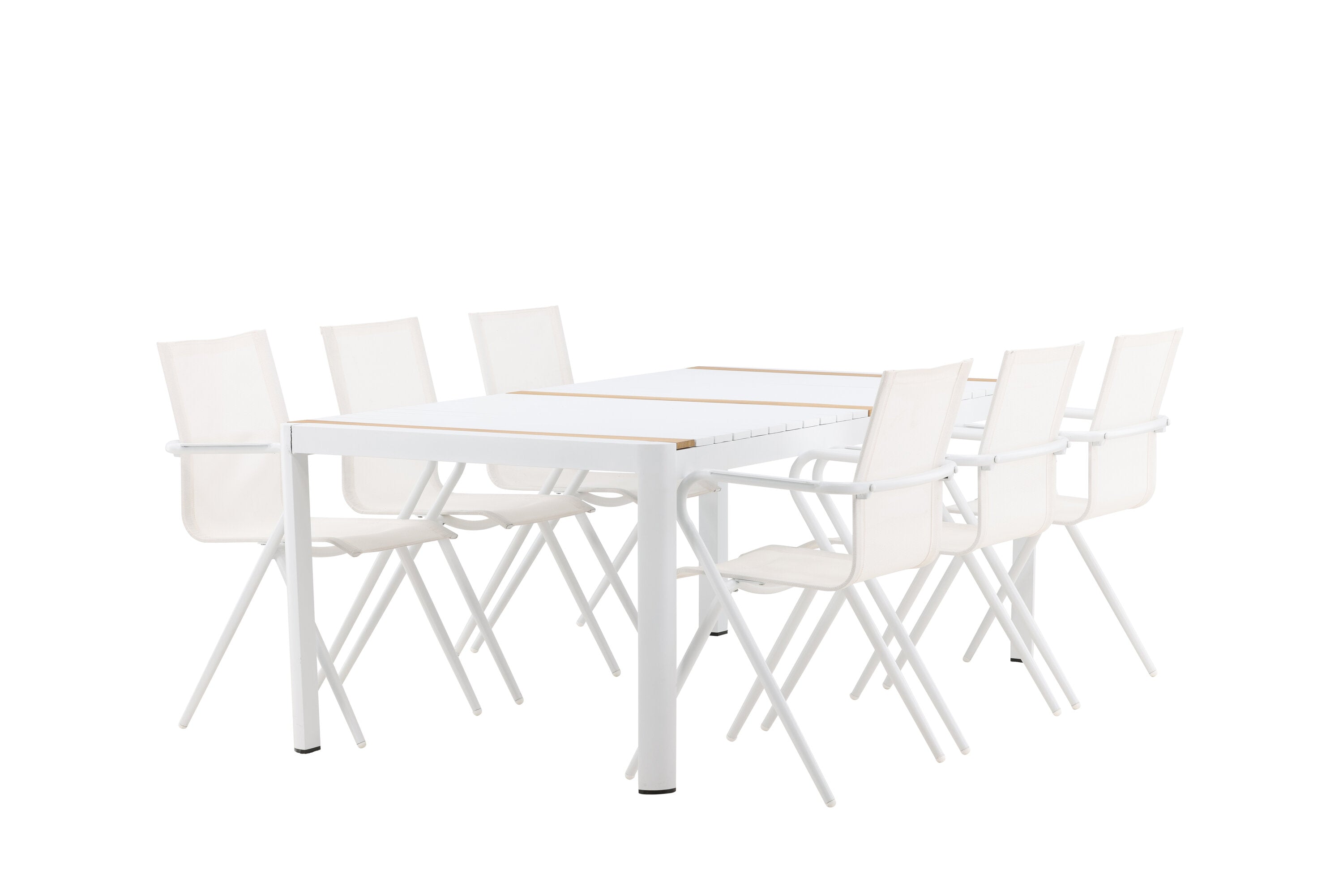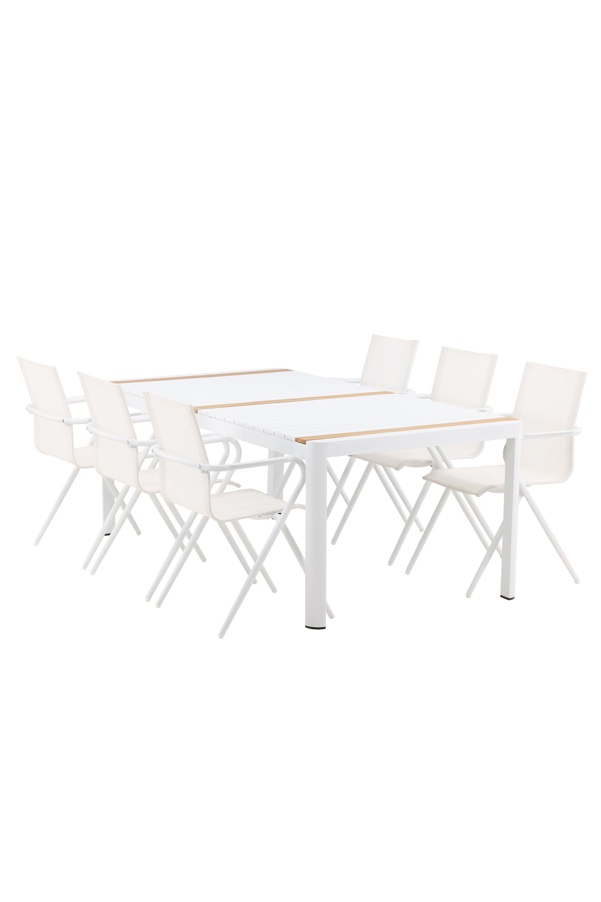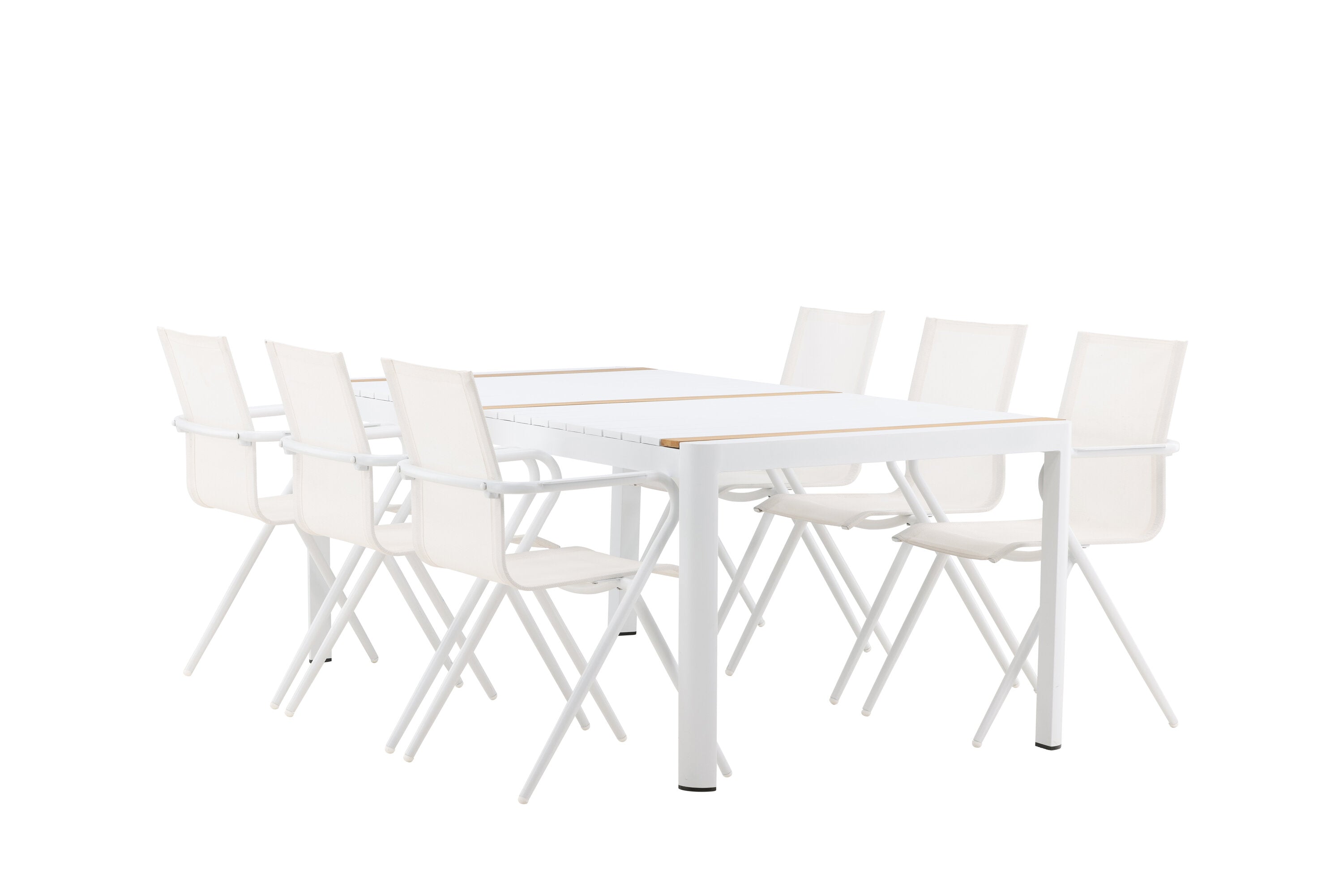 Togo - Jídelní stůl - Bílá / Teak - Allu / Teak - 200*100 _1+ Jídelní židle Alina - bílá Alu / Bílá textilie _6