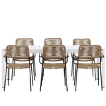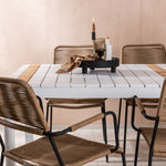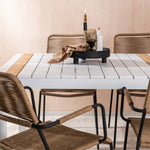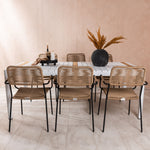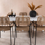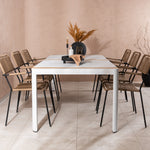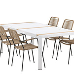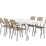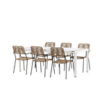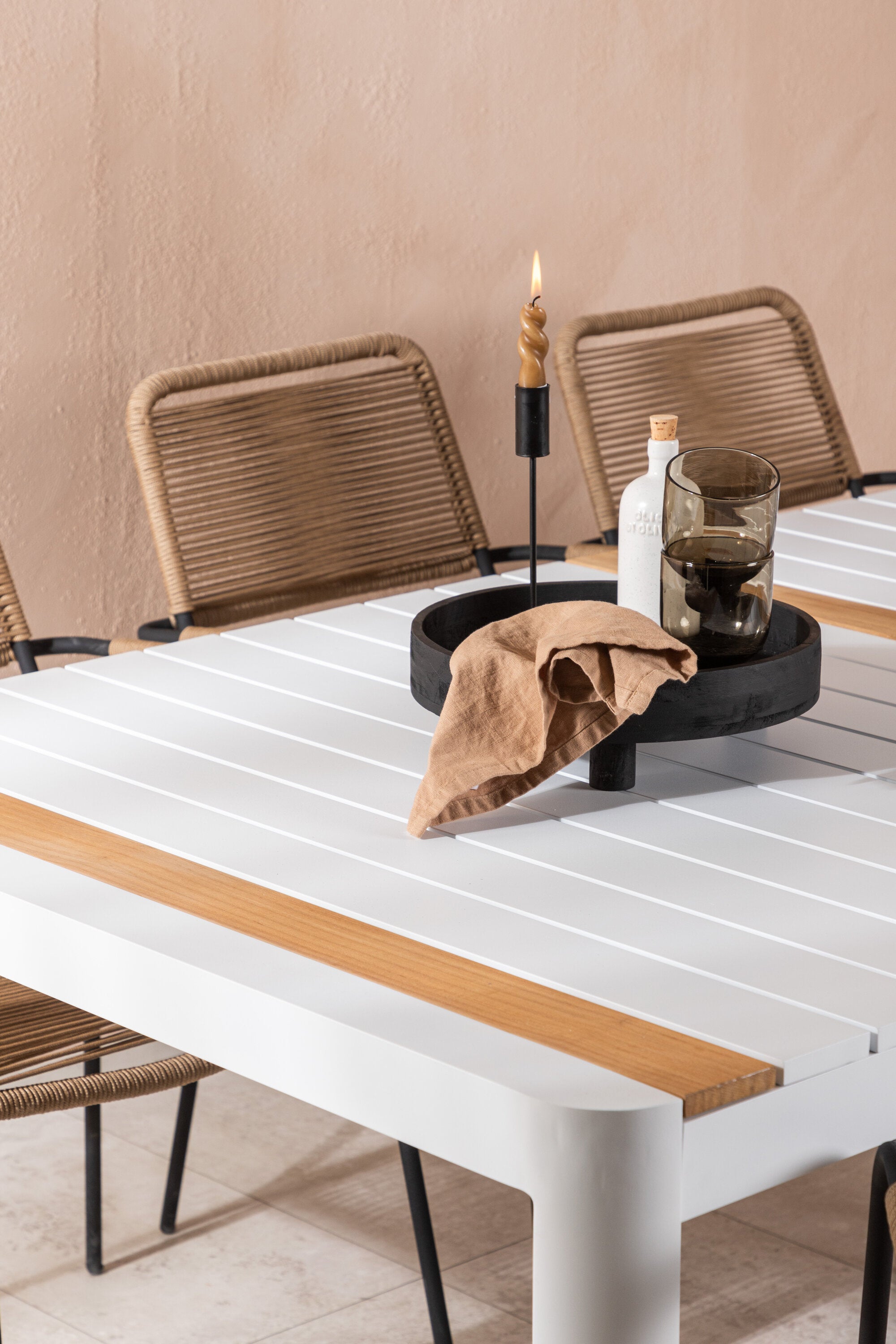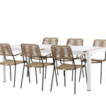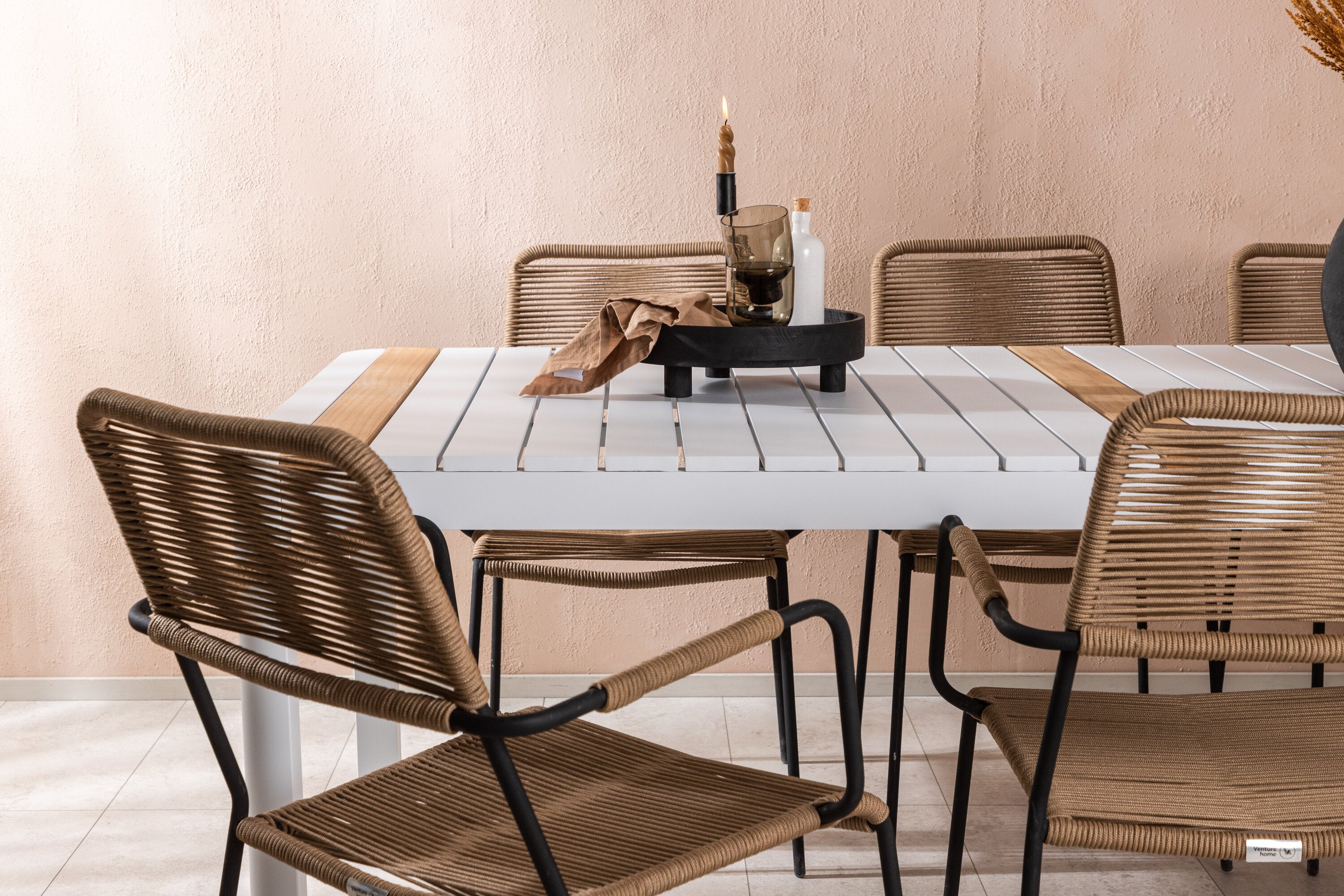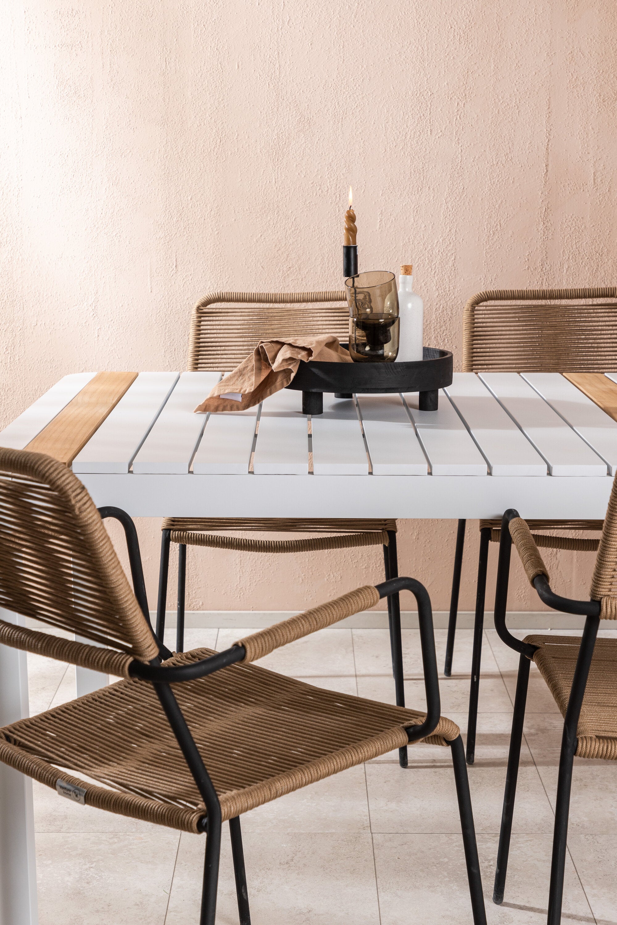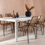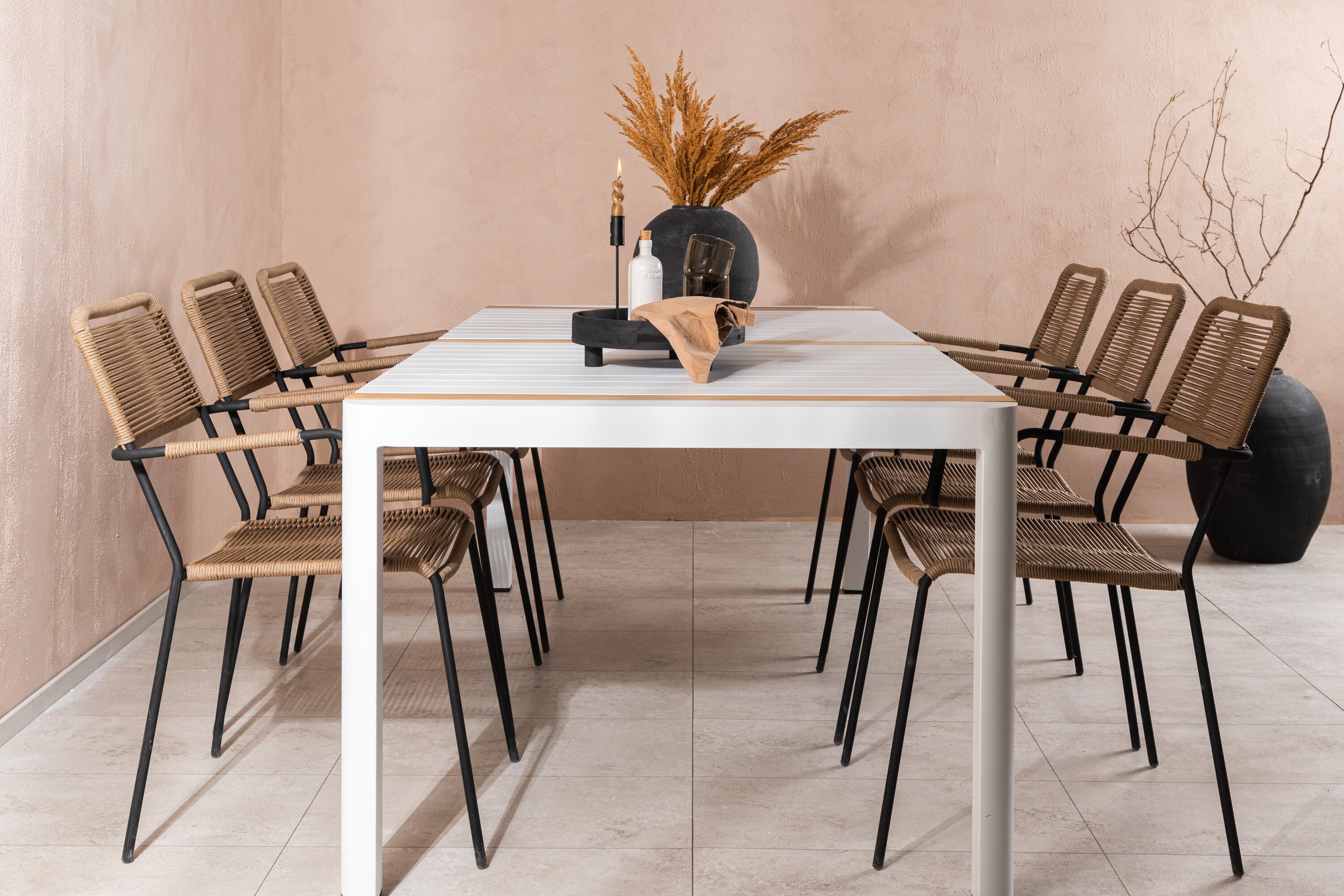 Vytvořte trendový – bezpečný poutač, který zaujme – tato skupina potravin je poutavá i trvanlivá! Jídelní stůl Togo má vkusnou verzi s obdélníkovou deskou stolu v bílé a teakové barvě dřeva a bílým hliníkovým podvozkem. Rozměry: 200x100. Zde v moderní kombinaci s jídelními židlemi v barvě latte ze série Lindos. Židle mají stylové úzké nohy a integrované područky z černého hliníku a sedák z odolného béžového provazu. Zemitá barva působí na nábytek hřejivým dojmem. Pozvěte dopředu na mnoho příjemných jídel!
