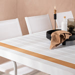 Vybavte si terasu lákavě a okouzlující skupinou jídel, která křičí luxusem! Jídelní stůl Togo má vkusnou verzi s obdélníkovou deskou stolu v bílé a teakové barvě dřeva a bílým hliníkovým podvozkem. Rozměry: 200x100. Zde v kombinaci Smaster s pěknými jídelními židlemi ze série Santorini. Židle mají rovné severské tvary s integrovanými područkami z hliníku a sedákem z bílého textilu. Jsou také stohovatelné pro praktické skladování. Užijte si toto léto jídlo venku!