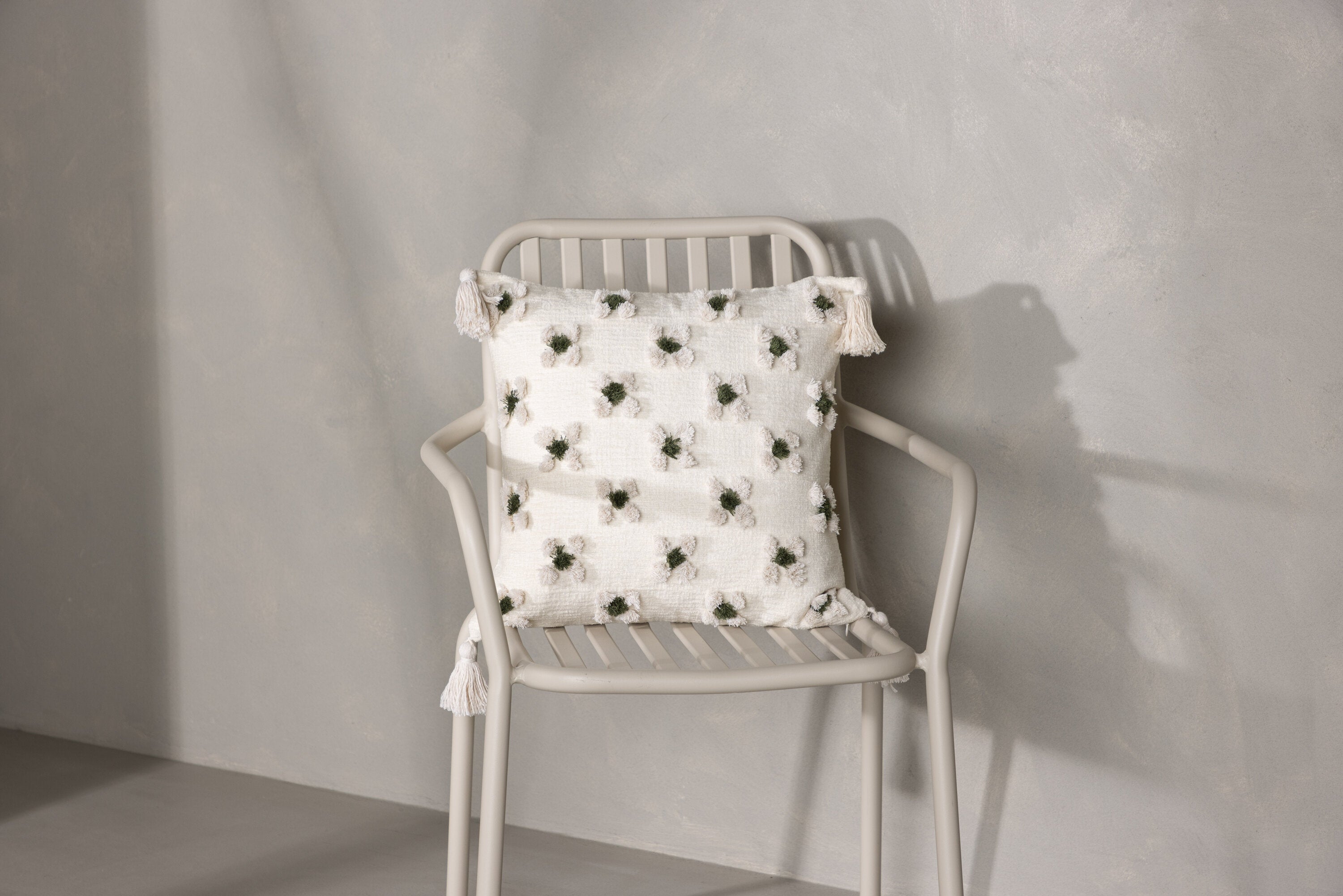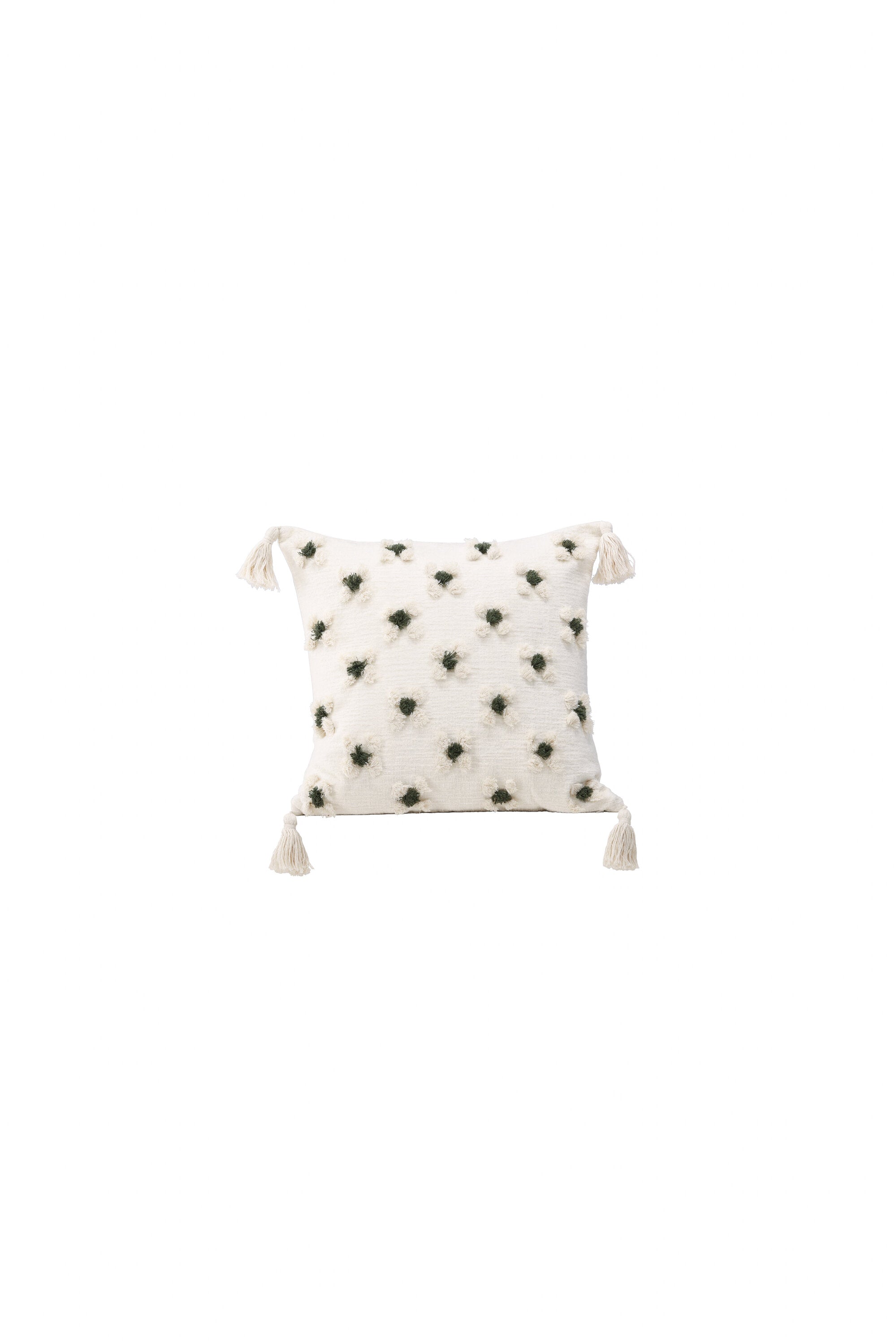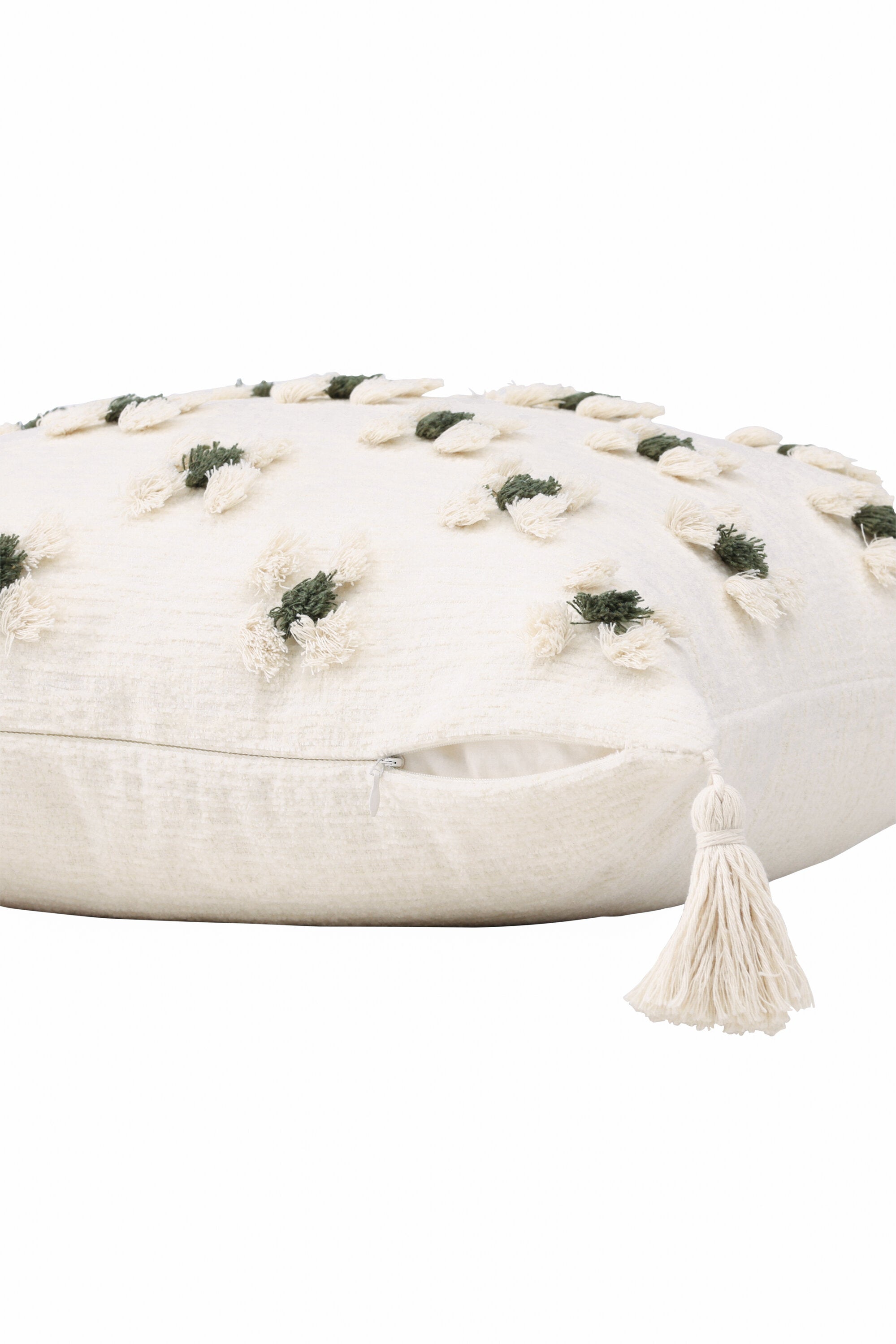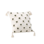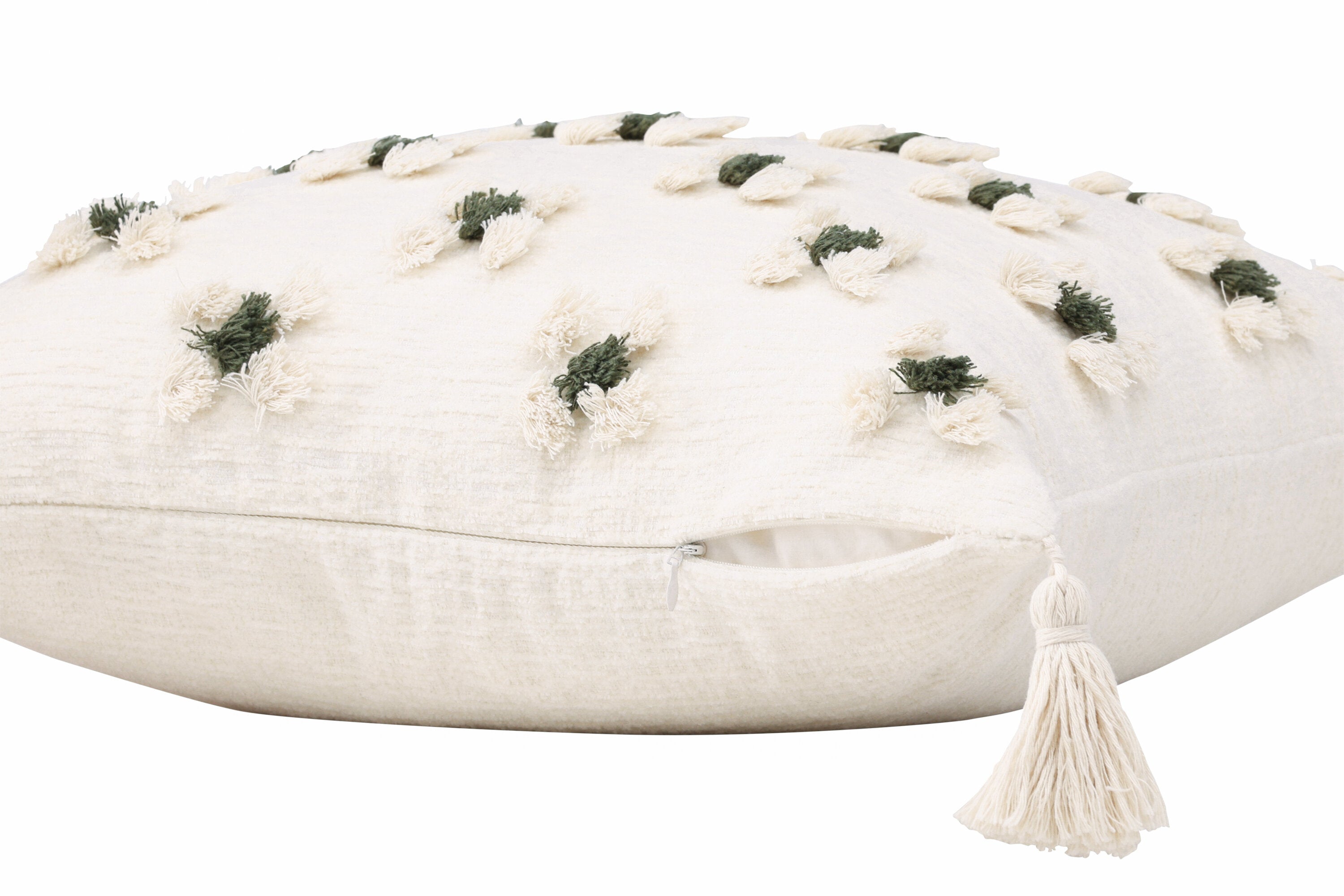 Ozdobte svou pohovku nebo křeslo stylovým polštářem z řady Millie v líbivém designu! Tento čtvercový povlak na polštář v základní bílé barvě má okouzlující květinový vzor z tuftované zelené a bílé látky, který polštáři dodává příjemnou strukturu. Bílé střapce v každém rohu dodávají polštáři nostalgický vzhled a ve spodní části je skrytý zip. Látka je z polychenilu, který přispívá k vkusné a odolné struktuře. Zútulněte atmosféru ve svém pokoji pomocí příjemných polštářků!