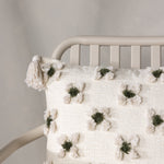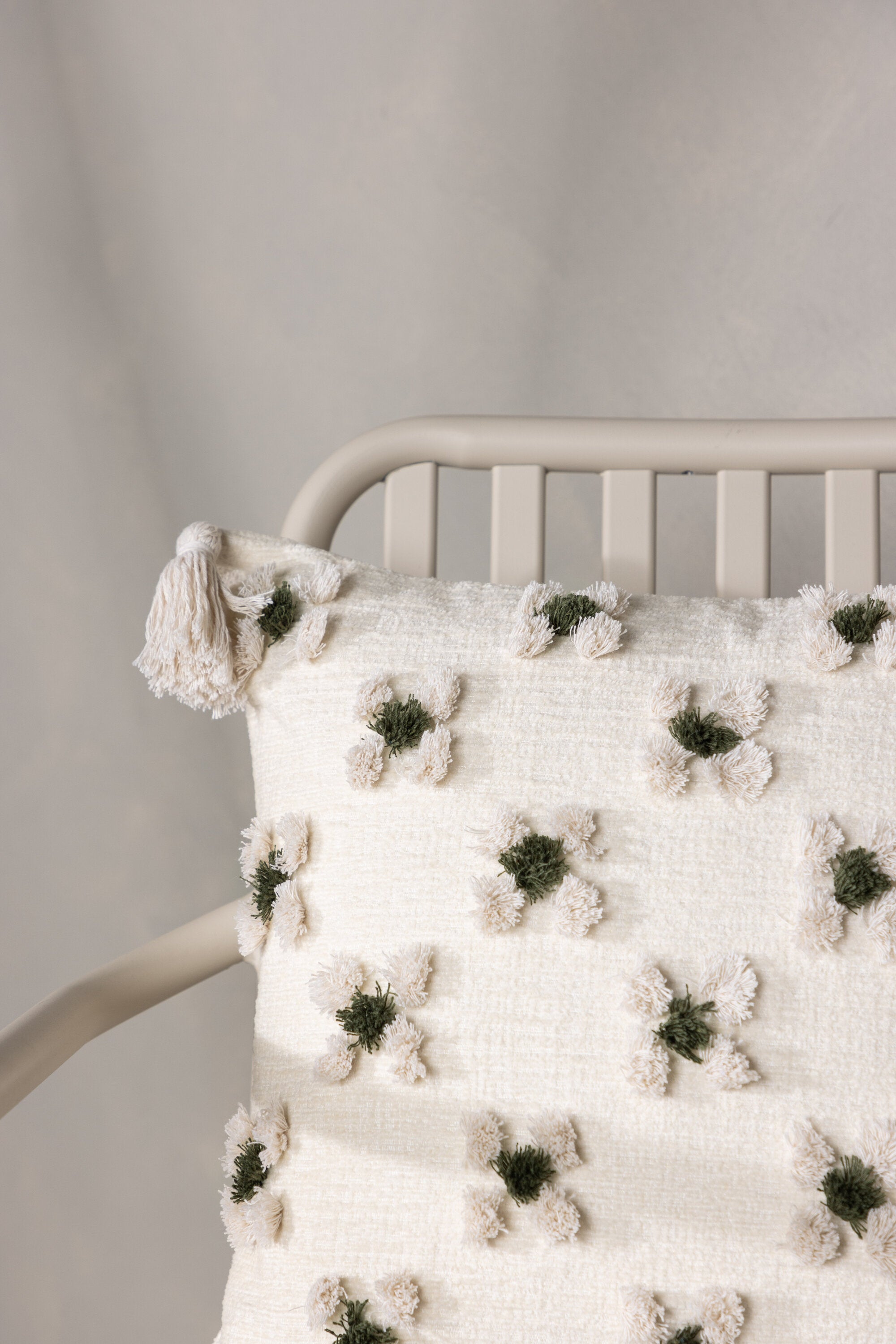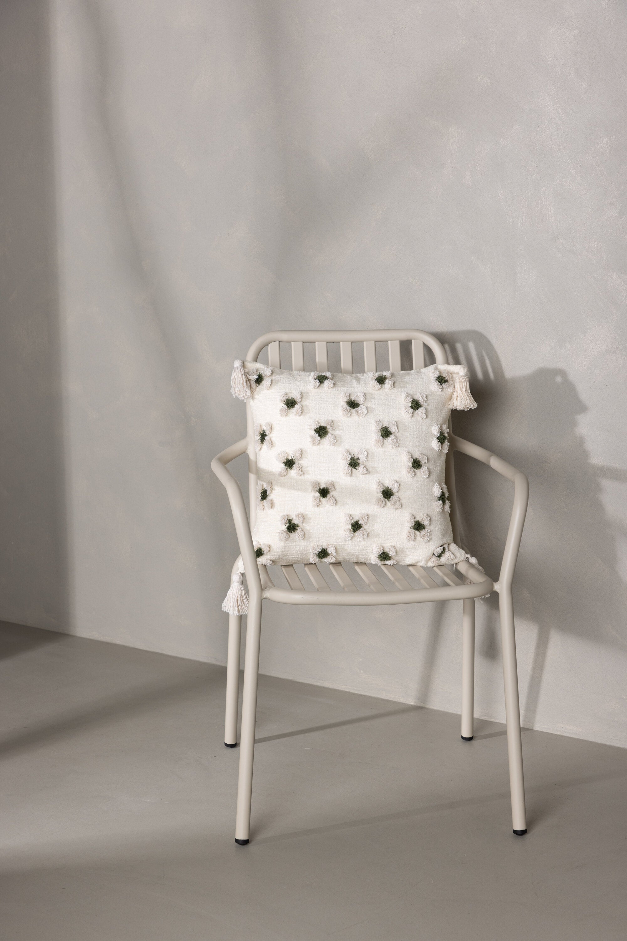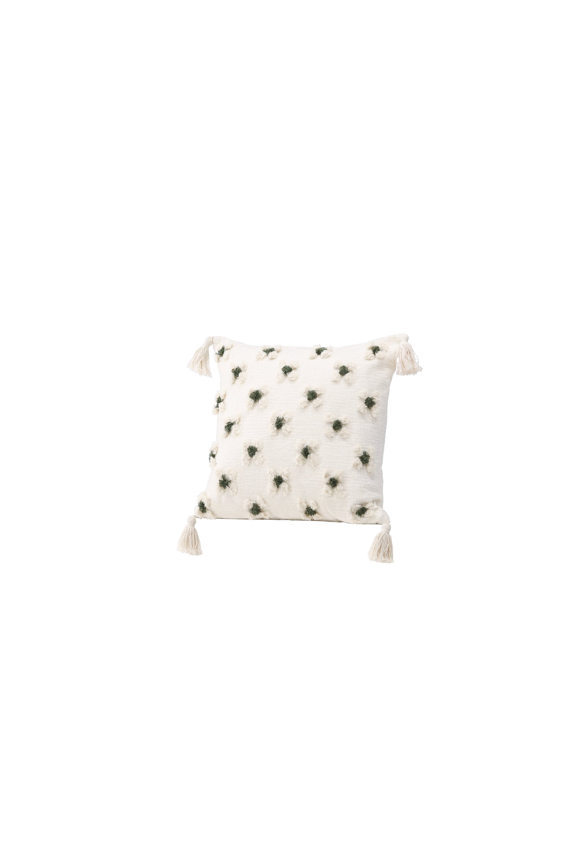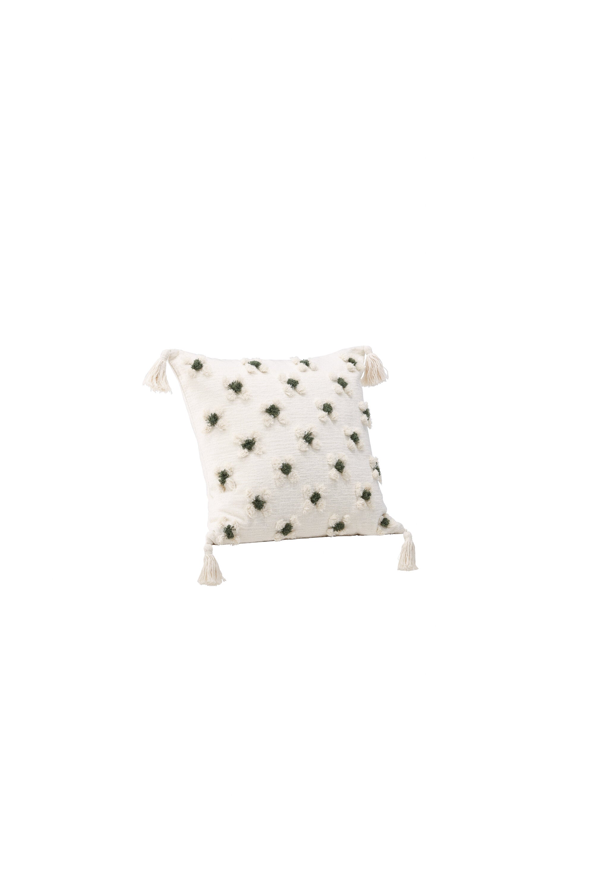 Ozdobte svou pohovku nebo křeslo stylovým polštářem z řady Millie v líbivém designu! Tento čtvercový povlak na polštář v základní bílé barvě má okouzlující květinový vzor z tuftované zelené a bílé látky, který polštáři dodává příjemnou strukturu. Bílé střapce v každém rohu dodávají polštáři nostalgický vzhled a ve spodní části je skrytý zip. Látka je z polychenilu, který přispívá k vkusné a odolné struktuře. Zútulněte atmosféru ve svém pokoji pomocí příjemných polštářků!