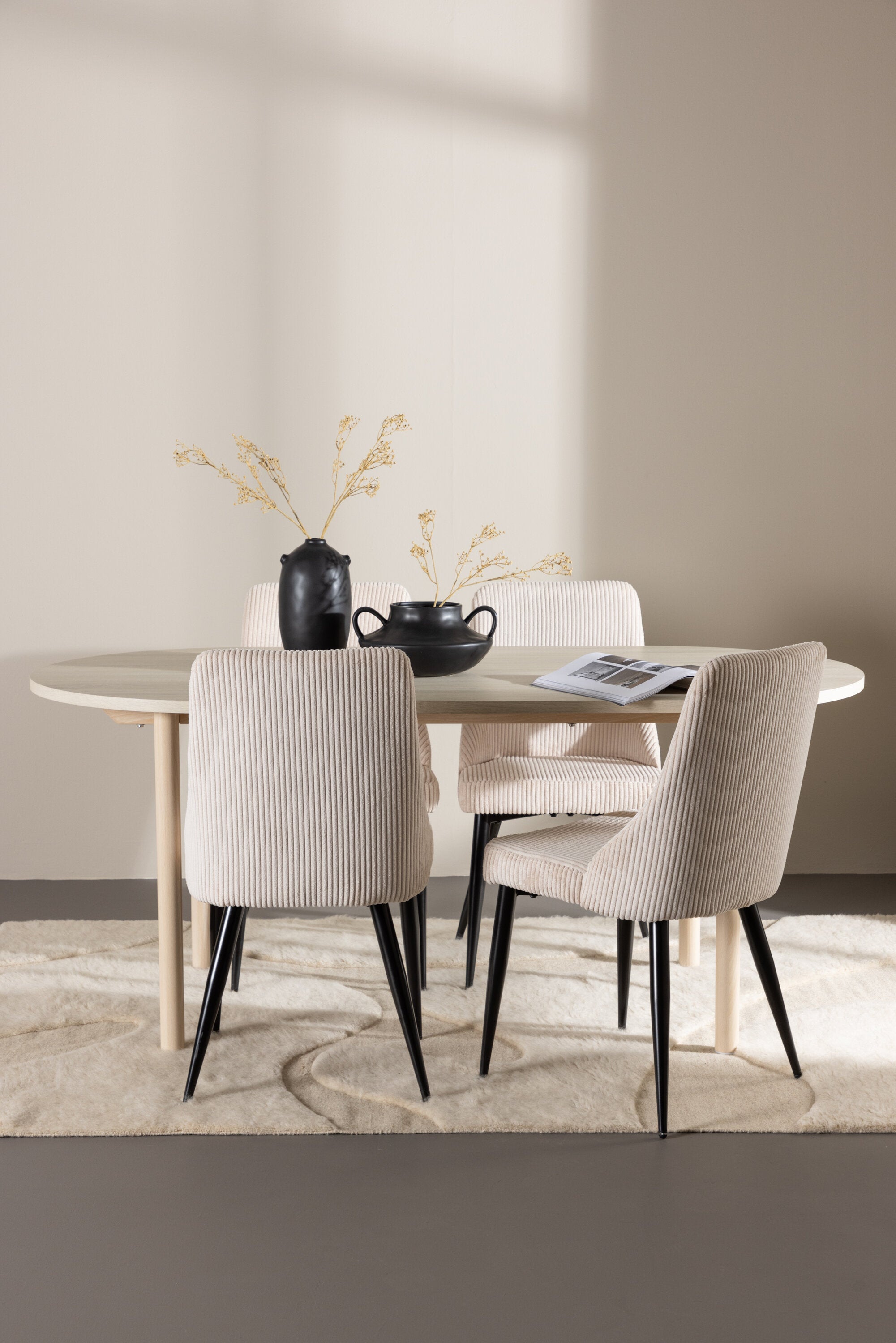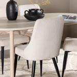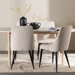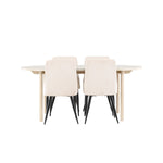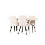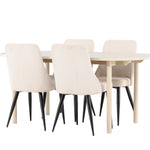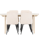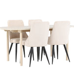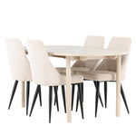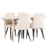 Jídelní židle Leone a jídelní stůl Andy dohromady tvoří perfektní jídelní set, který kombinuje styl a pohodlí elegantním způsobem. Židle má certifikaci FSC® (FSC®C177288), což znamená, že se skládá ze dřeva z odpovědného lesnictví, lesnictví, které bere ohled na lidi a životní prostředí. Leone je vyroben z měkkého sametu s ocelovými nohami a nabízí dokonalou rovnováhu mezi funkcí a estetikou. Jemná béžová barva působí hřejivě a příjemně a díky jednoduchému designu je židle všestranná a vhodná do různých stylů interiéru. Leone usnadňuje vytvoření jednotné a harmonické atmosféry kolem vašeho jídelního prostoru, ať už pro každodenní jídlo nebo speciální příležitosti. Jídelní stůl Andy svou bílou barvou vytváří zemitý a neutrální dojem ve vaší jídelně nebo kuchyni. Ocelové nohy stolu a stolová deska z MDF spojují eleganci s robustností, díky čemuž je spolehlivým kusem nábytku na mnoho let. Díky velkorysým rozměrům 180x90 cm je spousta místa pro rodinu a přátele, aby se sešli u stolu a vychutnali si dobré jídlo a společnost. Jídelní židle Leone a jídelní stůl Andy společně nabízejí stylové a funkční řešení pro váš domov, díky kterému bude každé jídlo příjemným zážitkem. Dodejte svému interiéru nádech jednoduché elegance s touto nadčasovou jídelní sadou.