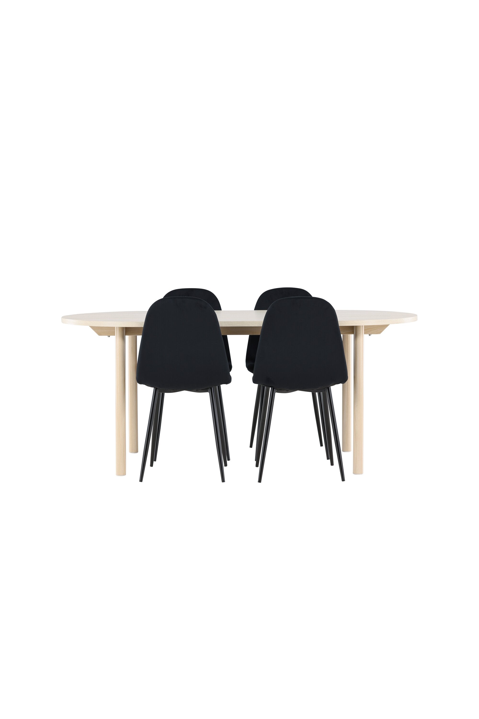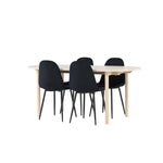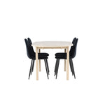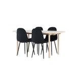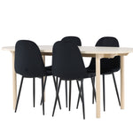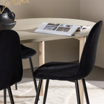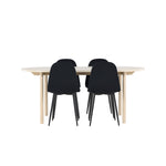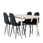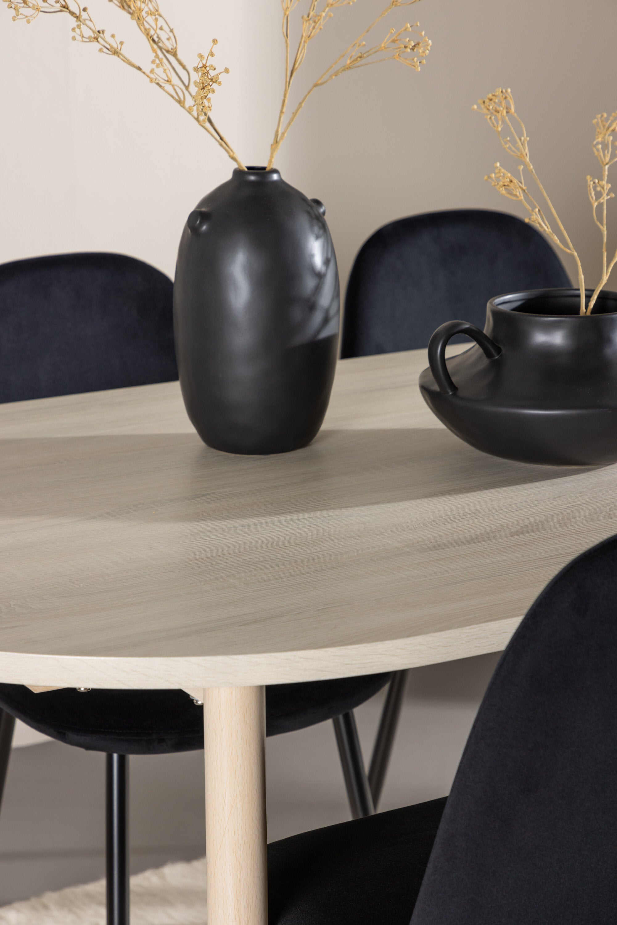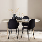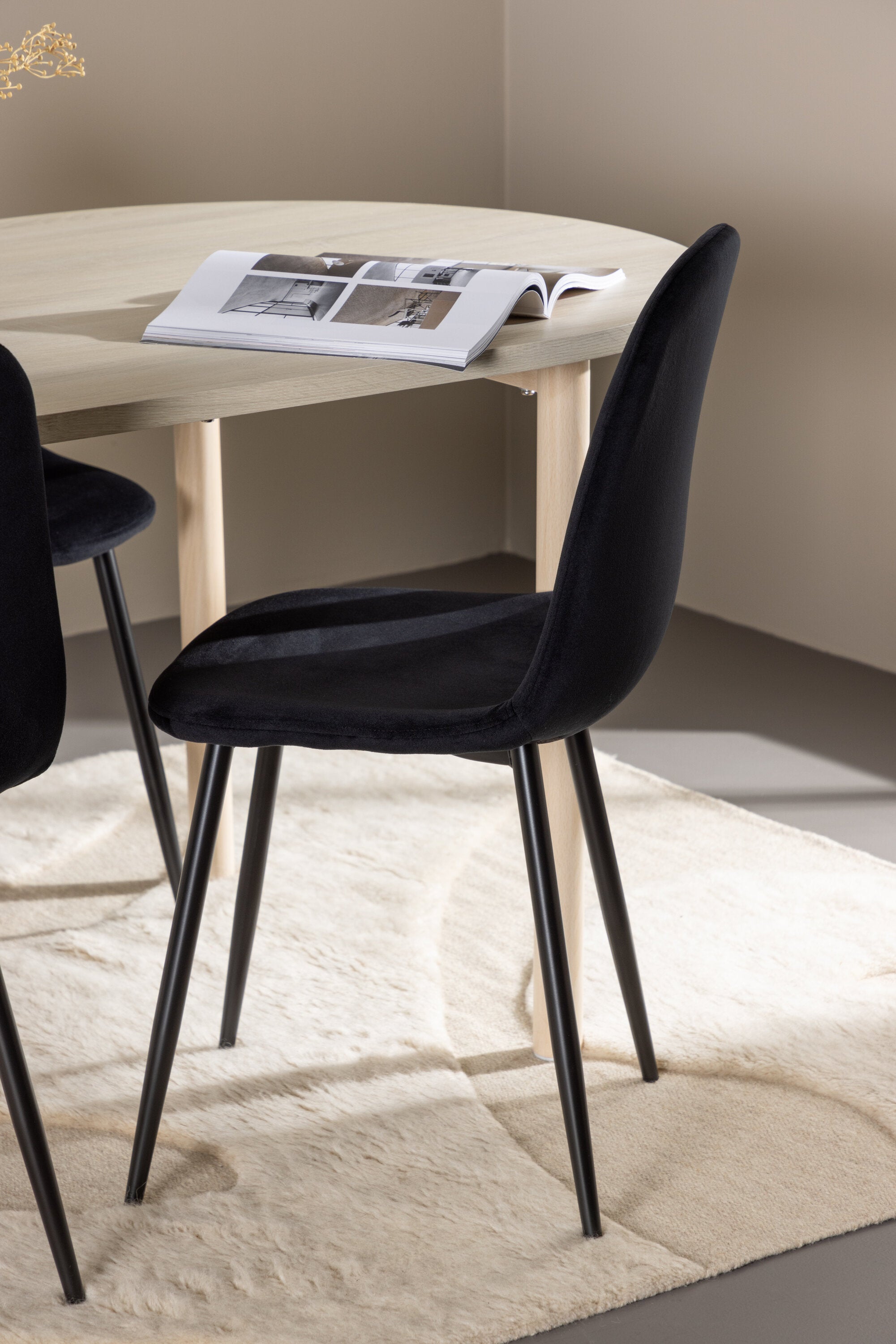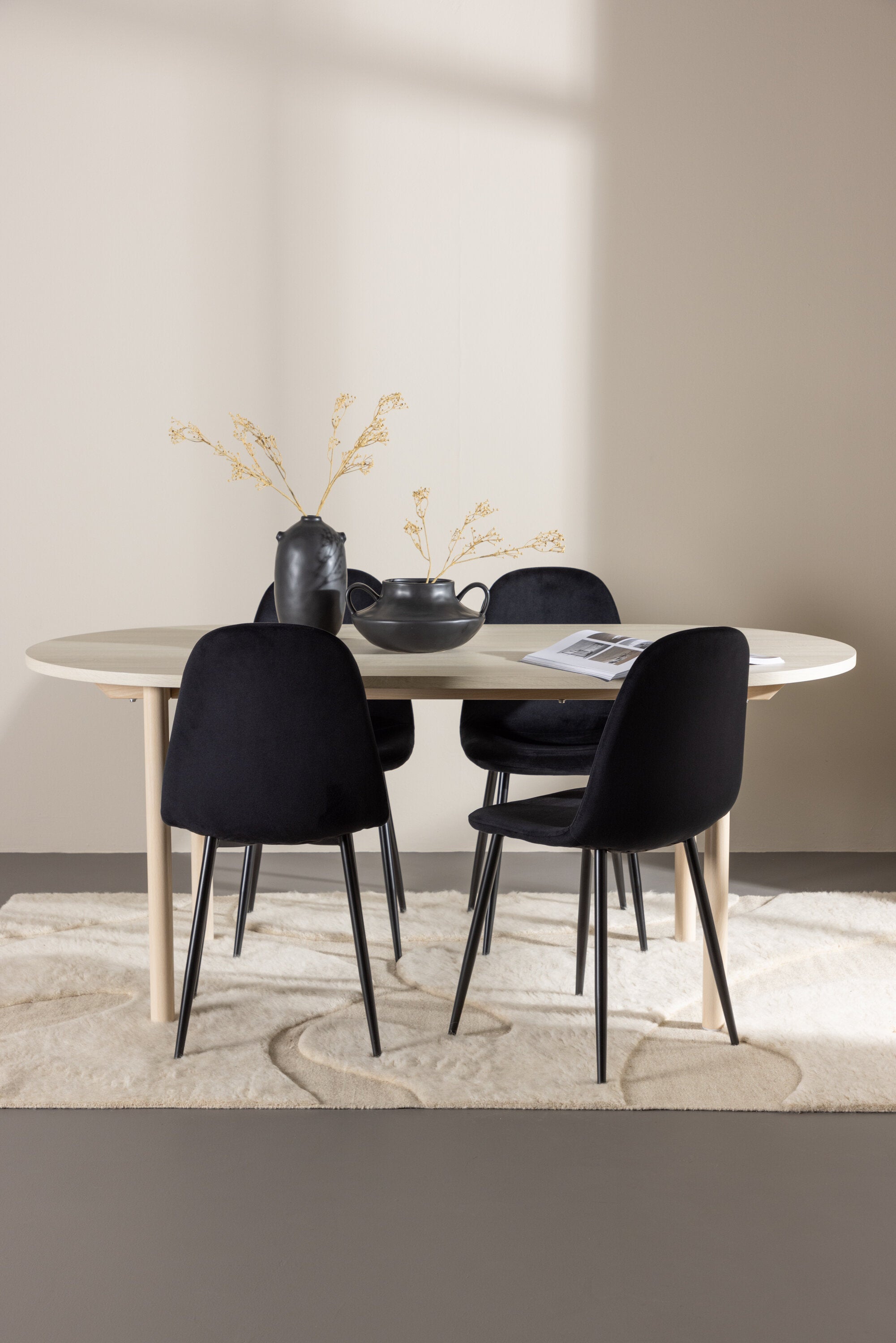 Objevte perfektní jídelní set pro váš domov s jídelním stolem Andy a jídelními židlemi Polar. Jídelní stůl Andy je nadčasový kousek, který se stává dokonalým místem pro společenské stolování. Díky své bílé barvě dodává Andy vaší jídelně nebo kuchyni zemitý a neutrální nádech. Ocelové nohy stolu a deska stolu z MDF kombinují štíhlost s robustností, což z něj dělá spolehlivý kus nábytku na mnoho let. Díky velkorysým rozměrům 180x90 cm je spousta místa pro rodinu a přátele, aby se sešli u stolu a vychutnali si dobré jídlo a dobrou společnost. Andy vytváří klidnou a uvolněnou atmosféru, která se perfektně hodí do různých stylů interiéru. Doplňte svůj jídelní stůl jídelními židlemi Polar, které nabízejí elegantní design v celočerné barvě. Polar má celočalouněný design s nohami z černého kovu s práškovým nástřikem a zaobleným opěradlem a sedákem z černé sametové látky s měkkým polstrováním. Tyto židle vám umožní vyhnout se kompromisům mezi pohodlím a designem. S jídelními židlemi Polar vytvoříte ve své jídelně moderní a elegantní atmosféru. Všimněte si, že samet má tendenci vytvářet otlaky, když se zdřímne položí, což může způsobit, že látka bude vypadat opotřebovaně. To je u tohoto typu materiálu zcela běžné a podle toho, jak dopadá světlo, se látka může posouvat v různých odstínech. Dodejte svému domovu nádech jednoduché elegance s jídelním stolem Andy a jídelními židlemi Polar – dokonalá kombinace pro vytvoření útulné atmosféry a příjemného prostředí pro všechna vaše jídla, ať už jde o každodenní jídlo nebo slavnostní příležitosti.
