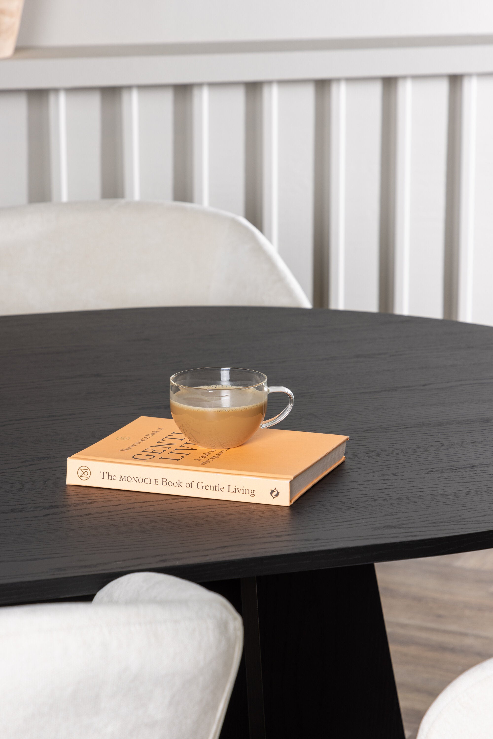 Náš oválný jídelní stůl Bootcut má černou desku MDF s dýhou, která dodá vašemu interiéru moderní nádech. Vytváří dokonalý kontrast k robustnímu a poutavému rámu se svými dvěma tvarovanými nohami. Perfektní jídelní stůl pro každodenní použití i slavnostní příležitosti. Rozměry stolu: 115x230cm.