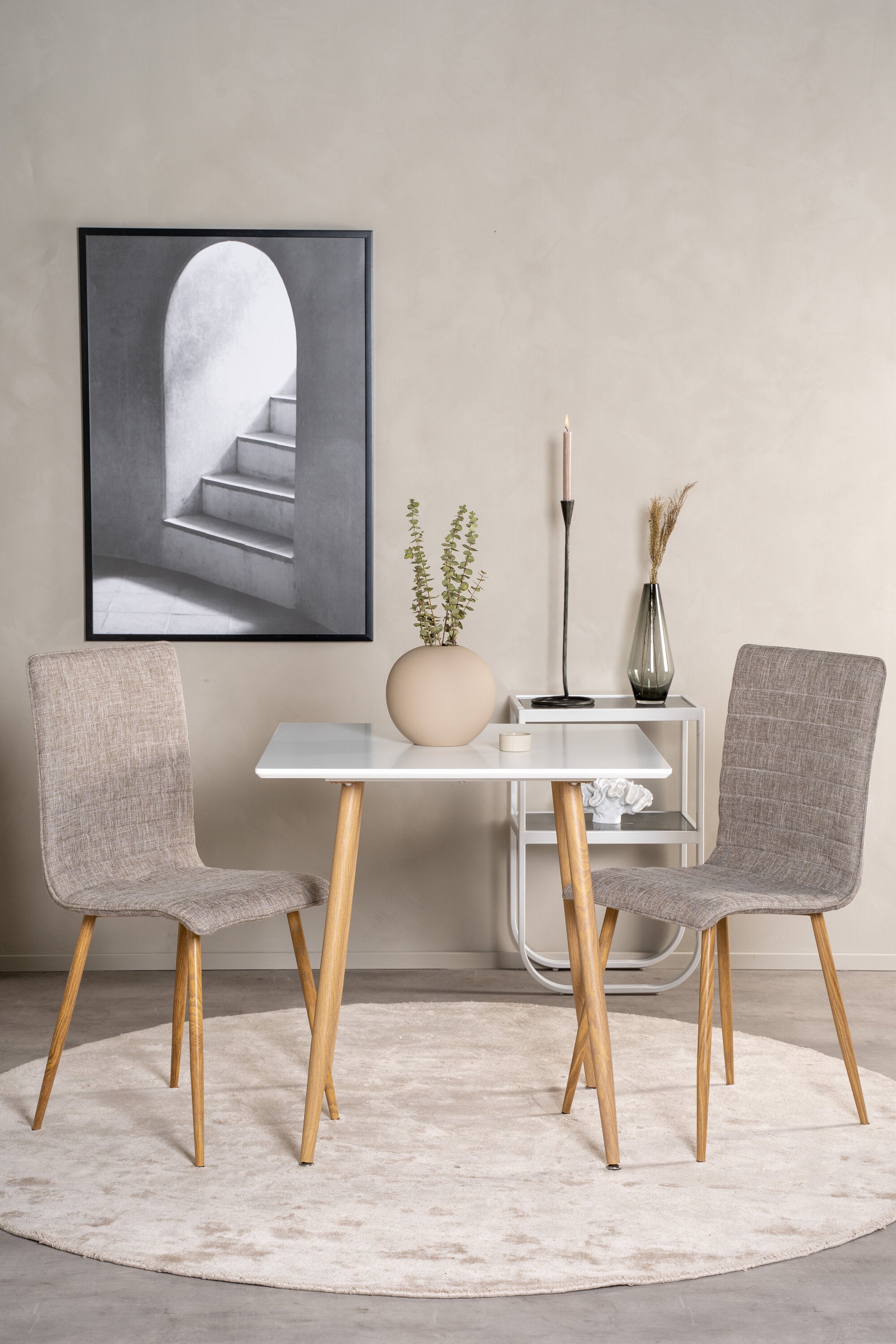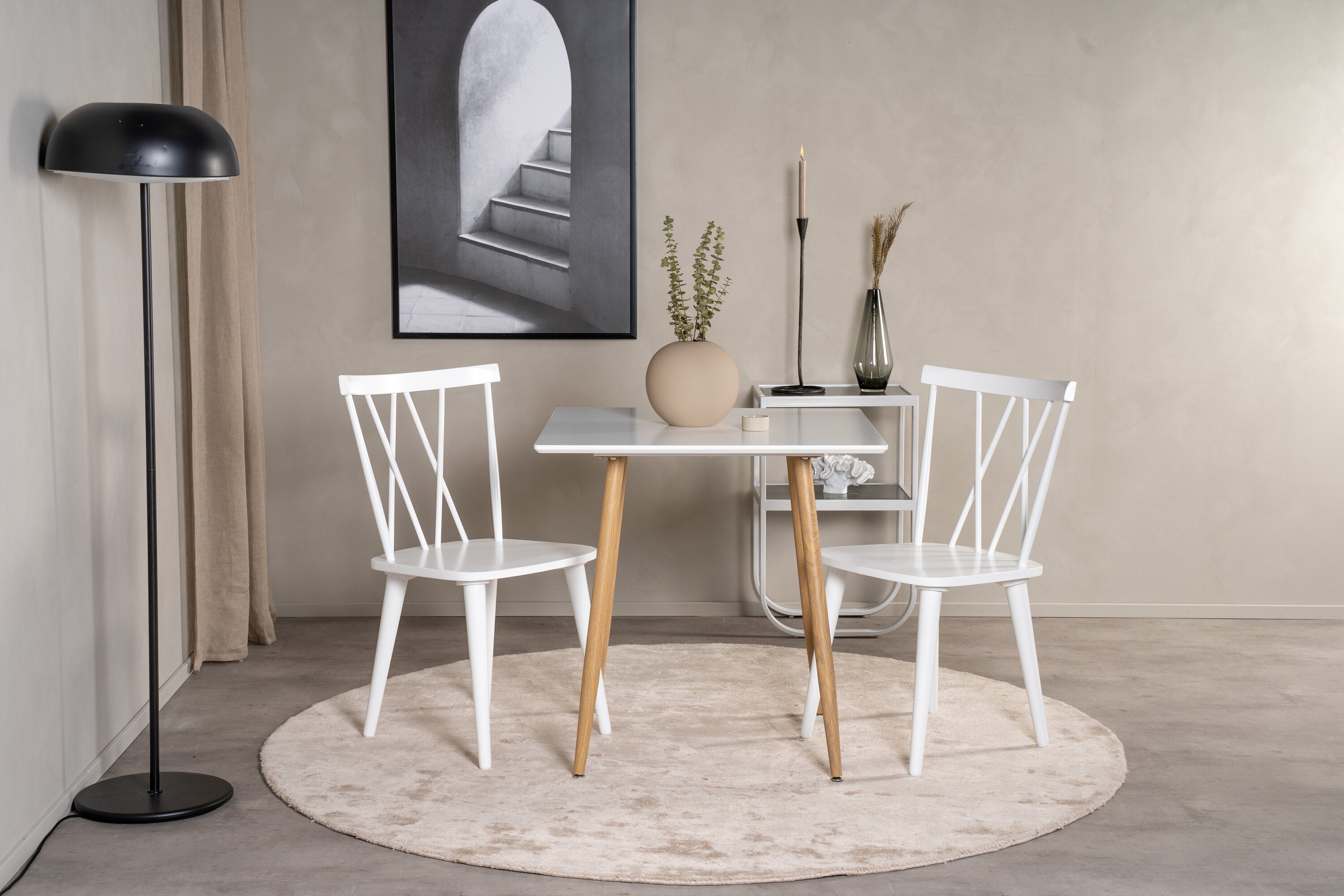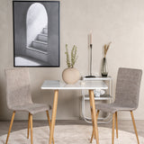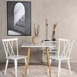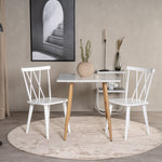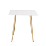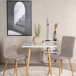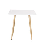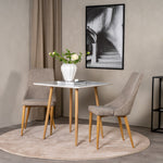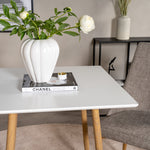 Čtvercový jídelní stůl ze série Polar je ideální do malé kuchyně! Má skandinávský design s bílou deskou z MDF a kovovými nohami v přírodní barvě.