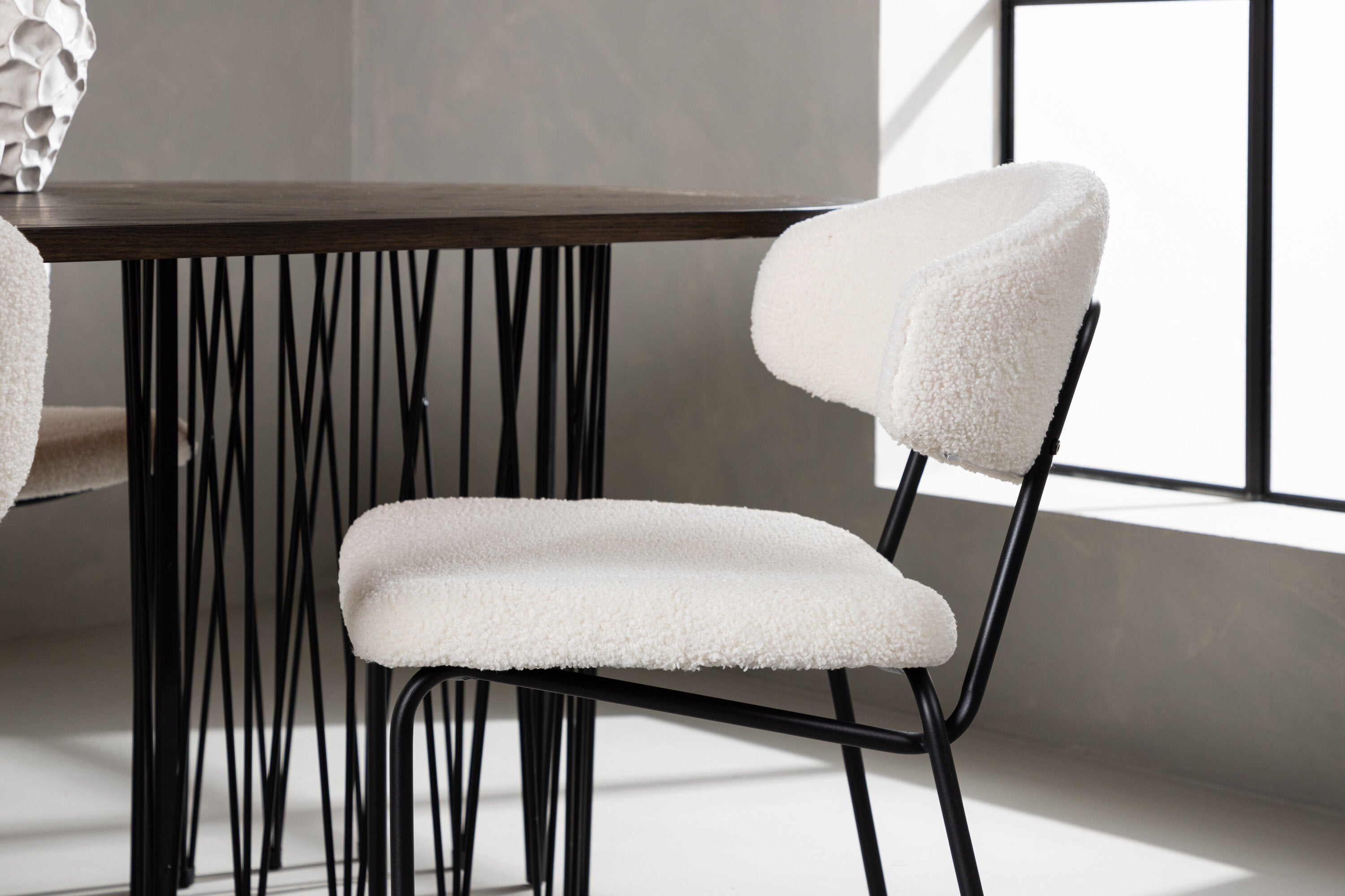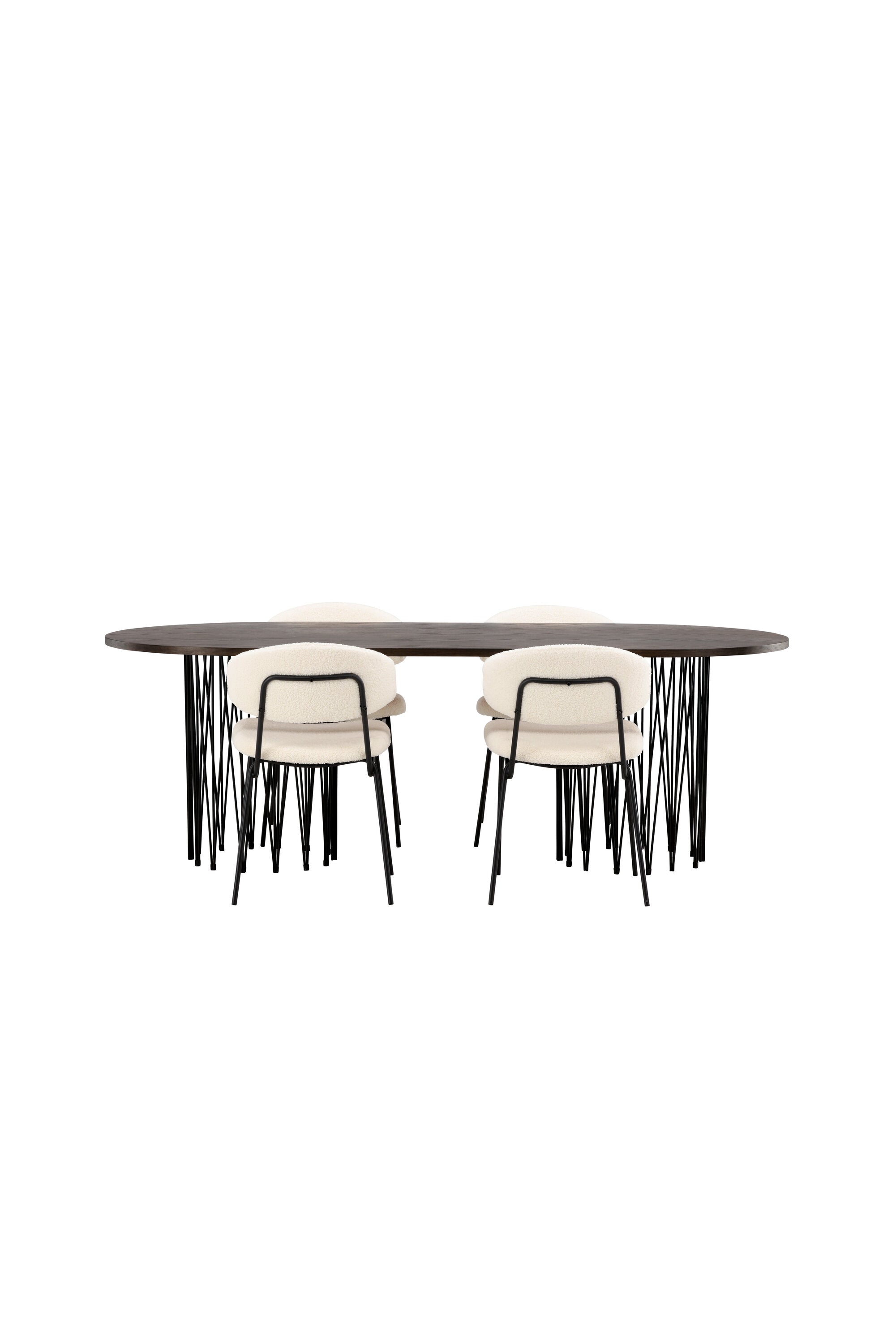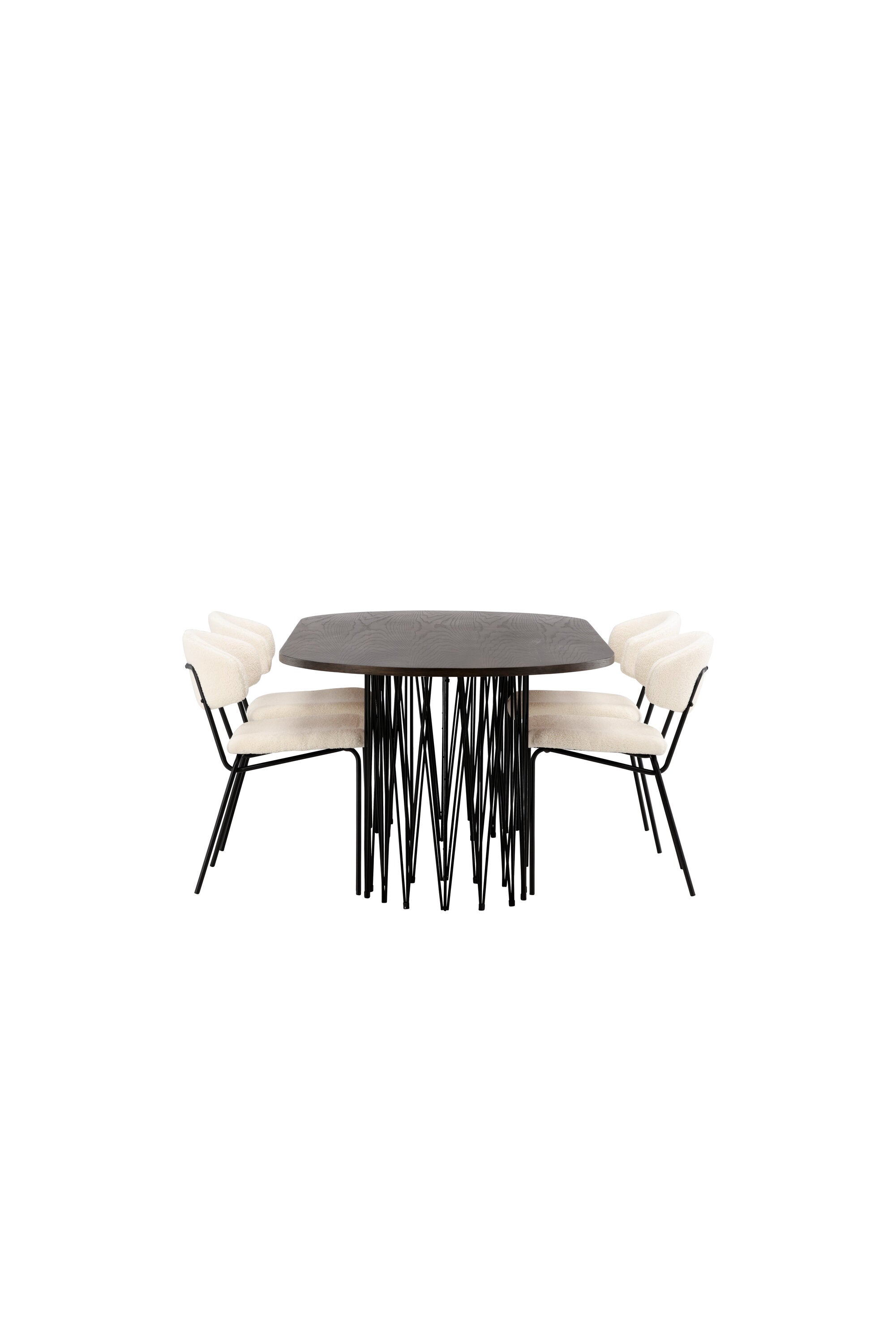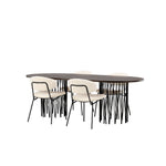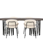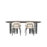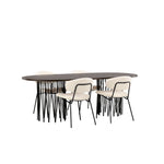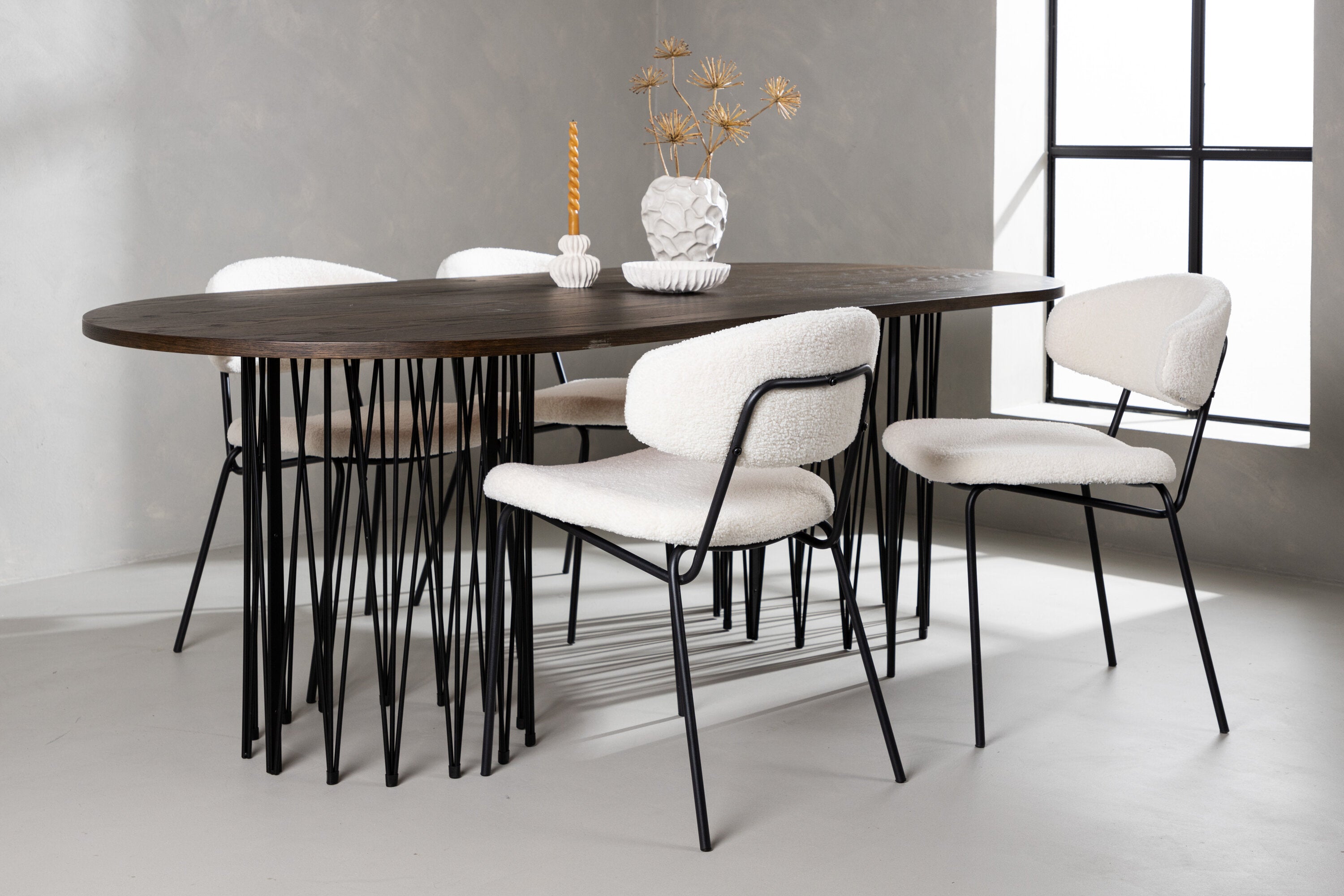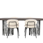 Jak stylové, tak praktické – tato pohodlná jídelní sestava vyzařuje jak pohodlí, tak i módní design! Náš oválný jídelní stůl Stone má fantastický skandinávský design, který se hodí k davu. Stůl má krásnou hnědou desku z MDF s dýhou a dva ozdobné rámy ve tvaru válce v černém kovu. Zde společně s našimi trendy jídelními židlemi ze série Chico. Židle mají minimalistický a pohodlný design s opěradlem a sedákem z bílé tkaniny a úzkým rámem z černé oceli. Zde získáte útulný středobod vašeho domova!