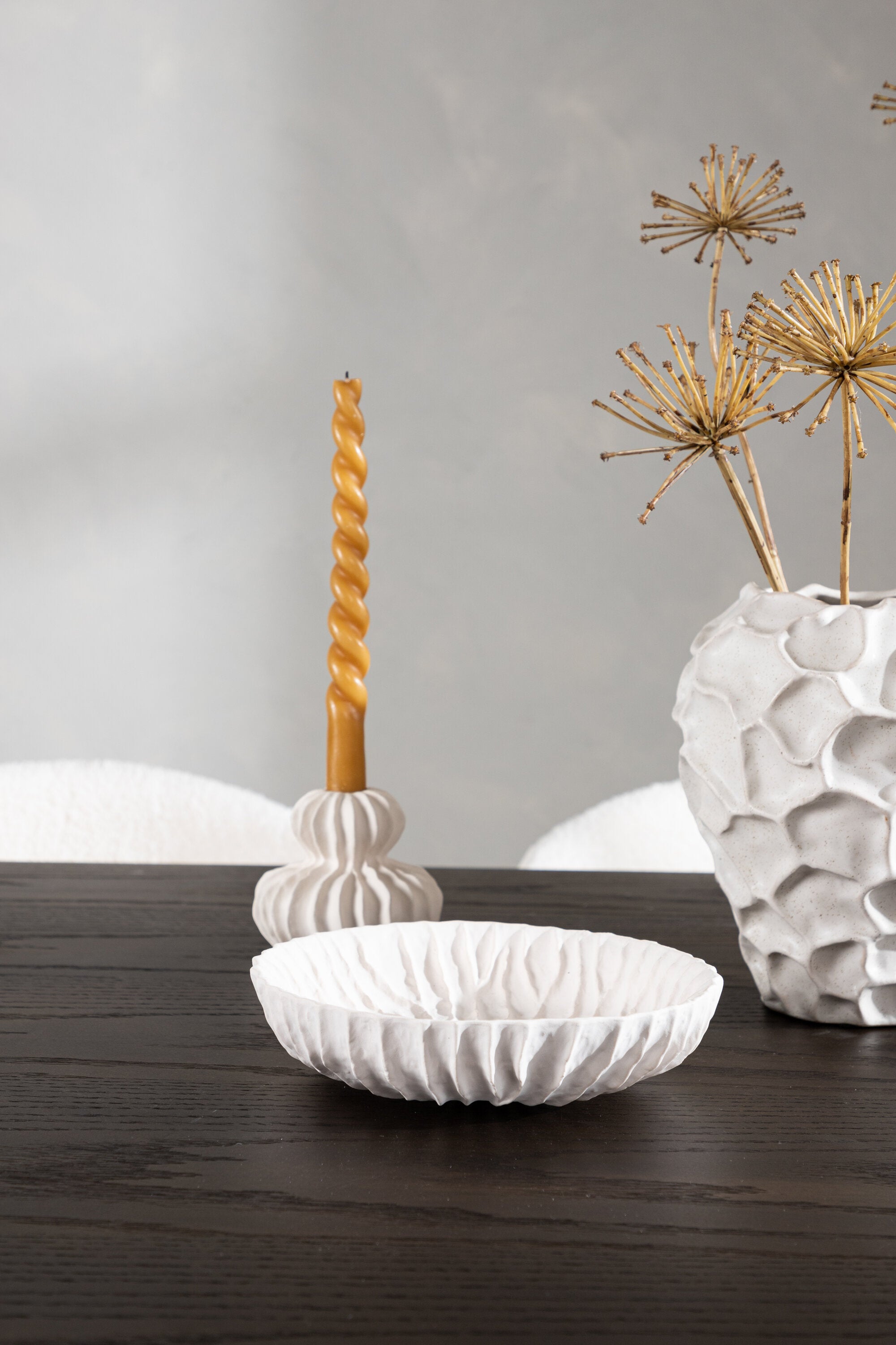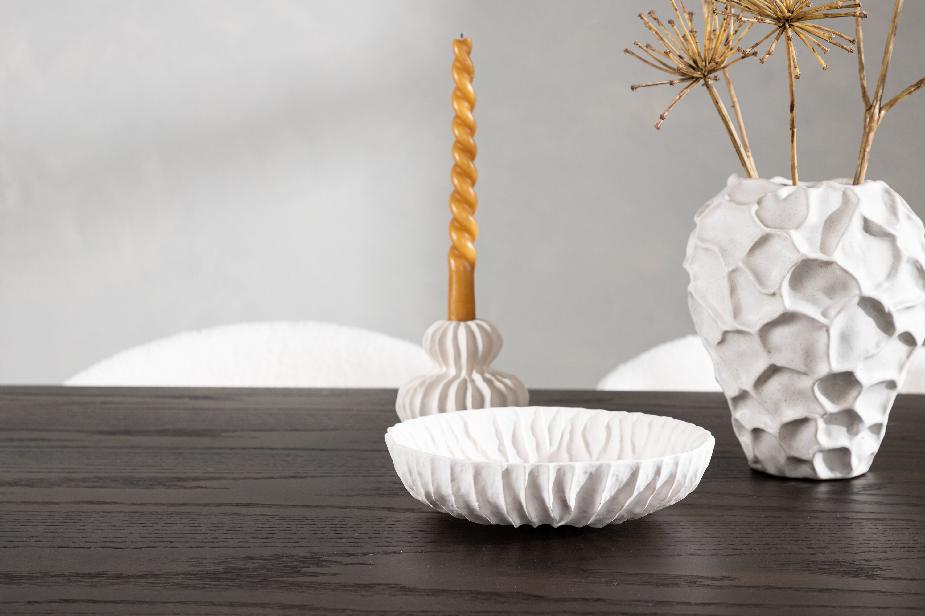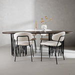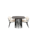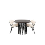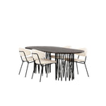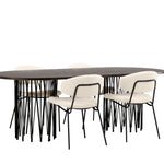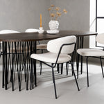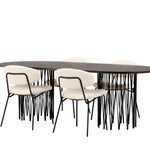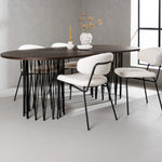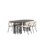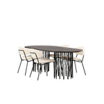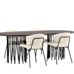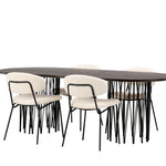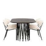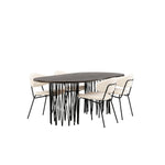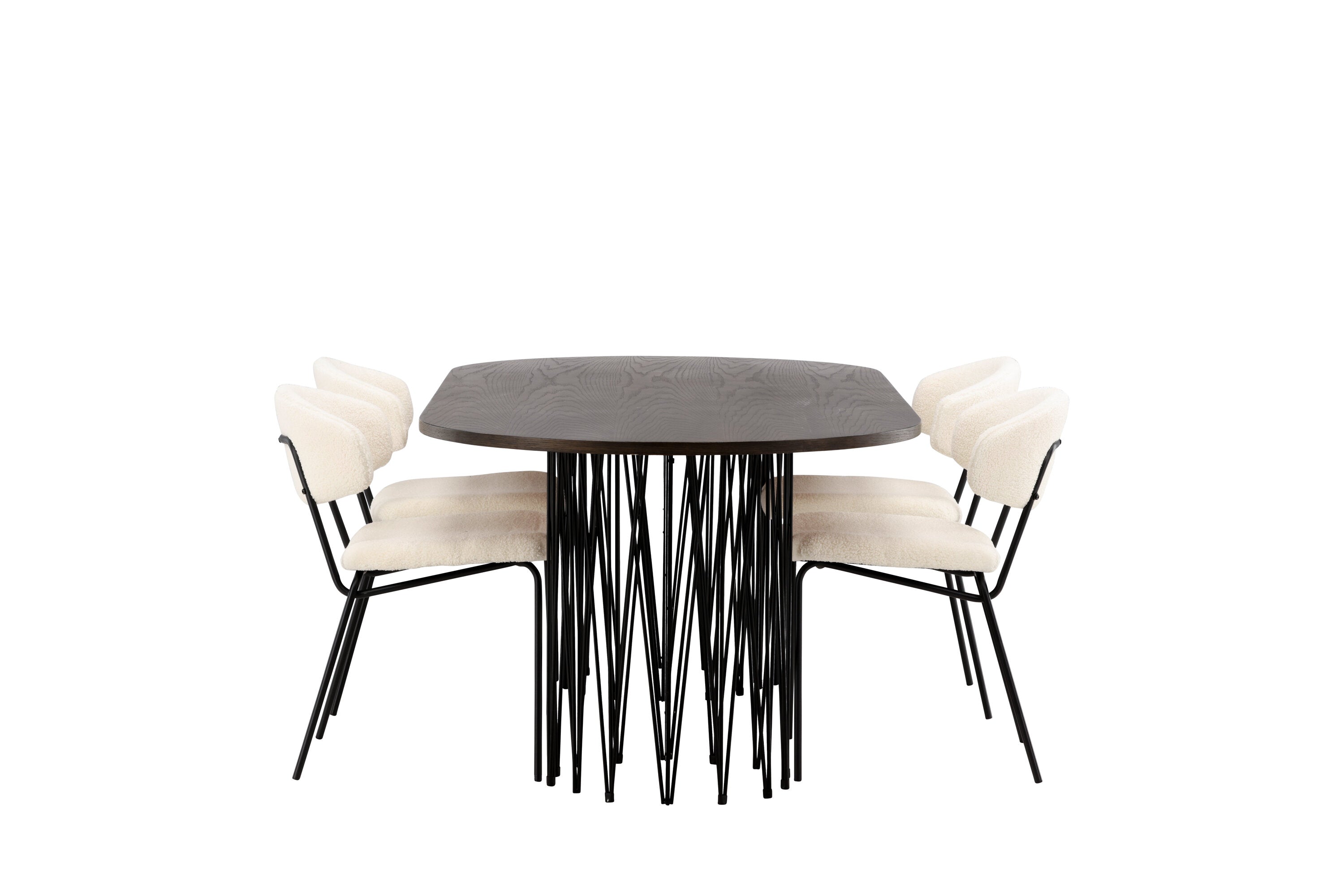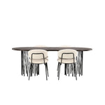 Jak stylové, tak praktické – tato pohodlná jídelní sestava vyzařuje jak pohodlí, tak i módní design! Náš oválný jídelní stůl Stone má fantastický skandinávský design, který se hodí k davu. Stůl má krásnou hnědou desku z MDF s dýhou a dva ozdobné rámy ve tvaru válce v černém kovu. Zde společně s našimi trendy jídelními židlemi ze série Chico. Židle mají minimalistický a pohodlný design s opěradlem a sedákem z bílé tkaniny a úzkým rámem z černé oceli. Zde získáte útulný středobod vašeho domova!