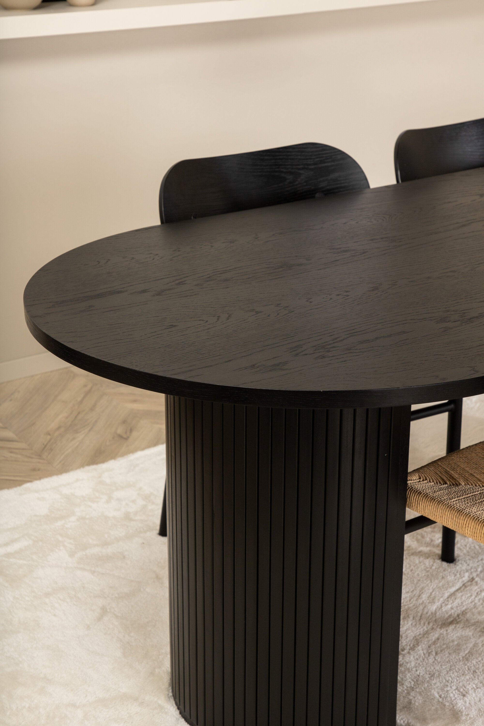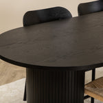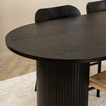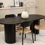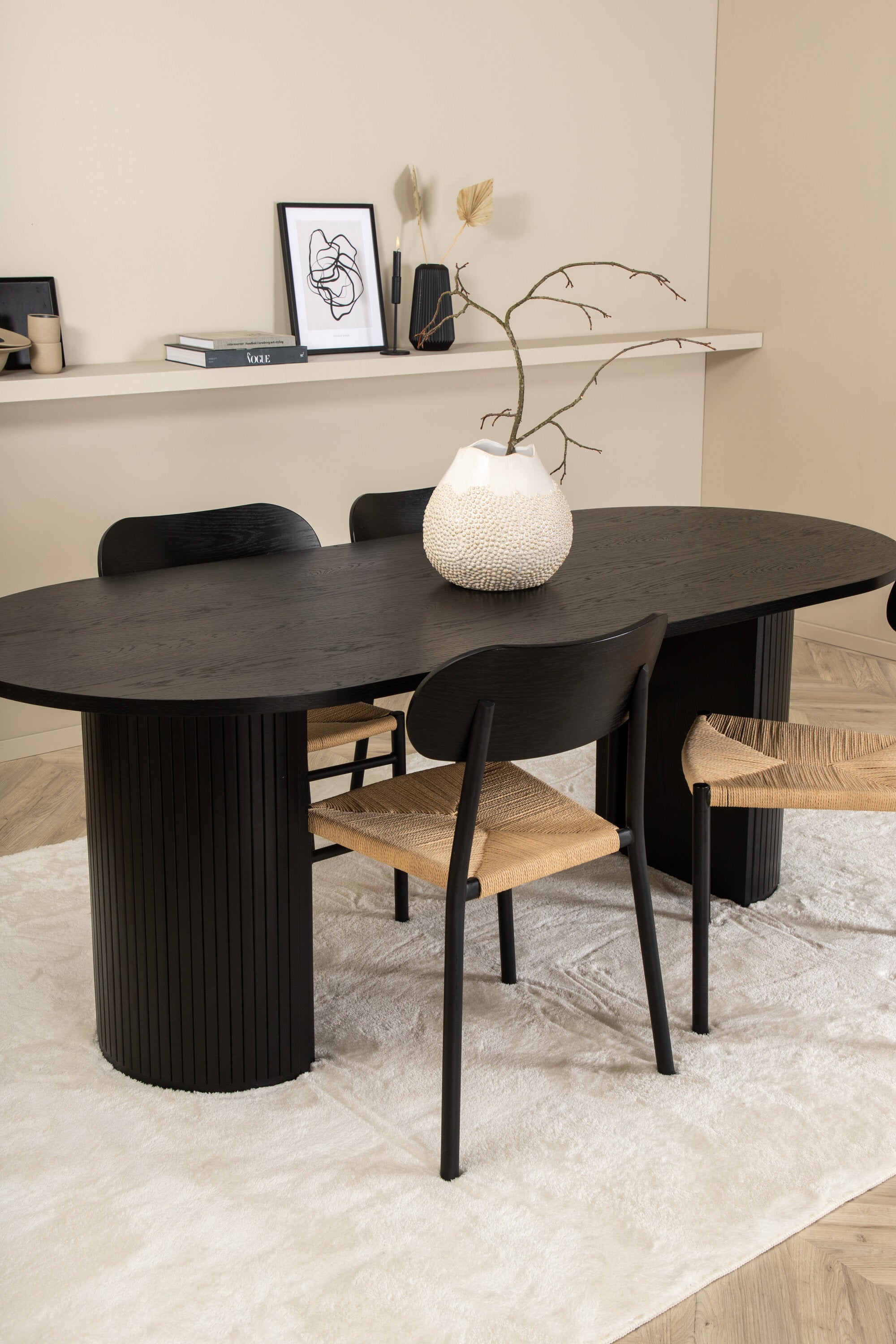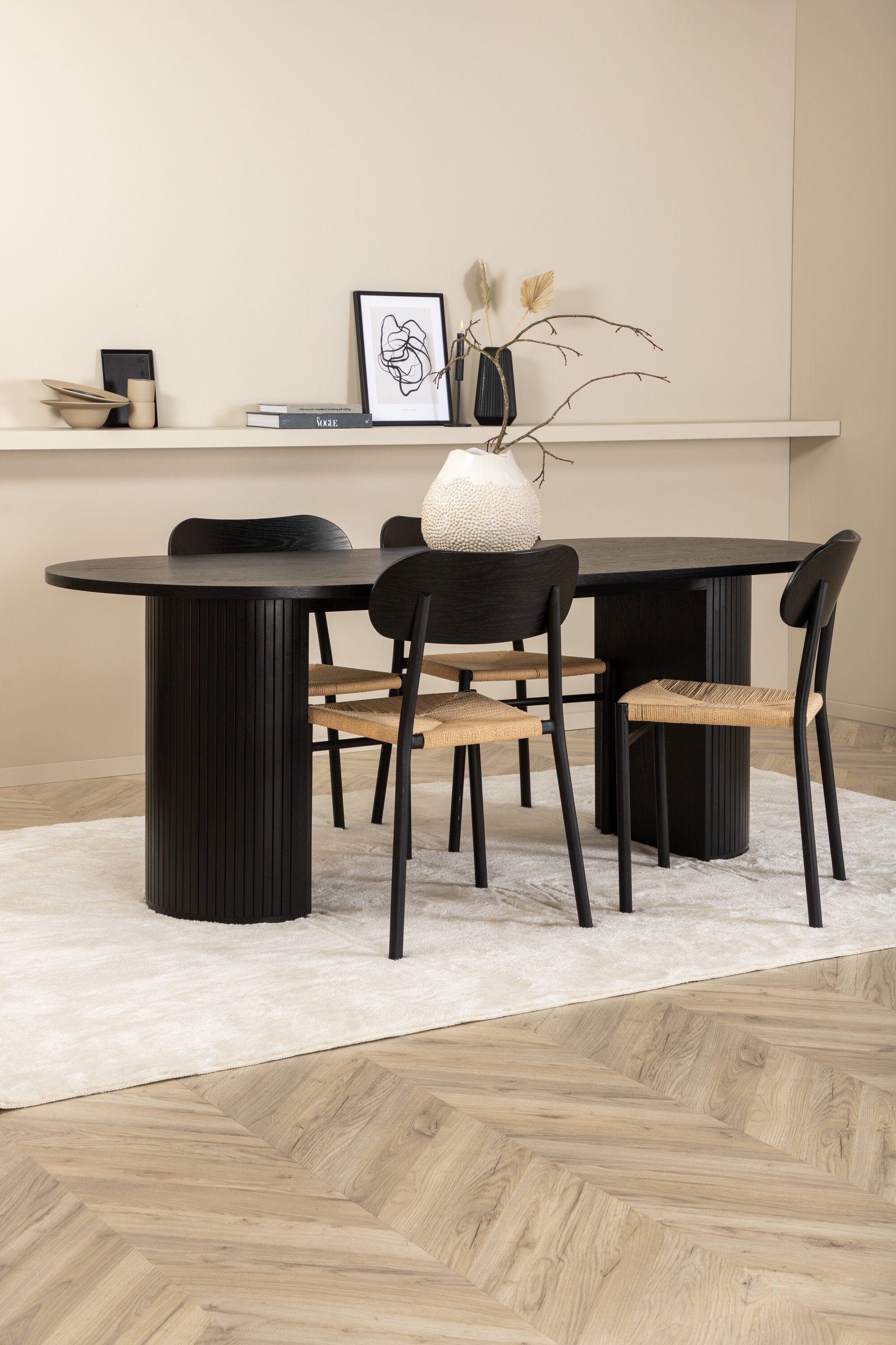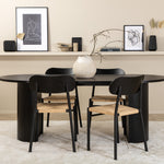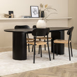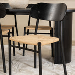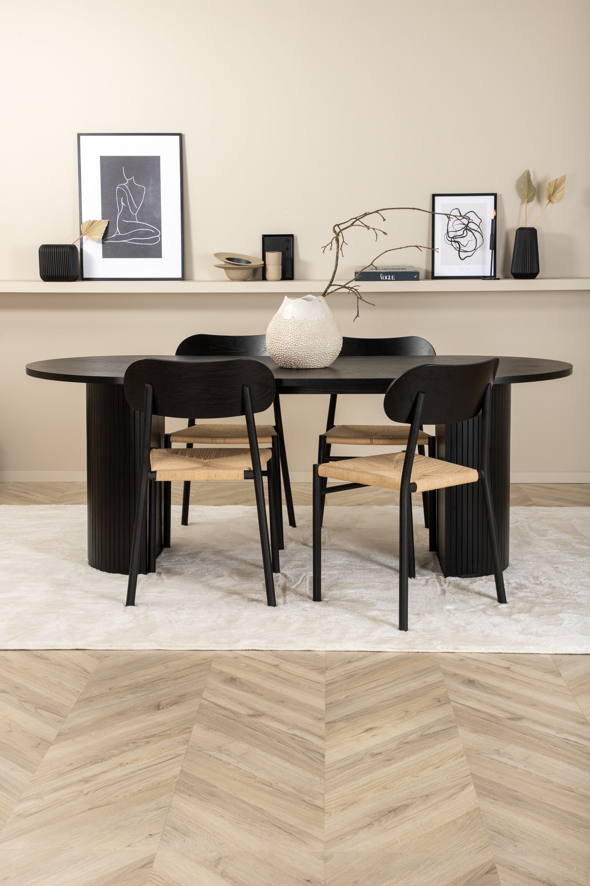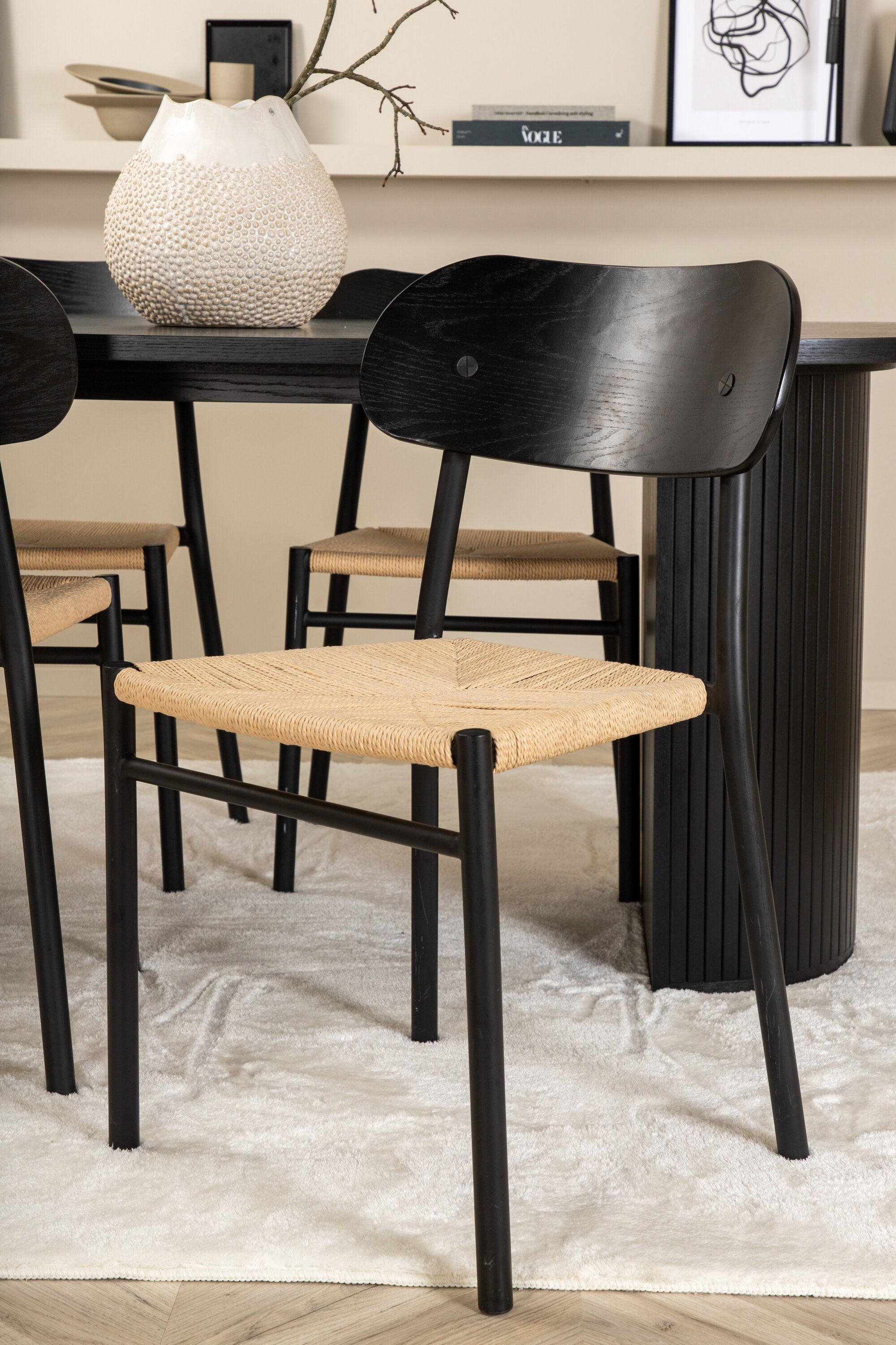 Ať se čas u jídelního stolu stane jedním z vrcholů dneška! Náš oválný jídelní stůl Bianca v konzistentně černé barvě má ​​trendy design se stolovou deskou z MDF a robustním rámem v žebrovaném provedení, který působí stabilním dojmem. Rozměry stolu: Délka: 200 cm, Šířka: 90 cm, Výška: 75 cm. Zde spolu se 4 jídelními židlemi Polly v klasickém vzhledu. Sedák je z odolného lana přírodní barvy a nohy židle z černého kovu. Rozměry židle: výška: 88 cm, výška sedáku: 47 cm, šířka: 42 cm, hloubka: 55 cm. Pozlate všechna jídla dne kolem krásné skupiny jídel!