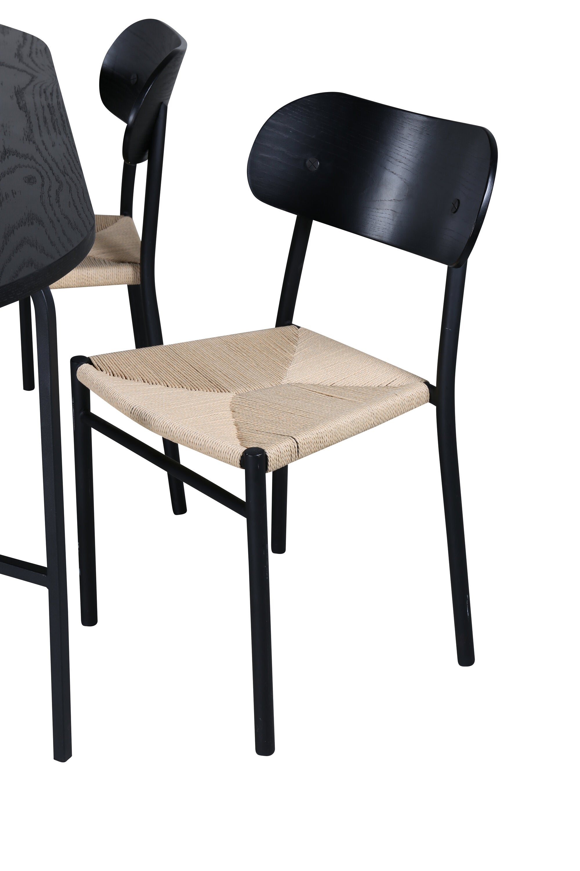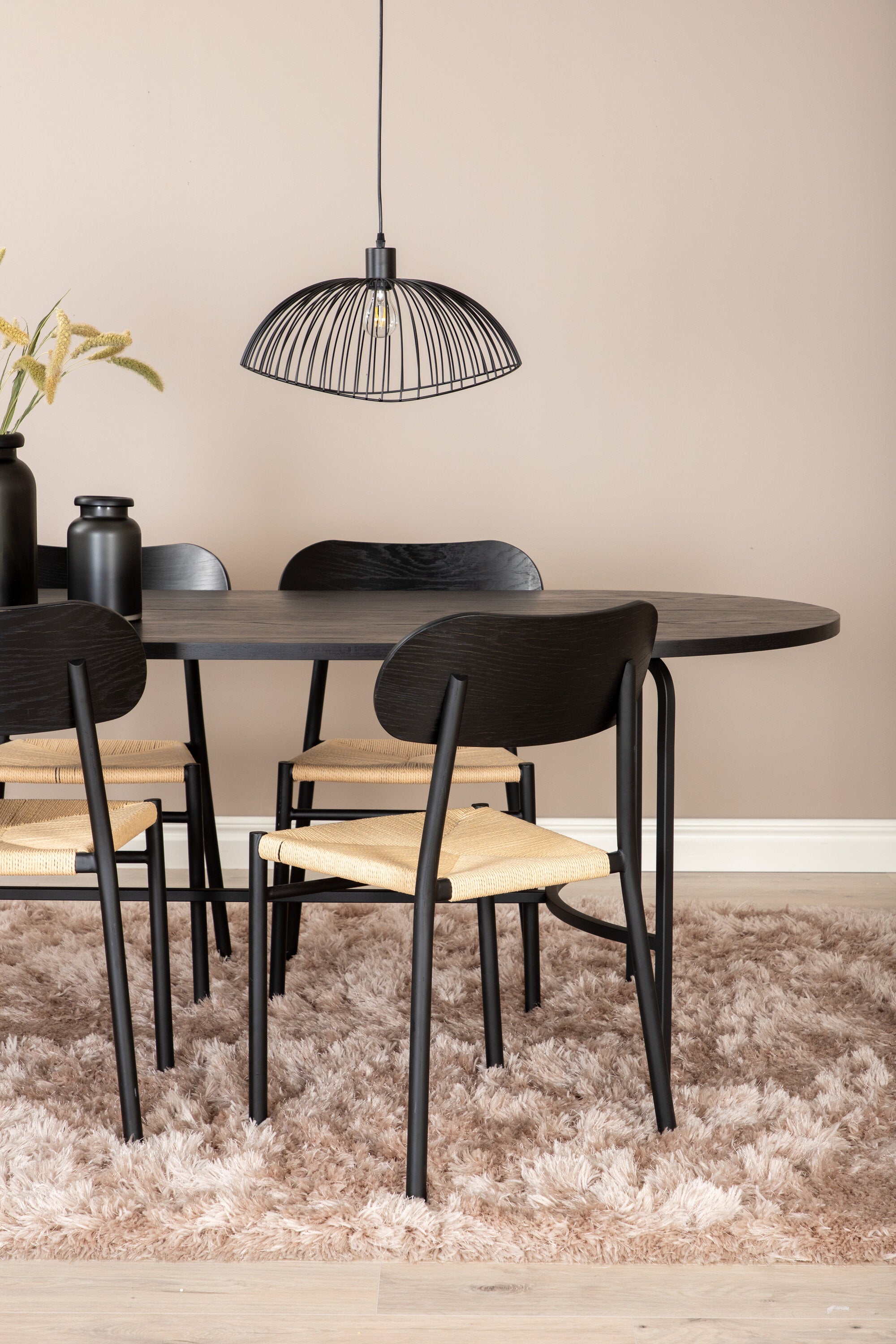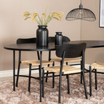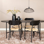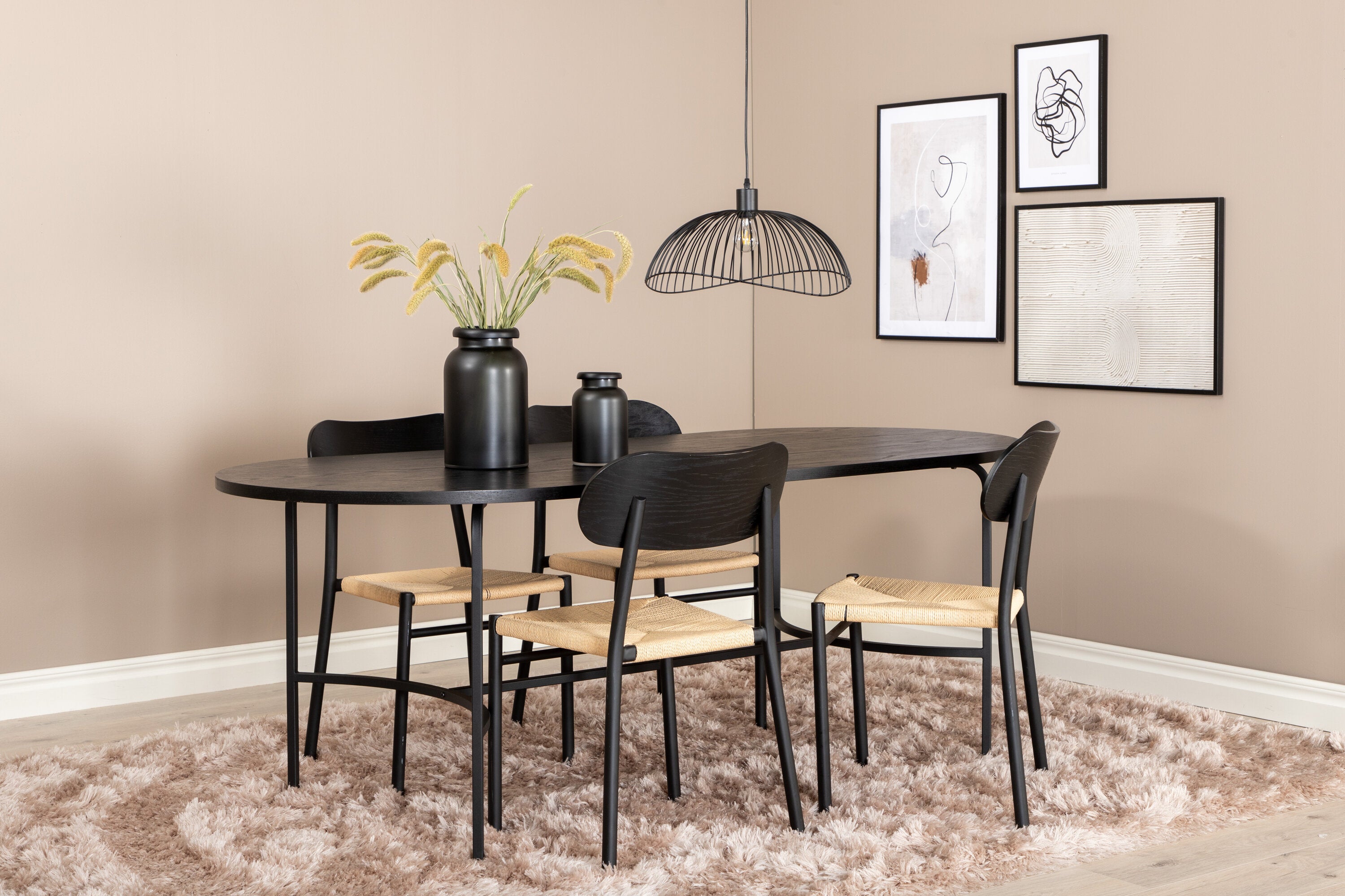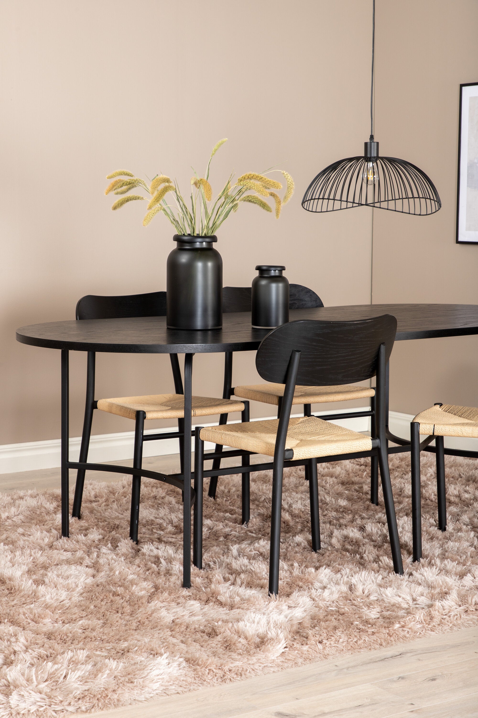 Zařiďte obývací pokoj útulně a trendově! Jídelní brusle zaujme svým elegantním designem a příjemným oválným designem. Celkový design je velmi dobře promyšlený s tenkou horní deskou v černé MDF s dýhou a černými nohami stolu z kovu. Rozměry stolu: Délka: 200 cm, Šířka: 90 cm, Výška: 75 cm. Zde spolu se 4 jídelními židlemi Polly v bohémském vzhledu. Sedák má přírodní barvu z odolného lana a nohy židle z černého kovu. Rozměry židle: výška: 88 cm, výška sedáku: 47 cm, šířka: 42 cm, hloubka: 55 cm. Pozlate všechna jídla dne kolem krásné skupiny jídel!