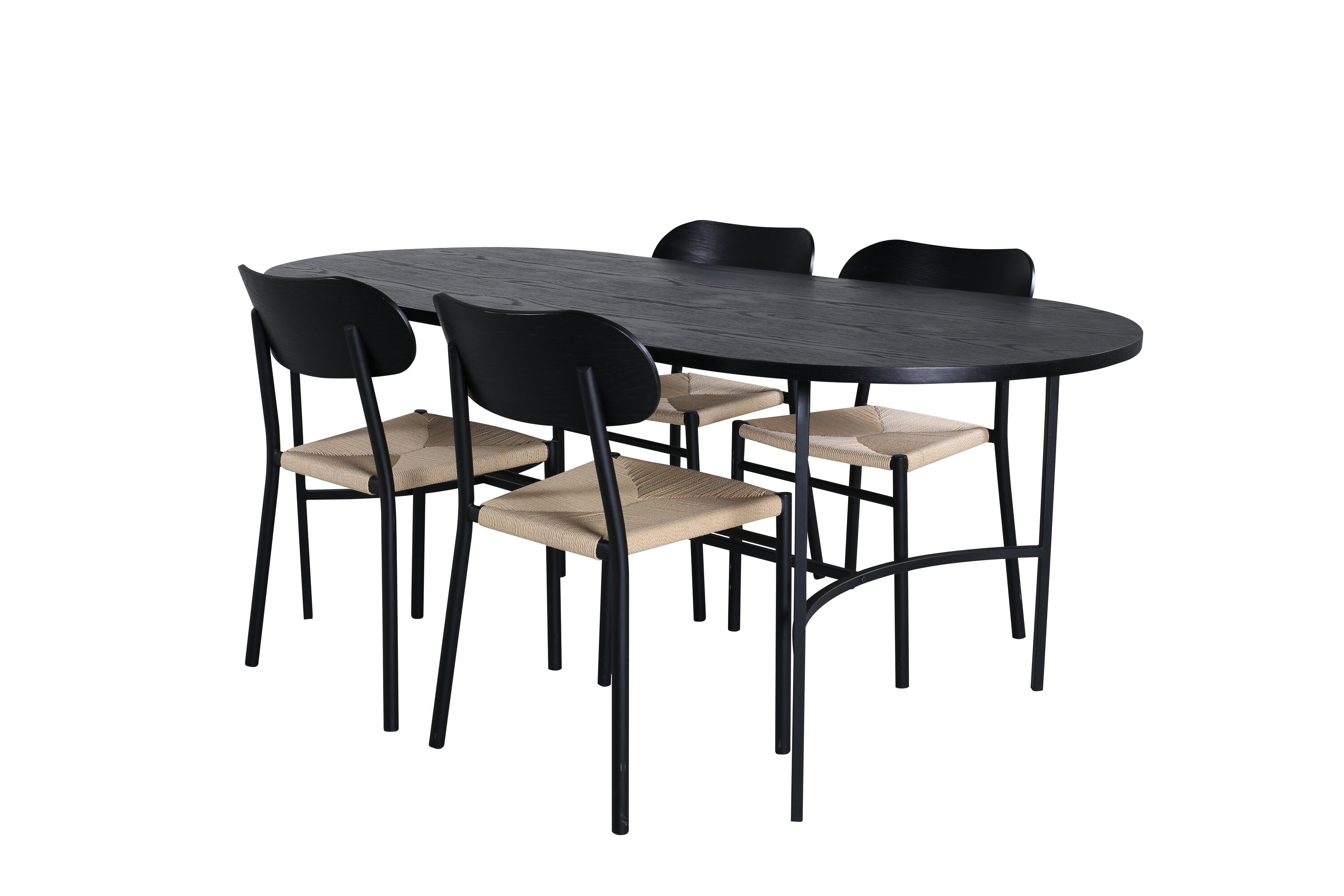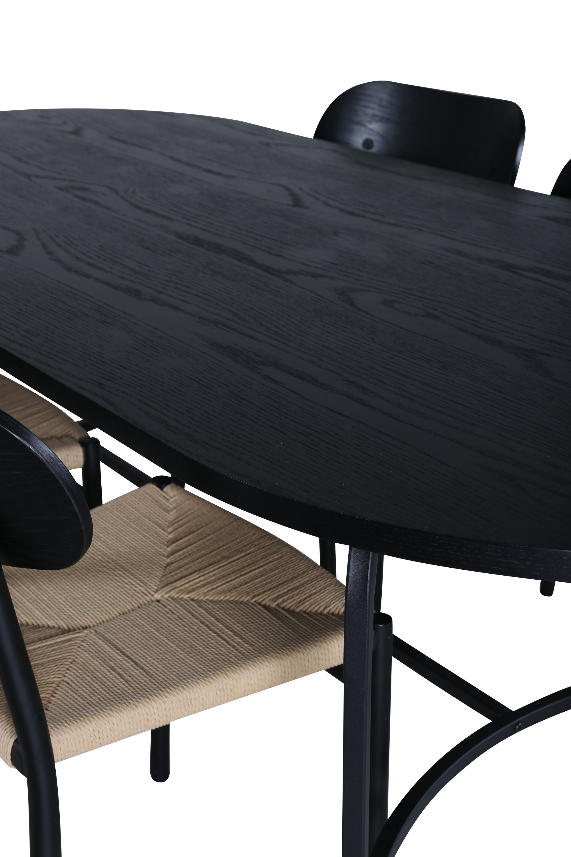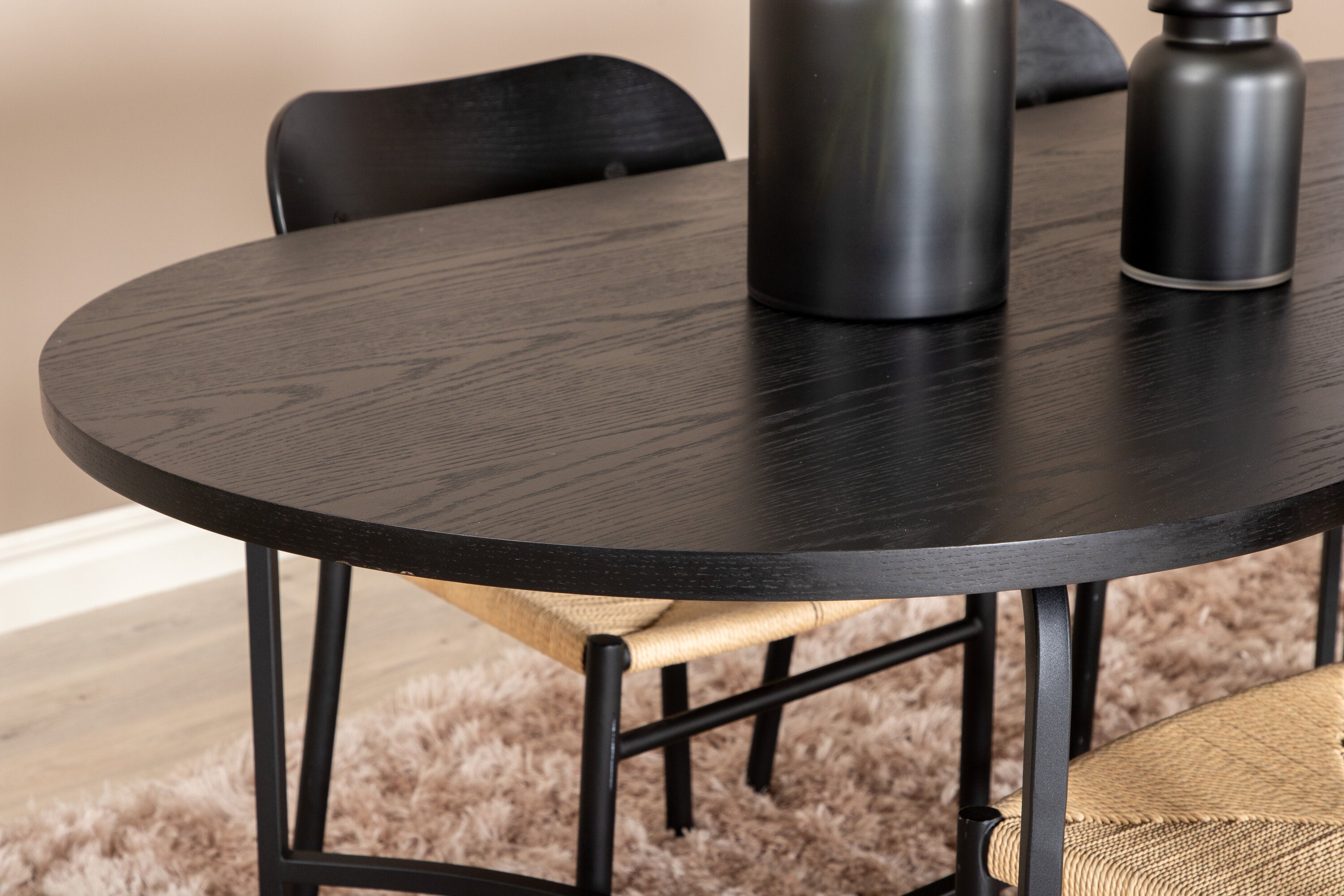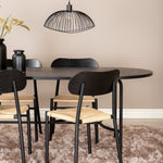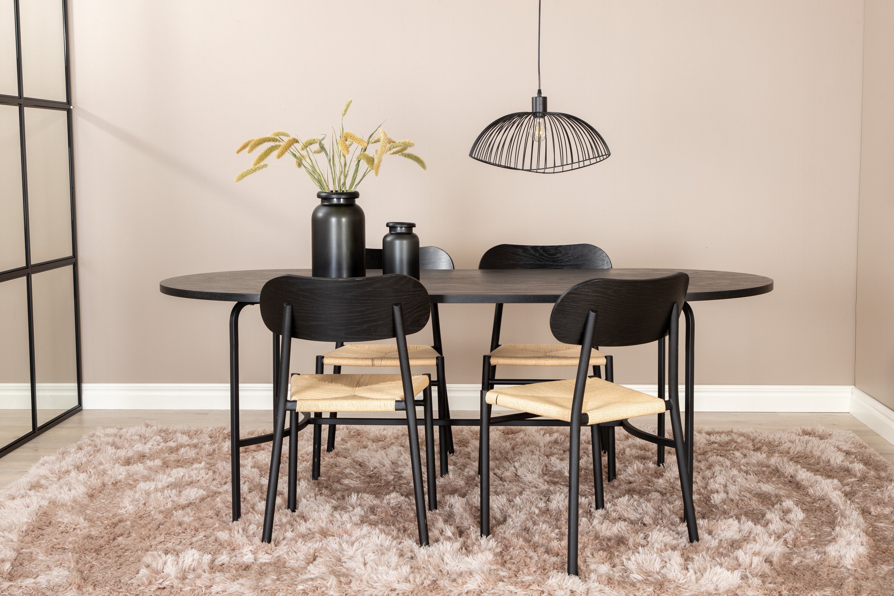 Zařiďte obývací pokoj útulně a trendově! Jídelní brusle zaujme svým elegantním designem a příjemným oválným designem. Celkový design je velmi dobře promyšlený s tenkou horní deskou v černé MDF s dýhou a černými nohami stolu z kovu. Rozměry stolu: Délka: 200 cm, Šířka: 90 cm, Výška: 75 cm. Zde spolu se 4 jídelními židlemi Polly v bohémském vzhledu. Sedák má přírodní barvu z odolného lana a nohy židle z černého kovu. Rozměry židle: výška: 88 cm, výška sedáku: 47 cm, šířka: 42 cm, hloubka: 55 cm. Pozlate všechna jídla dne kolem krásné skupiny jídel!