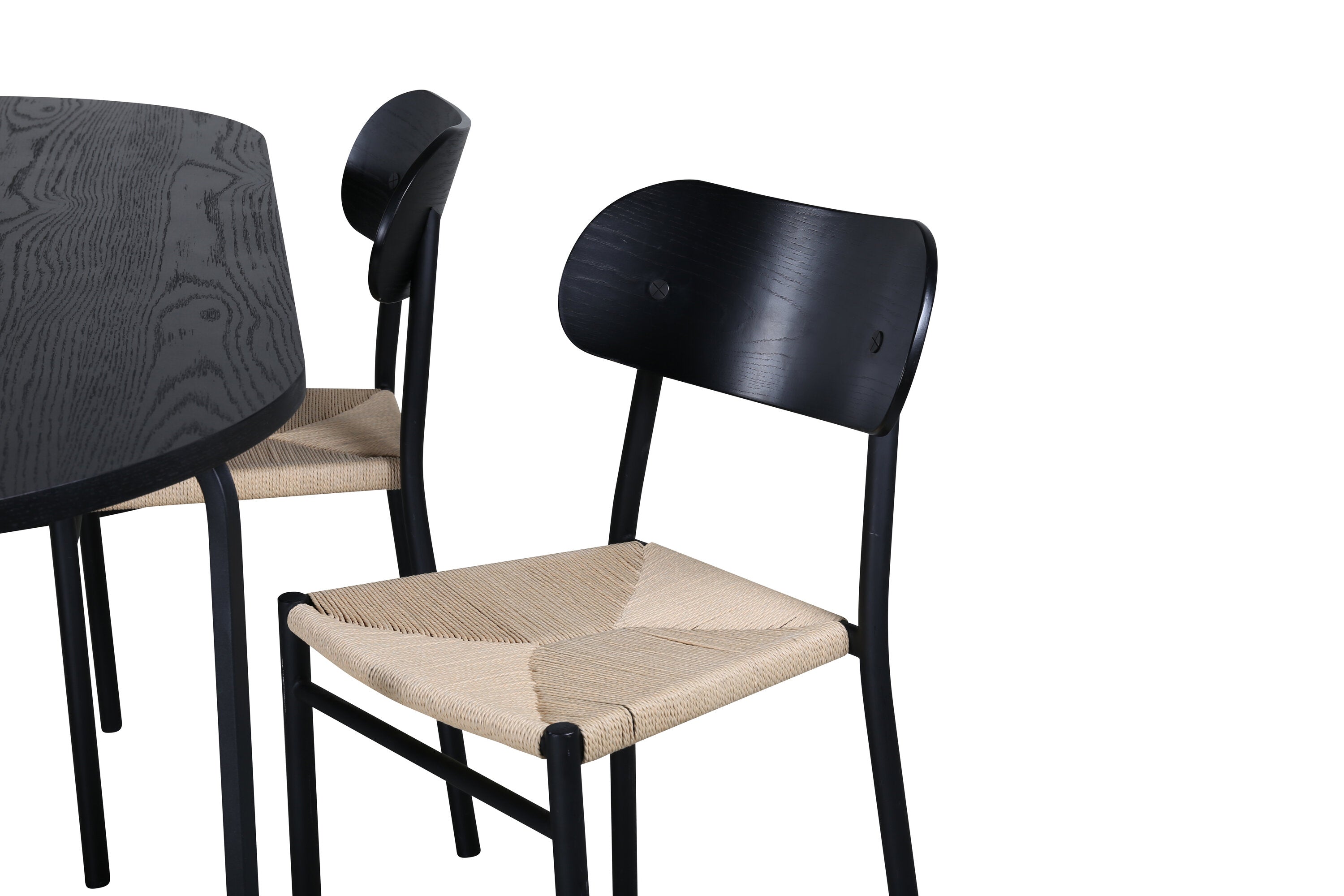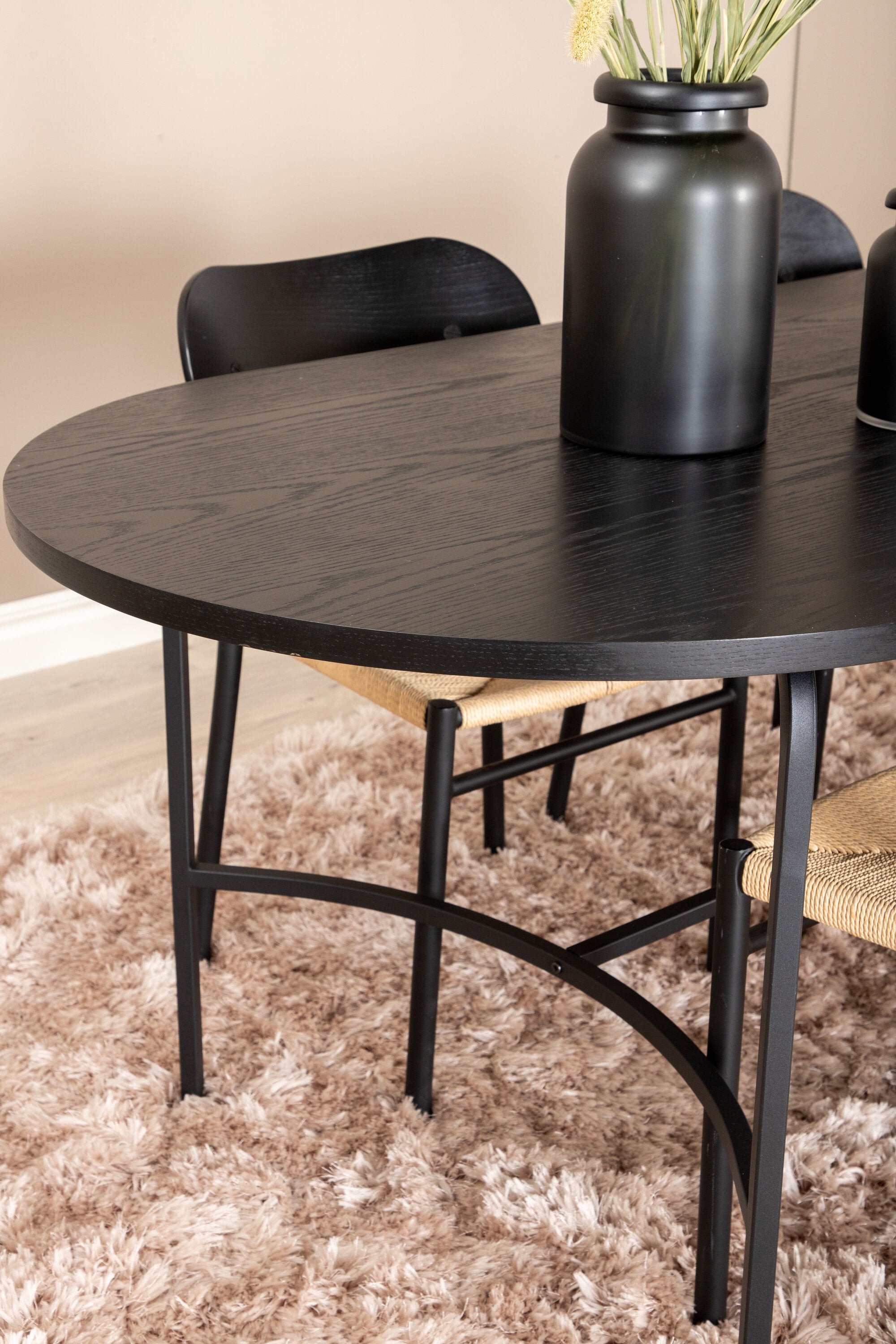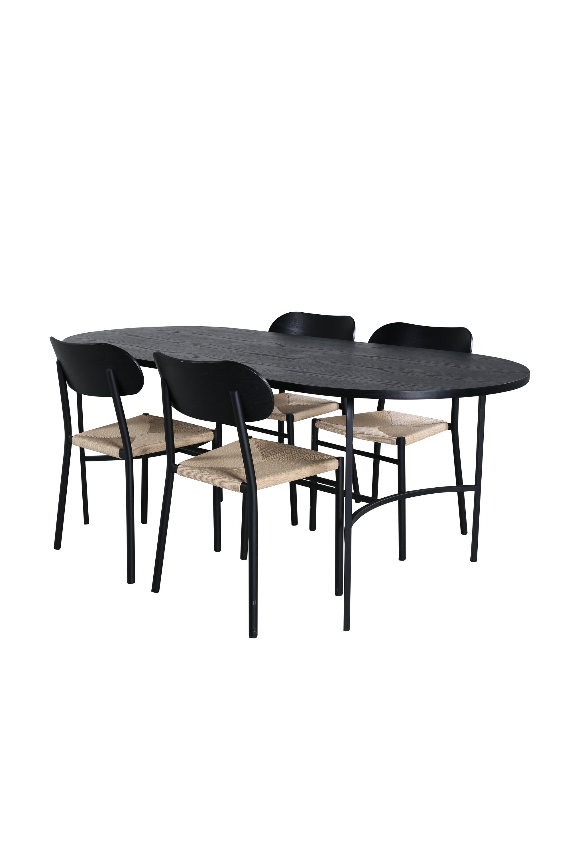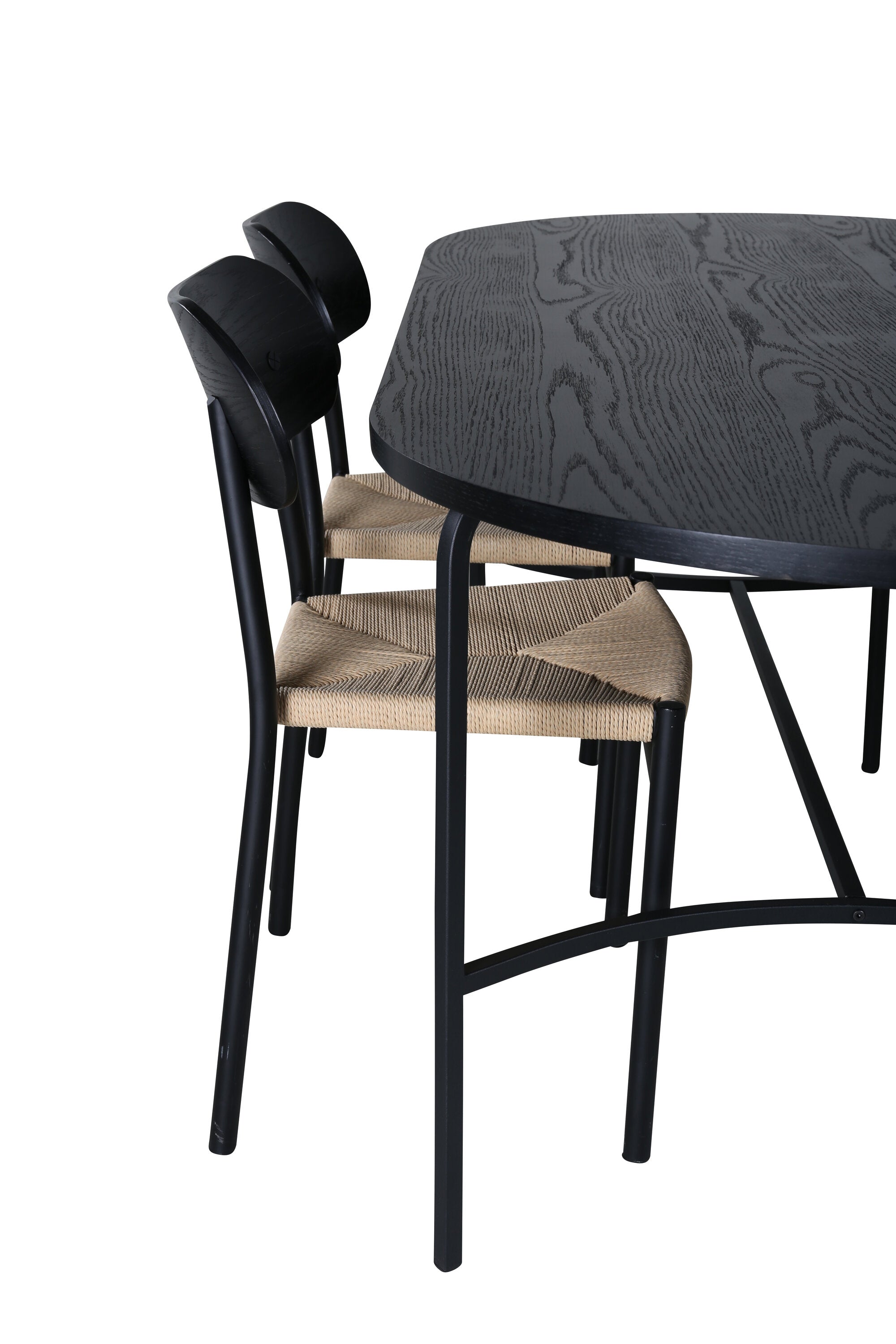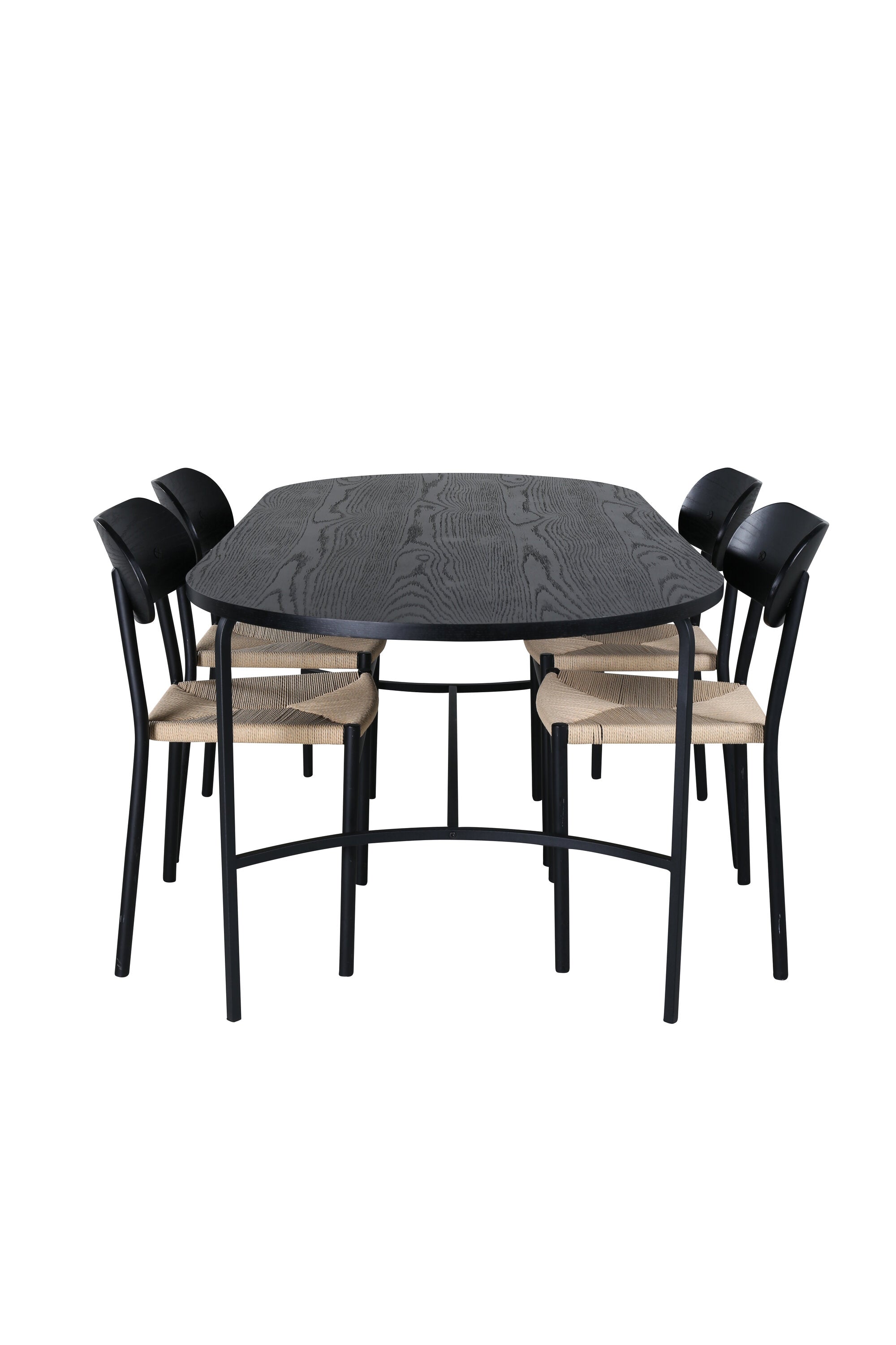 Zařiďte obývací pokoj útulně a trendově! Jídelní brusle zaujme svým elegantním designem a příjemným oválným designem. Celkový design je velmi dobře promyšlený s tenkou horní deskou v černé MDF s dýhou a černými nohami stolu z kovu. Rozměry stolu: Délka: 200 cm, Šířka: 90 cm, Výška: 75 cm. Zde spolu se 4 jídelními židlemi Polly v bohémském vzhledu. Sedák má přírodní barvu z odolného lana a nohy židle z černého kovu. Rozměry židle: výška: 88 cm, výška sedáku: 47 cm, šířka: 42 cm, hloubka: 55 cm. Pozlate všechna jídla dne kolem krásné skupiny jídel!