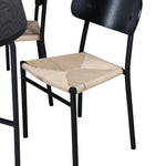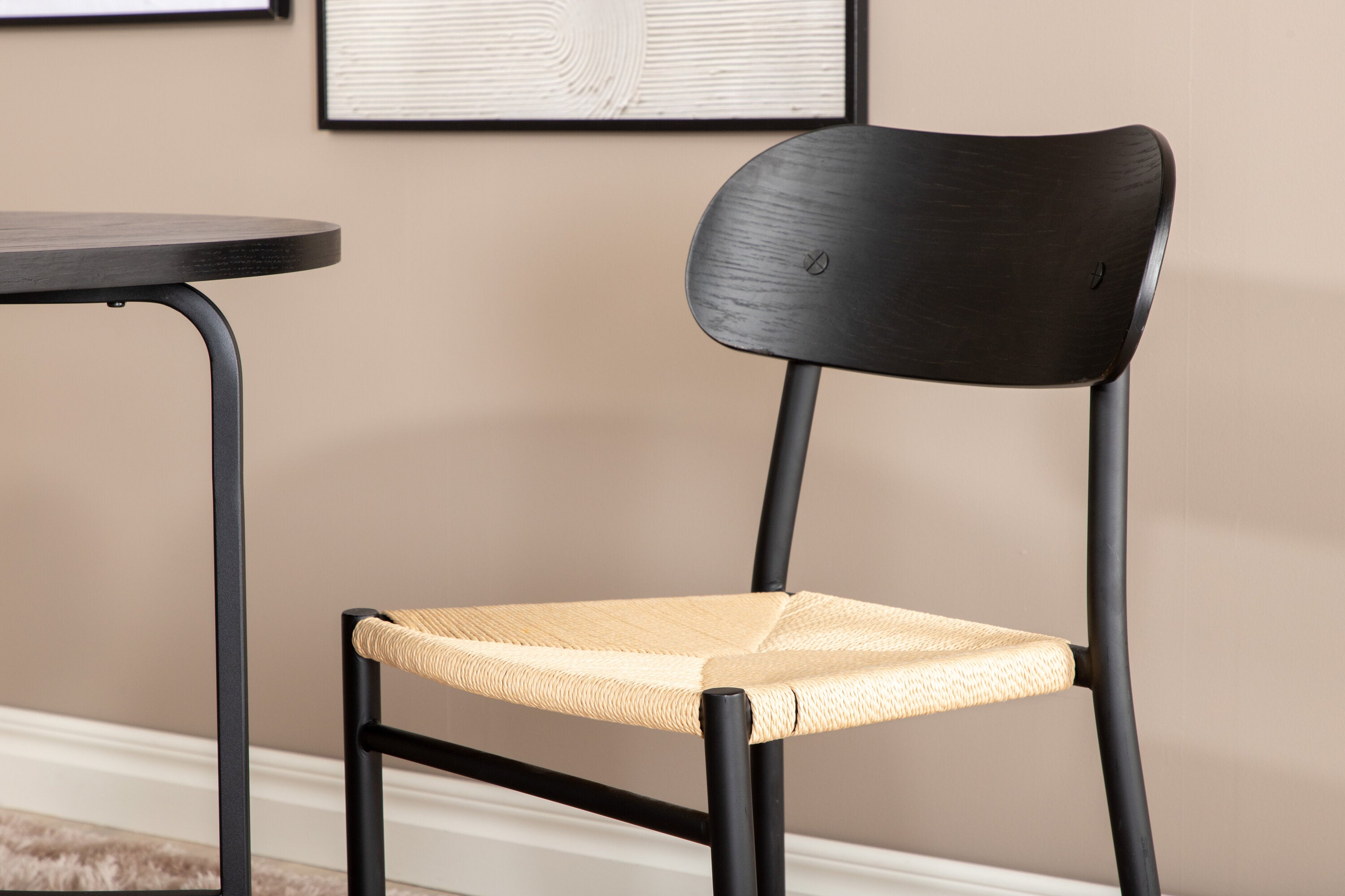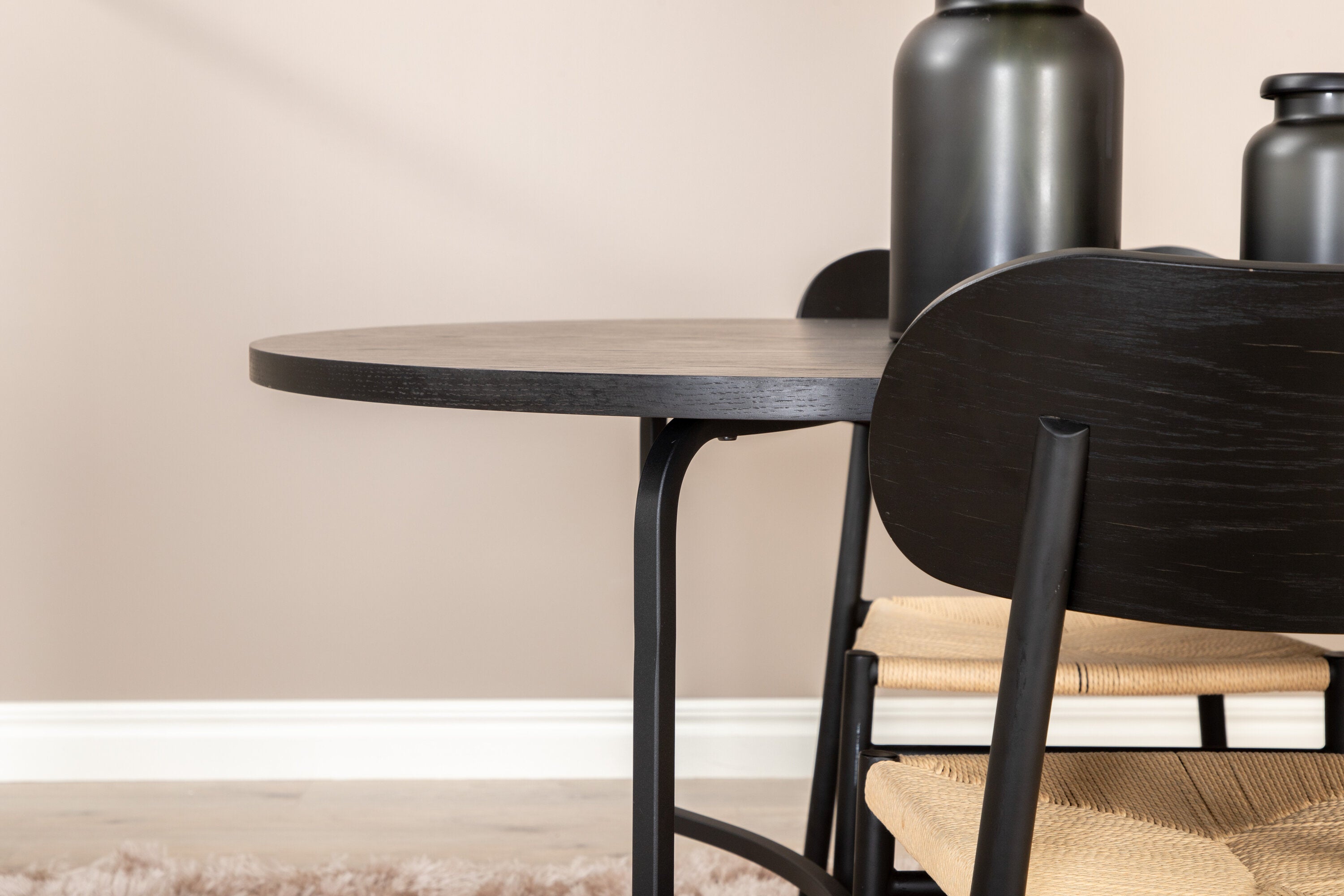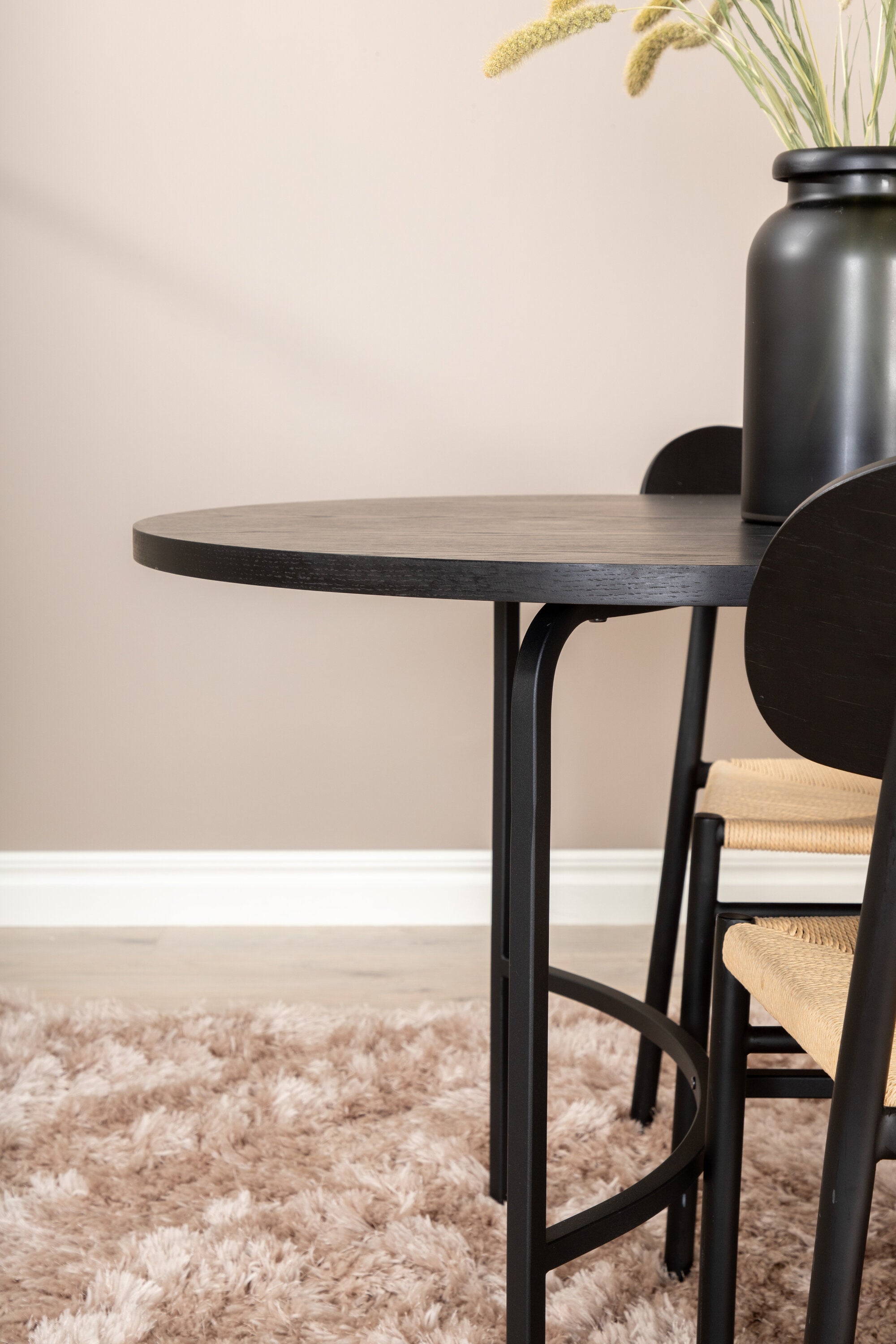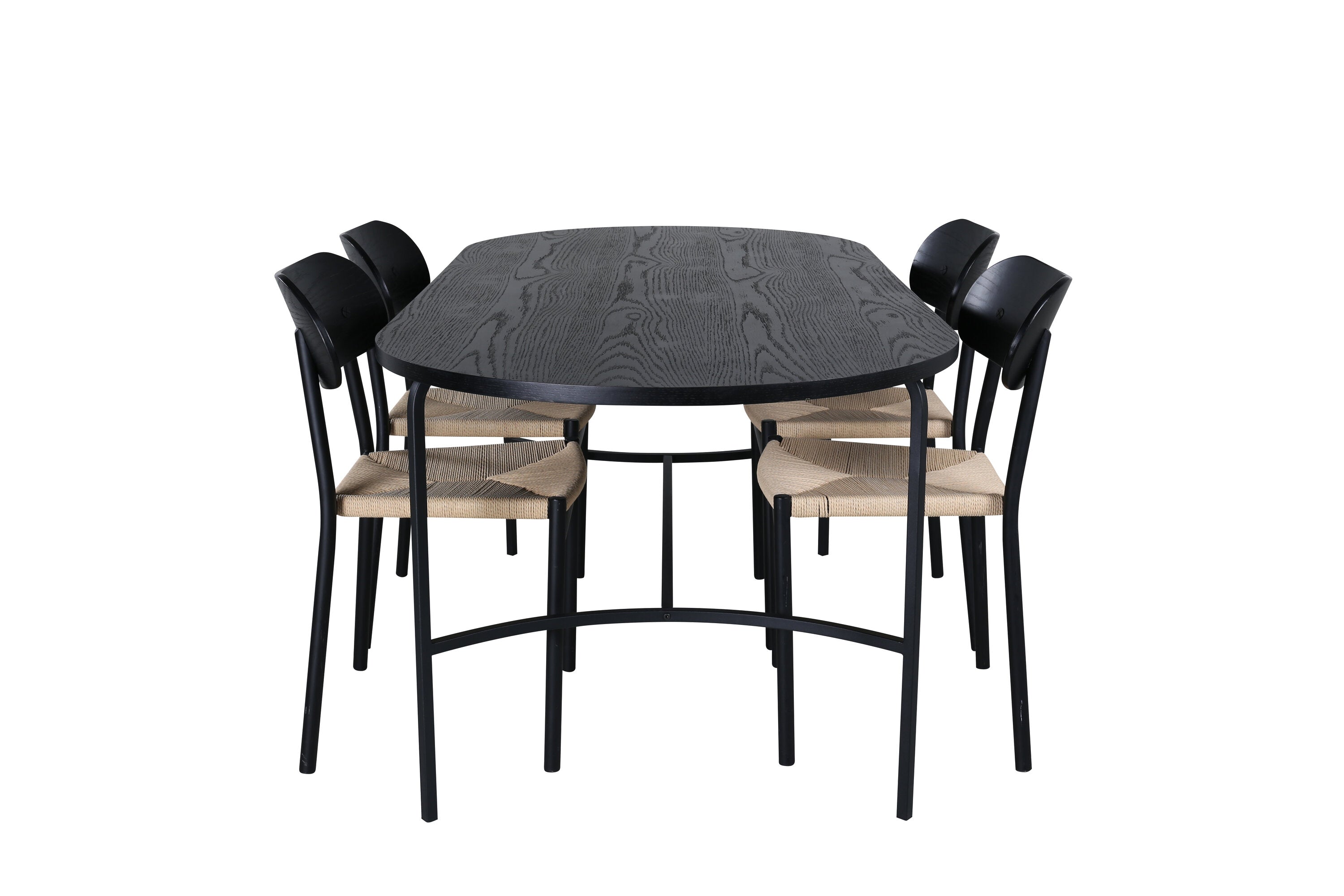 Zařiďte obývací pokoj útulně a trendově! Jídelní brusle zaujme svým elegantním designem a příjemným oválným designem. Celkový design je velmi dobře promyšlený s tenkou horní deskou v černé MDF s dýhou a černými nohami stolu z kovu. Rozměry stolu: Délka: 200 cm, Šířka: 90 cm, Výška: 75 cm. Zde spolu se 4 jídelními židlemi Polly v bohémském vzhledu. Sedák má přírodní barvu z odolného lana a nohy židle z černého kovu. Rozměry židle: výška: 88 cm, výška sedáku: 47 cm, šířka: 42 cm, hloubka: 55 cm. Pozlate všechna jídla dne kolem krásné skupiny jídel!