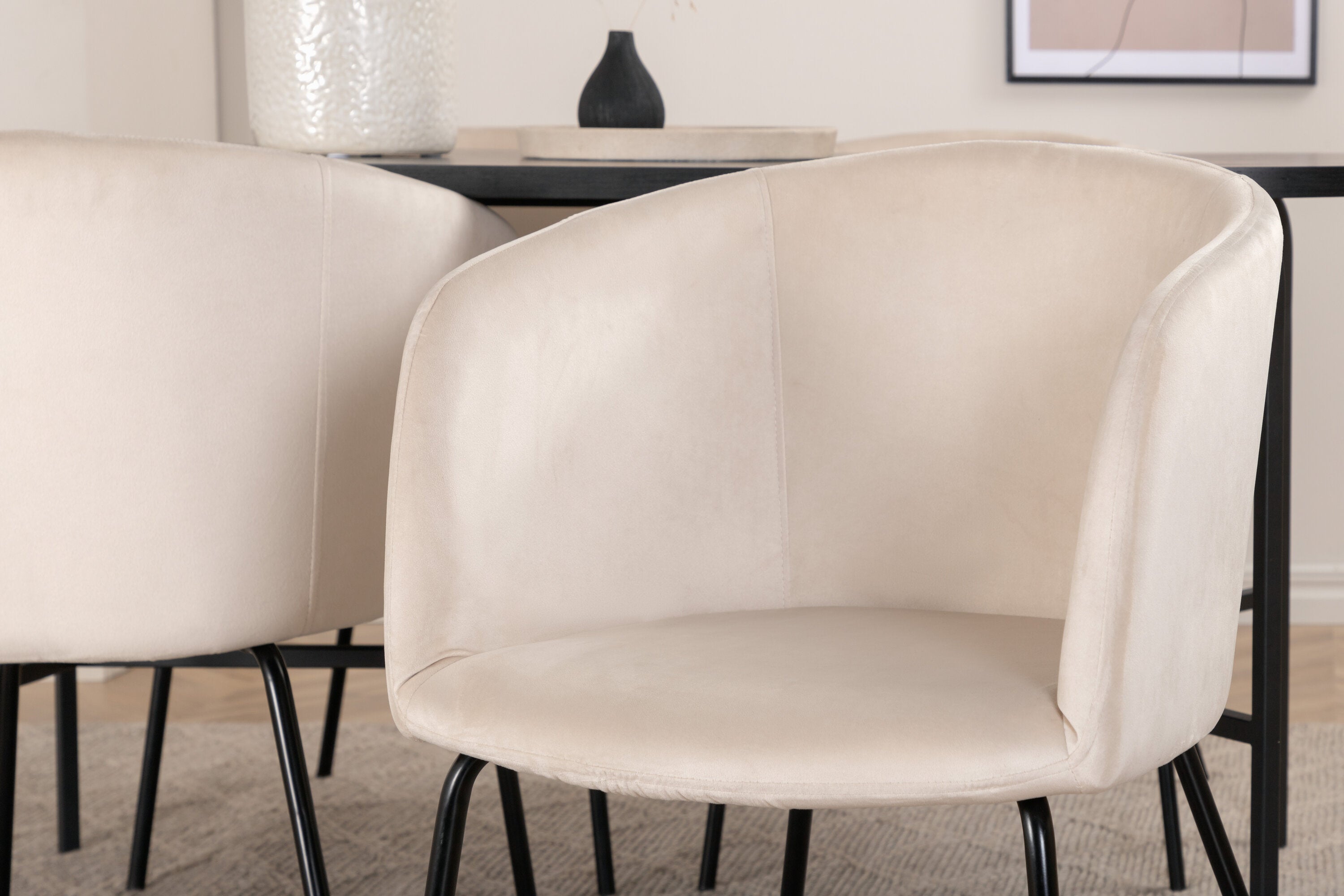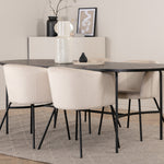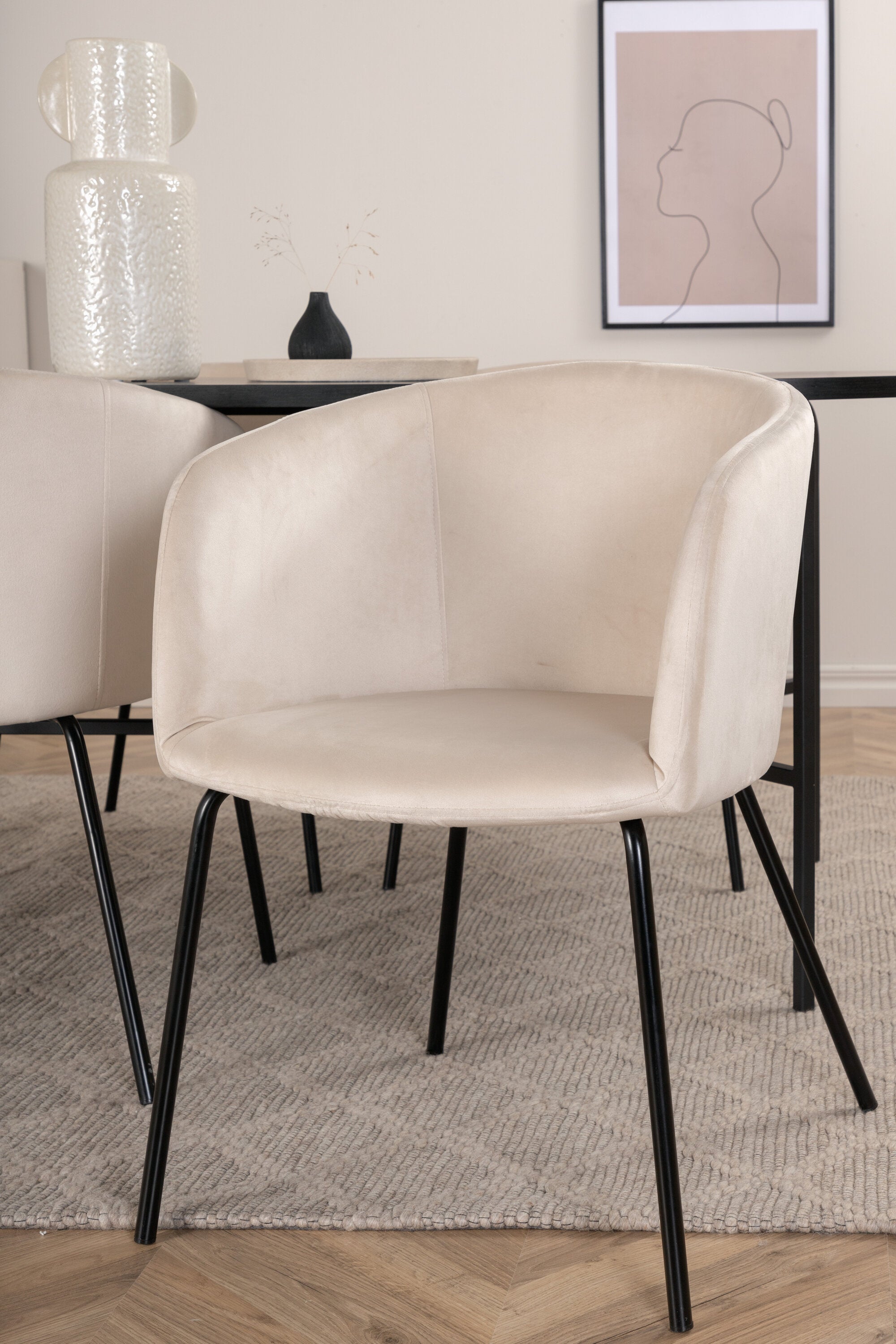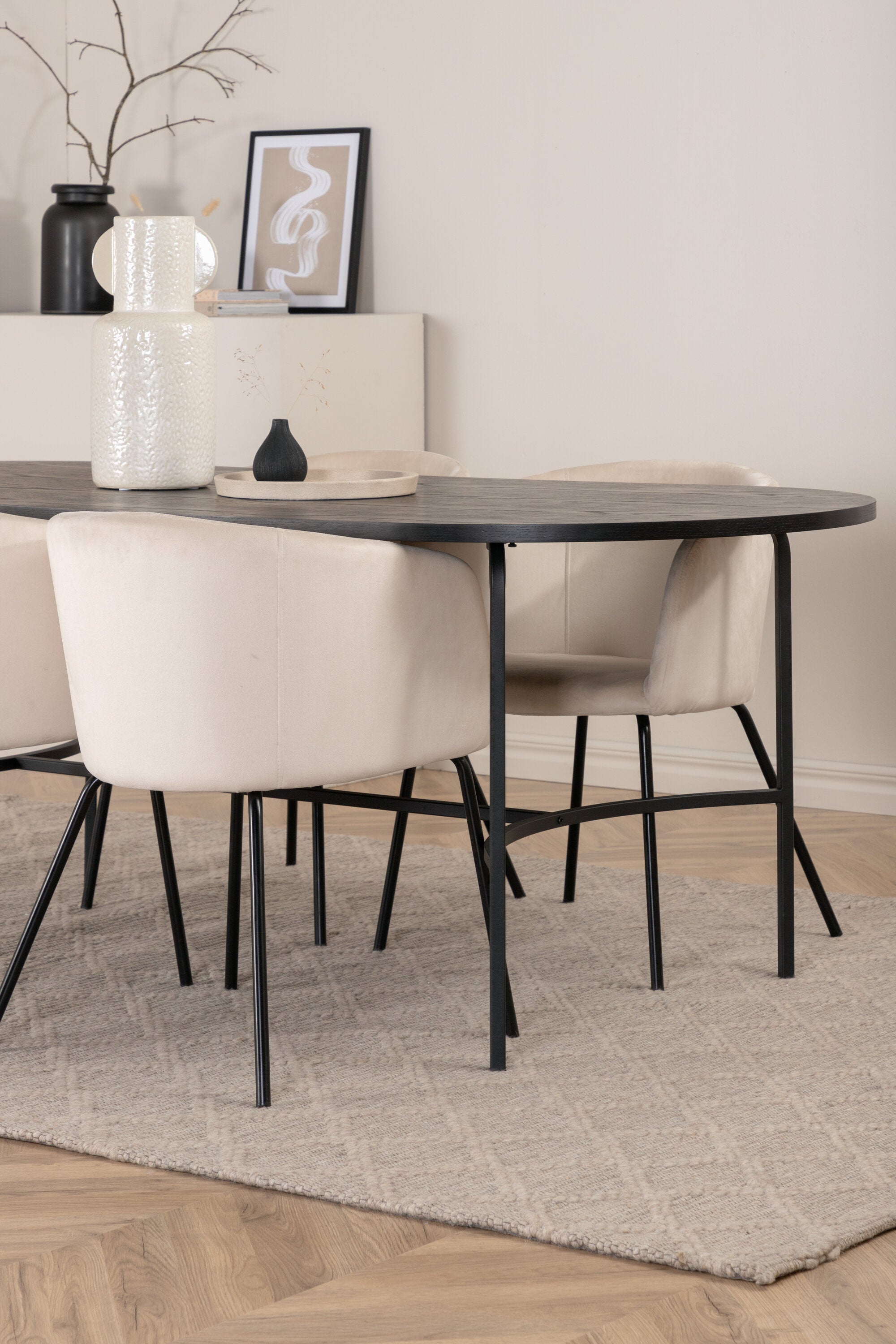 Pompézní a elegantní - skupina potravin zaměřující se na pohodlí a minimalismus! Naše oblíbené jídelní židle Berit jsou oblíbené v mnoha domácnostech. Mají příjemný design a teplou barvu v béžové, která je neuvěřitelně přitažlivá. Sedák je ze sametové látky a nohy židle jsou stylově úzké z černého železa. Rozměry židle: výška: 78 cm, výška sedáku: 49 cm, šířka: 55 cm, hloubka: 55 cm. Zde jsou 4 jídelní židle sladěny s naším oválným jídelním stolem skate. Celkový design stolu je velmi promyšlený s tenkou horní deskou v černé MDF s dýhou a černými nohami stolu v kovu. Rozměry stolu: Délka: 200 cm, Šířka: 90 cm, Výška: 75 cm.