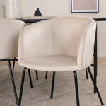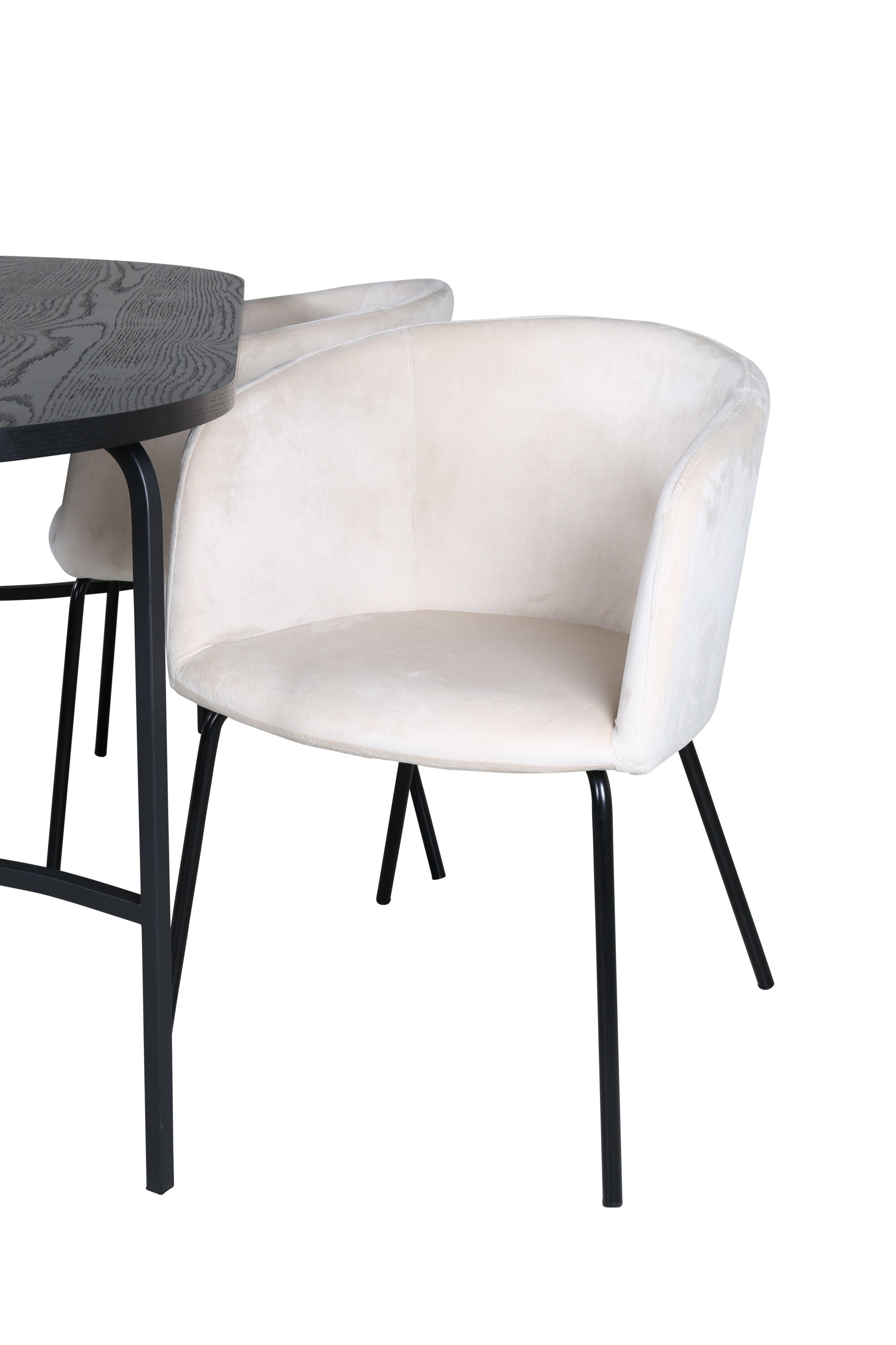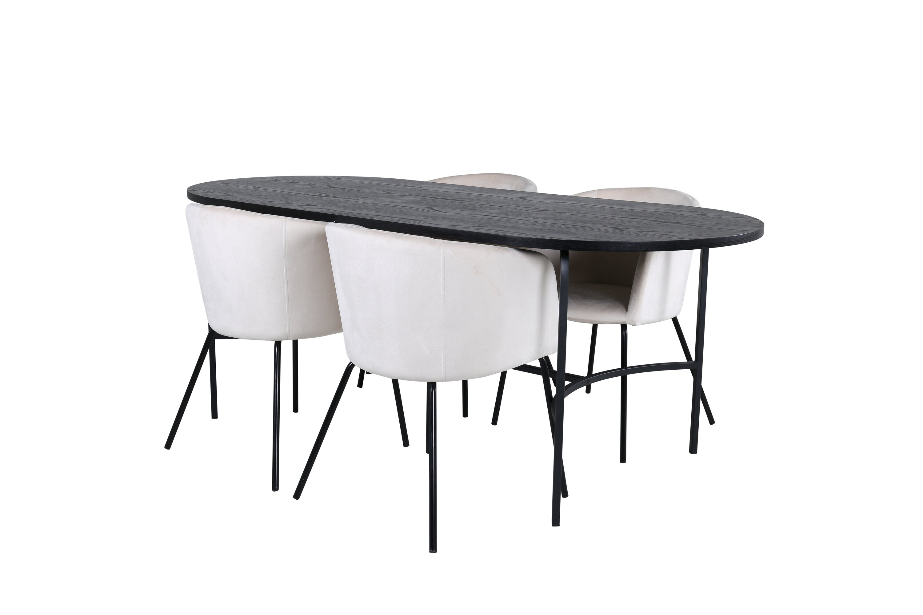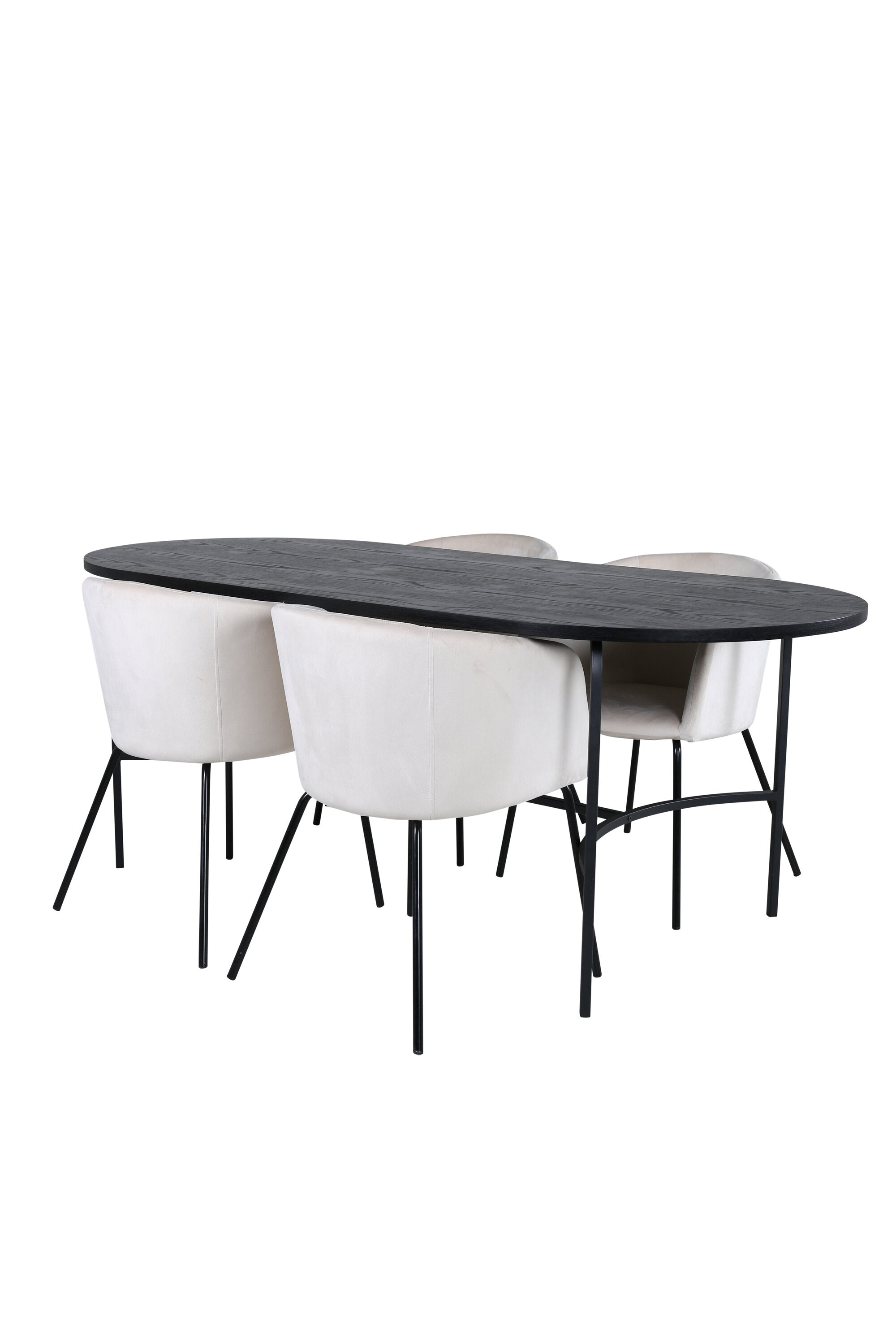 Pompézní a elegantní - skupina potravin zaměřující se na pohodlí a minimalismus! Naše oblíbené jídelní židle Berit jsou oblíbené v mnoha domácnostech. Mají příjemný design a teplou barvu v béžové, která je neuvěřitelně přitažlivá. Sedák je ze sametové látky a nohy židle jsou stylově úzké z černého železa. Rozměry židle: výška: 78 cm, výška sedáku: 49 cm, šířka: 55 cm, hloubka: 55 cm. Zde jsou 4 jídelní židle sladěny s naším oválným jídelním stolem skate. Celkový design stolu je velmi promyšlený s tenkou horní deskou v černé MDF s dýhou a černými nohami stolu v kovu. Rozměry stolu: Délka: 200 cm, Šířka: 90 cm, Výška: 75 cm.