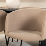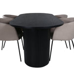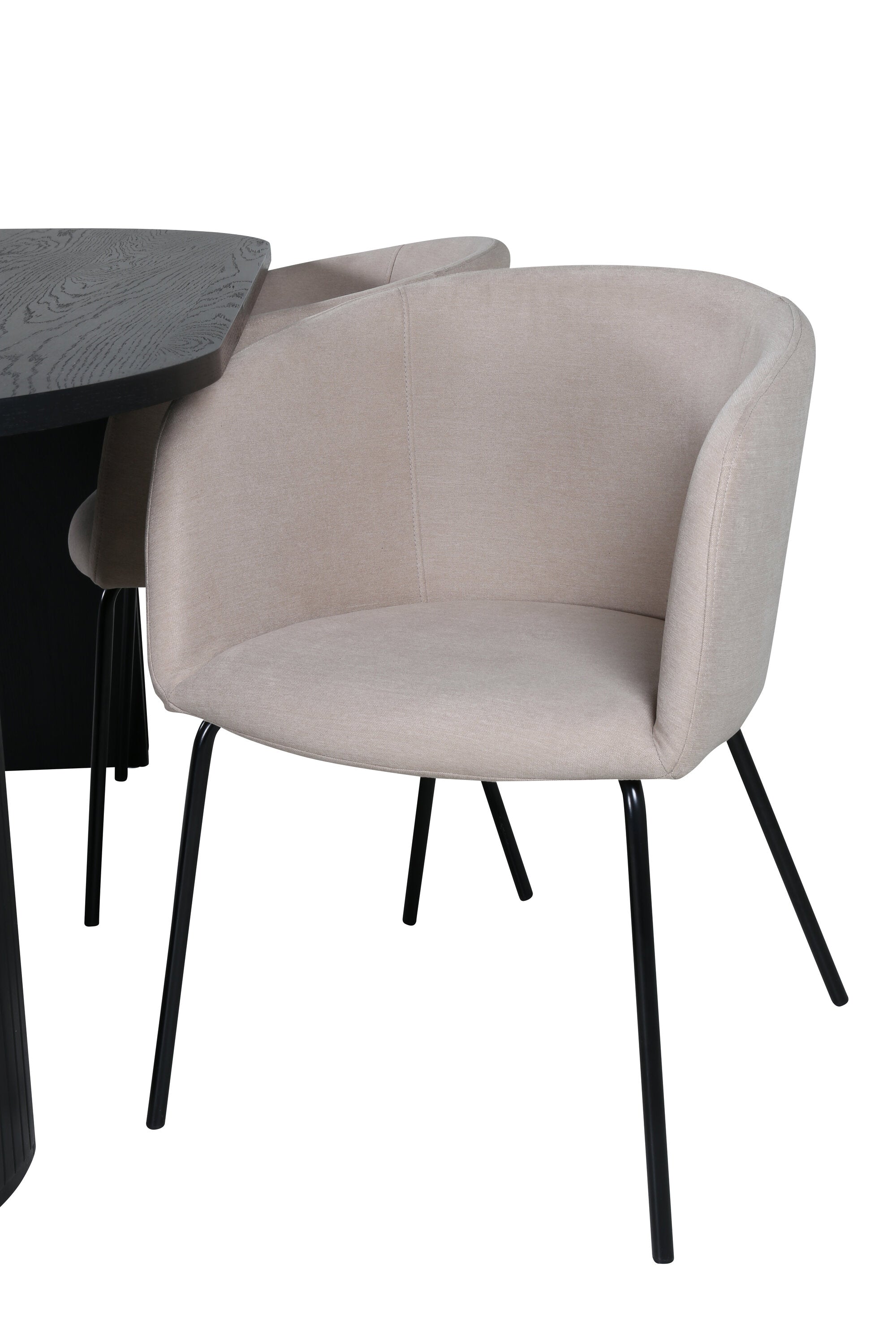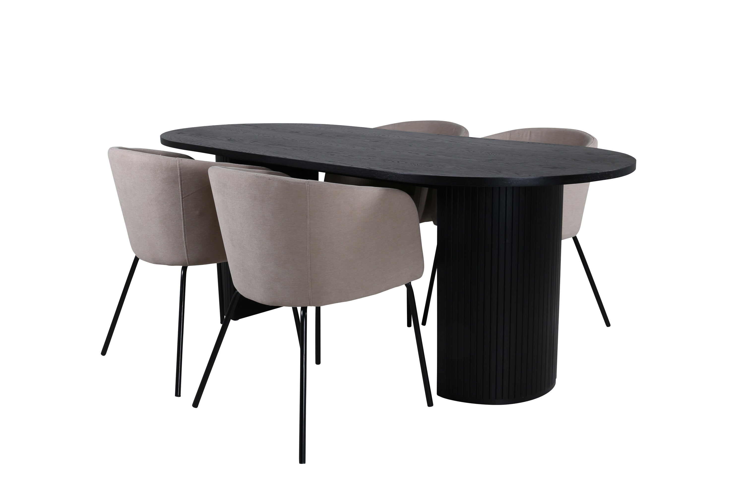 Moderní, stylové a pompézní – vytvořte si luxusní poutač v srdci domova! Náš oválný jídelní stůl Bianca v konzistentně černé barvě má ​​trendy design se stolovou deskou z MDF a robustním rámem v žebrovaném provedení, který působí stabilním dojmem. Rozměry stolu: Délka: 200 cm, Šířka: 90 cm, Výška: 75 cm. Zde v lahodné kombinaci 4 jídelních židlí Berit s béžovými sedáky z polyesterového plátna a stylově úzkými podnožkami ze železa. Rozměry židle: výška: 78 cm, výška sedáku: 49 cm, šířka: 55 cm, hloubka: 55 cm. Nechte obývací pokoj charakterizovat vaší novou, poutavou skupinou jídel.